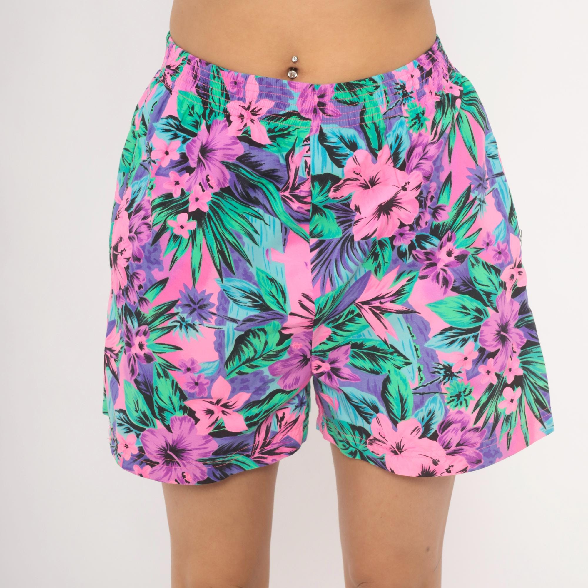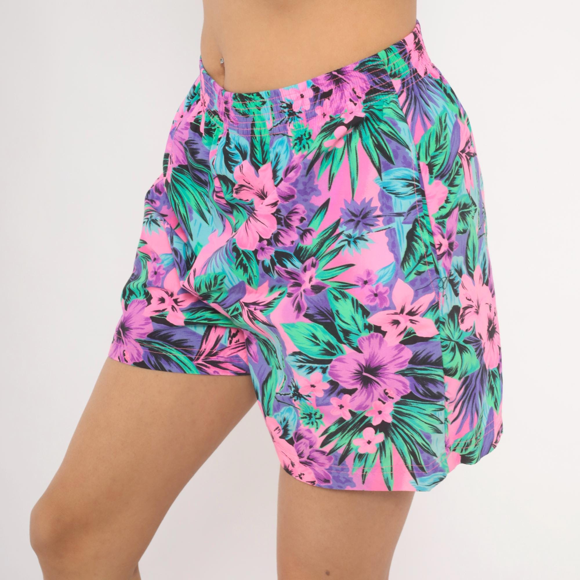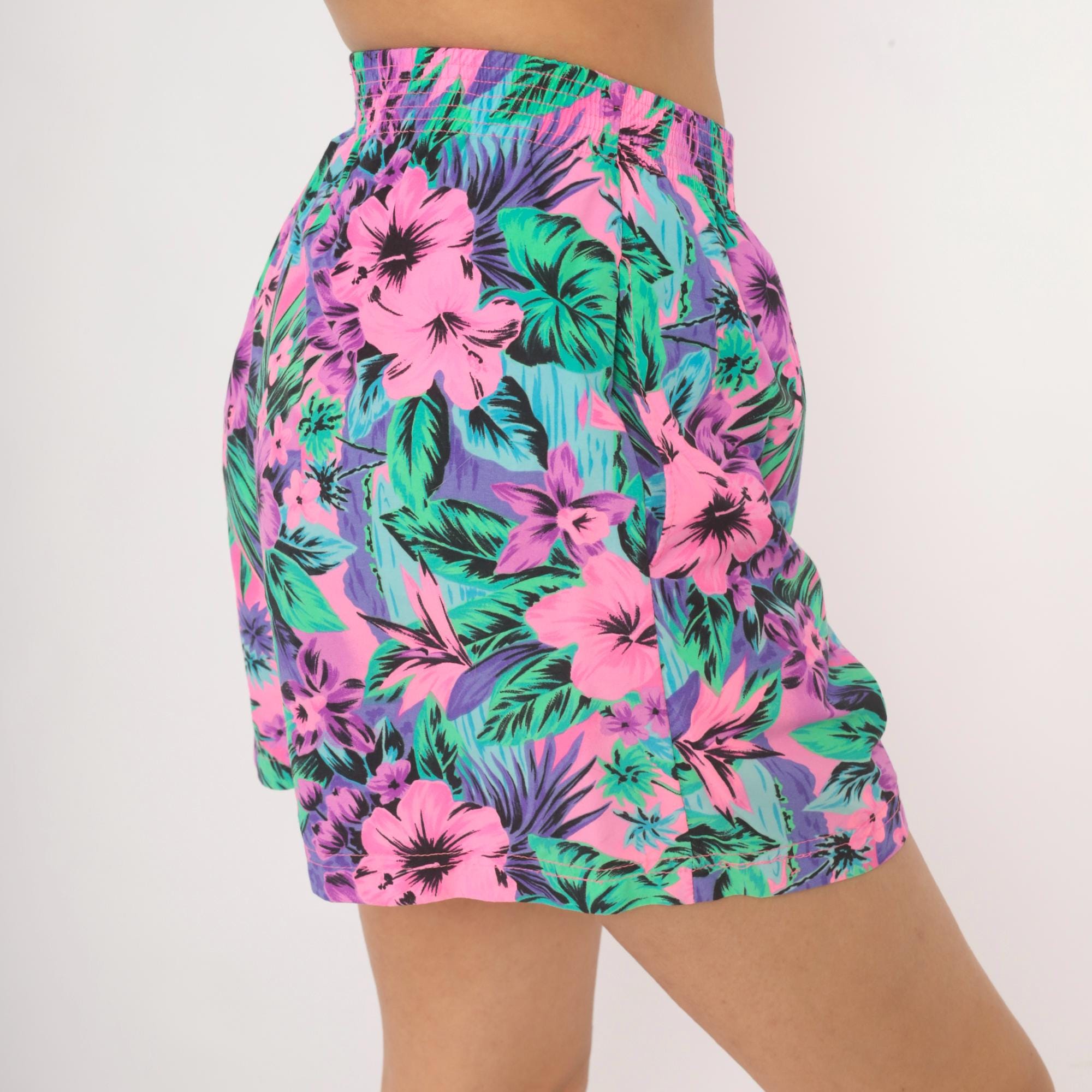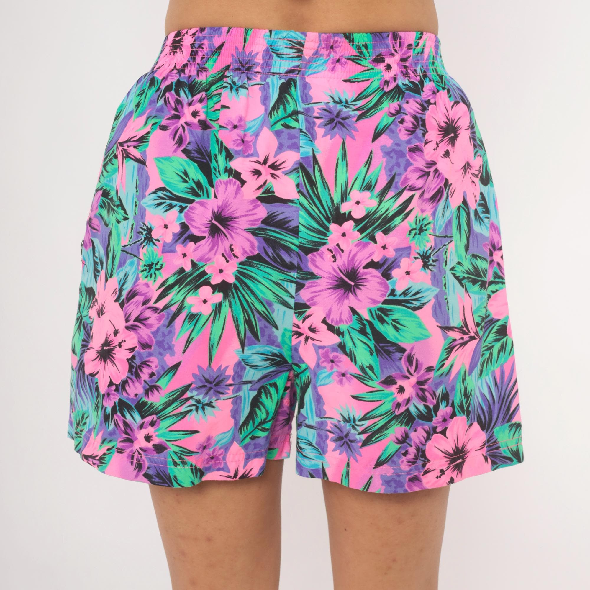 90s neon tropical shorts from Op with an allover hibiscus and palm leaf print in hot pink, purple, violet, and green. Elastic waistband, pull-on closure, and side seam pockets. High-waisted silhouette with a relaxed leg and short inseam. Has no swim net lining.