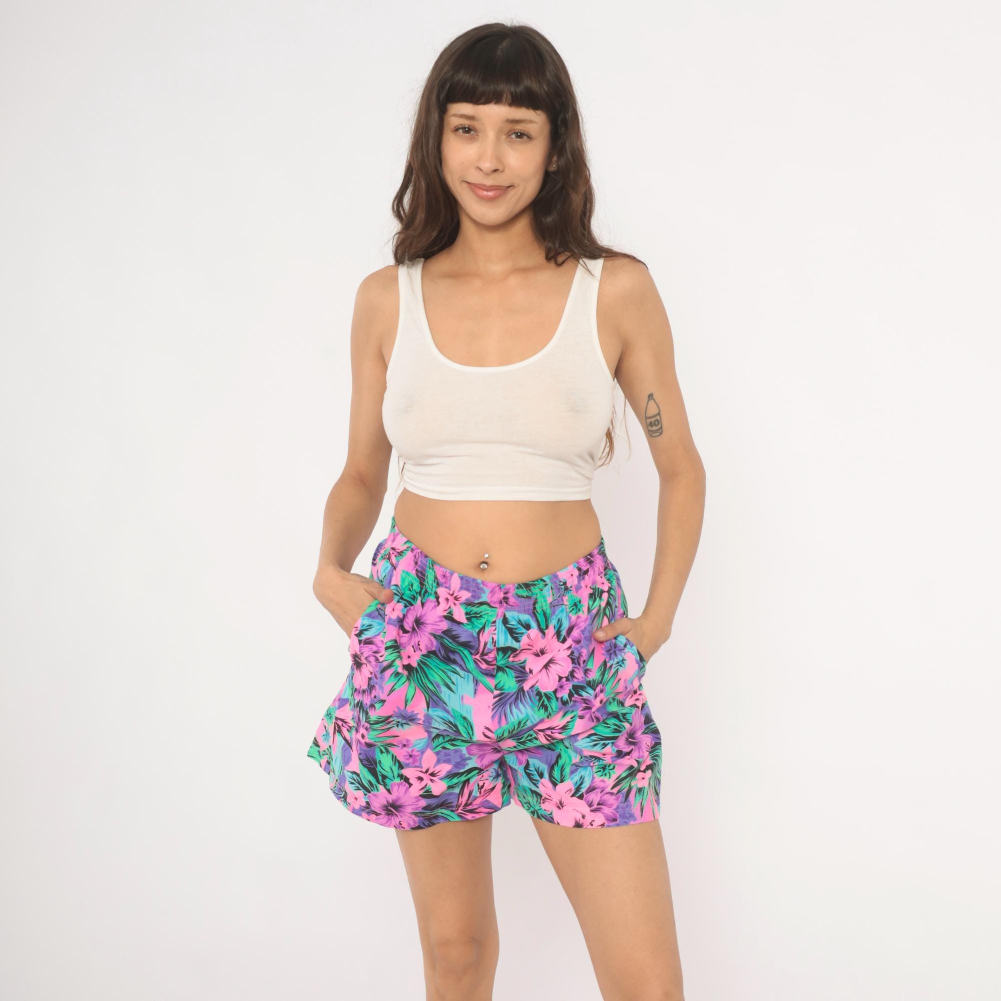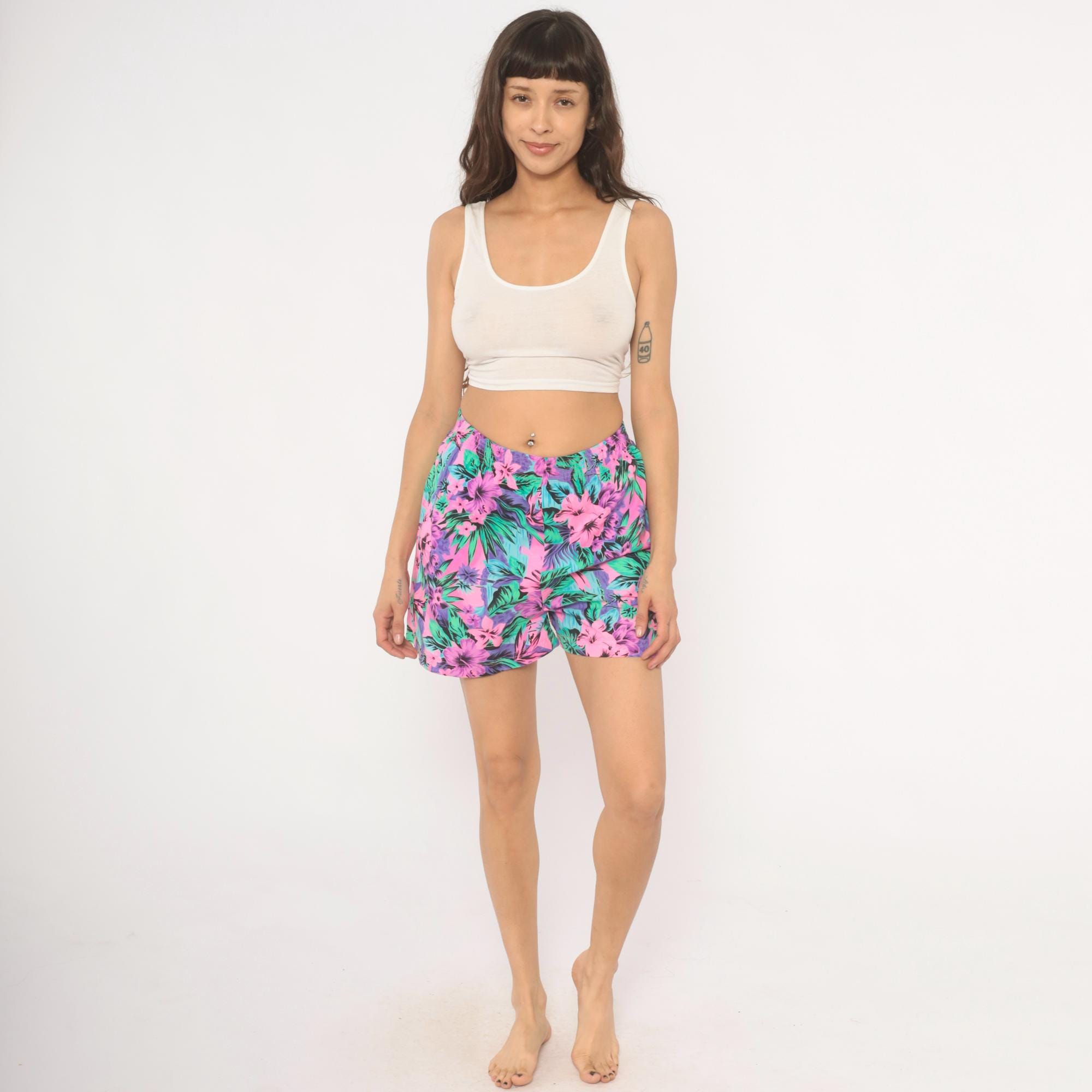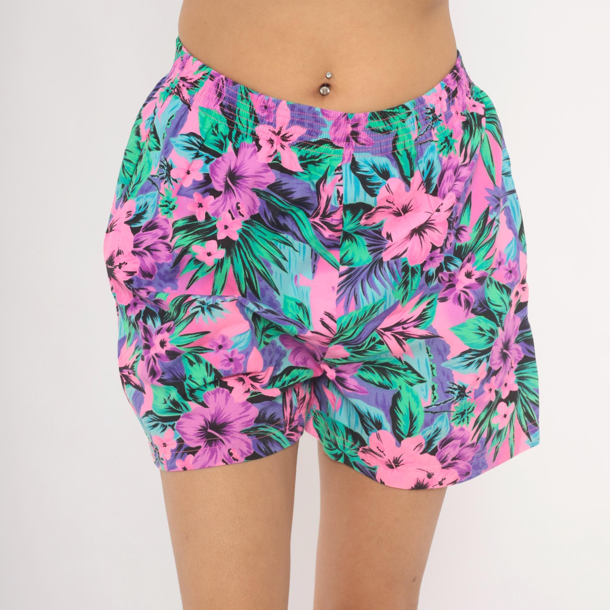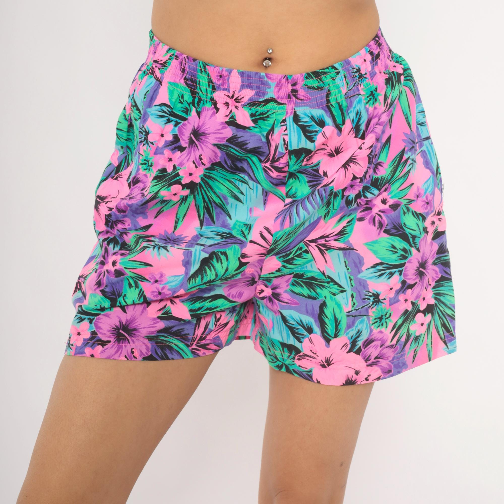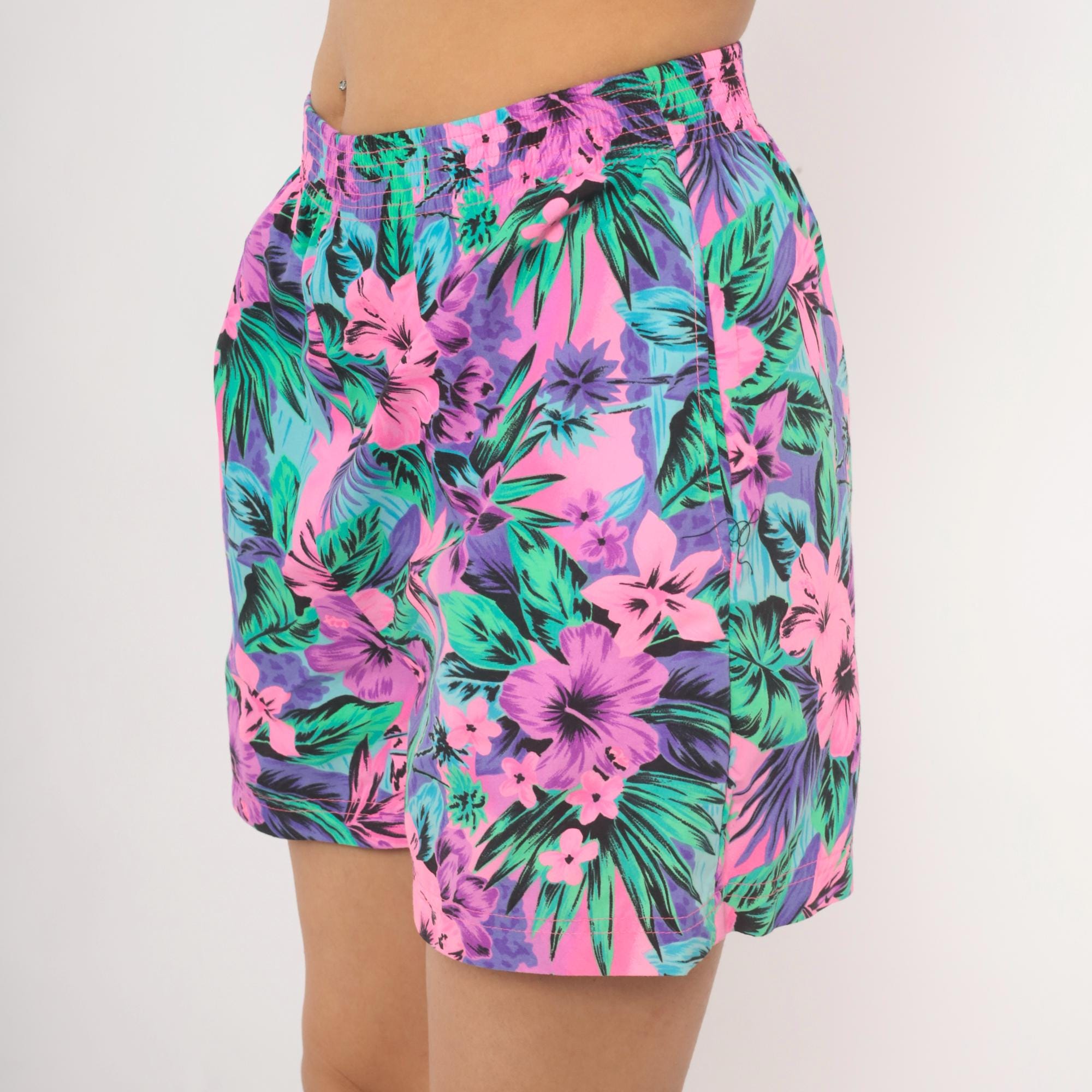 90s neon tropical shorts from Op with an allover hibiscus and palm leaf print in hot pink, purple, violet, and green. Elastic waistband, pull-on closure, and side seam pockets. High-waisted silhouette with a relaxed leg and short inseam. Has no swim net lining.
