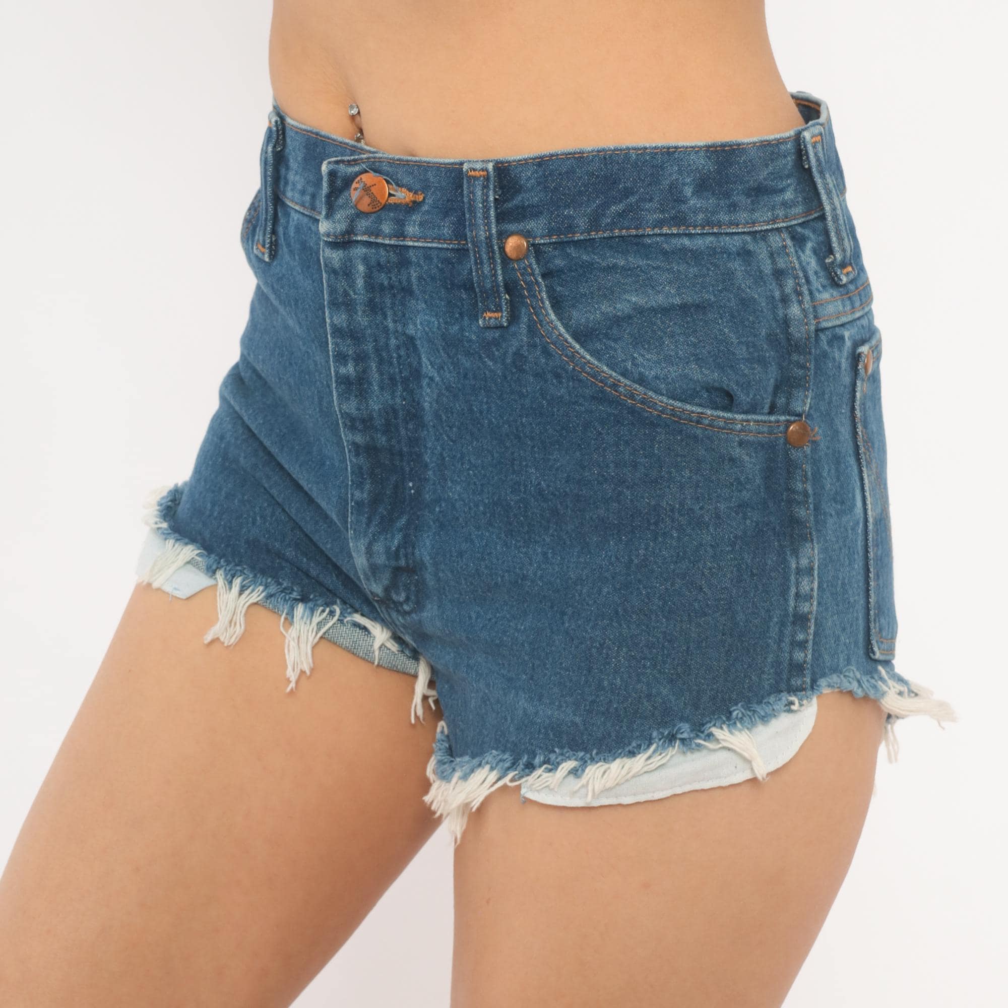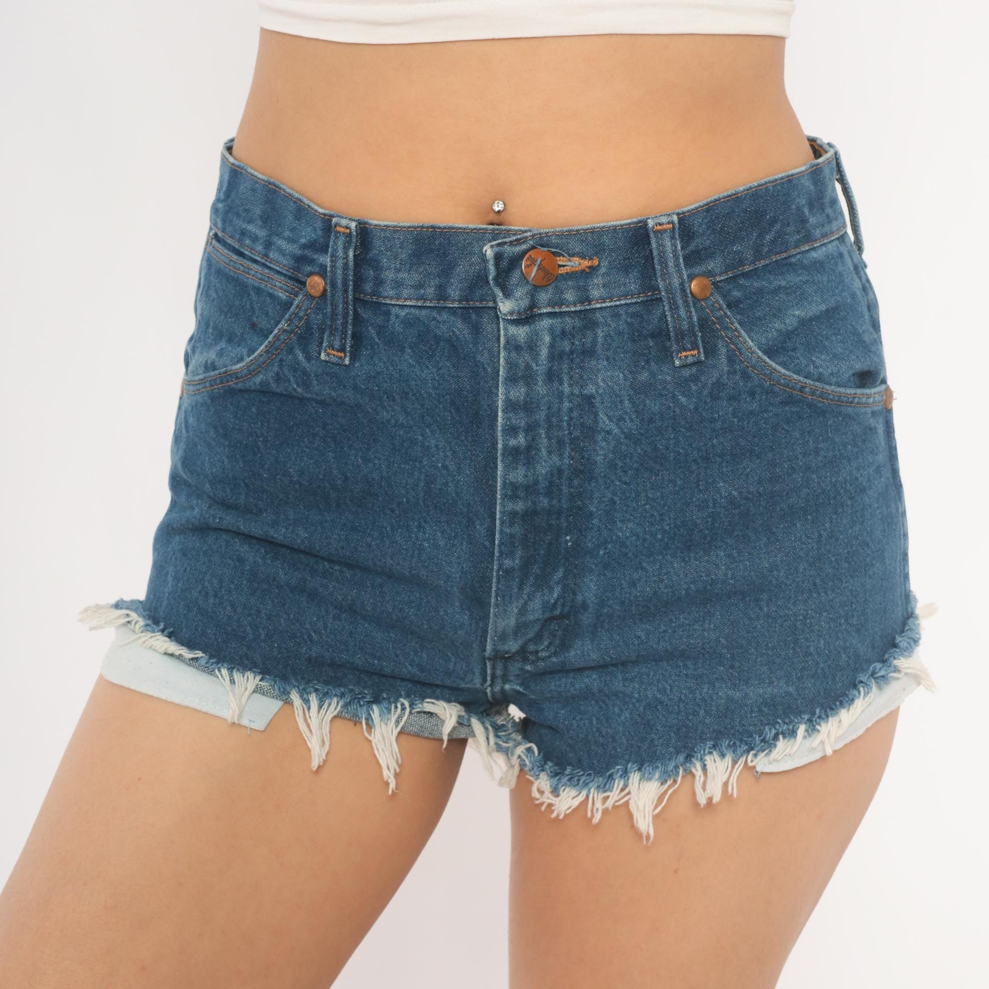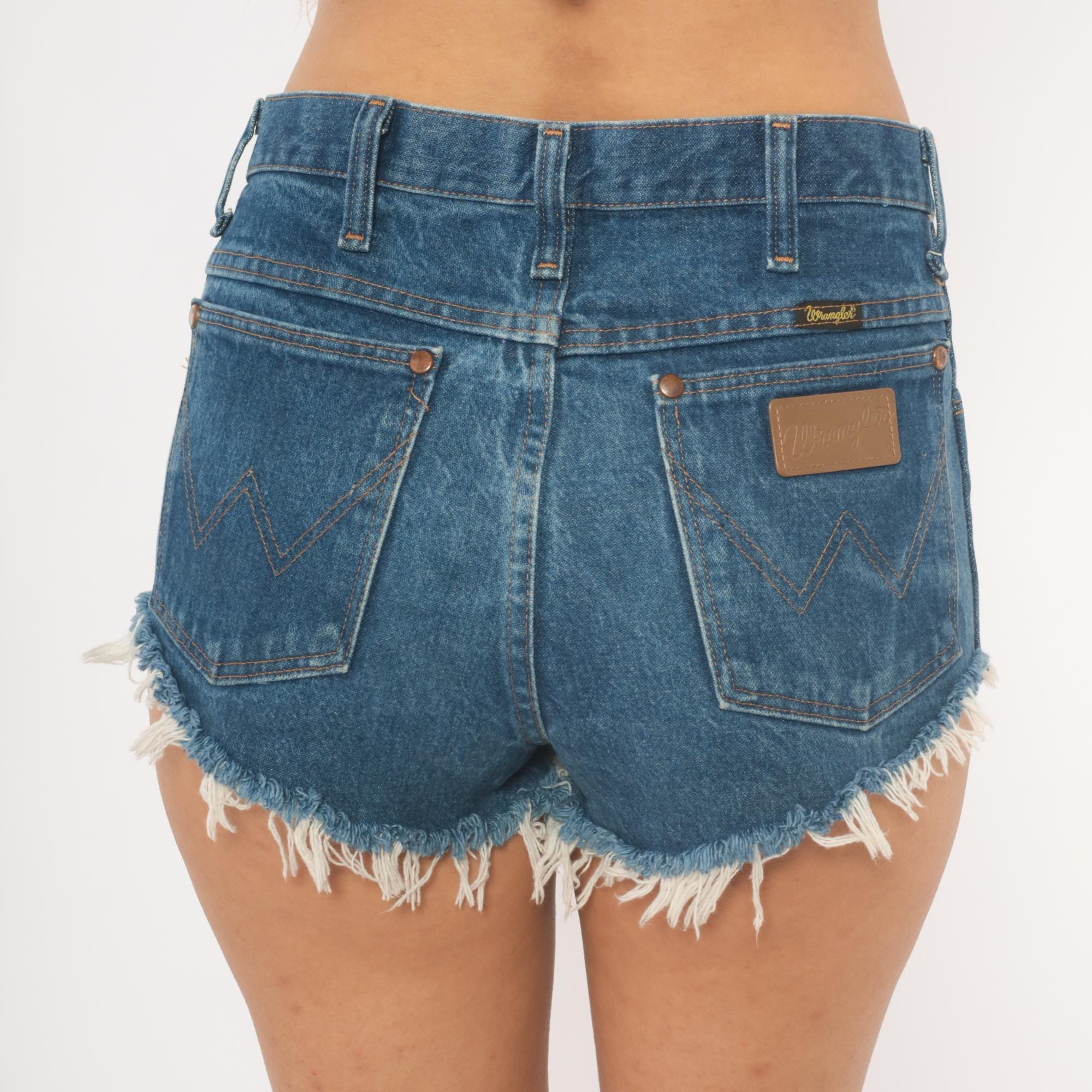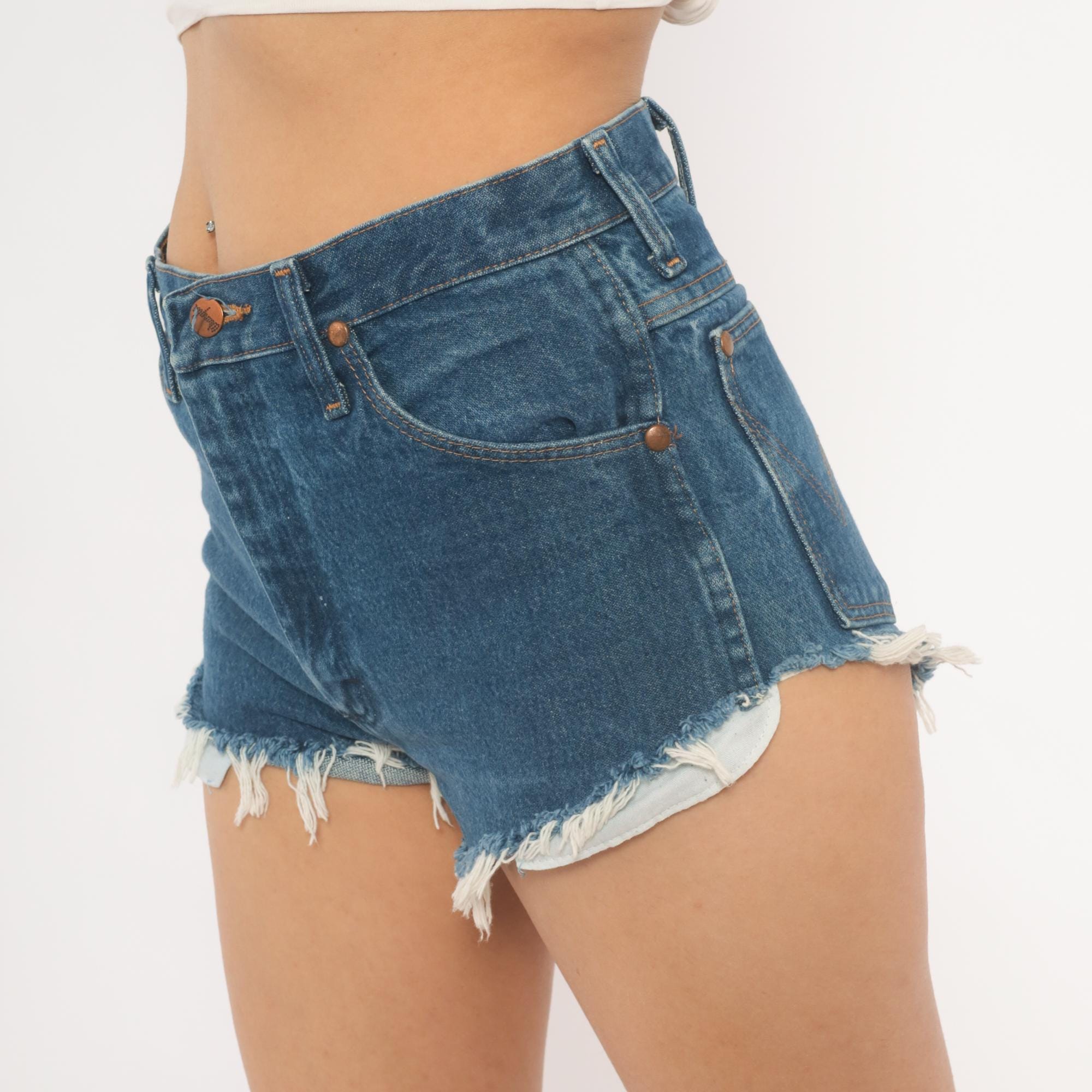 90s Wrangler cutoff shorts in medium blue denim with raw frayed hems and visible pocket lining peeking out. High waisted fit with front zipper closure, copper-tone rivet details, and belt loops. Two front pockets, a small watch pocket, and two back pockets with the signature Wrangler W stitching and leather brand patch.