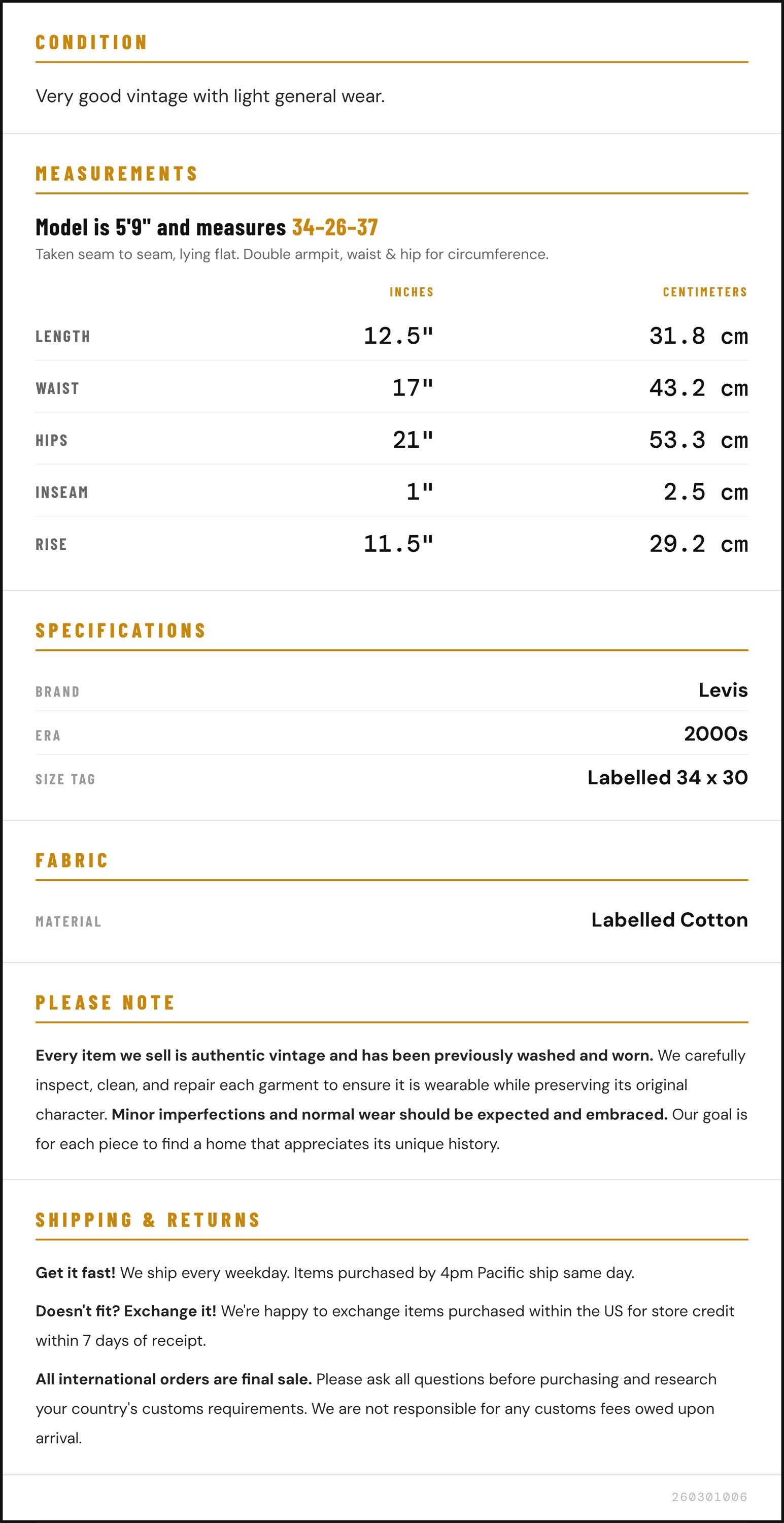 Vintage denim was usually made without any stretch, unlike modern jeans. Check the measurements to ensure proper fit, and remember to give yourself a little wiggle room in the waist and hips, depending on your preferred fit.