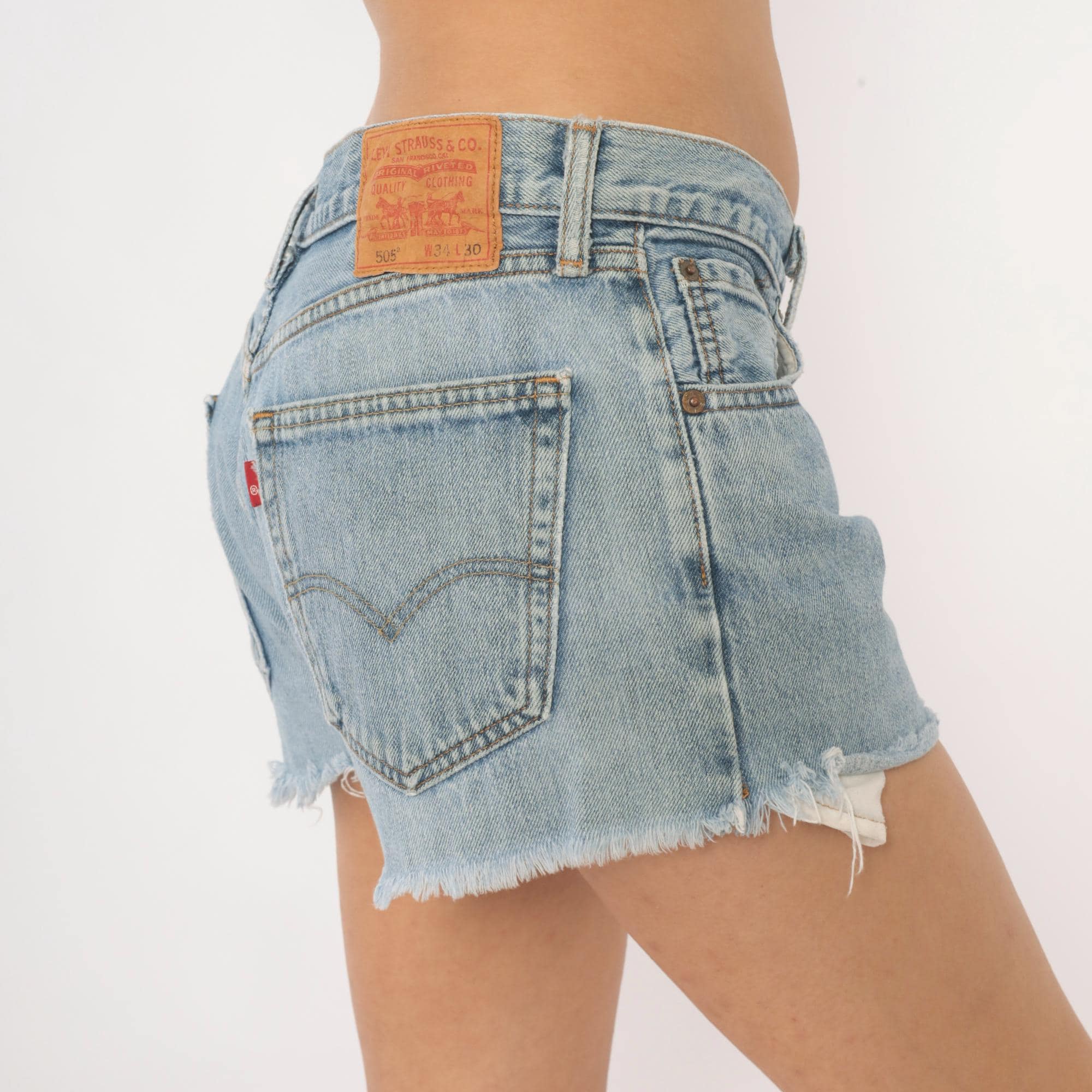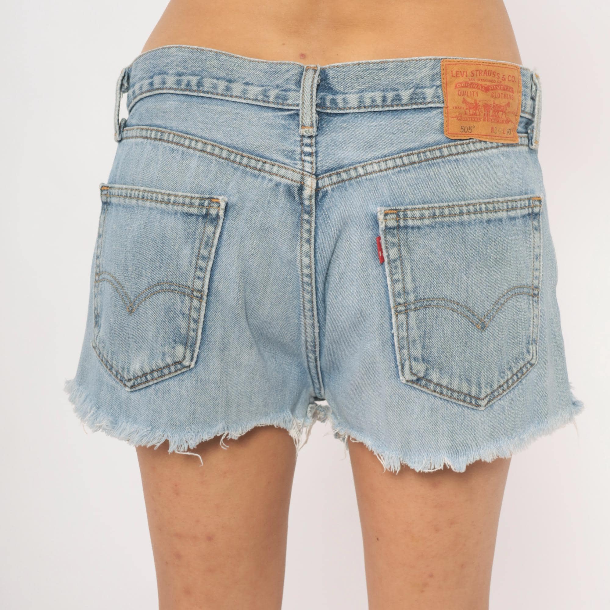 Light wash Levi's 505 cutoff denim shorts with raw frayed hems and exposed white pocket lining visible at the leg openings. Button and zipper front closure, five-pocket construction with copper rivets and leather back patch. Low-rise fit with a straight, relaxed leg cut from the original jean silhouette.