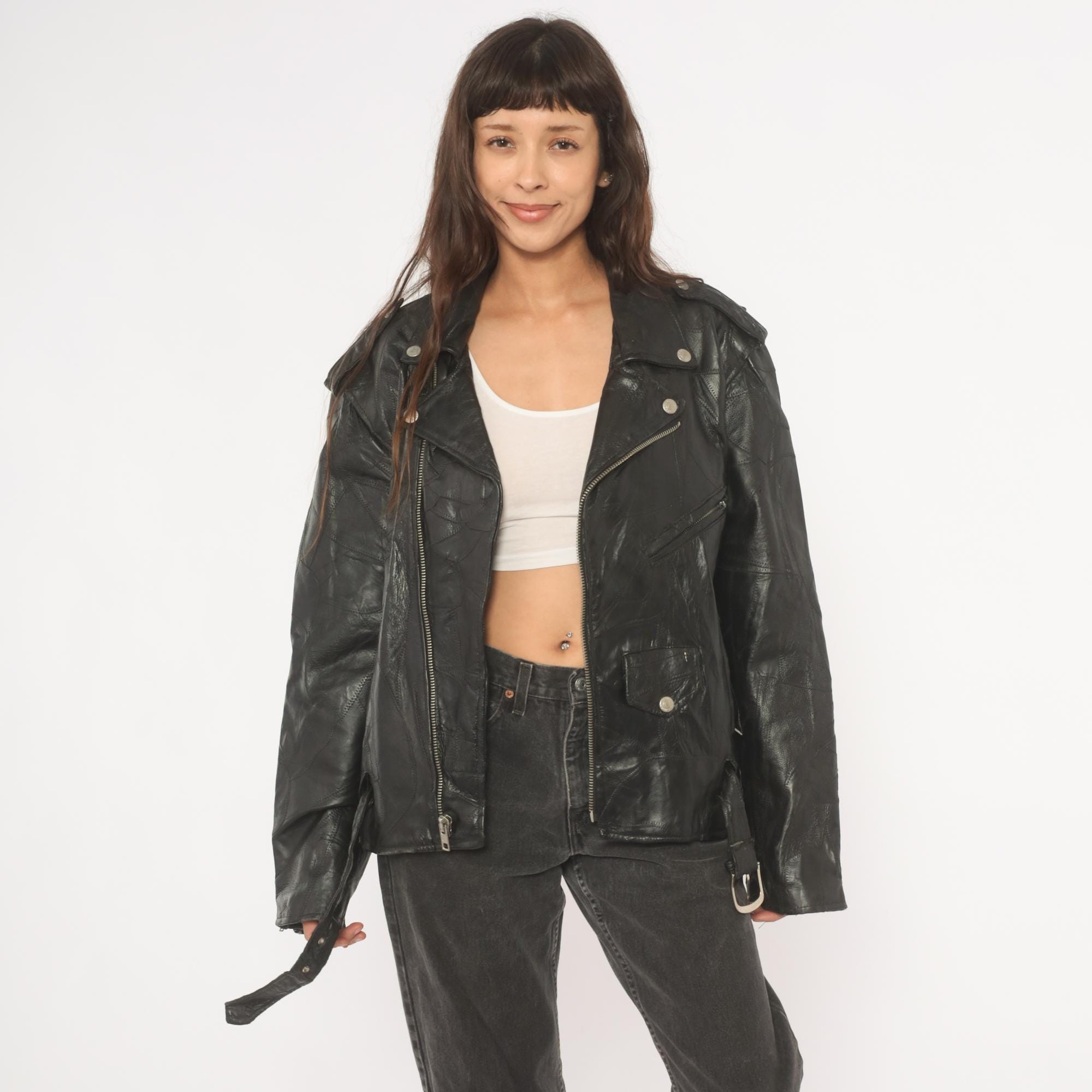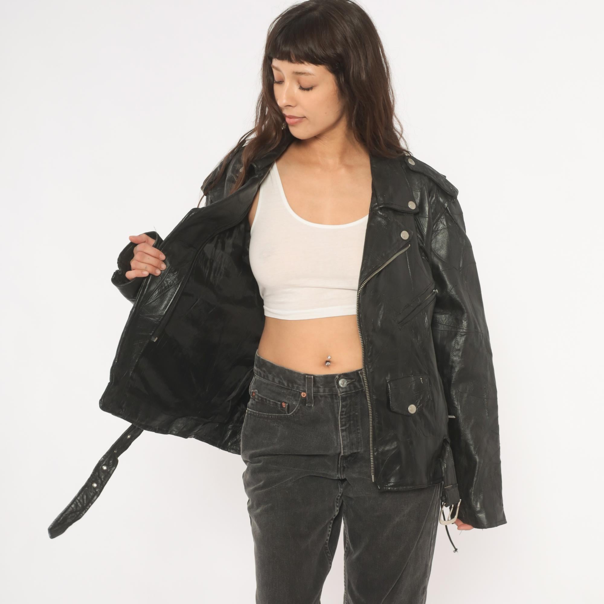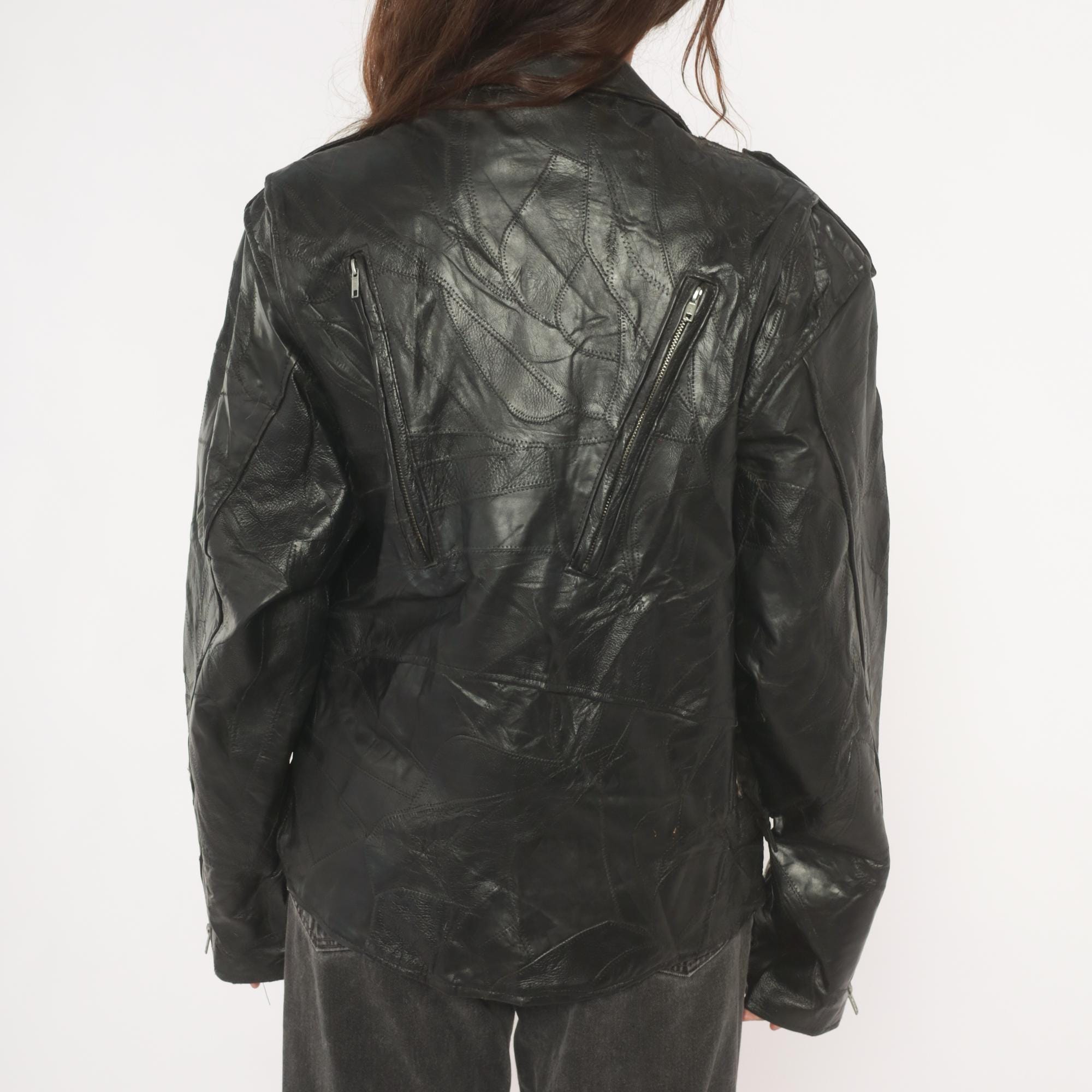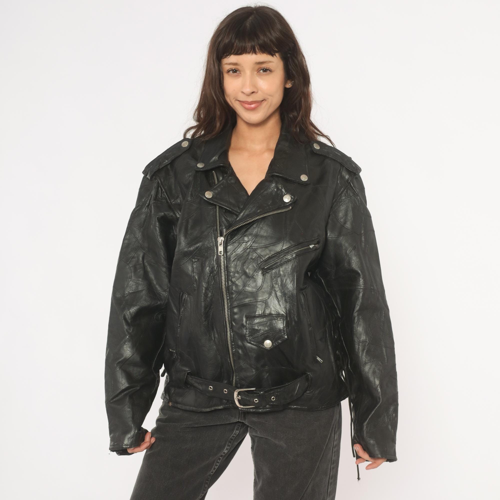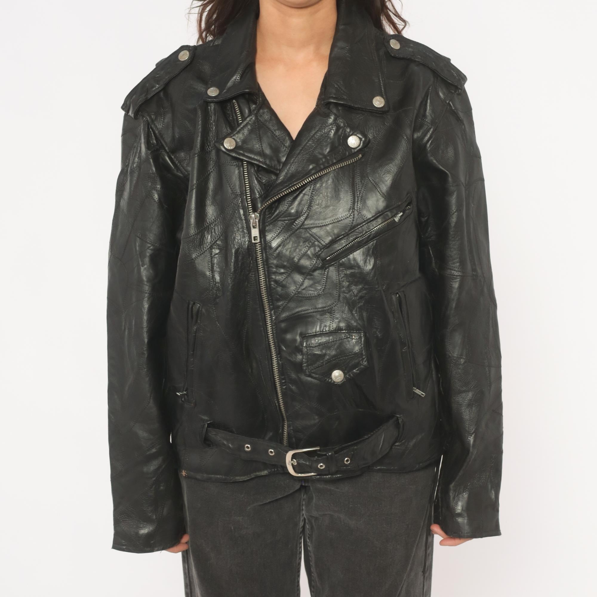 90s black leather biker jacket from Diamond Plate Buffalo Leather with asymmetrical front zipper closure and wide notched lapel collar with snap-down points. Epaulets at the shoulders, zippered chest pocket, snap-closure flap pocket, side seam pockets, and two diagonal zippered pockets on the back. Belted waist with single-prong buckle, zippered cuffs, and patchwork leather construction throughout with visible seaming. Silver-tone hardware across all snaps, zippers, and buckle.