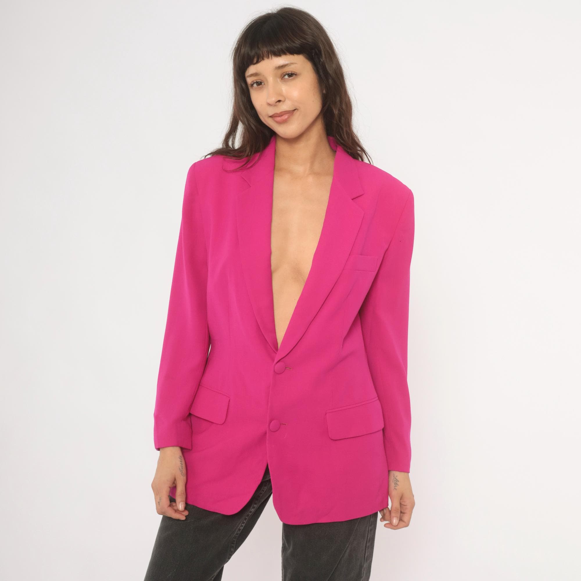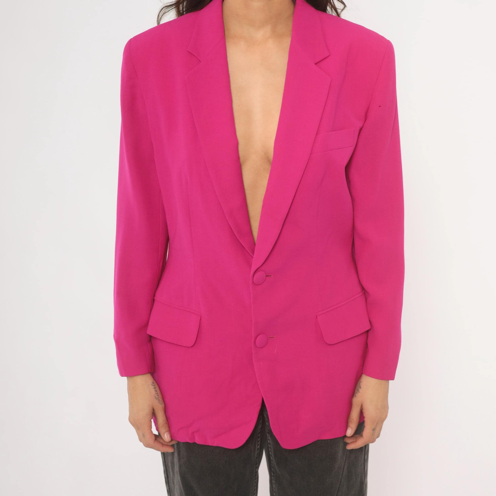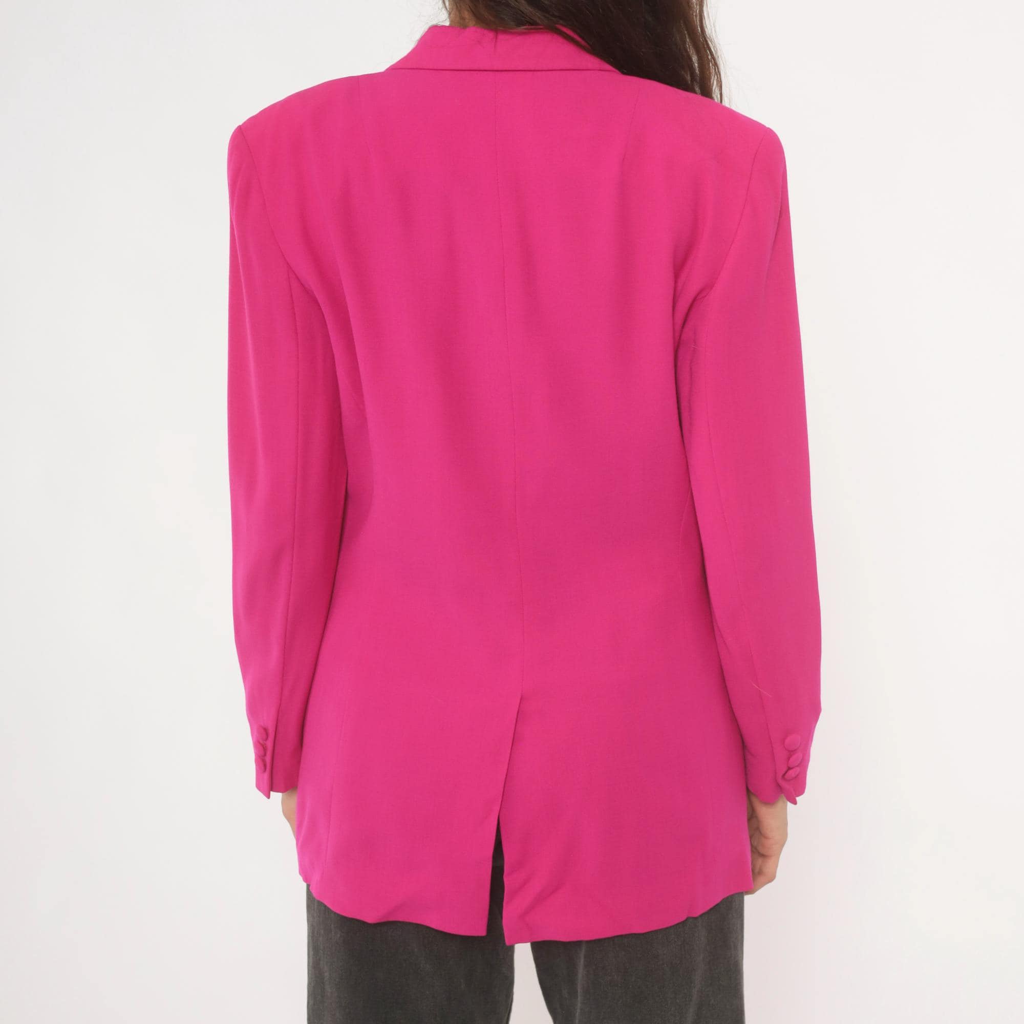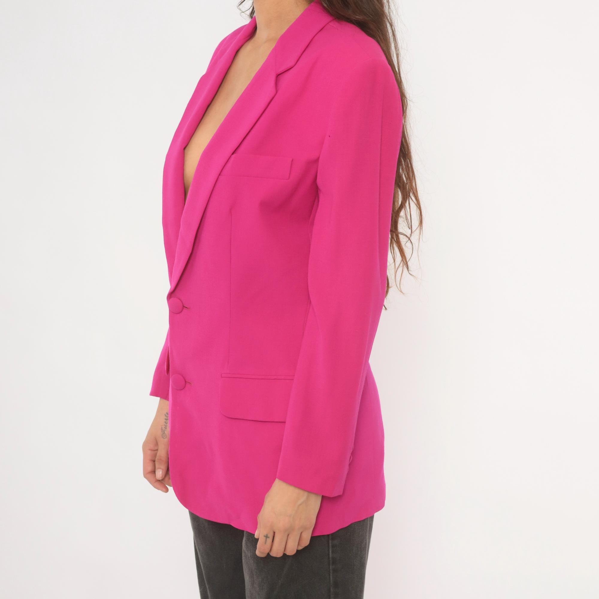90s hot pink wool blazer from N. Valentino with notched lapels and two matching fabric-covered button front closure. Flap pockets at the hip, a welt breast pocket on the left chest, and a single back vent. Fully lined in matching fuchsia, with structured shoulders and long sleeves finished with covered button cuffs.