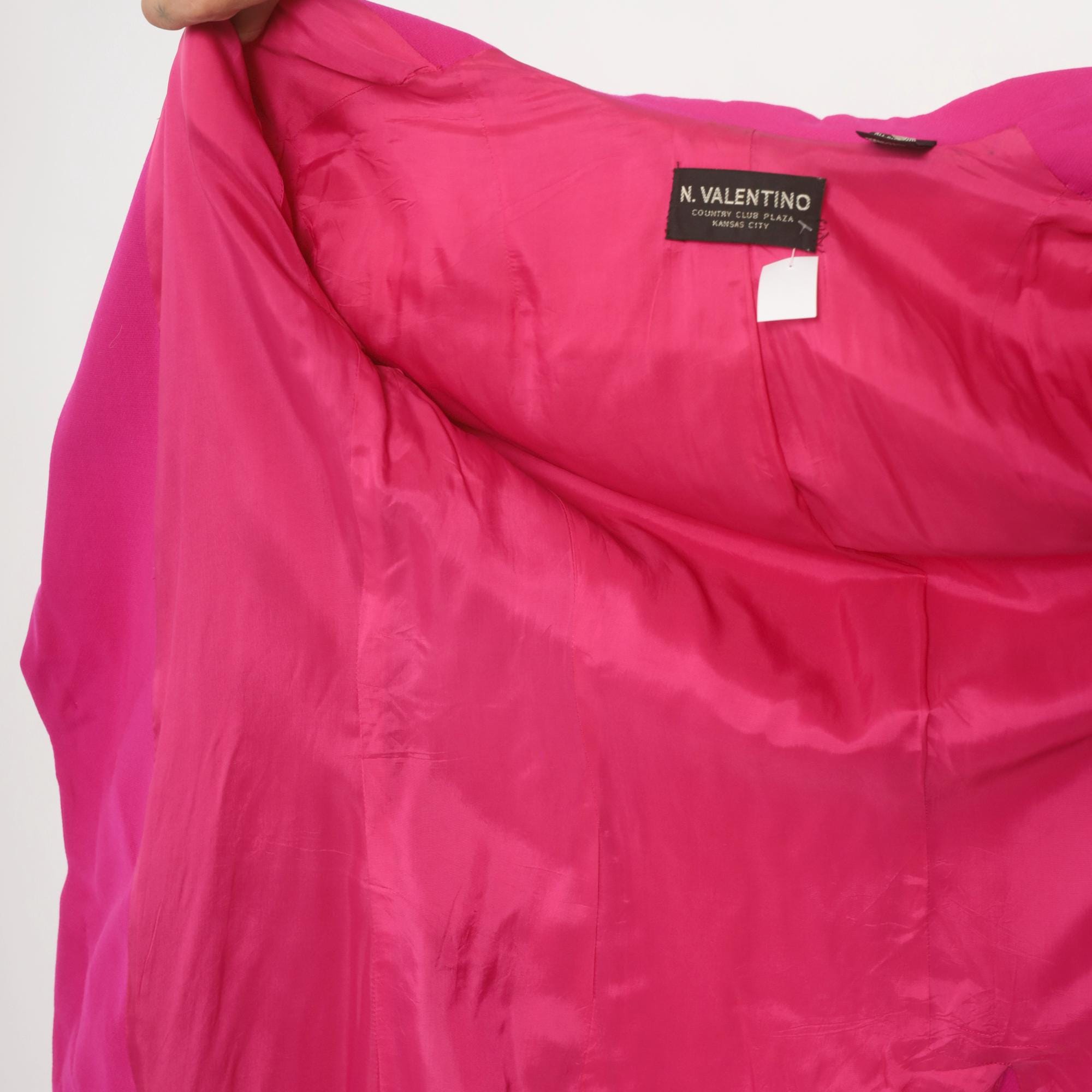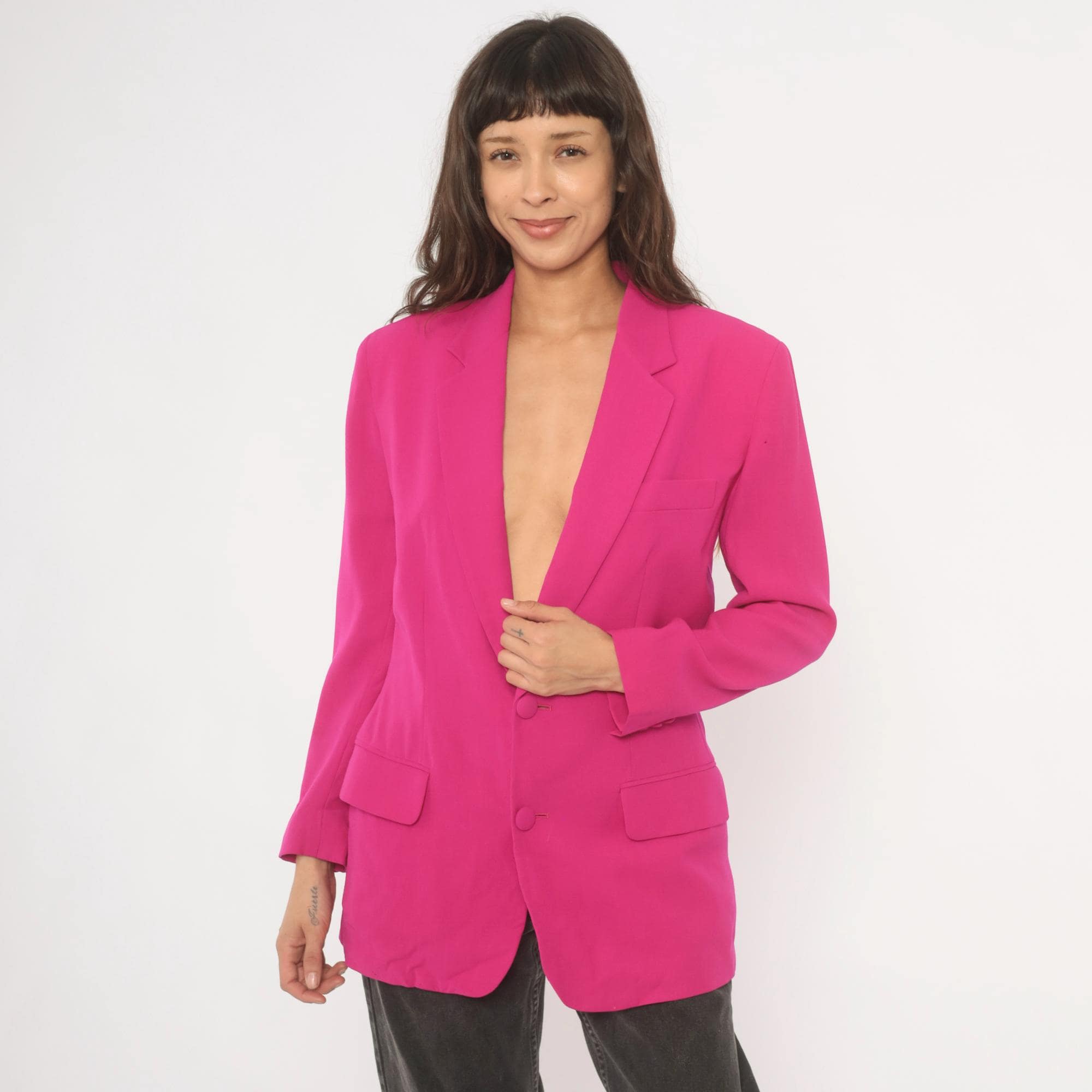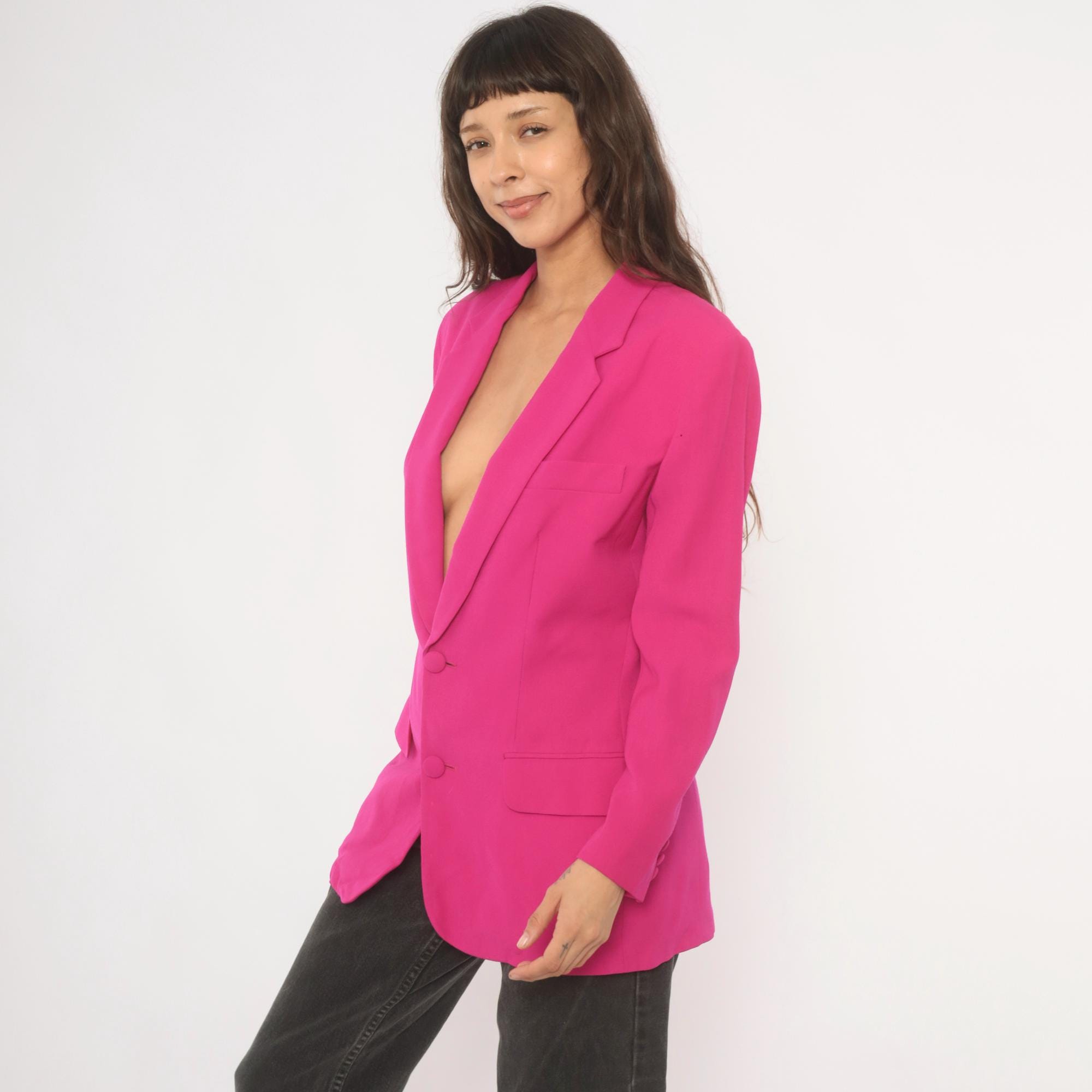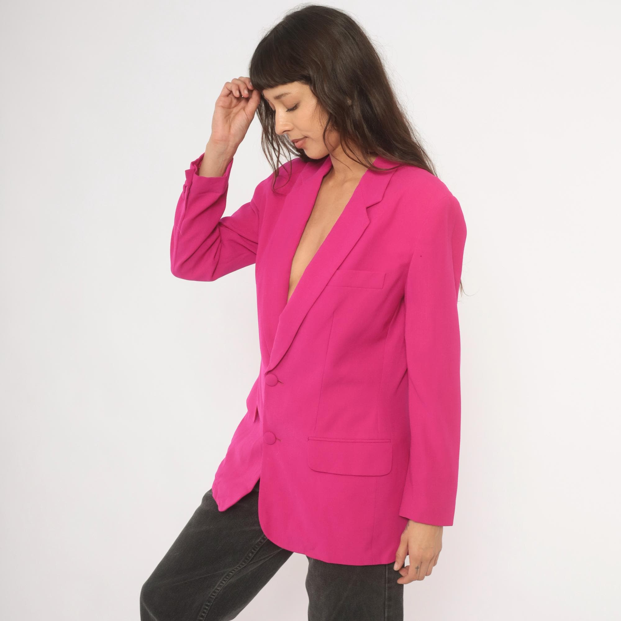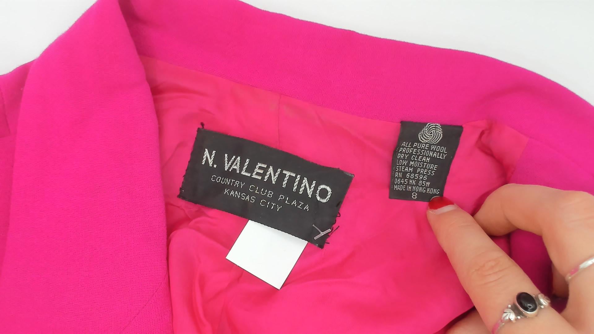 90s hot pink wool blazer from N. Valentino with notched lapels and two matching fabric-covered button front closure. Flap pockets at the hip, a welt breast pocket on the left chest, and a single back vent. Fully lined in matching fuchsia, with structured shoulders and long sleeves finished with covered button cuffs.