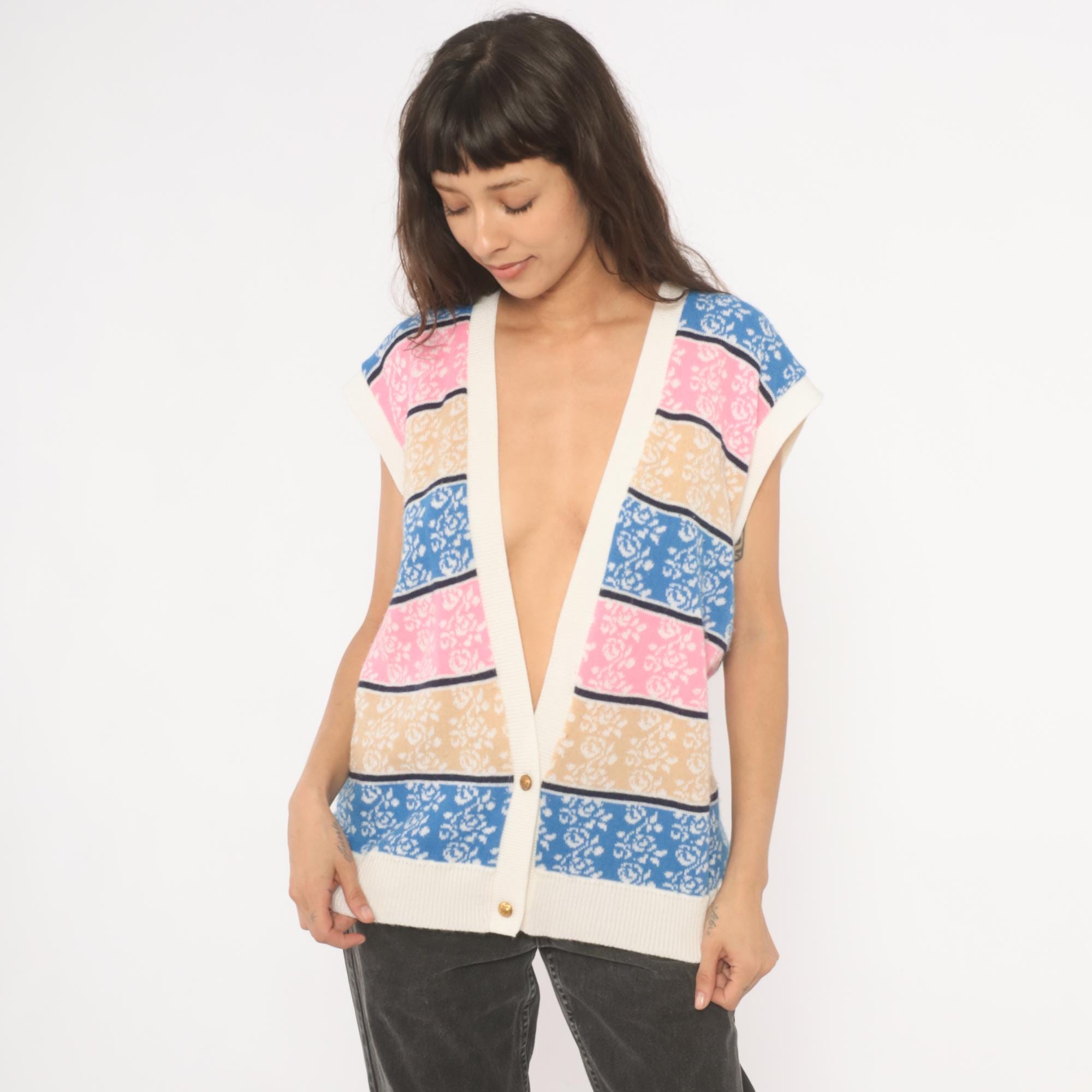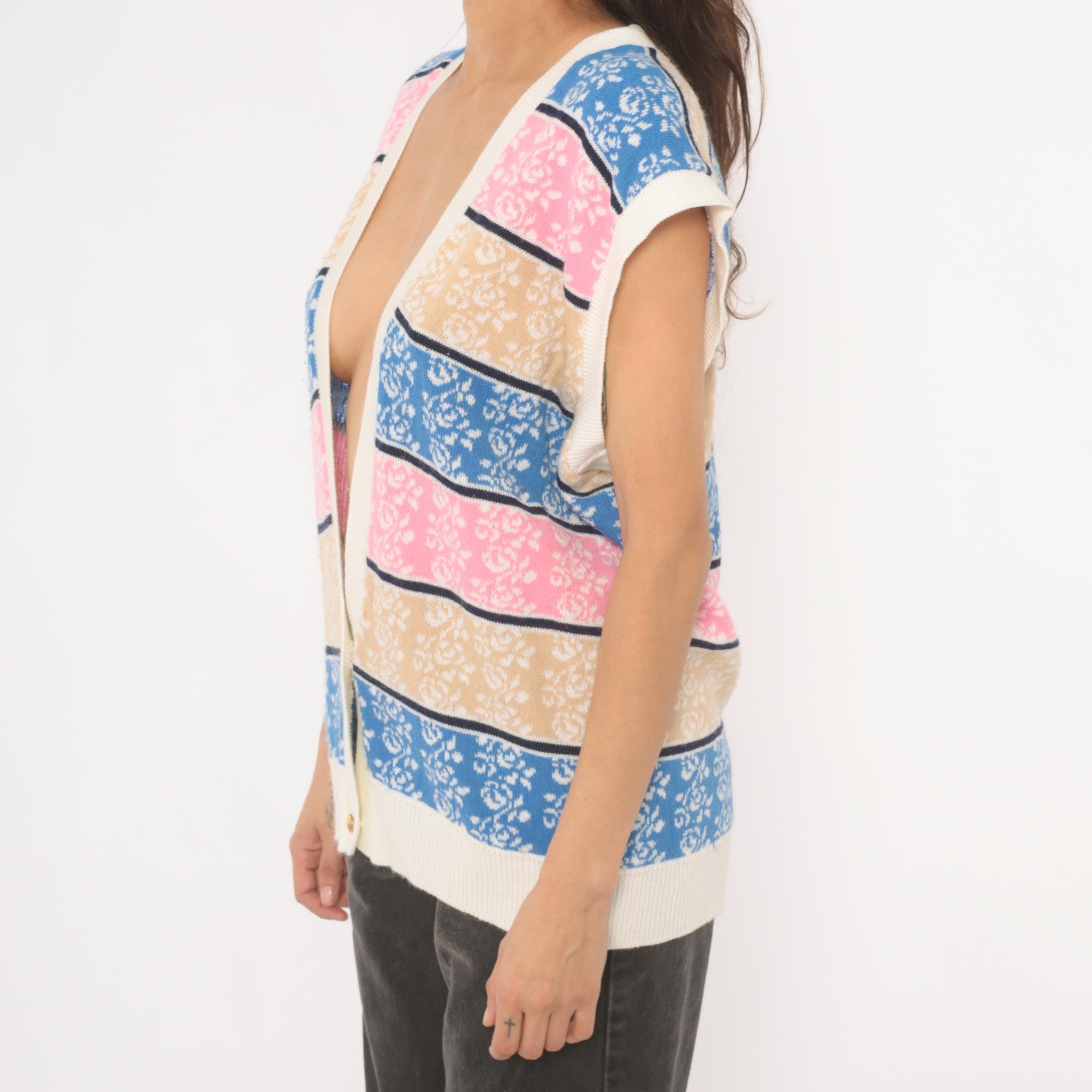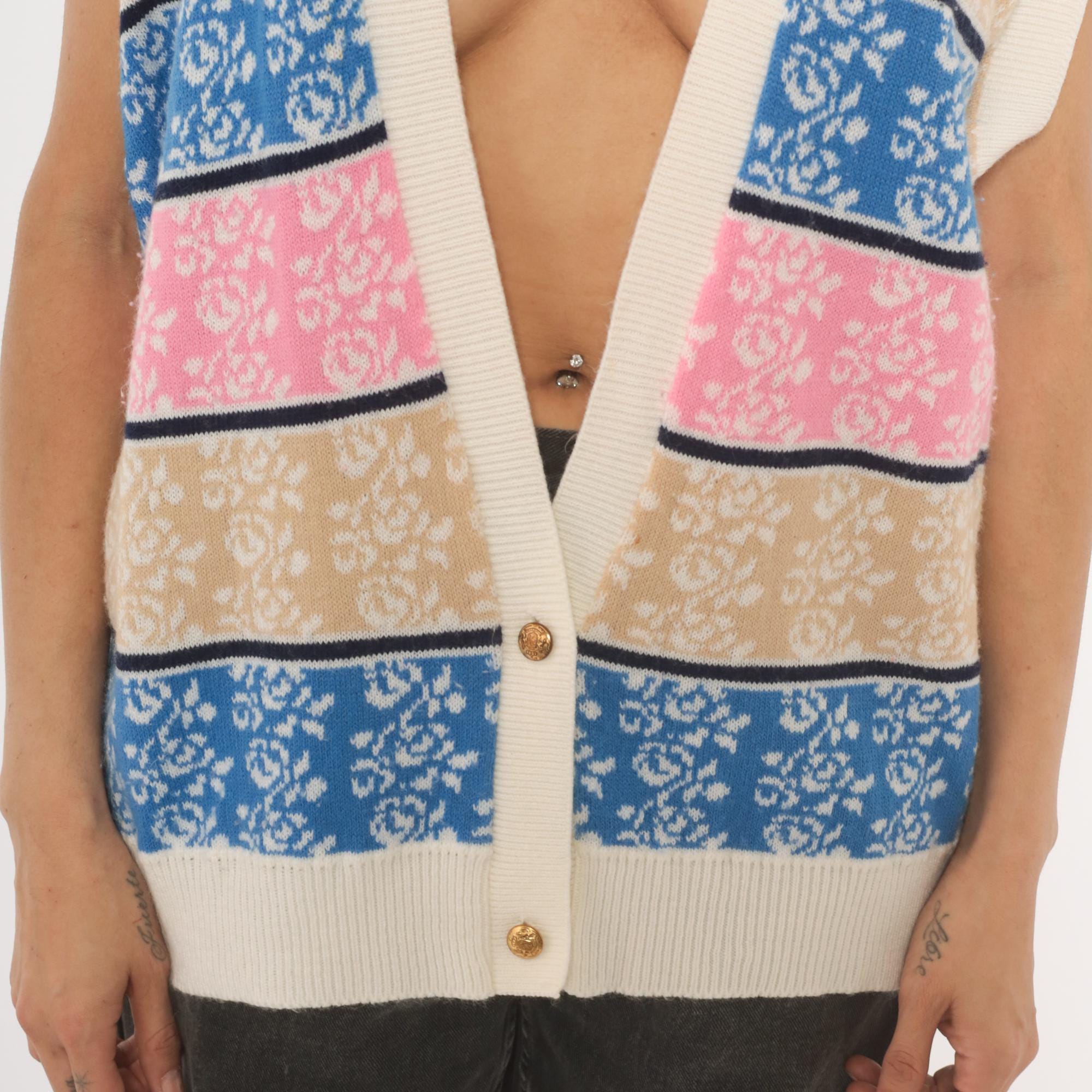 80s knit sweater vest with horizontal striped bands in blue, pink, tan, and cream, each filled with a jacquard rose pattern. Deep V neckline with ribbed cream trim, cap sleeves, and two gold-tone decorative buttons at the lower front closure.