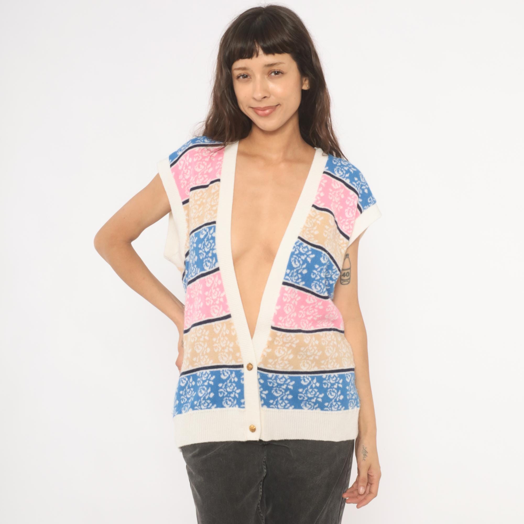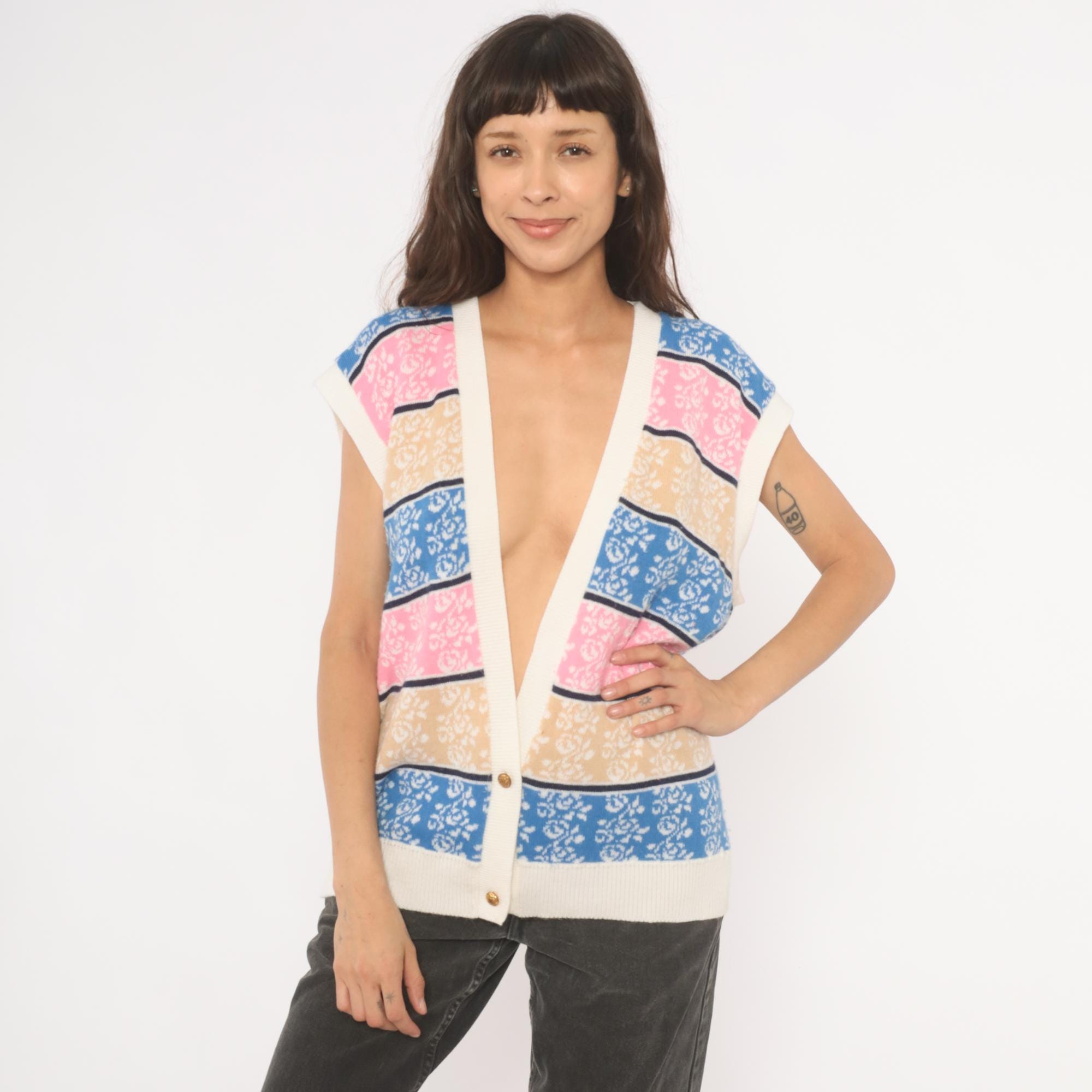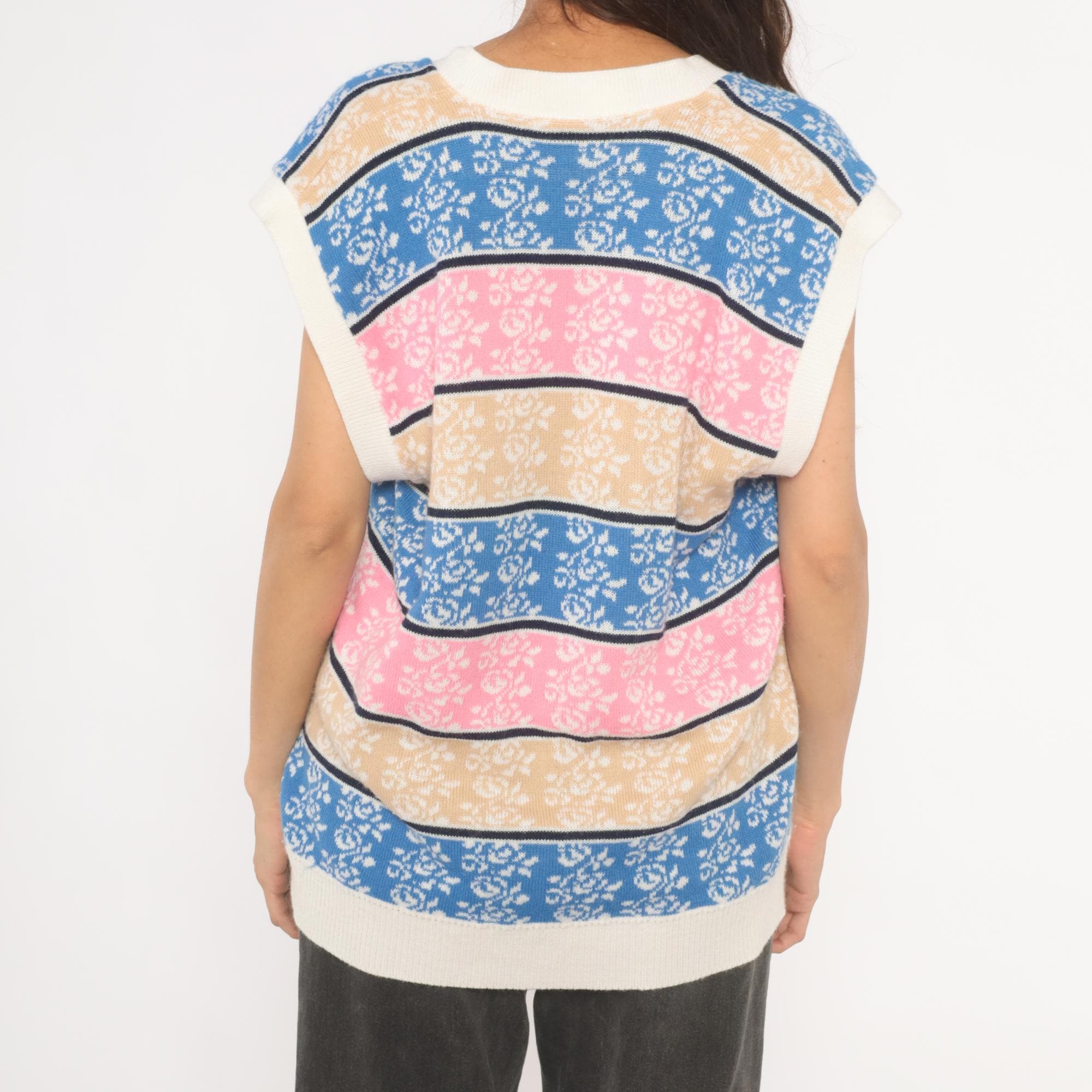 80s knit sweater vest with horizontal striped bands in blue, pink, tan, and cream, each filled with a jacquard rose pattern. Deep V neckline with ribbed cream trim, cap sleeves, and two gold-tone decorative buttons at the lower front closure.