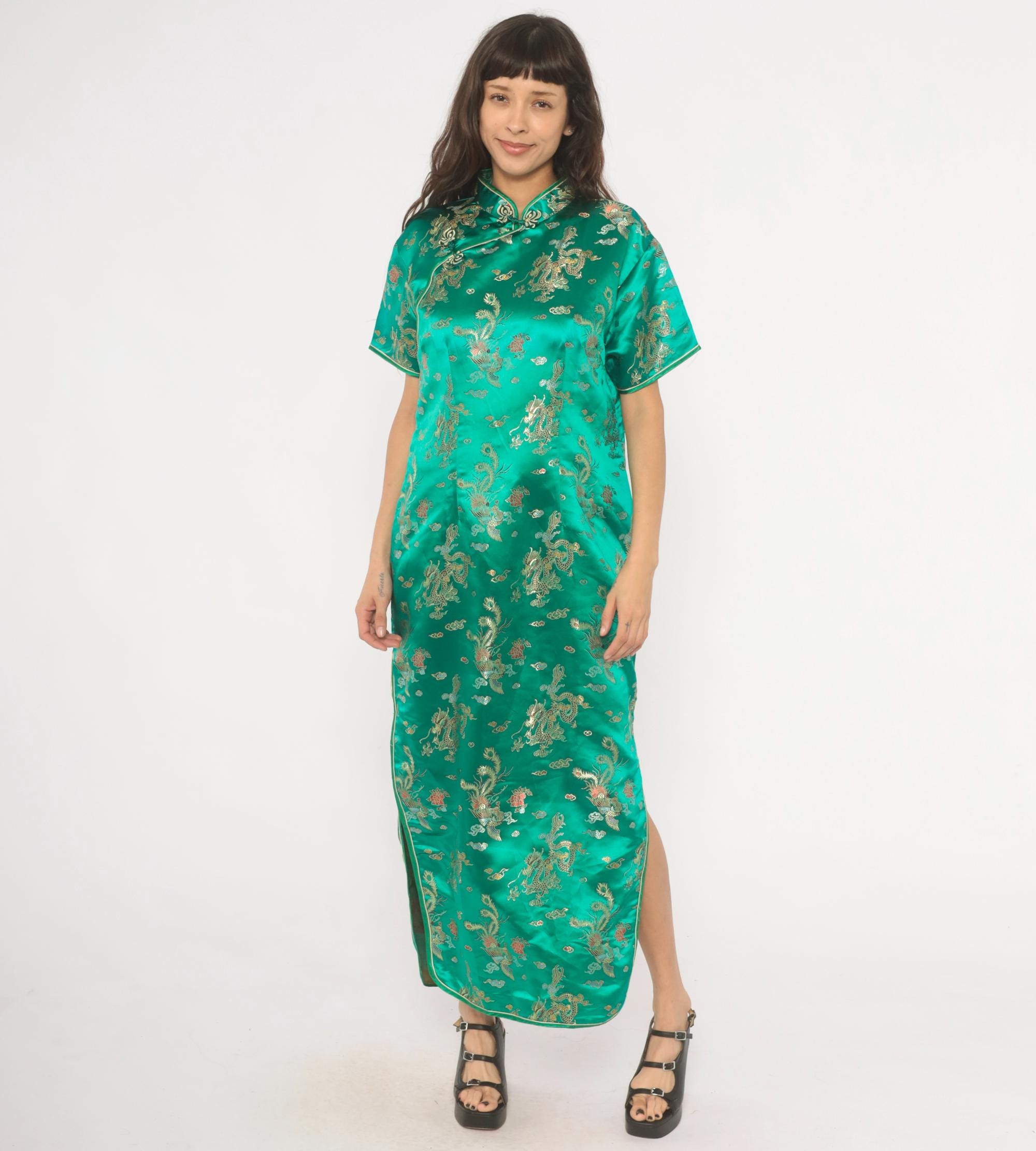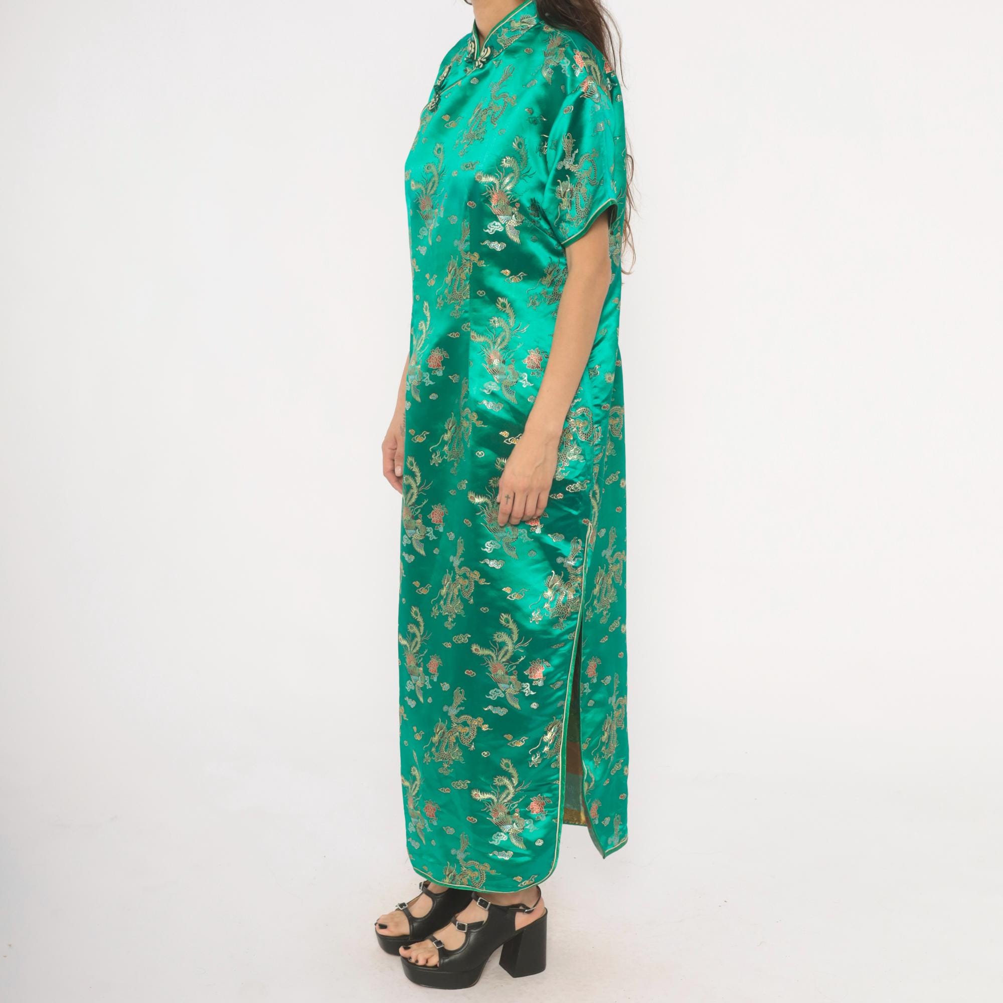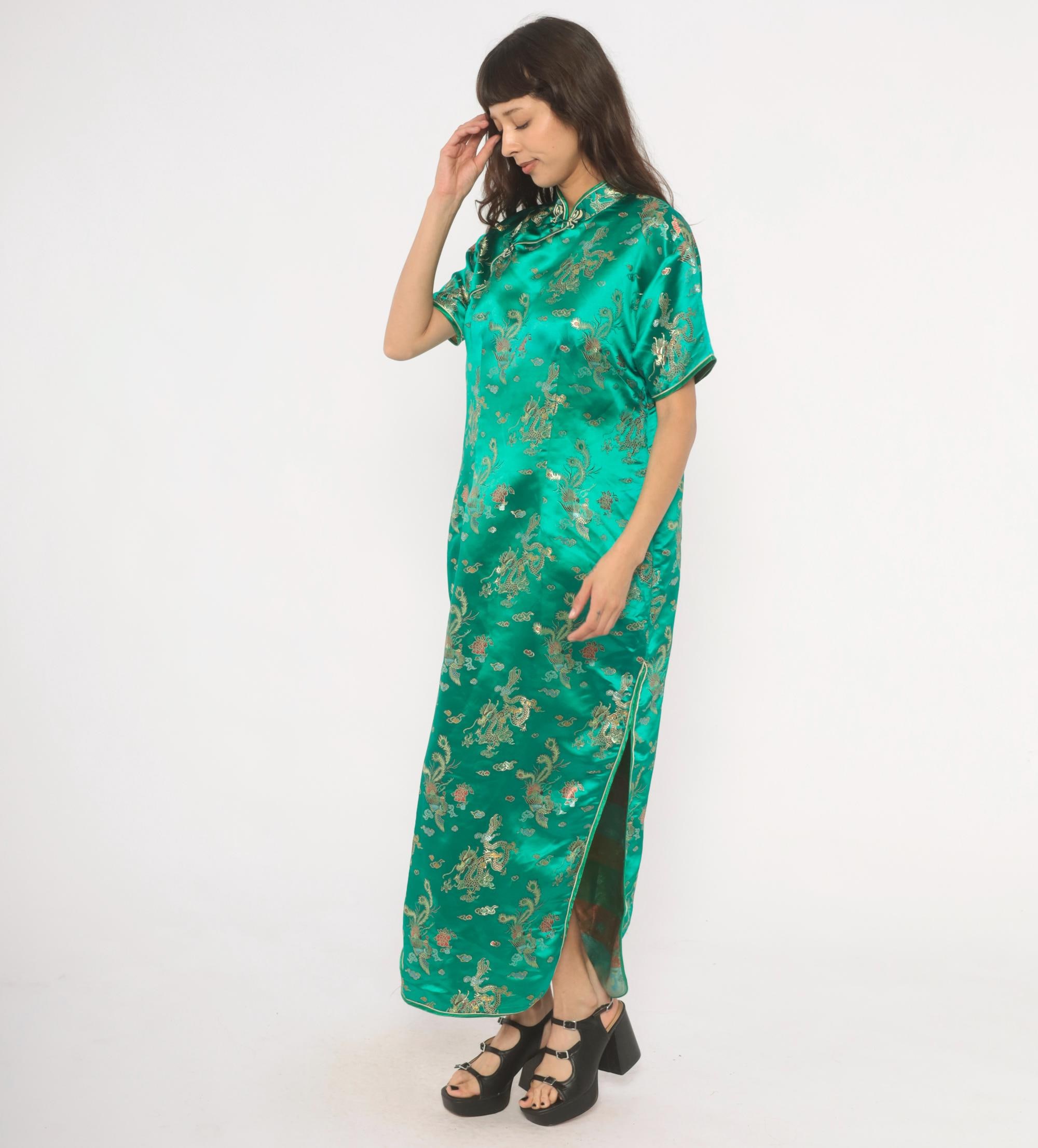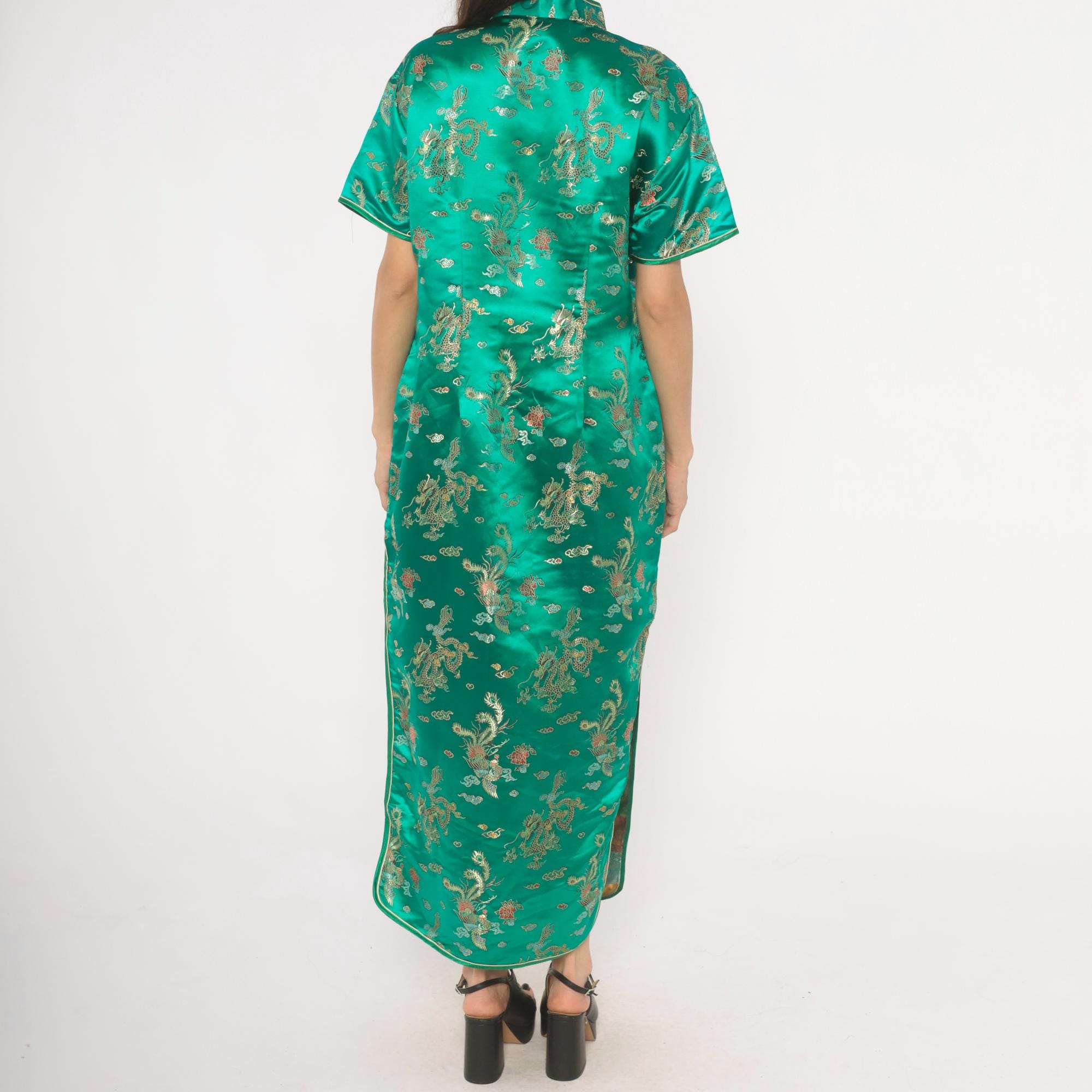 80s teal cheongsam dress from SMR in satin brocade with gold dragon and phoenix motifs woven throughout. Mandarin collar with frog button closures at the neckline and diagonal front panel, short cuffed sleeves with piped trim. Straight silhouette with side slits at the lower hem, side zipper and snap closure, gold piping along the edges and hem.