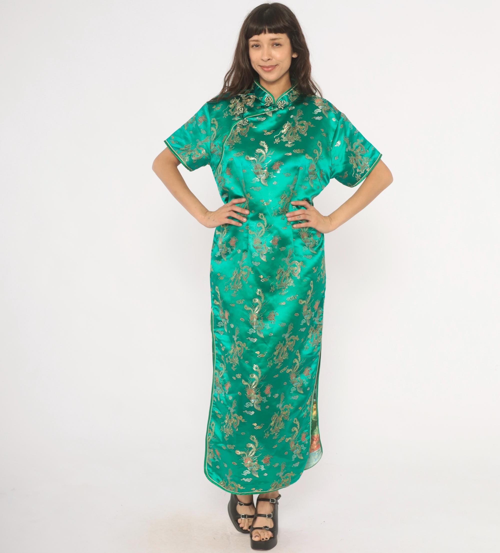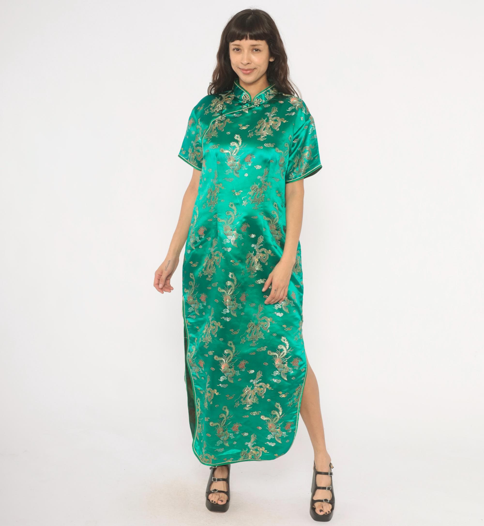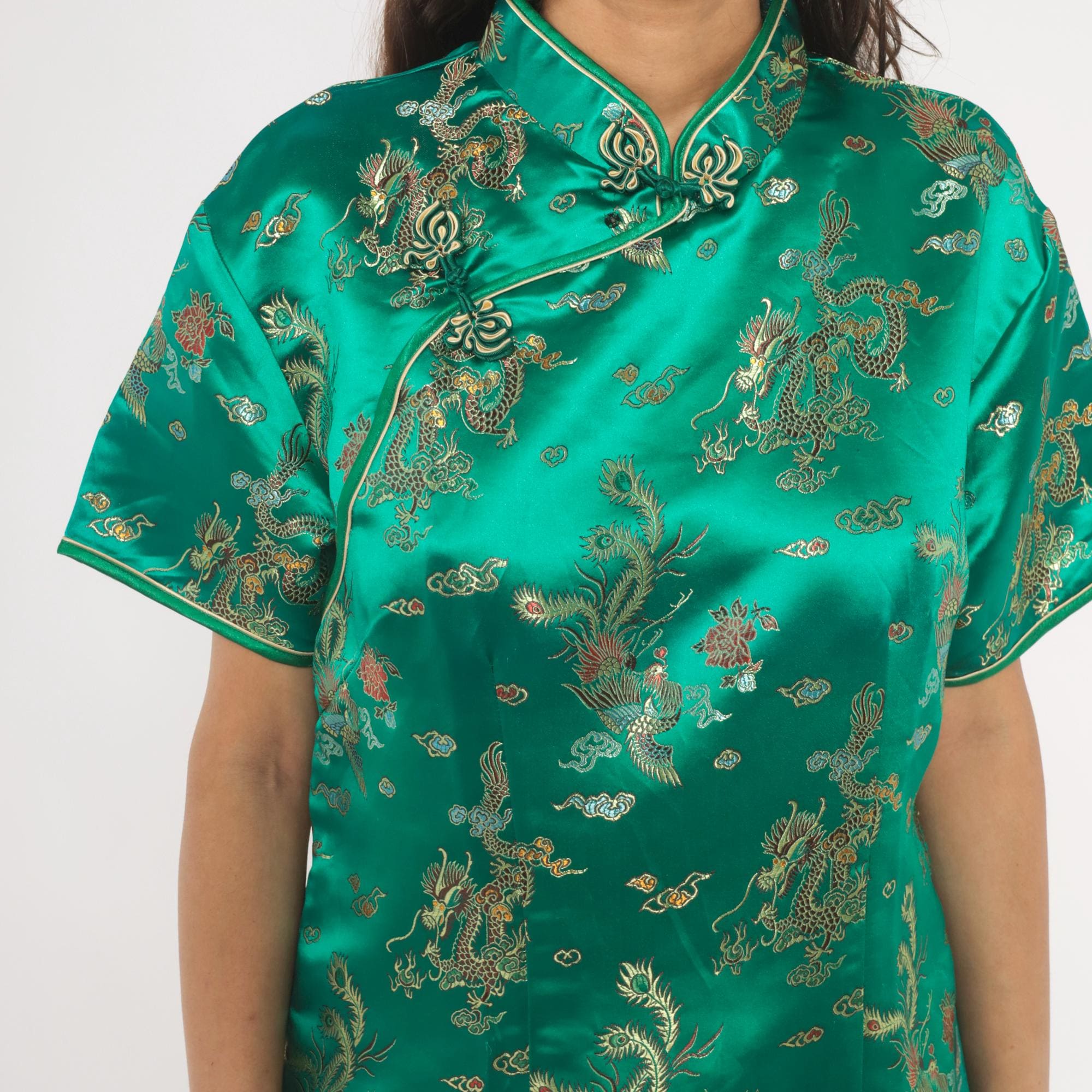 80s teal cheongsam dress from SMR in satin brocade with gold dragon and phoenix motifs woven throughout. Mandarin collar with frog button closures at the neckline and diagonal front panel, short cuffed sleeves with piped trim. Straight silhouette with side slits at the lower hem, side zipper and snap closure, gold piping along the edges and hem.