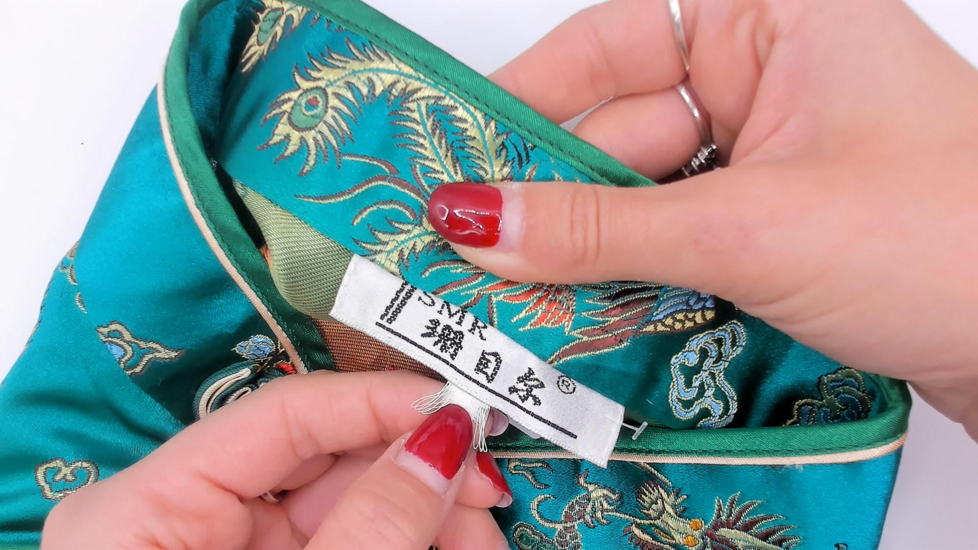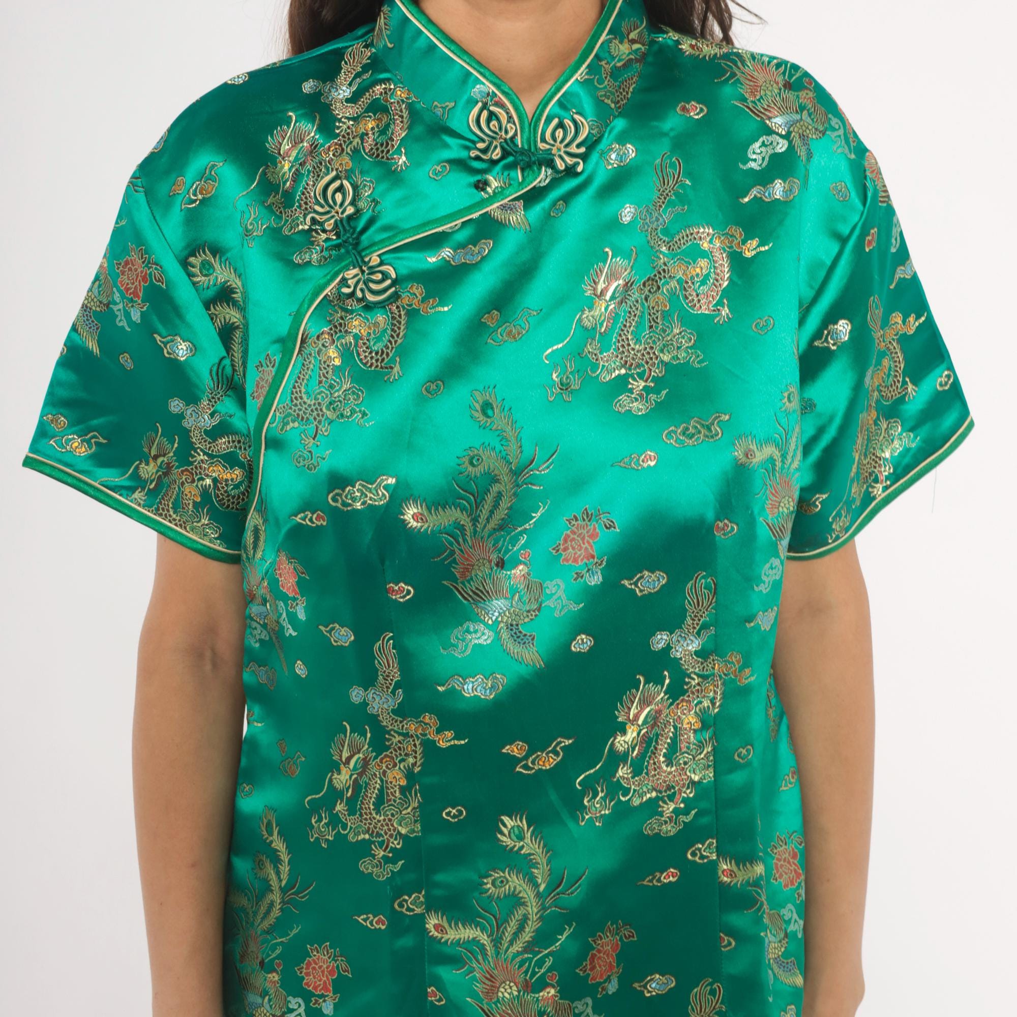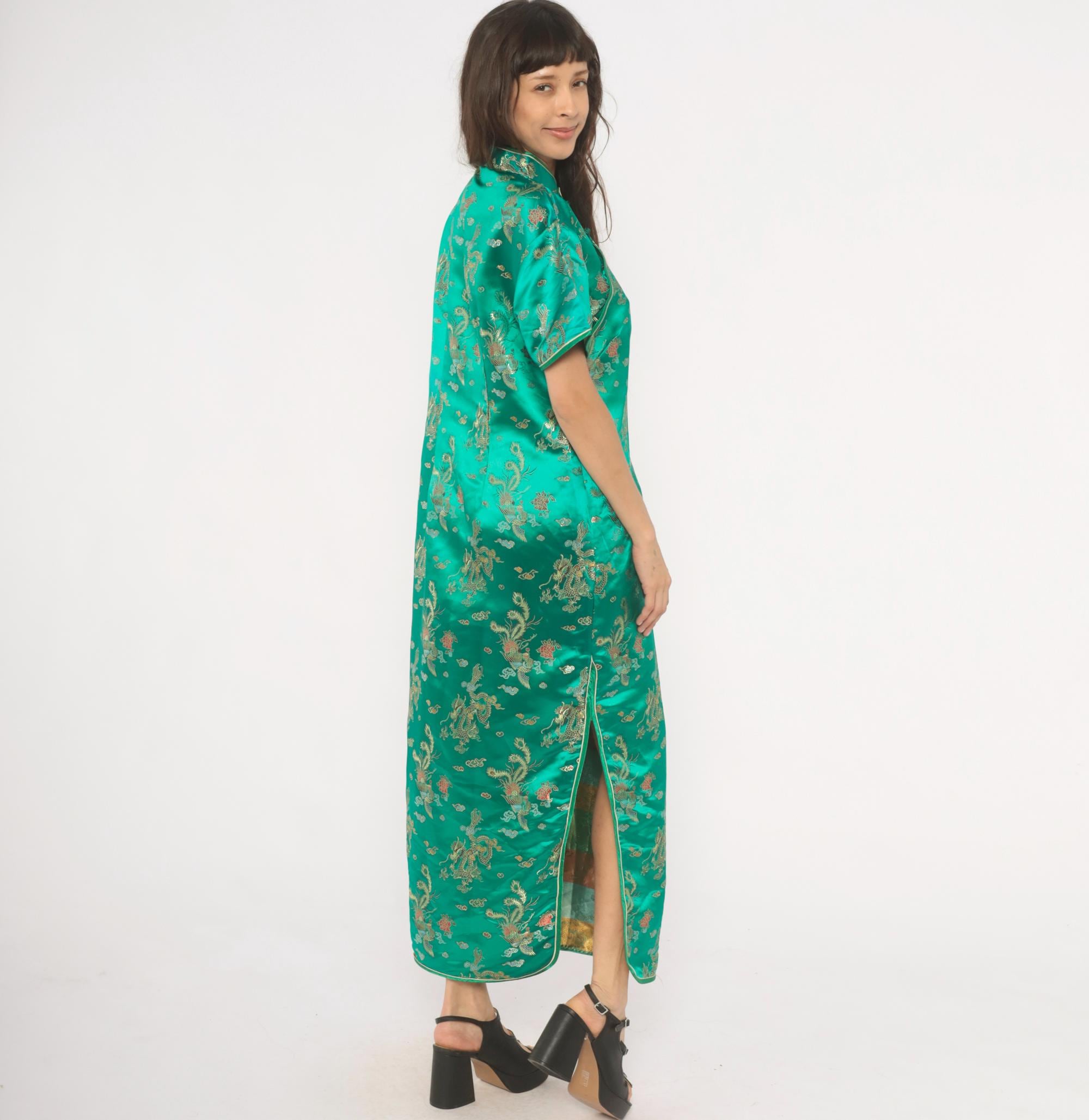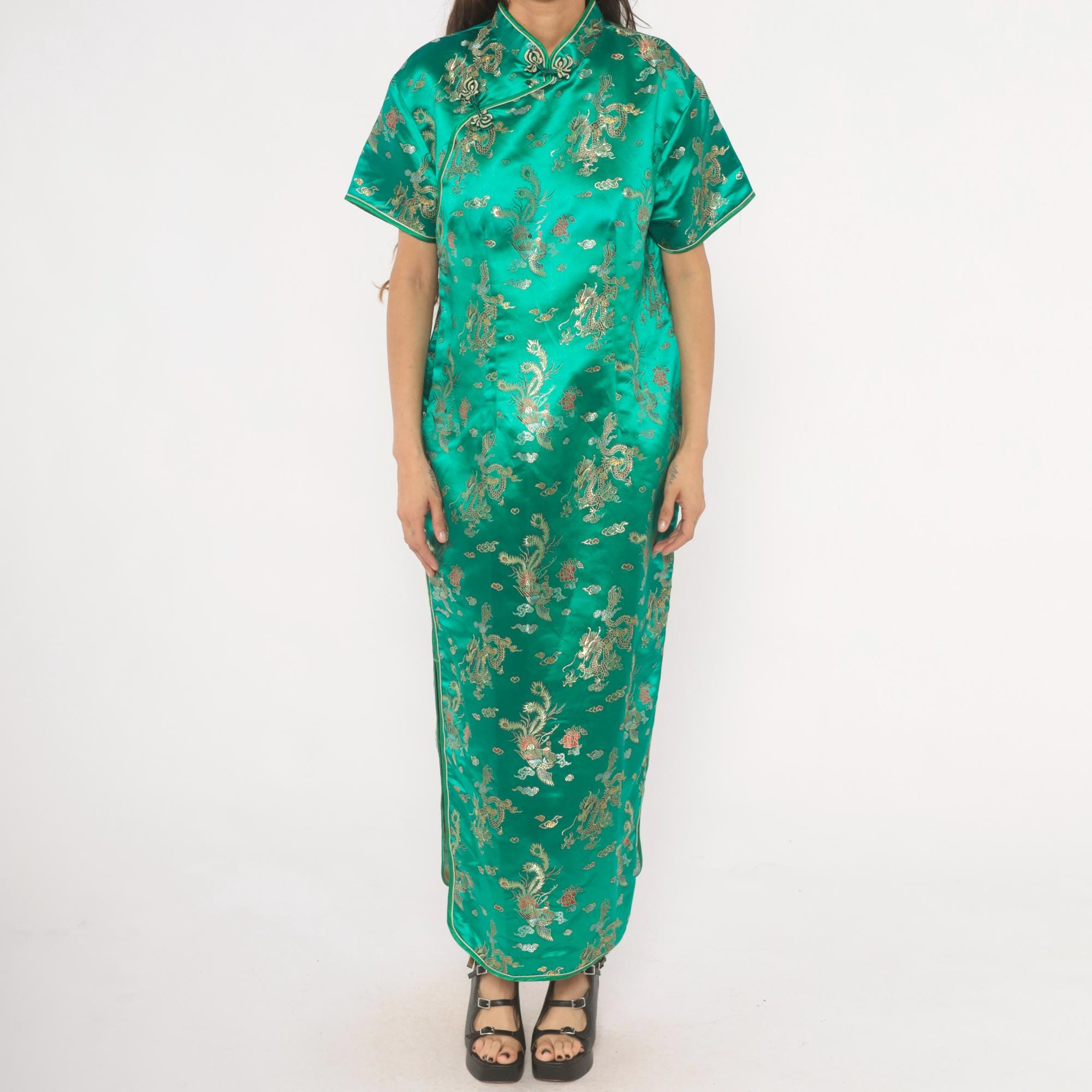 80s teal cheongsam dress from SMR in satin brocade with gold dragon and phoenix motifs woven throughout. Mandarin collar with frog button closures at the neckline and diagonal front panel, short cuffed sleeves with piped trim. Straight silhouette with side slits at the lower hem, side zipper and snap closure, gold piping along the edges and hem.
