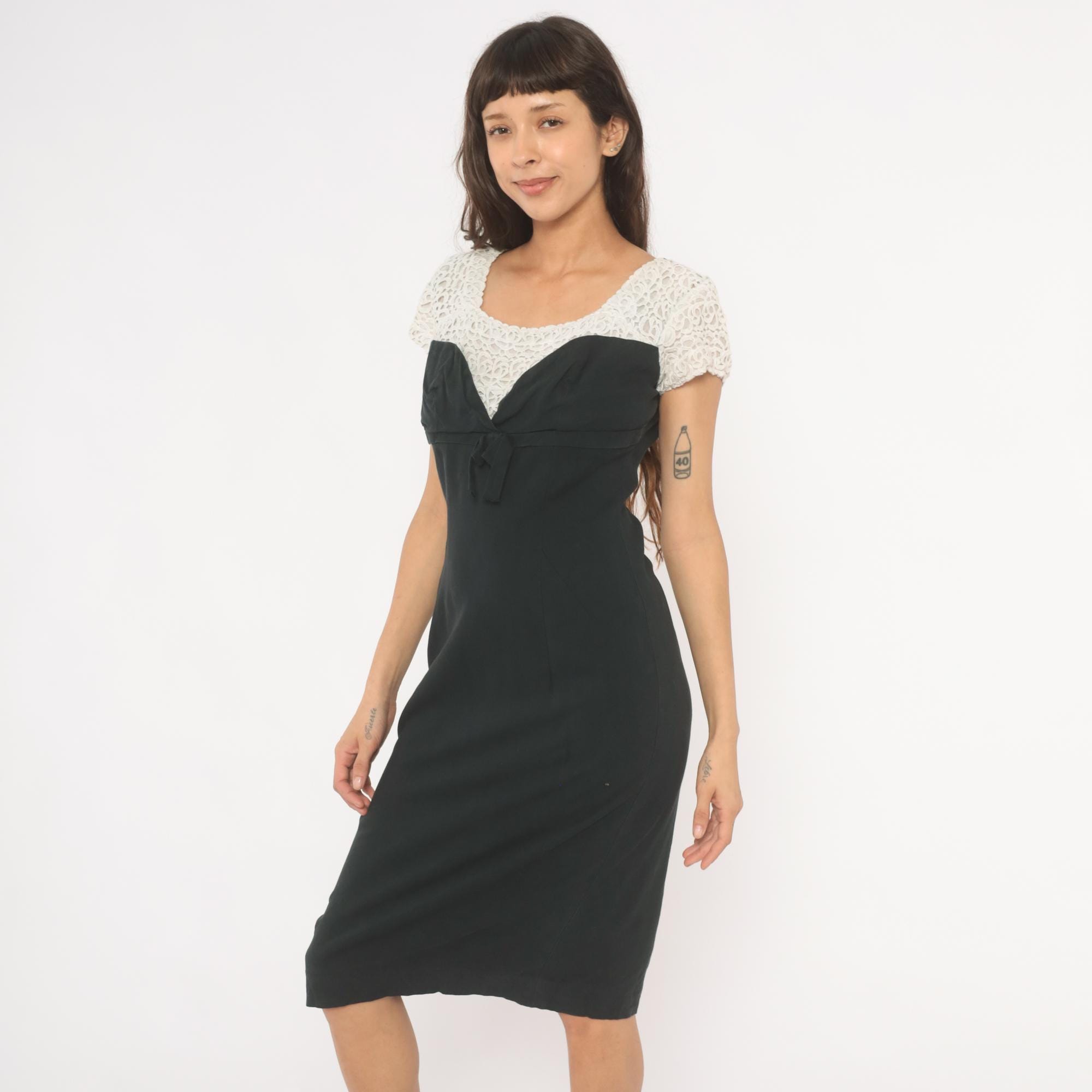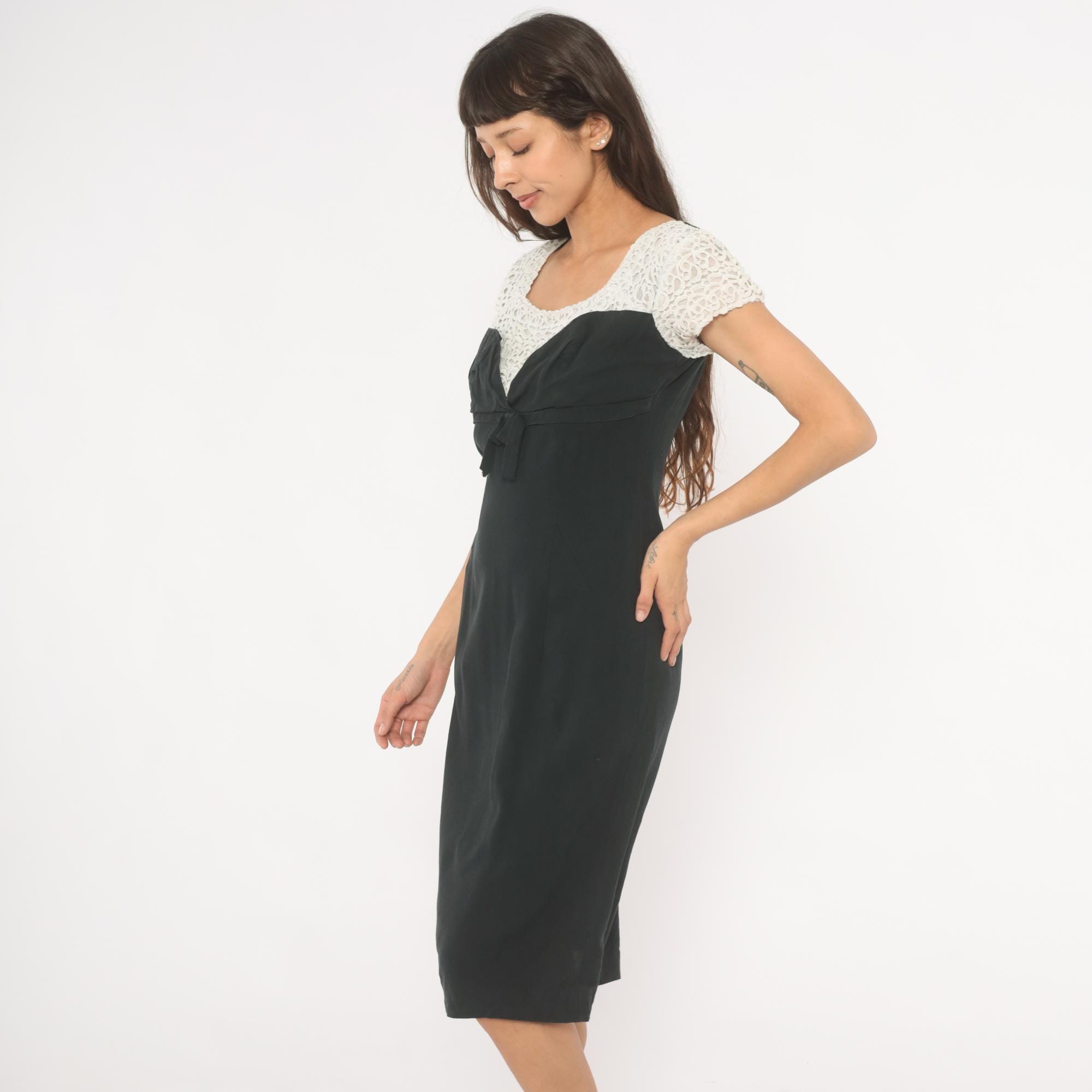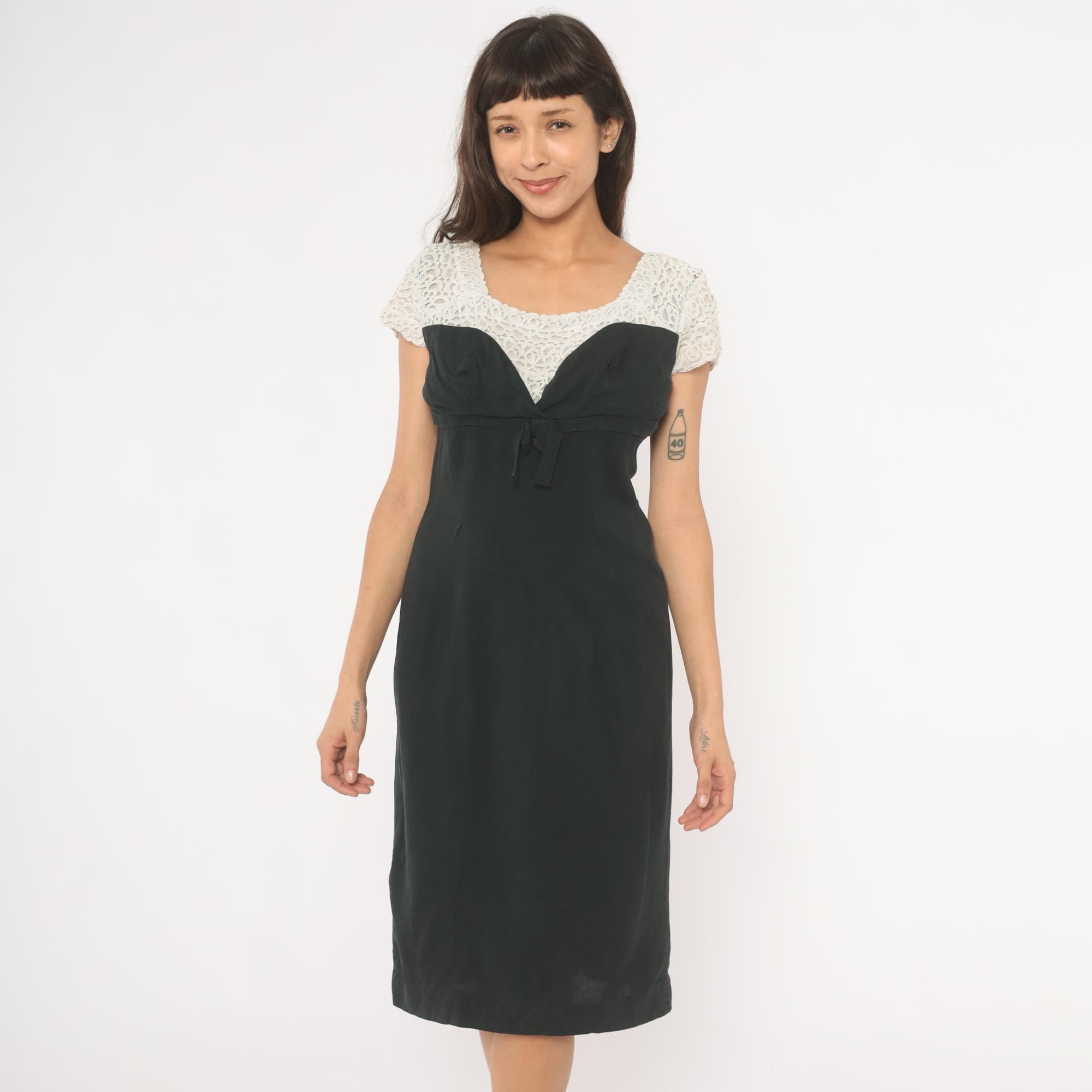 60s black dress with a white crochet lace yoke and cap sleeves, sweetheart-shaped bodice with a small bow at center front. Empire waist seam with a straight, narrow skirt falling to knee length. Back zipper closure and a back hem vent.