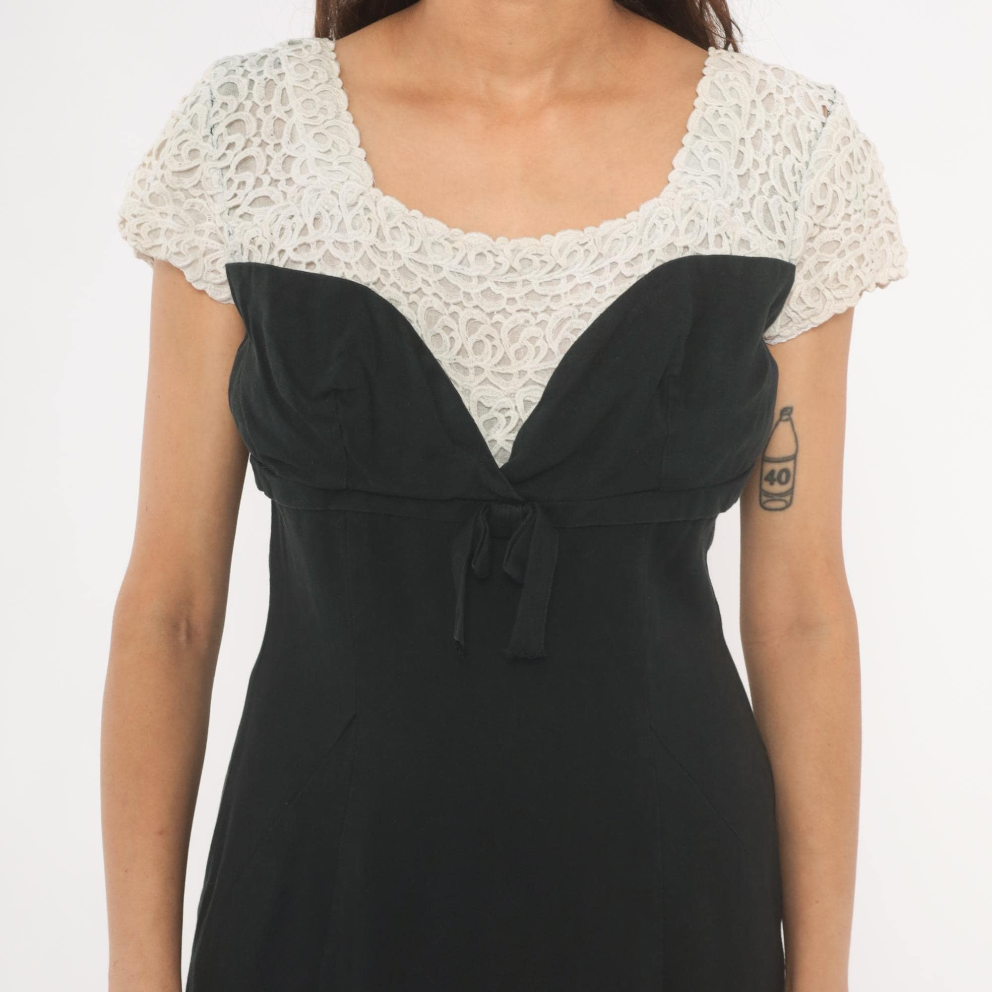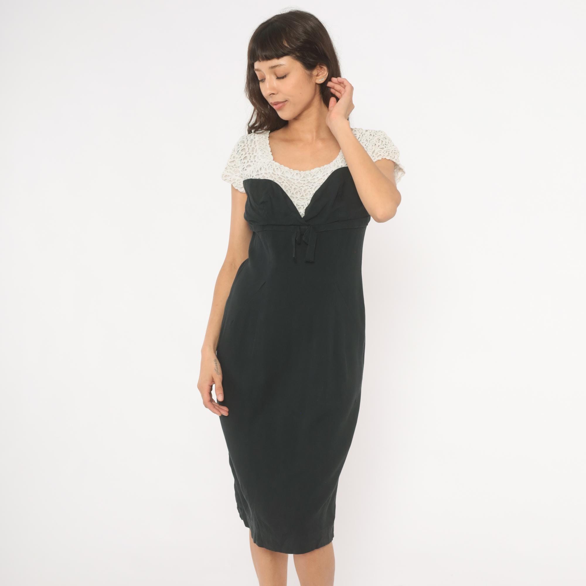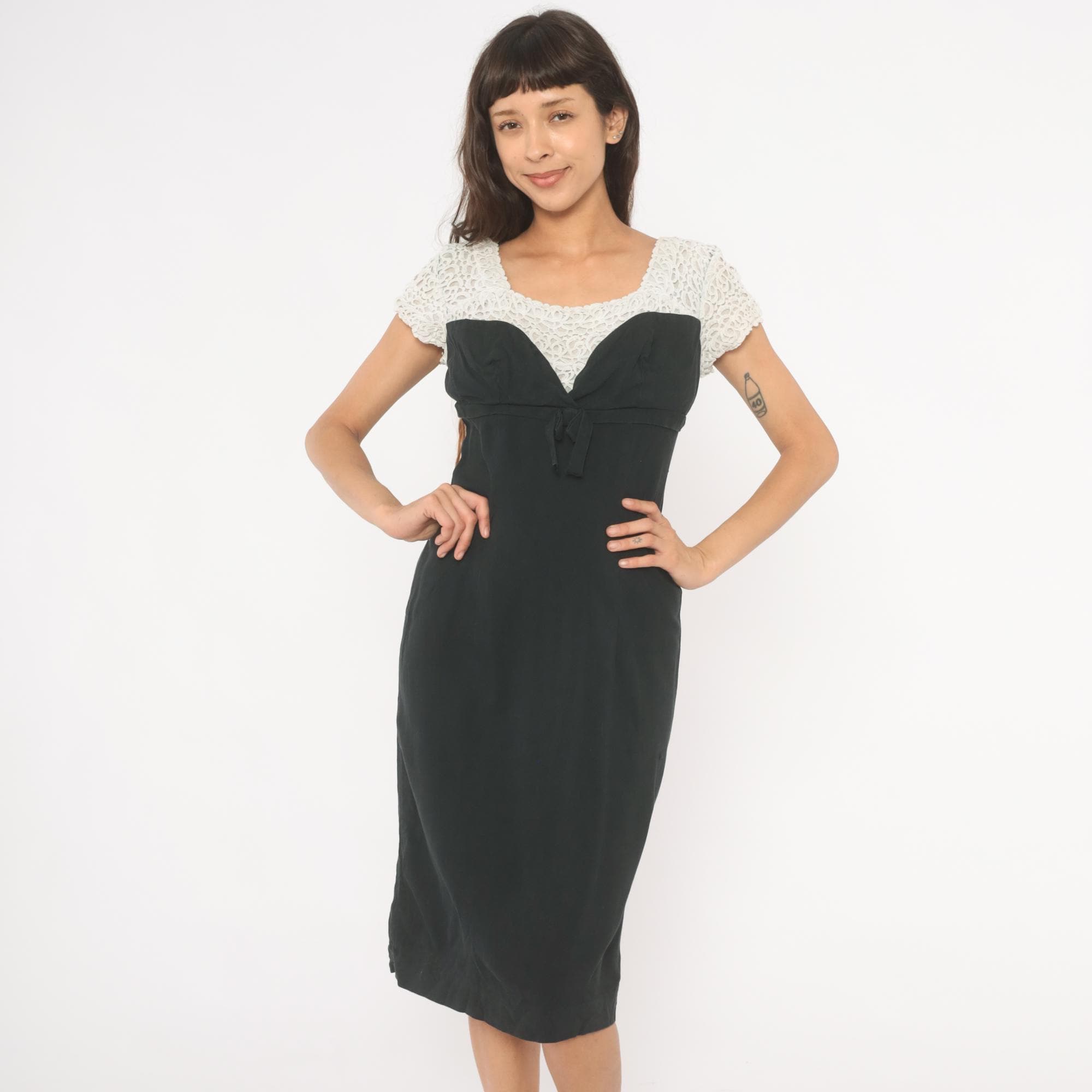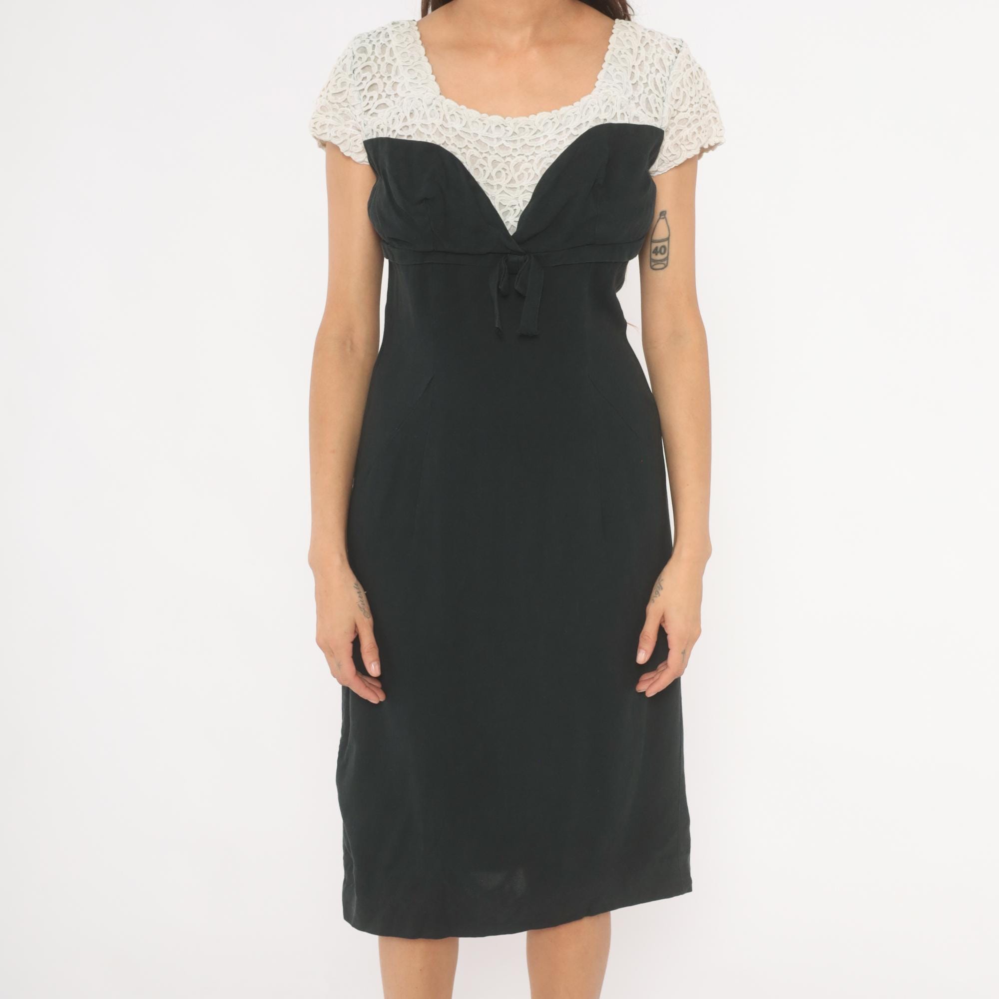 60s black dress with a white crochet lace yoke and cap sleeves, sweetheart-shaped bodice with a small bow at center front. Empire waist seam with a straight, narrow skirt falling to knee length. Back zipper closure and a back hem vent.