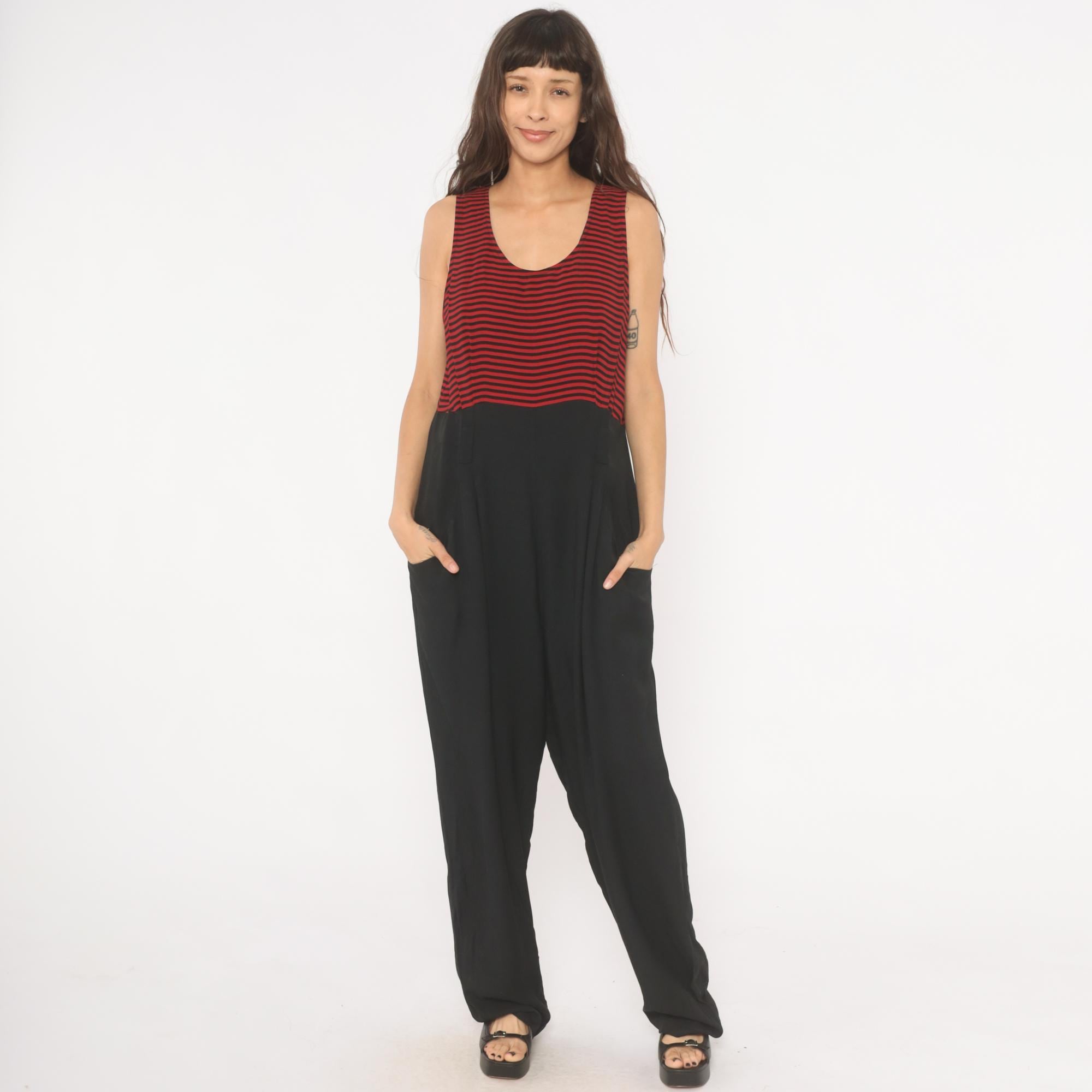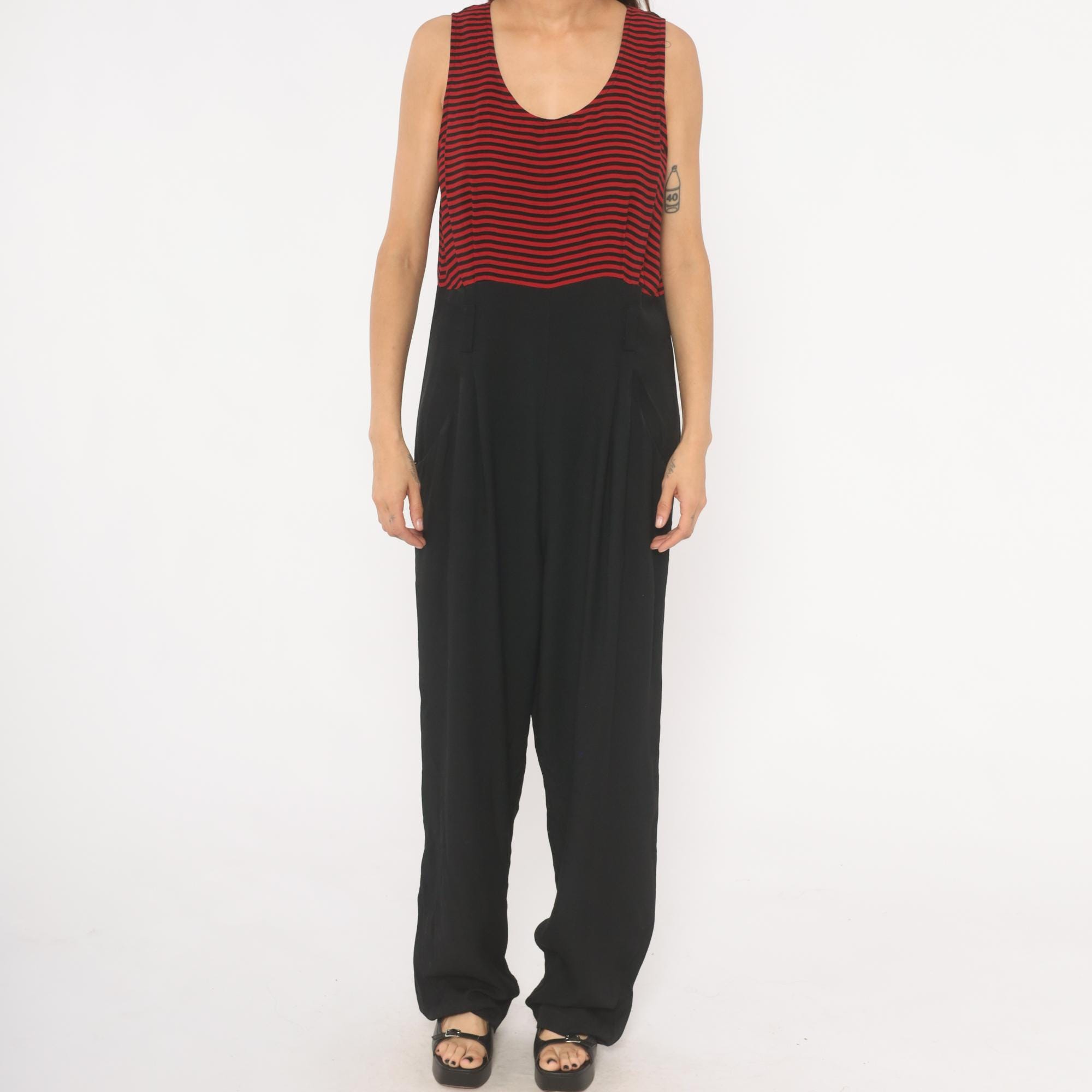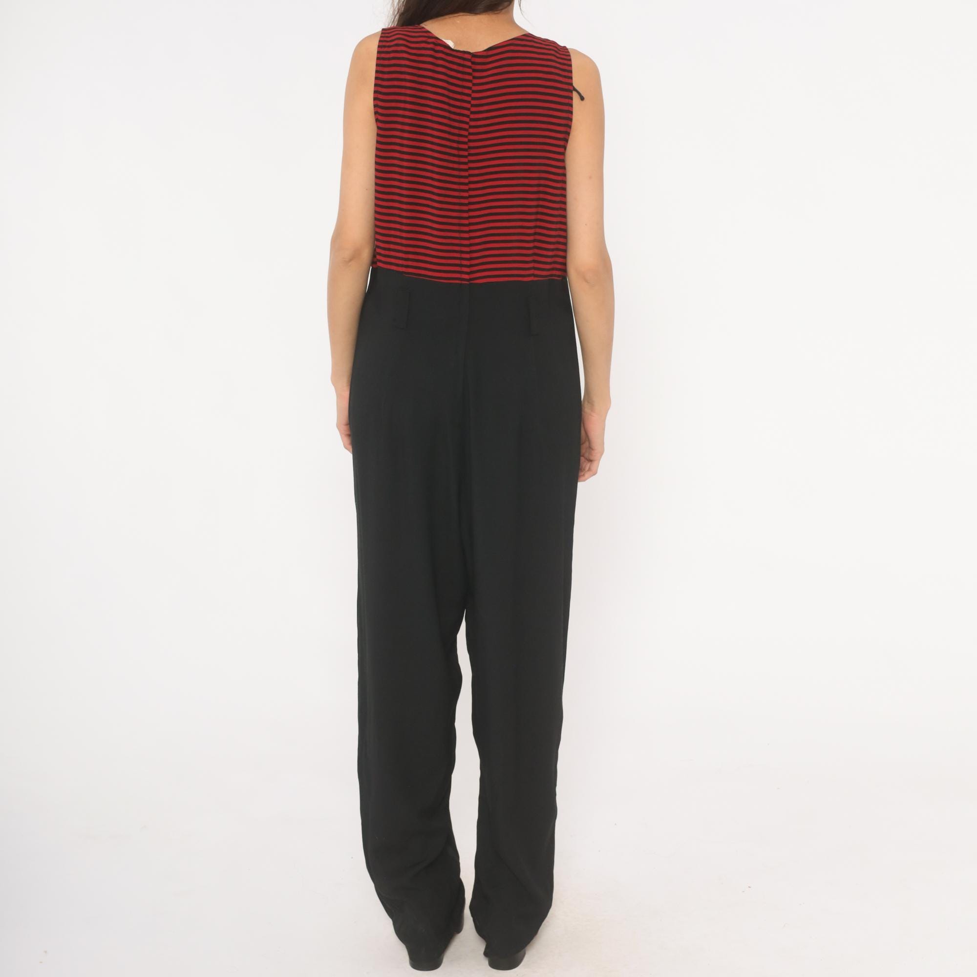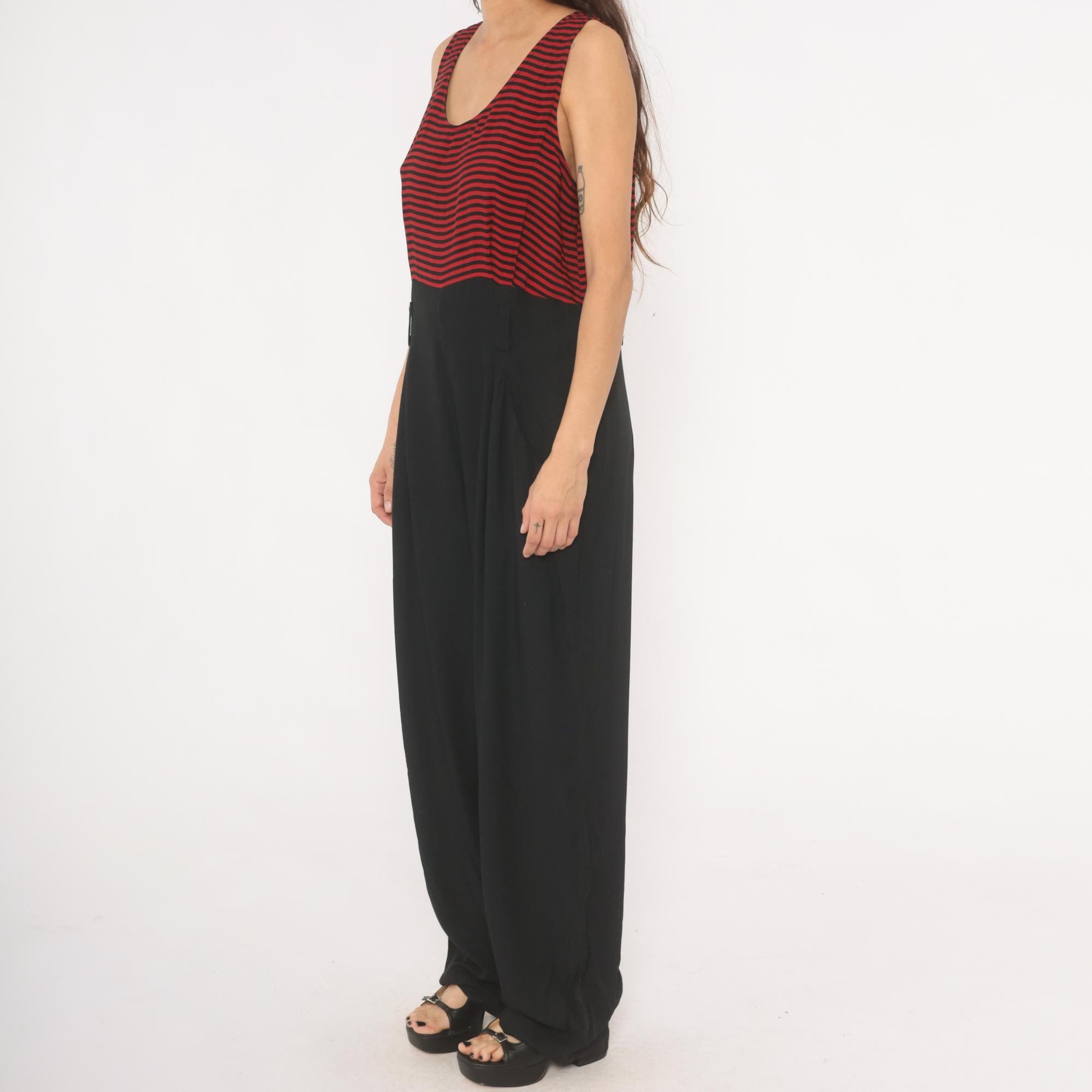 90s sleeveless jumpsuit with a red and black horizontal striped bodice and solid black wide leg bottom half. Scoop neckline, tank-style shoulders, and a back zipper closure. Side seam pockets on both hips, with a relaxed, straight leg silhouette that falls to full length.