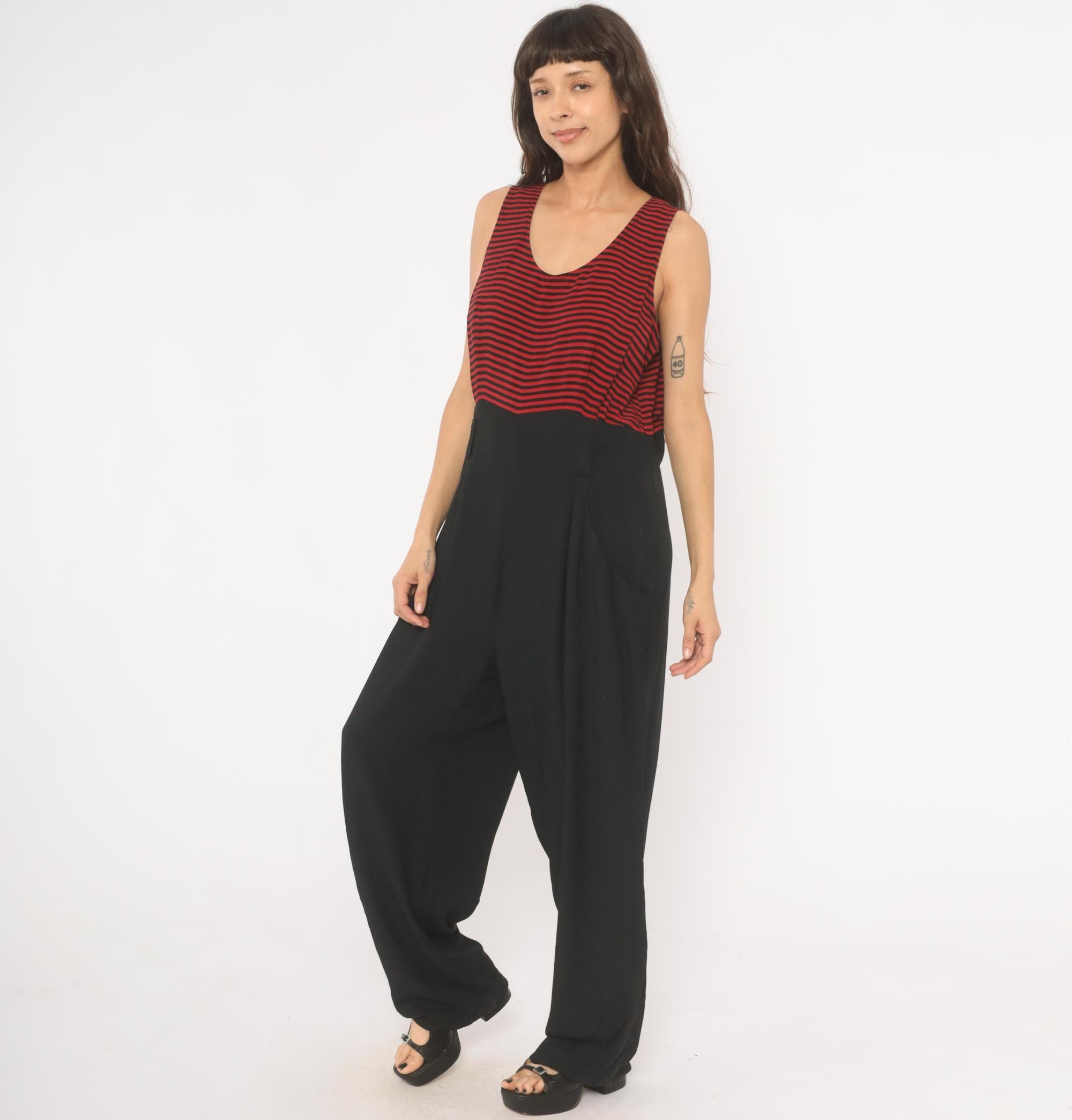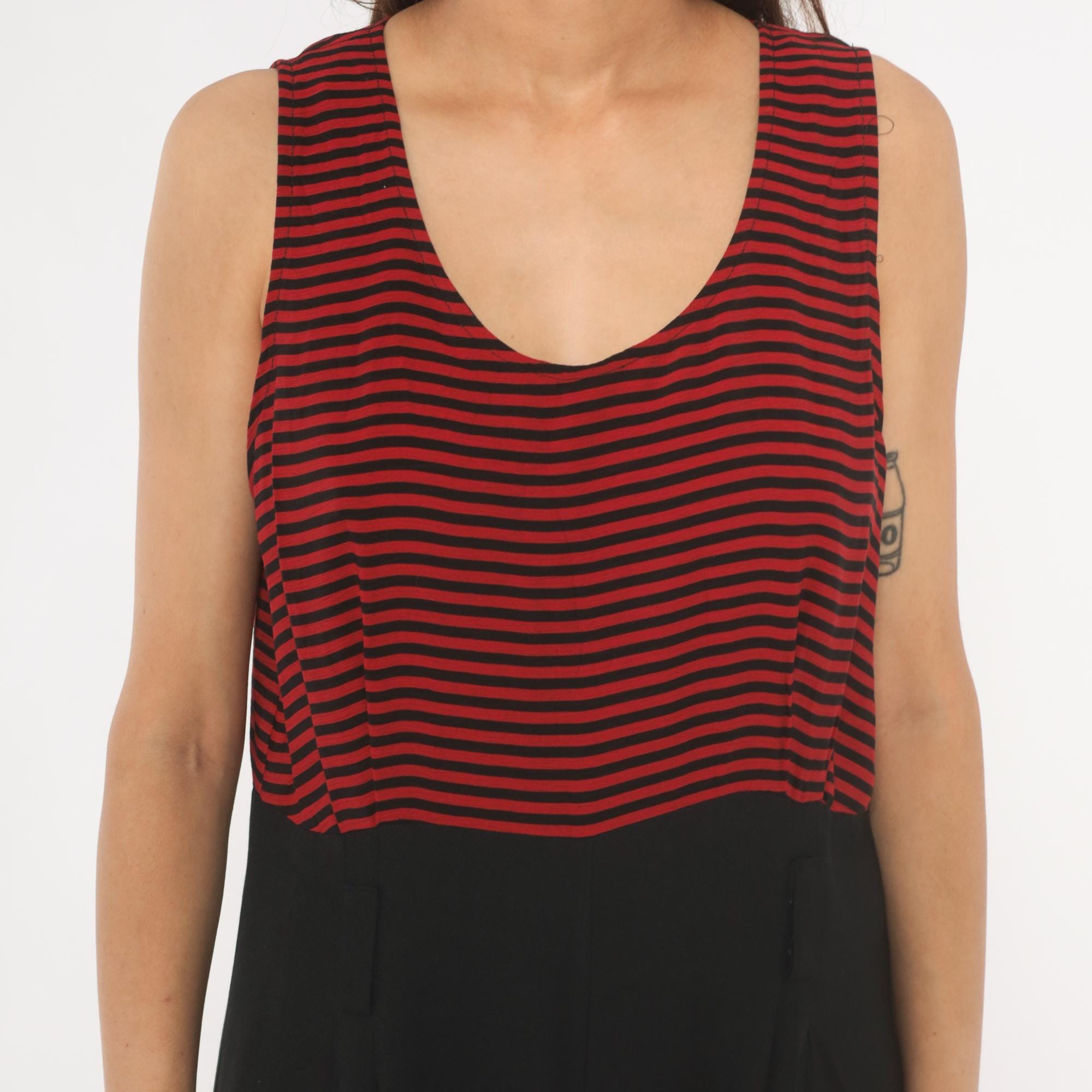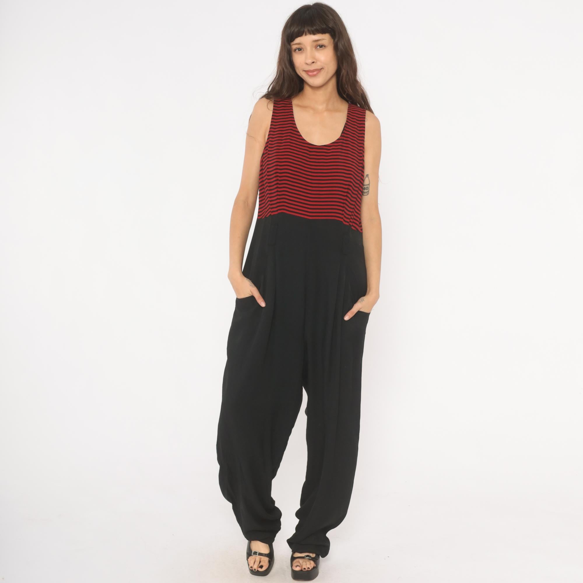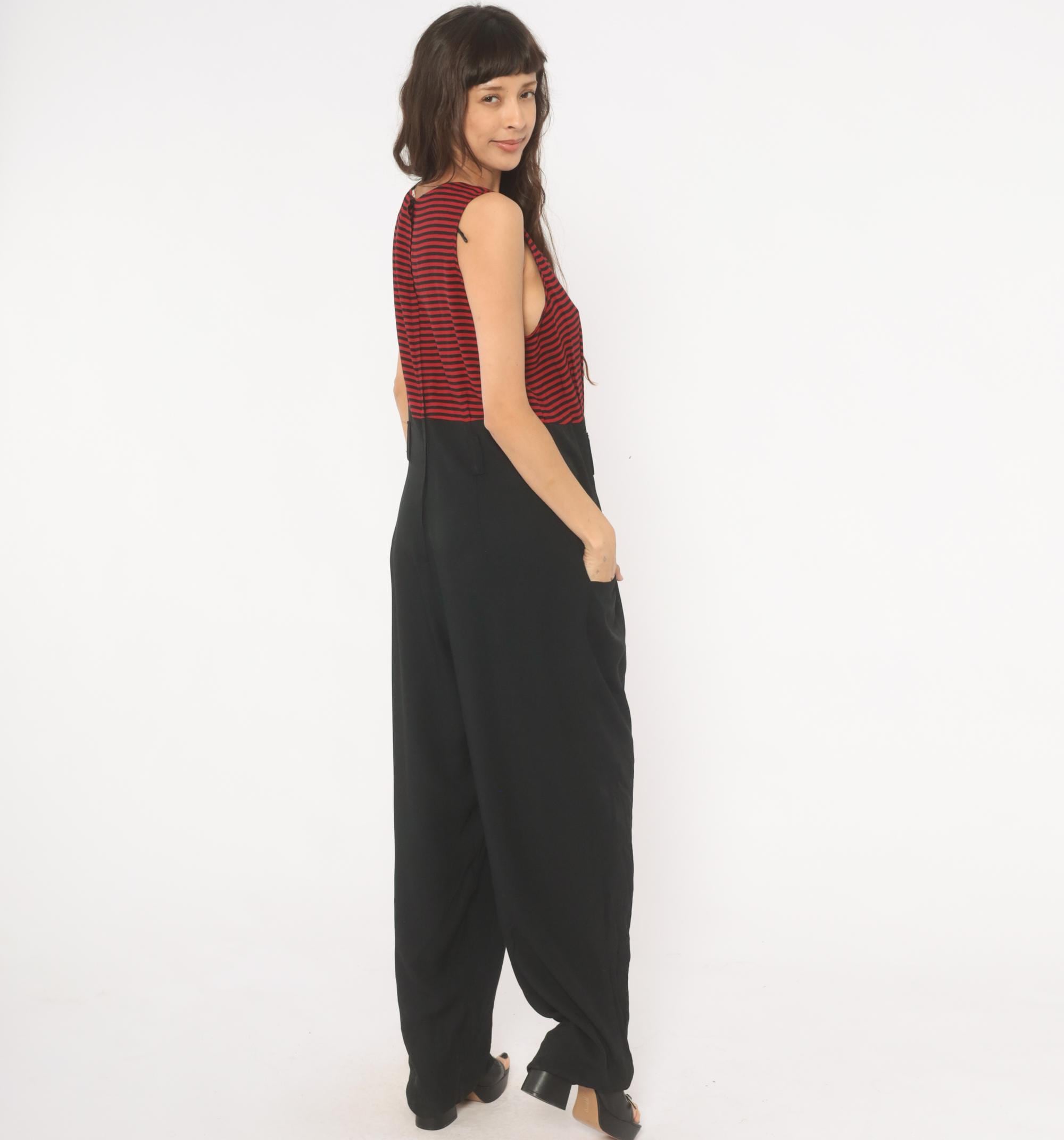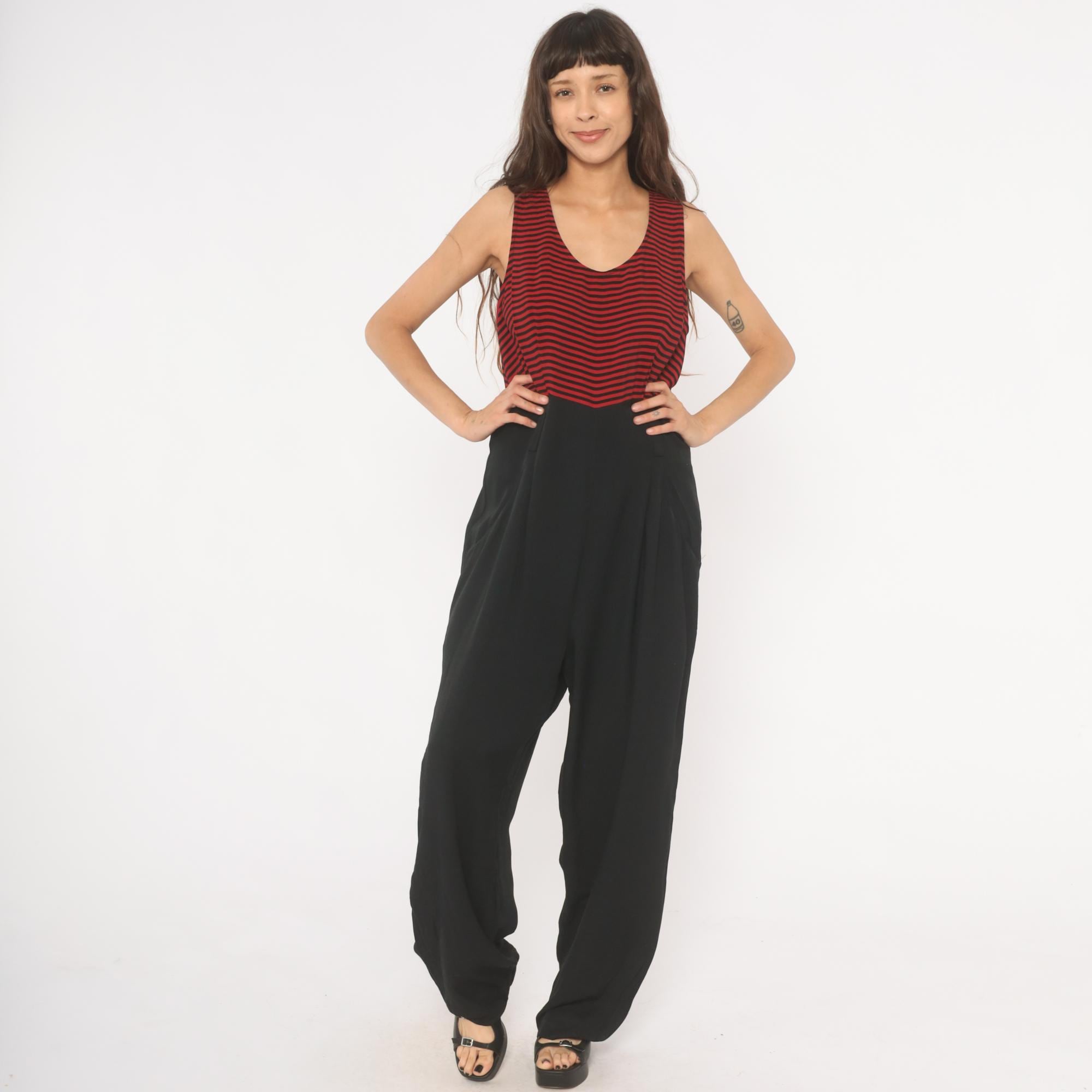 90s sleeveless jumpsuit with a red and black horizontal striped bodice and solid black wide leg bottom half. Scoop neckline, tank-style shoulders, and a back zipper closure. Side seam pockets on both hips, with a relaxed, straight leg silhouette that falls to full length.