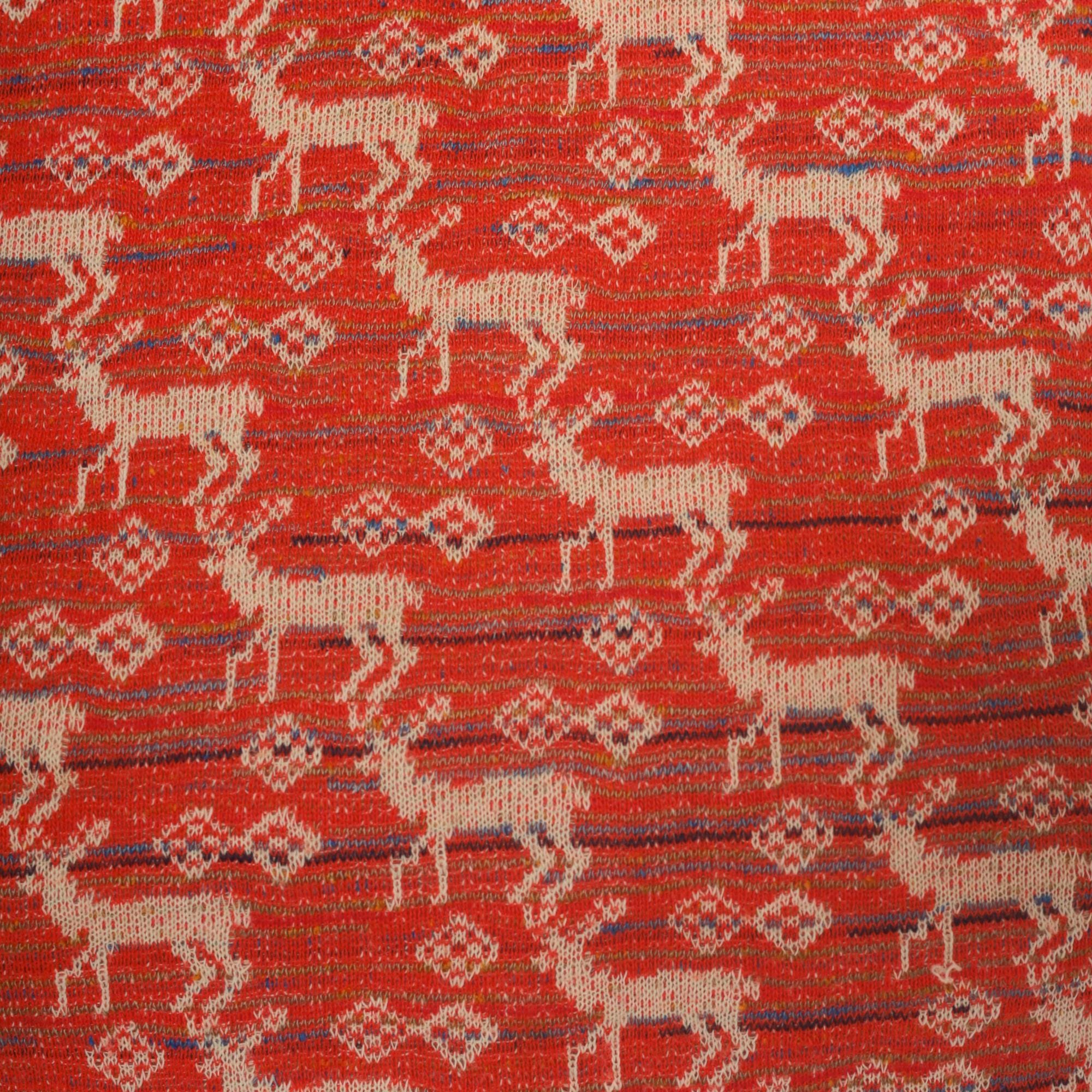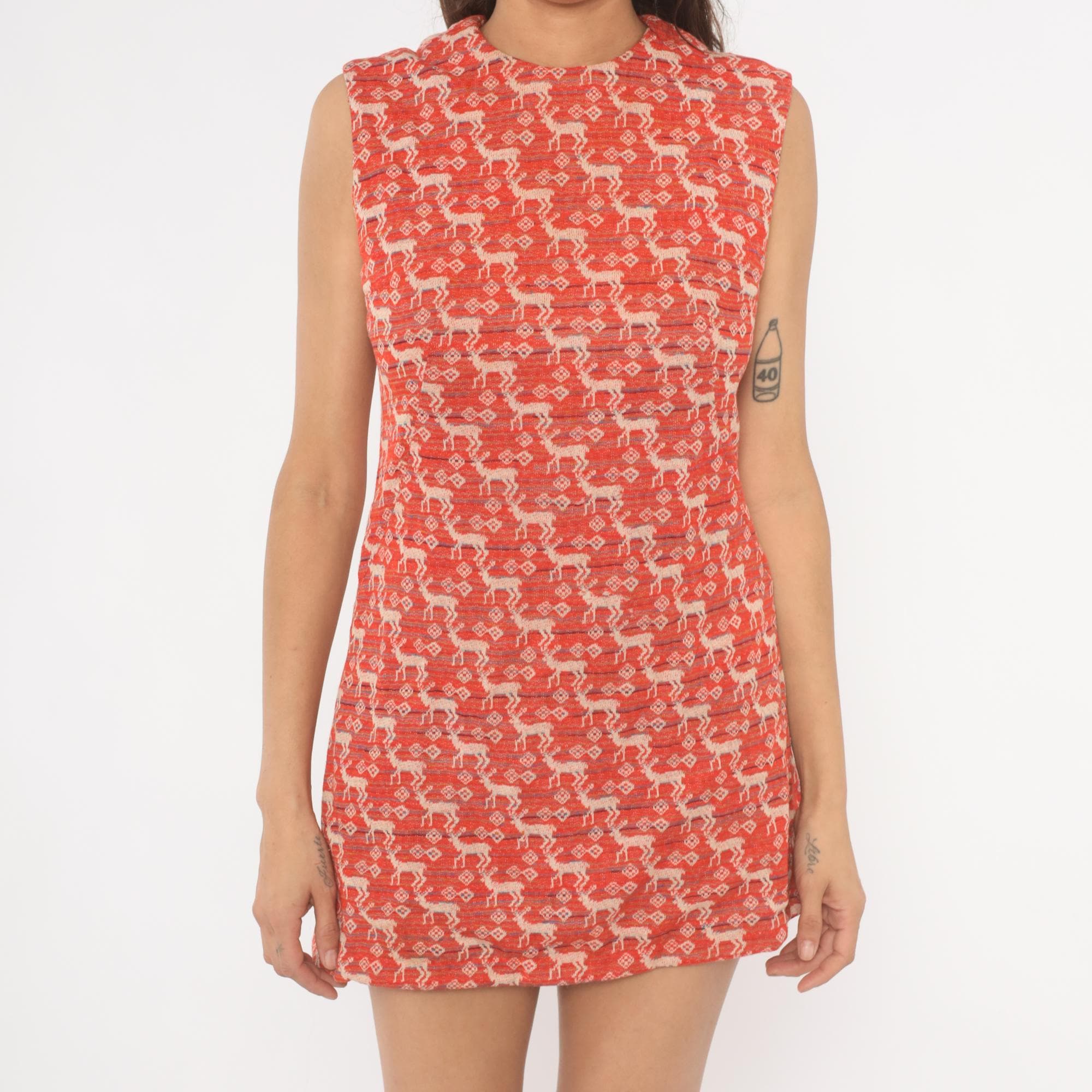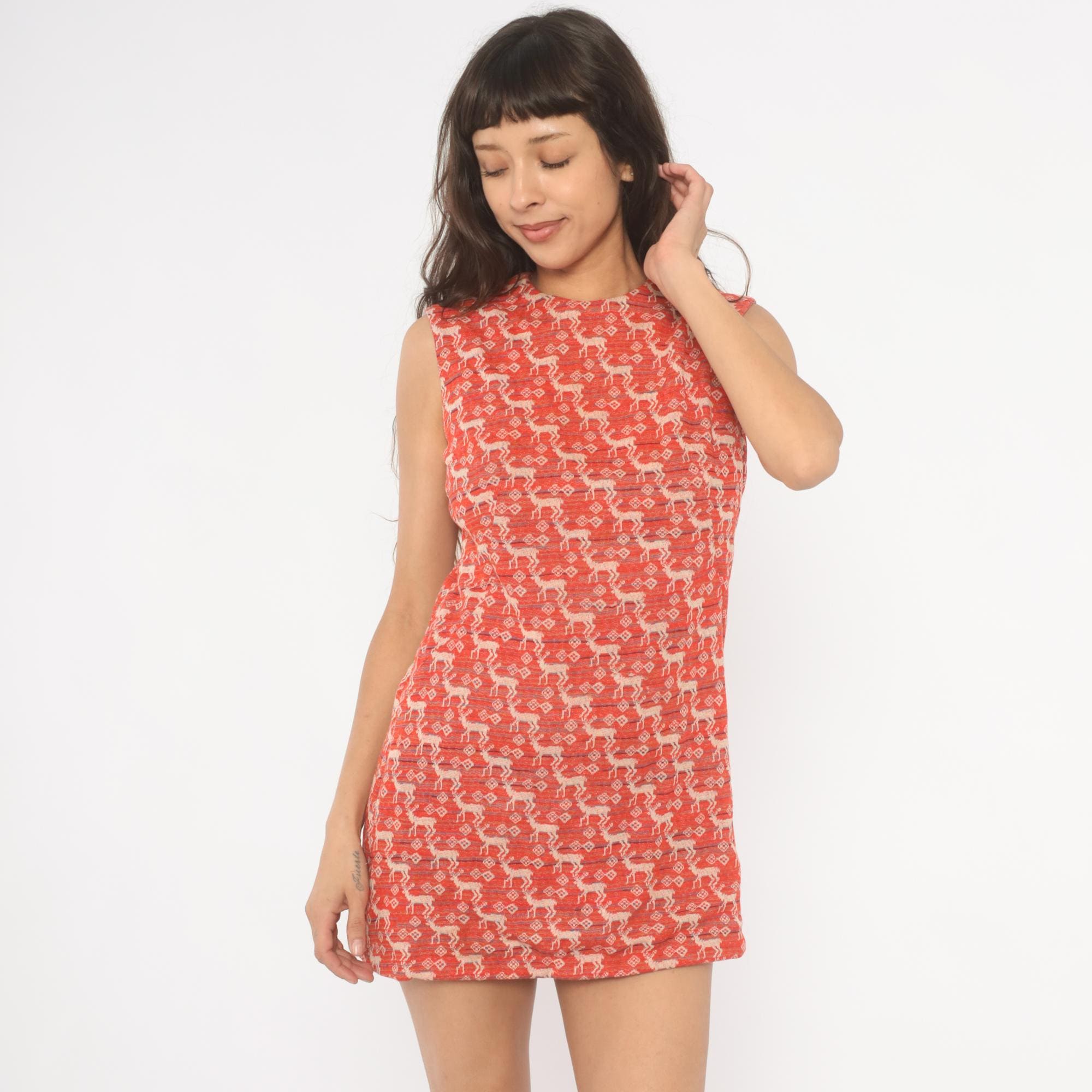 70s red and cream sleeveless mini dress with an allover jacquard knit deer and diamond motif in repeating rows. A-line shift silhouette with a round neckline and back zipper closure. Thin horizontal stripes in navy and blue run between the animal pattern rows across the entire garment.