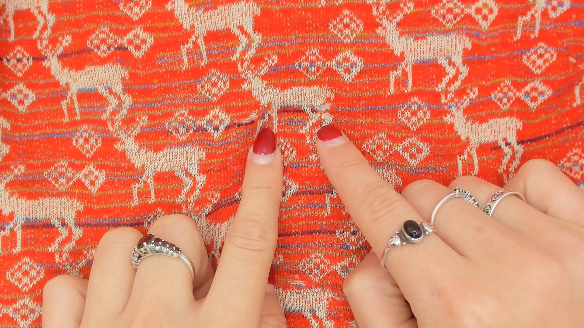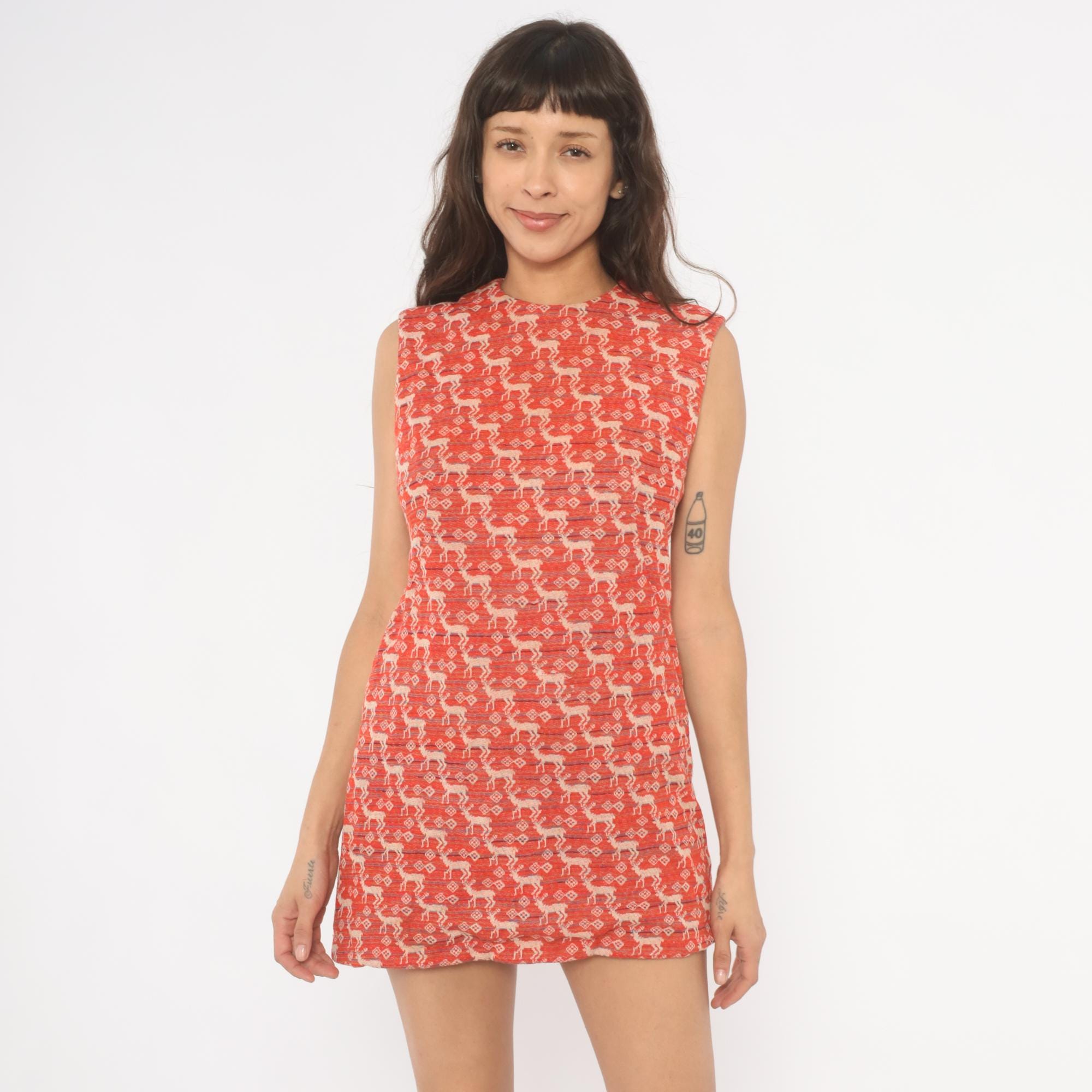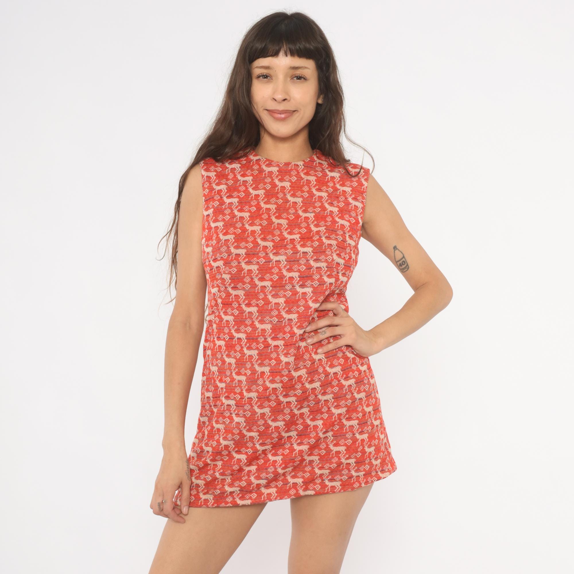 70s red and cream sleeveless mini dress with an allover jacquard knit deer and diamond motif in repeating rows. A-line shift silhouette with a round neckline and back zipper closure. Thin horizontal stripes in navy and blue run between the animal pattern rows across the entire garment.