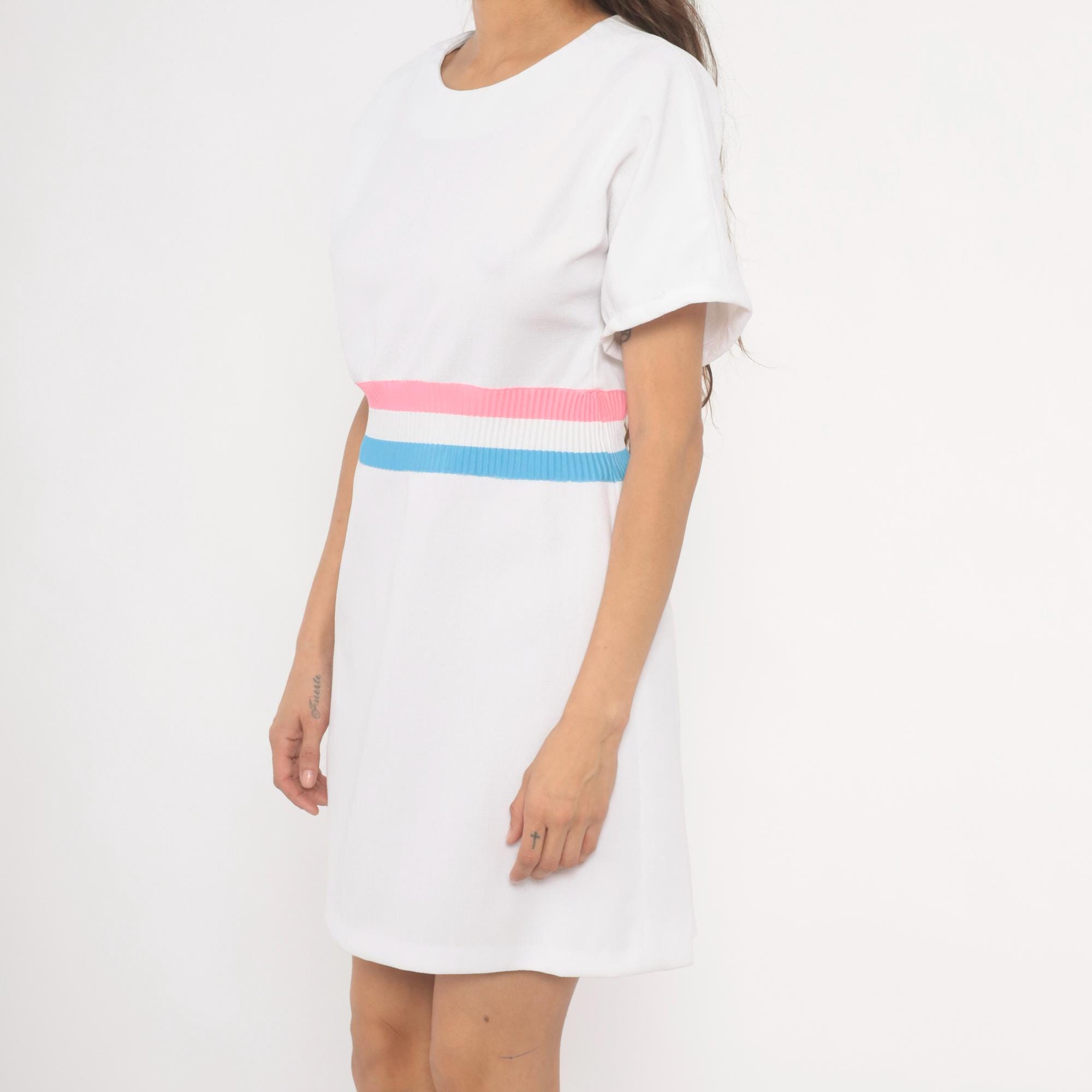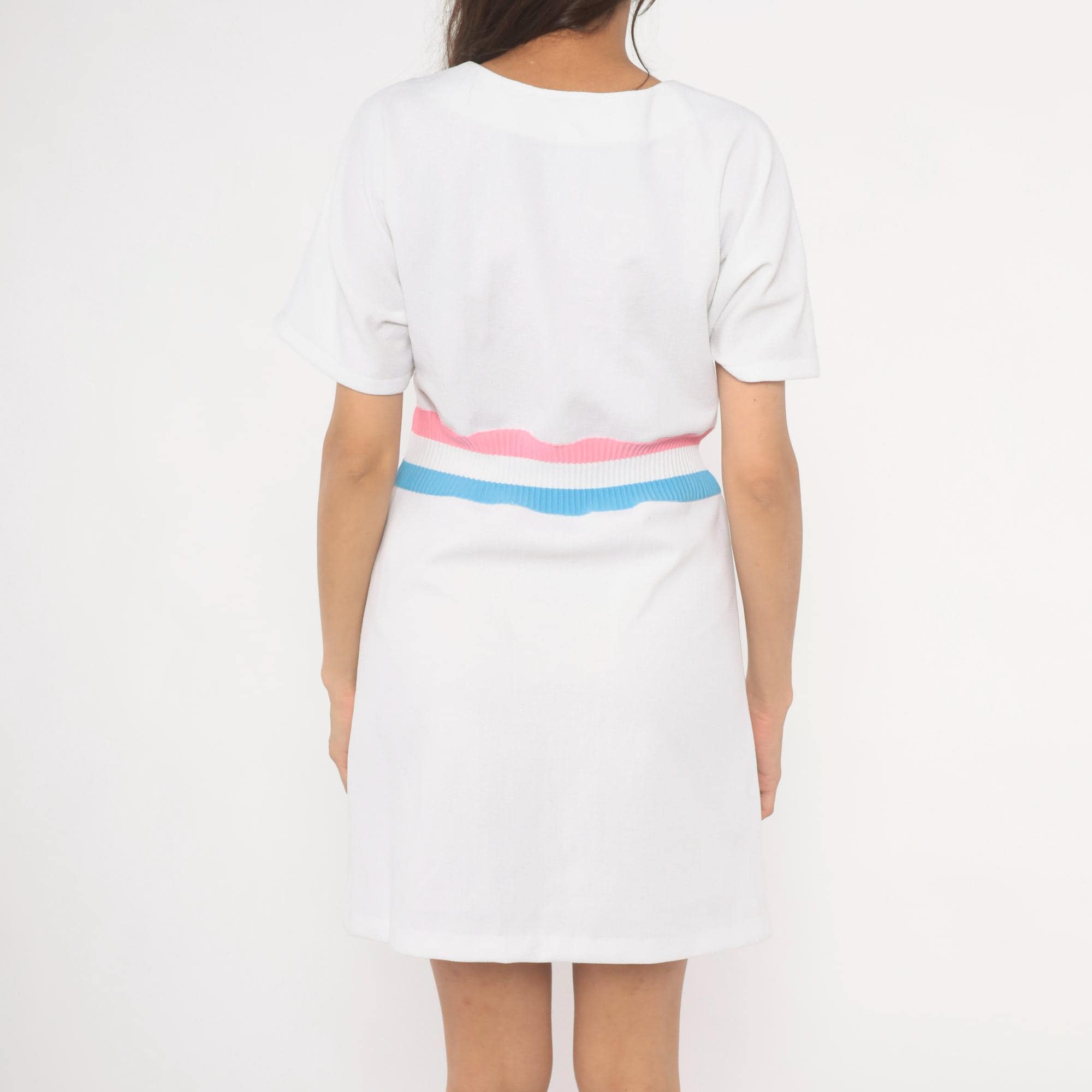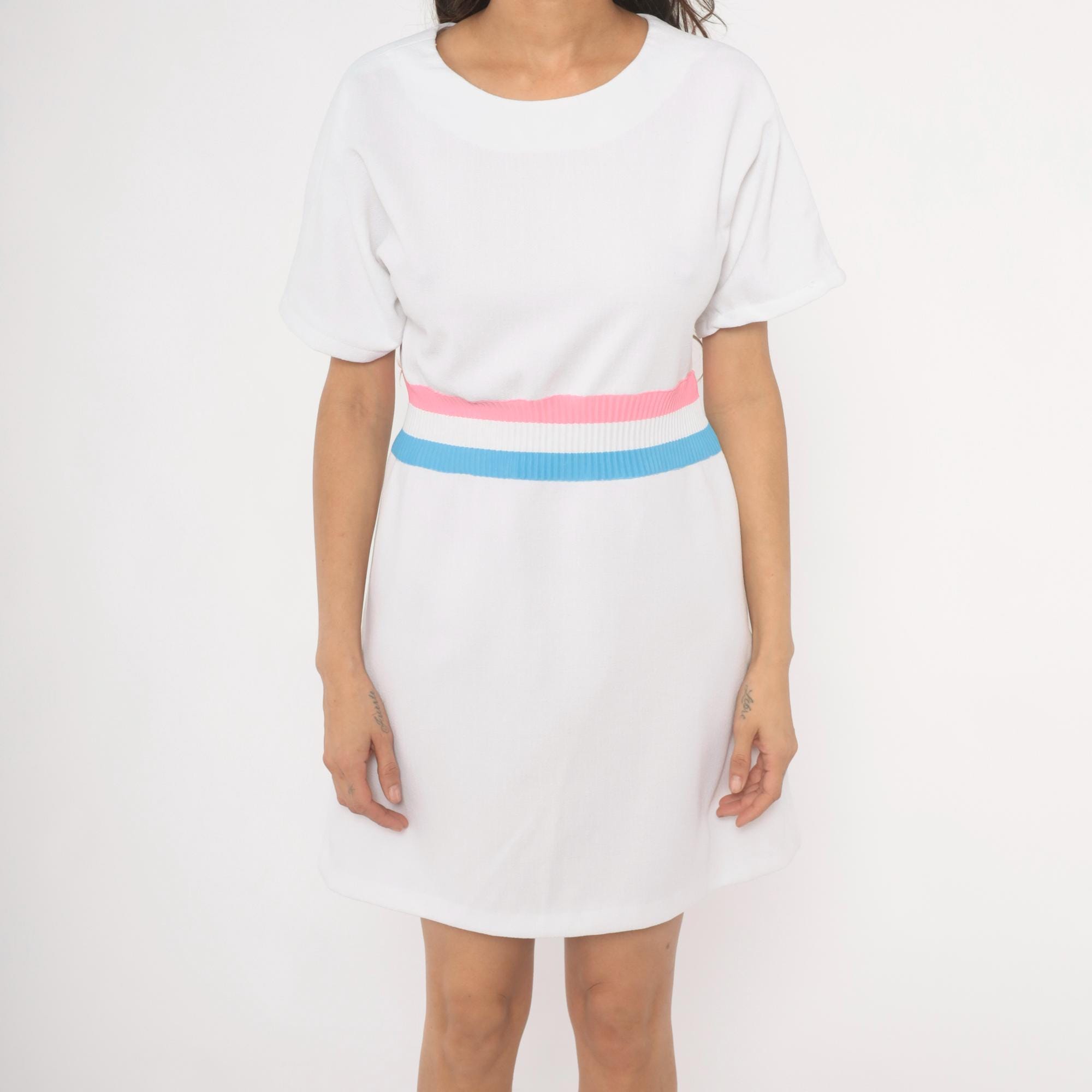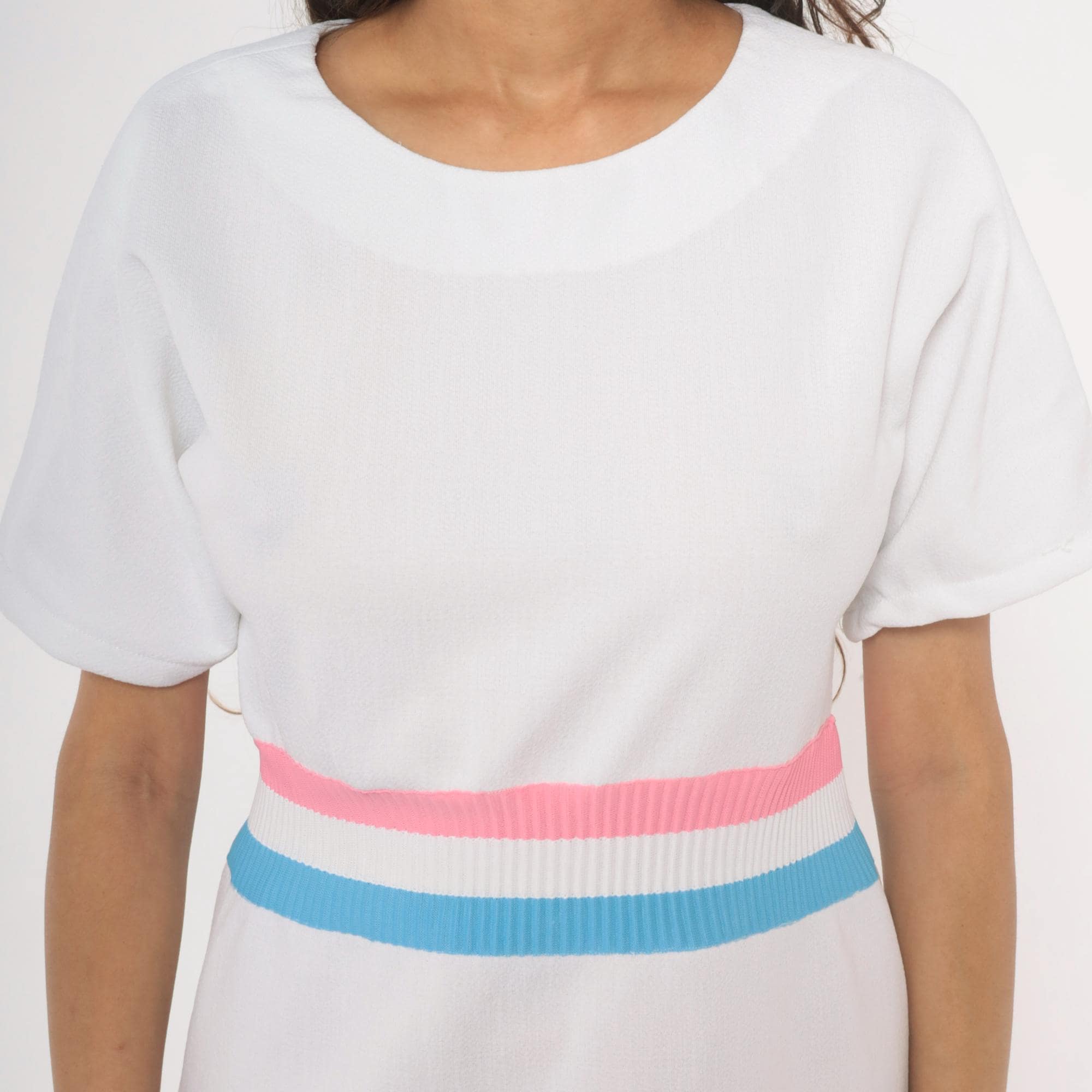 White 70s pullover dress with a scoop neckline and short sleeves. A ribbed knit waistband in pink, white, and sky blue stripes cinches at the natural waist. A-line skirt below the striped band, hitting at knee length.