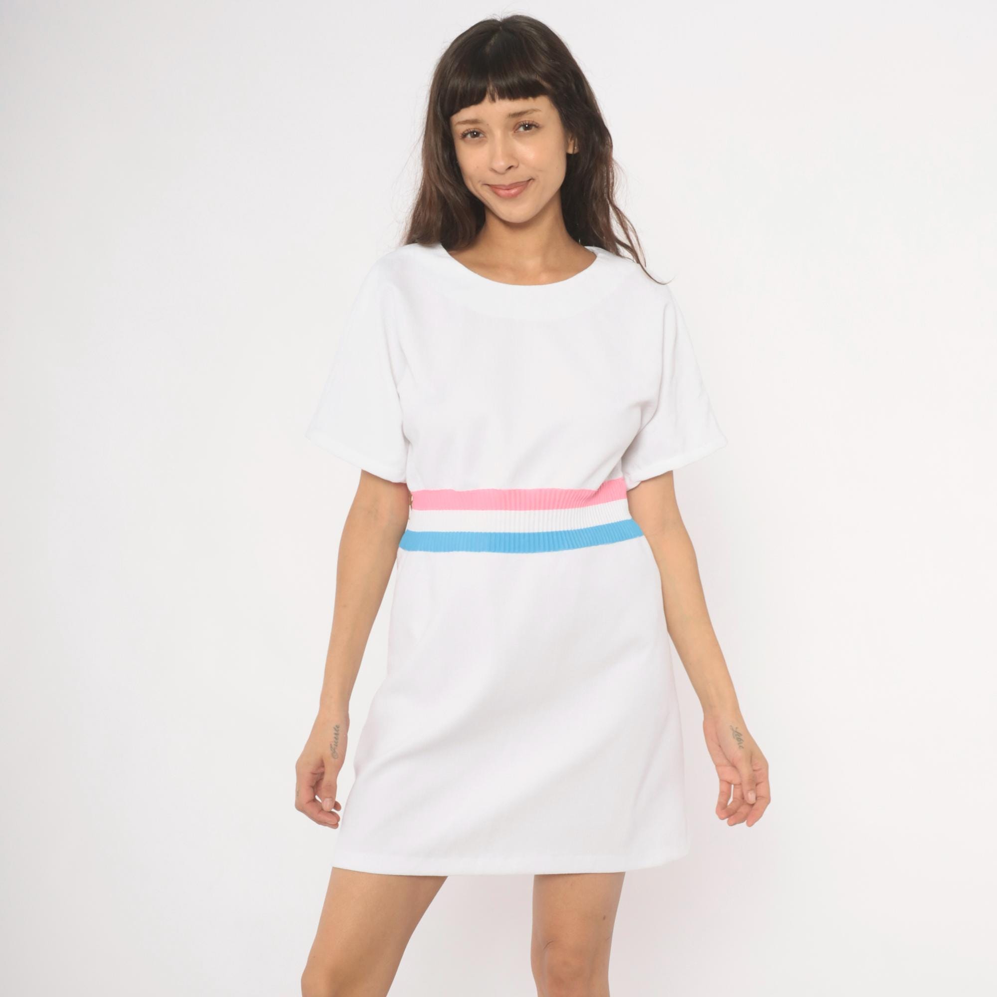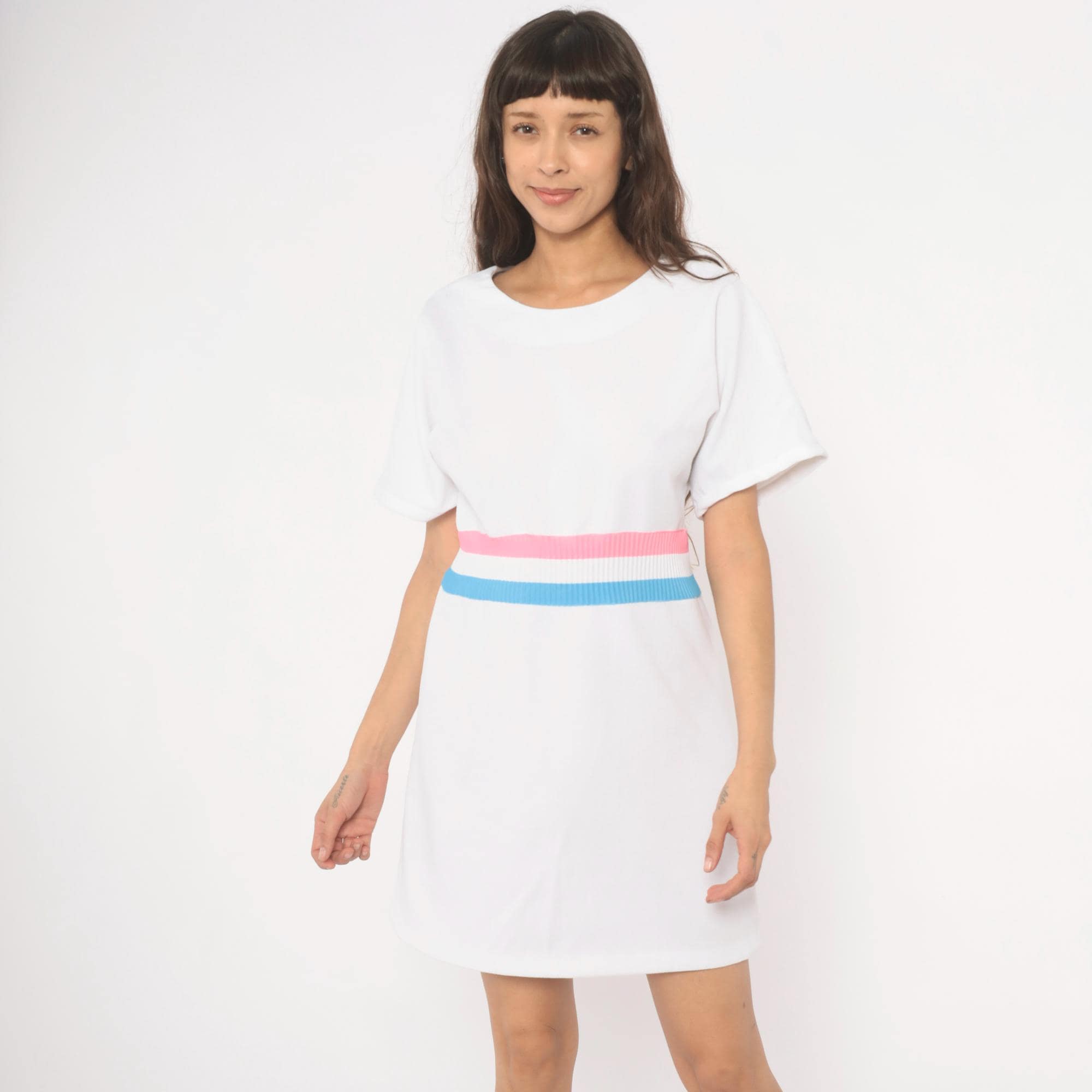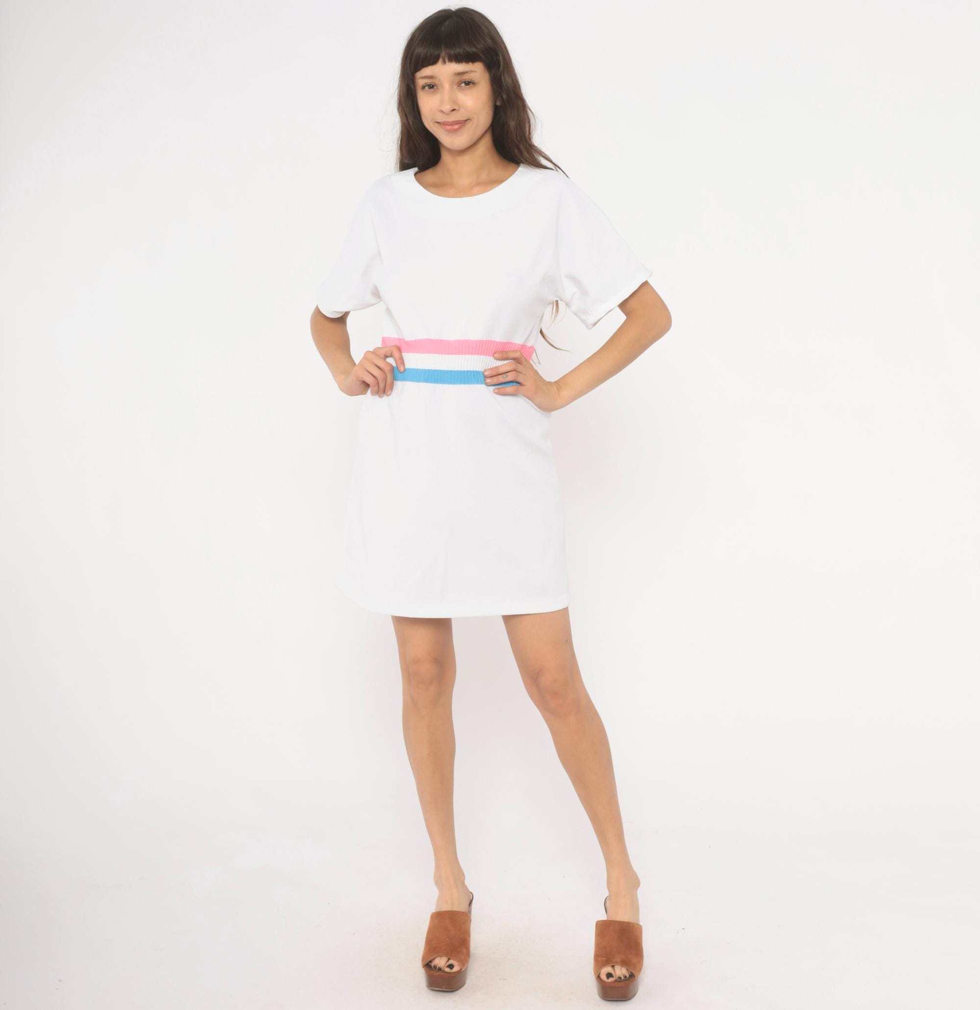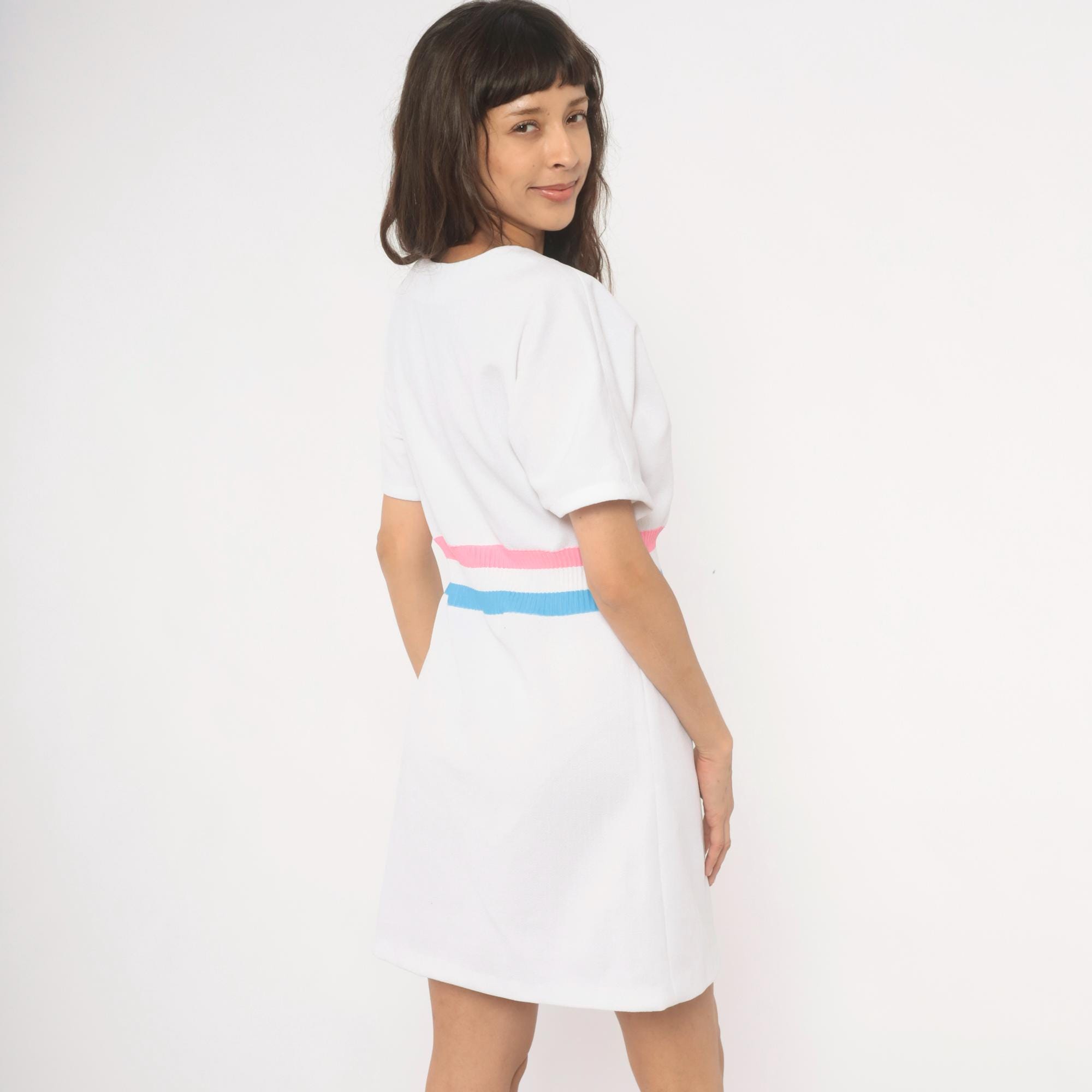 White 70s pullover dress with a scoop neckline and short sleeves. A ribbed knit waistband in pink, white, and sky blue stripes cinches at the natural waist. A-line skirt below the striped band, hitting at knee length.