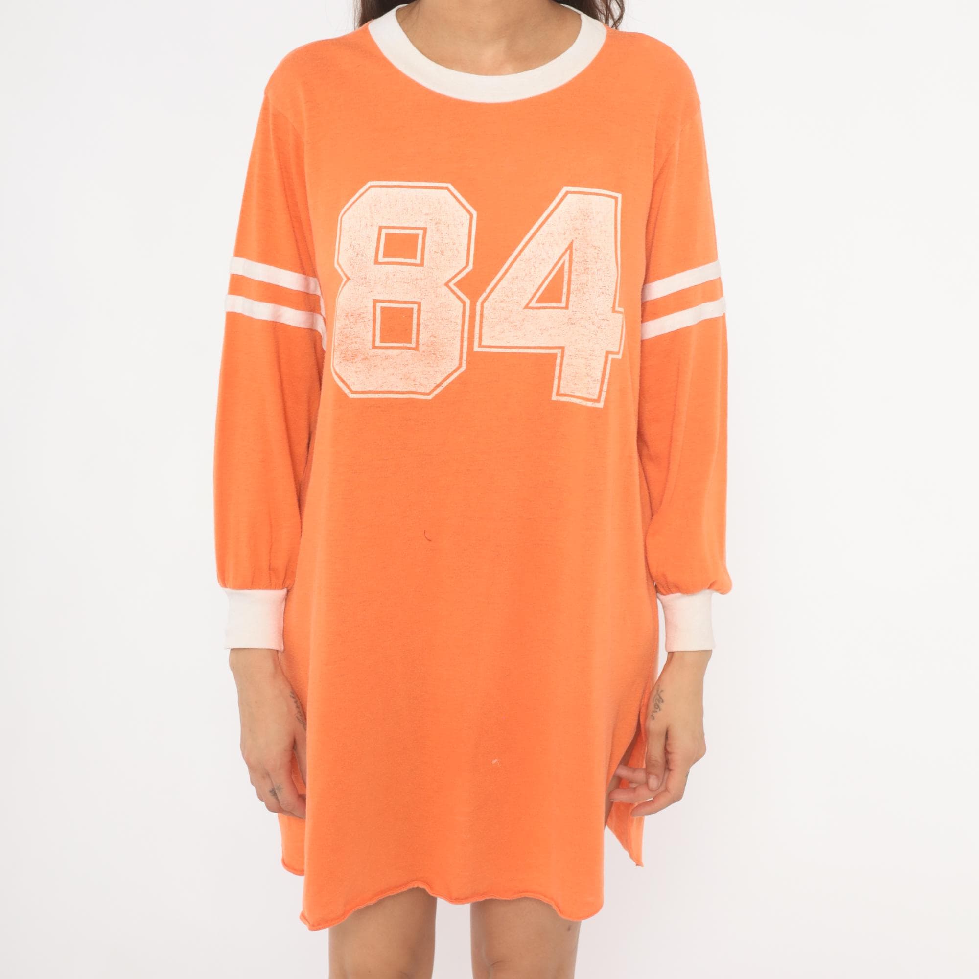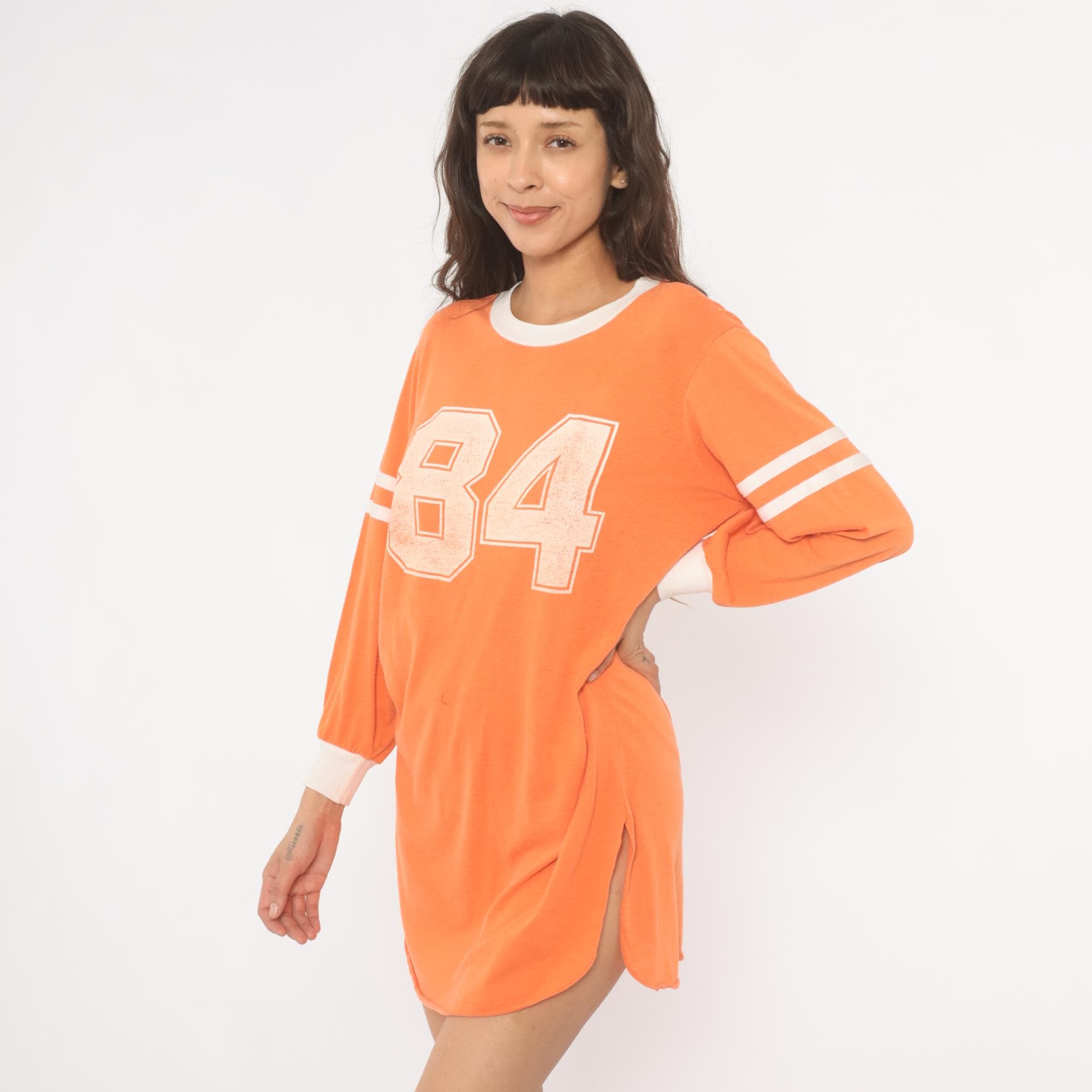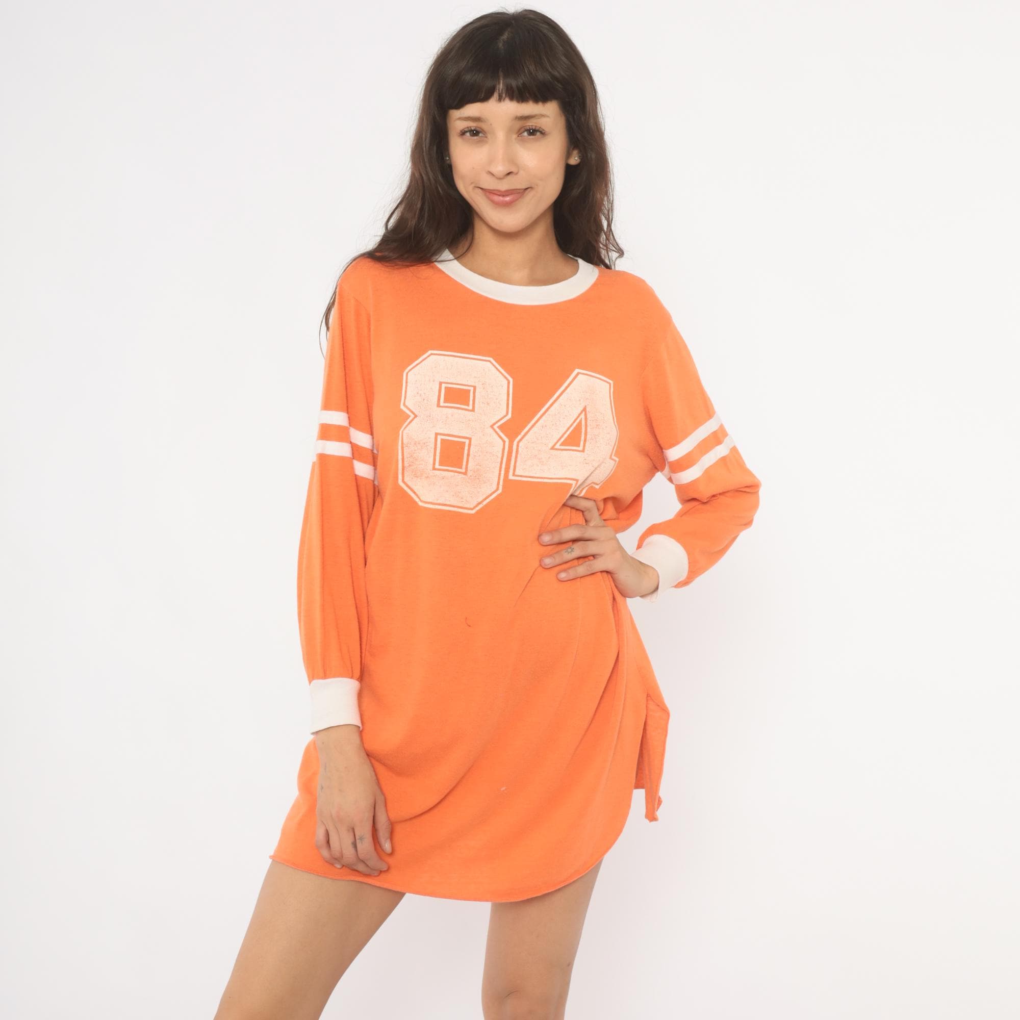 70s orange athletic jersey shirt from JCPenney with a large "84" number print across the chest in a distressed block font. White ringer neckline, white banded cuffs, and double white varsity stripes on each upper sleeve. Long sleeves with a relaxed, dropped-shoulder fit and a curved hemline with side slits. Pullover construction with no closures.