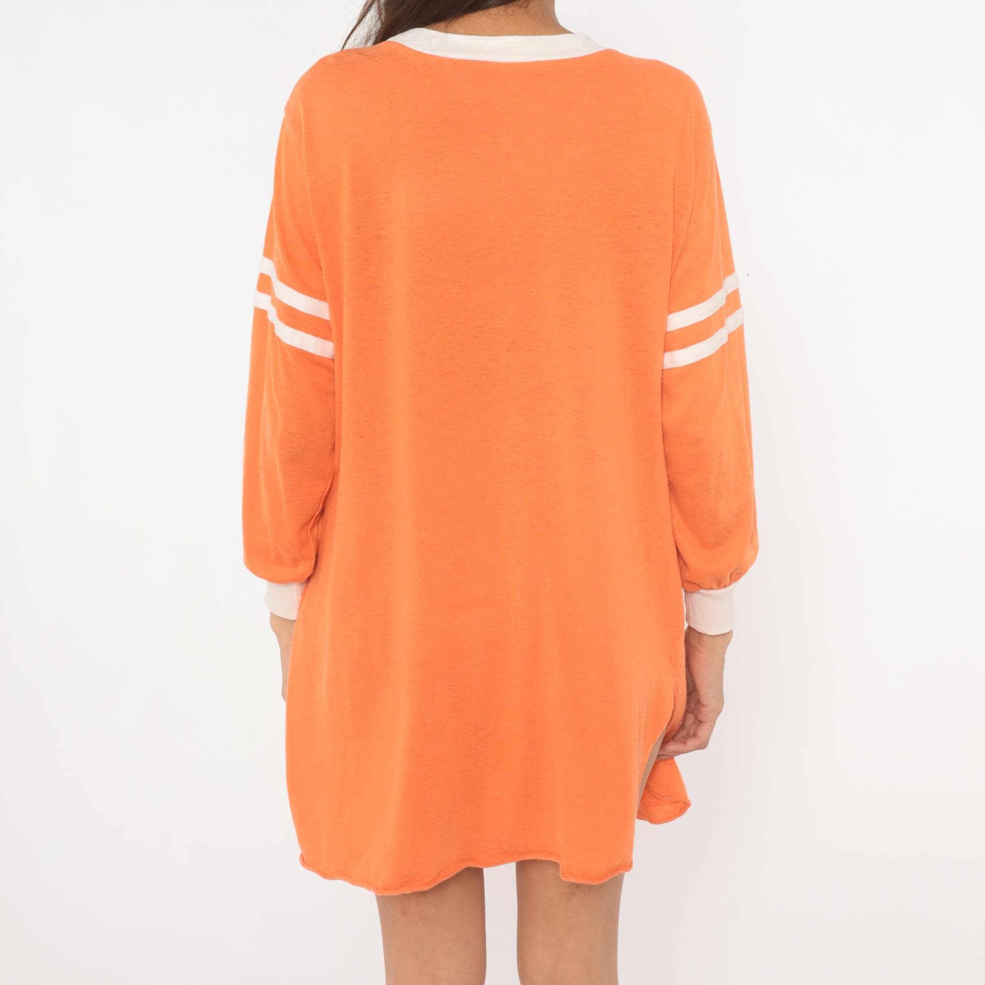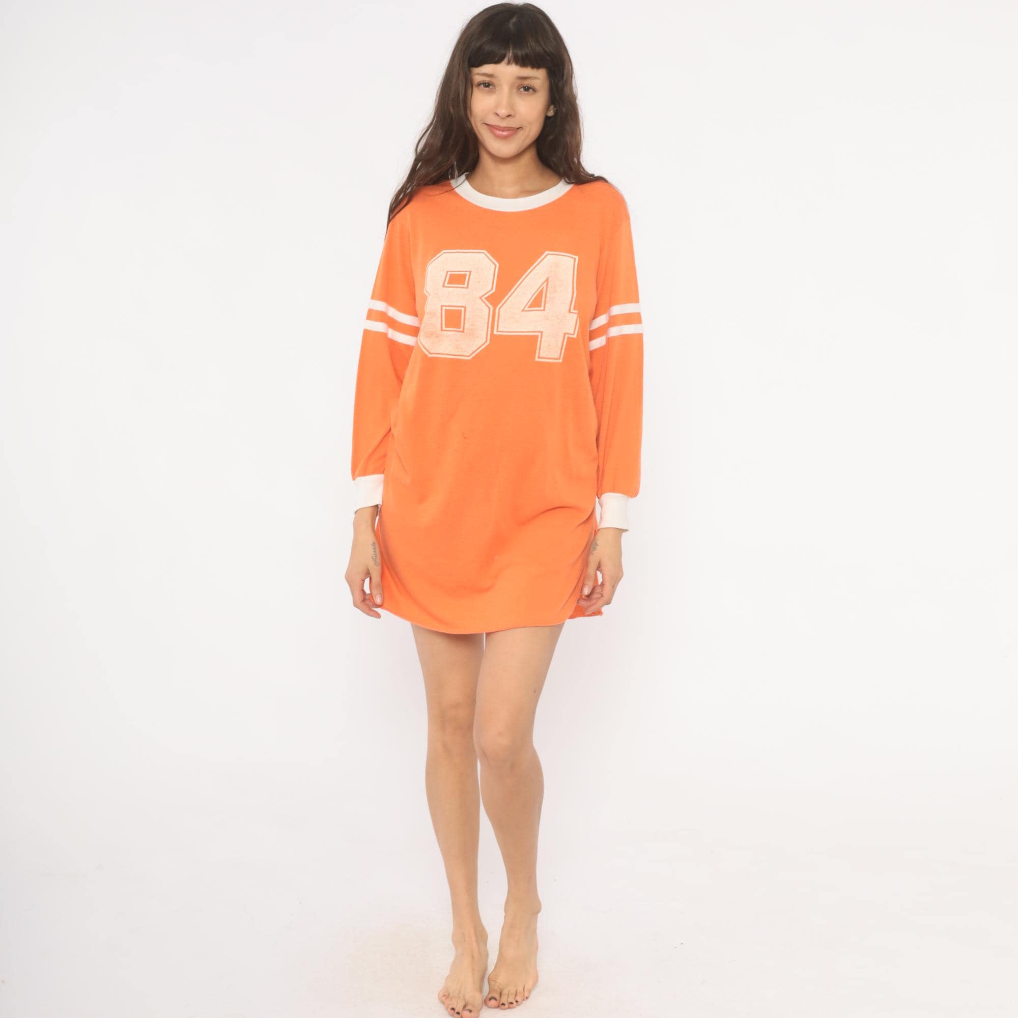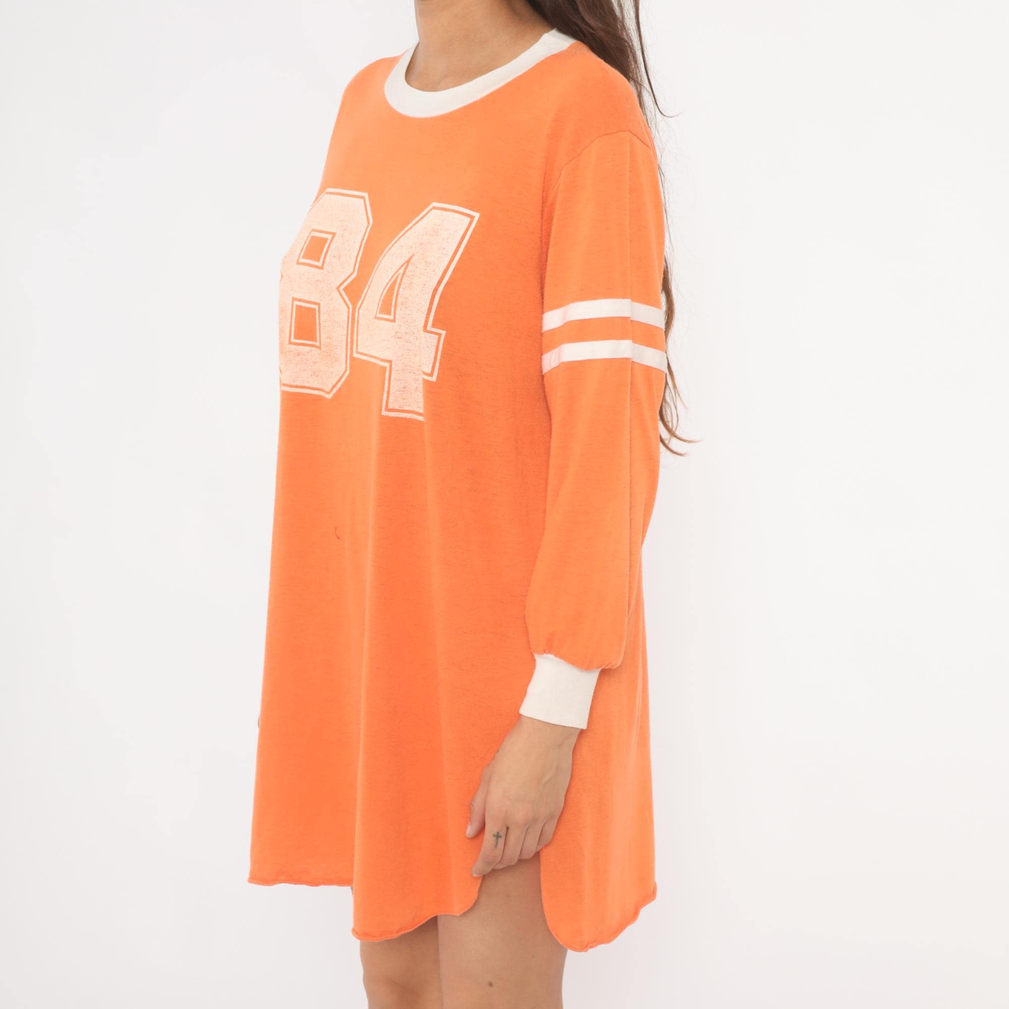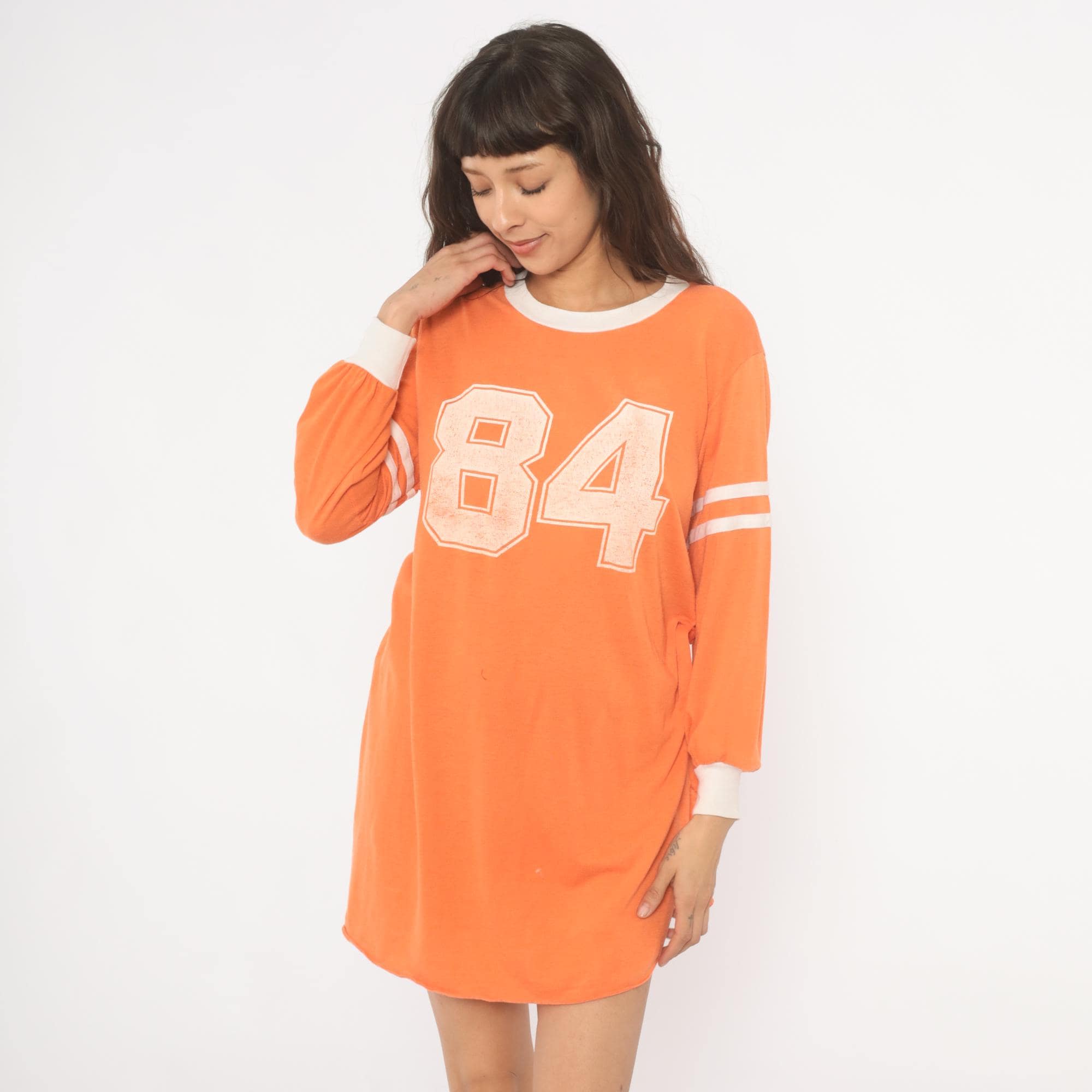 70s orange athletic jersey shirt from JCPenney with a large "84" number print across the chest in a distressed block font. White ringer neckline, white banded cuffs, and double white varsity stripes on each upper sleeve. Long sleeves with a relaxed, dropped-shoulder fit and a curved hemline with side slits. Pullover construction with no closures.