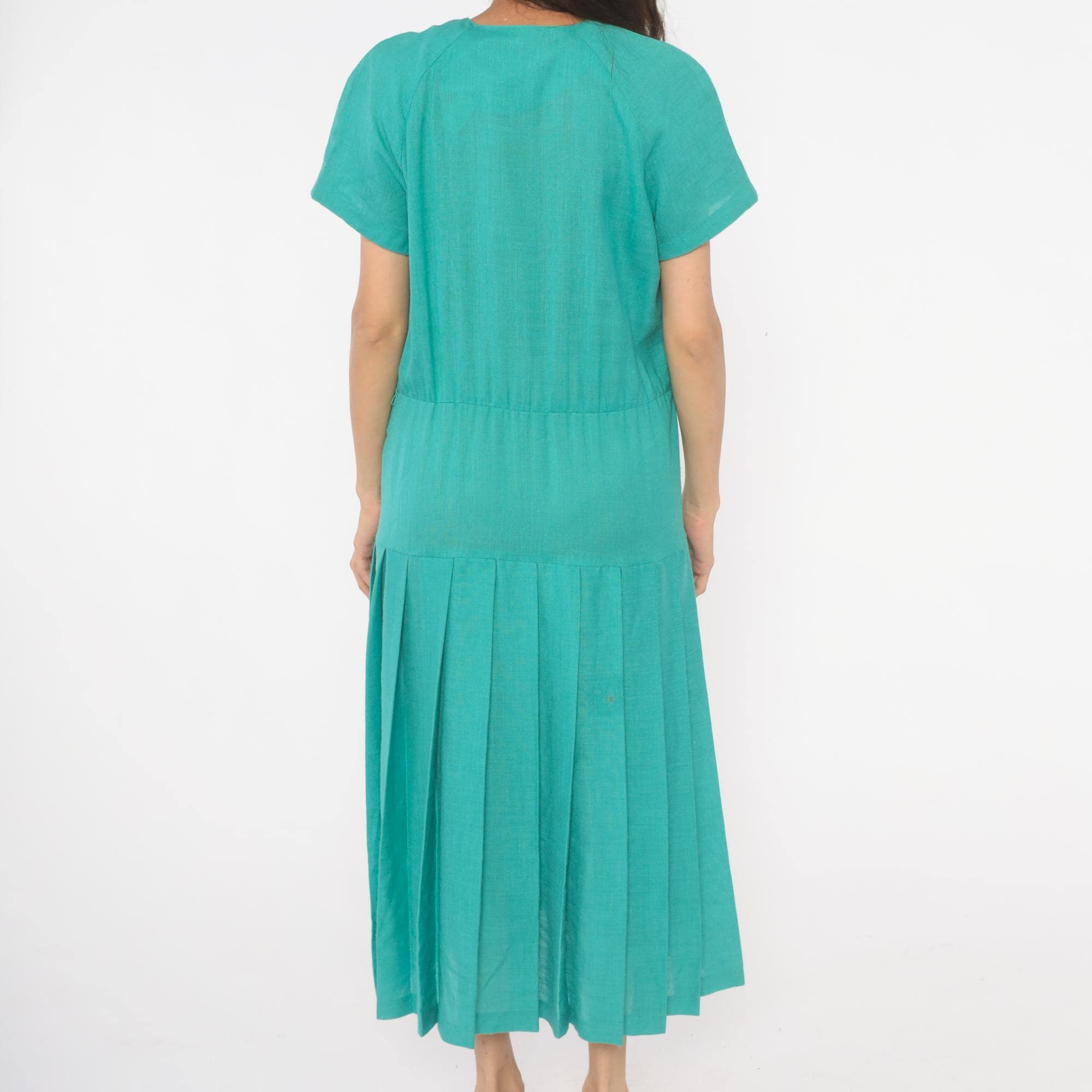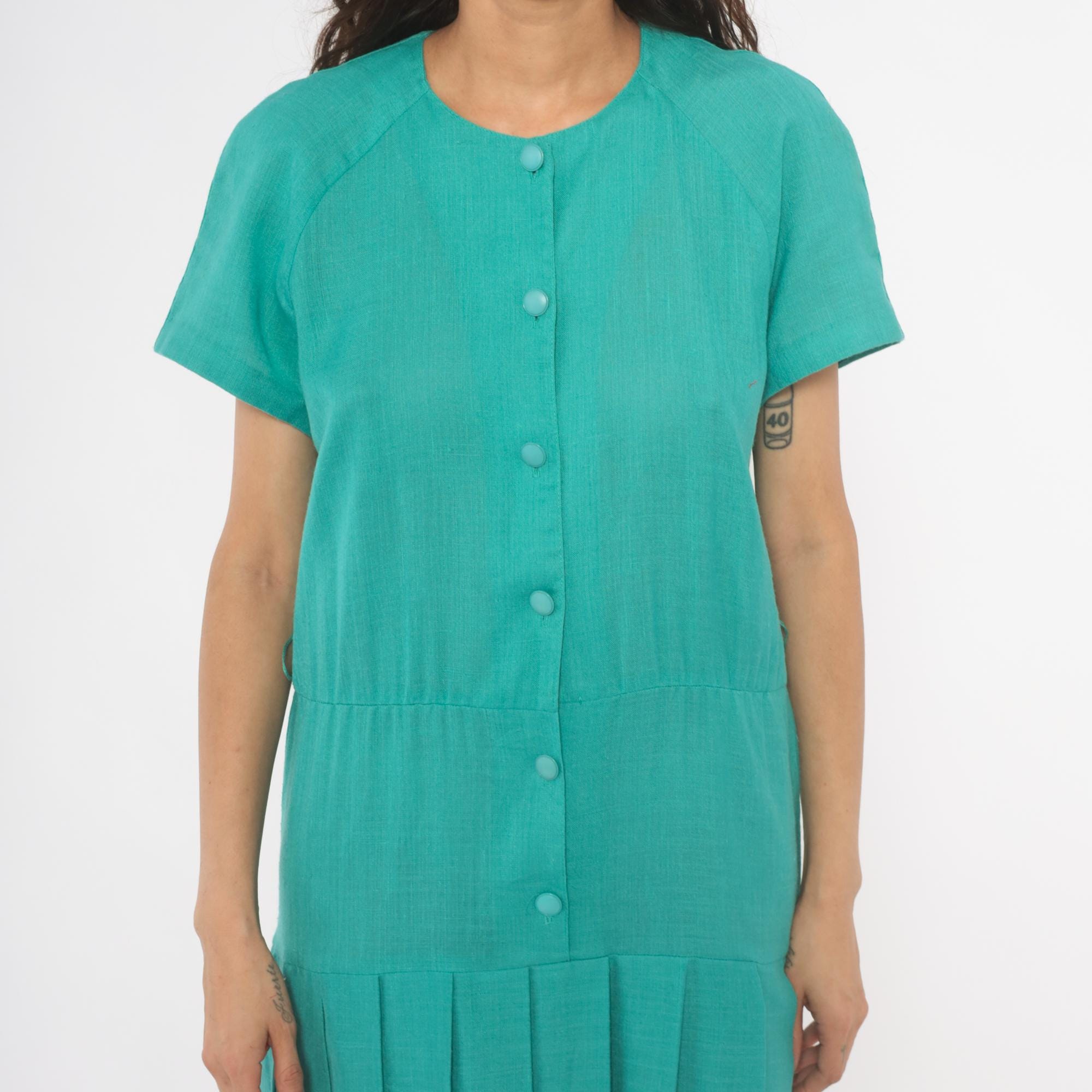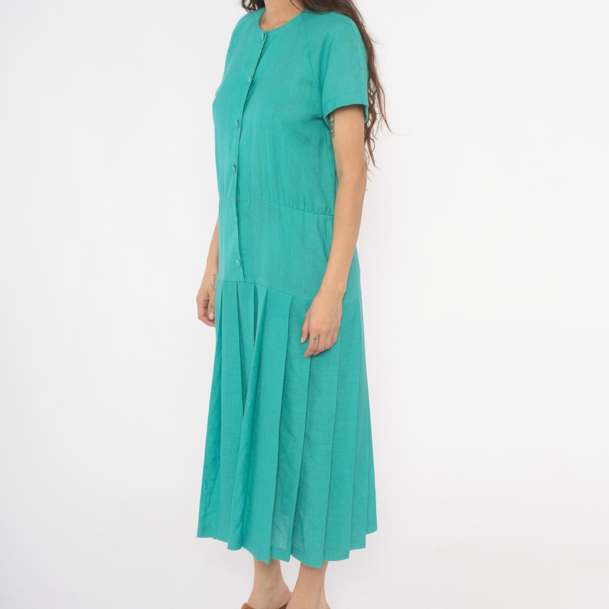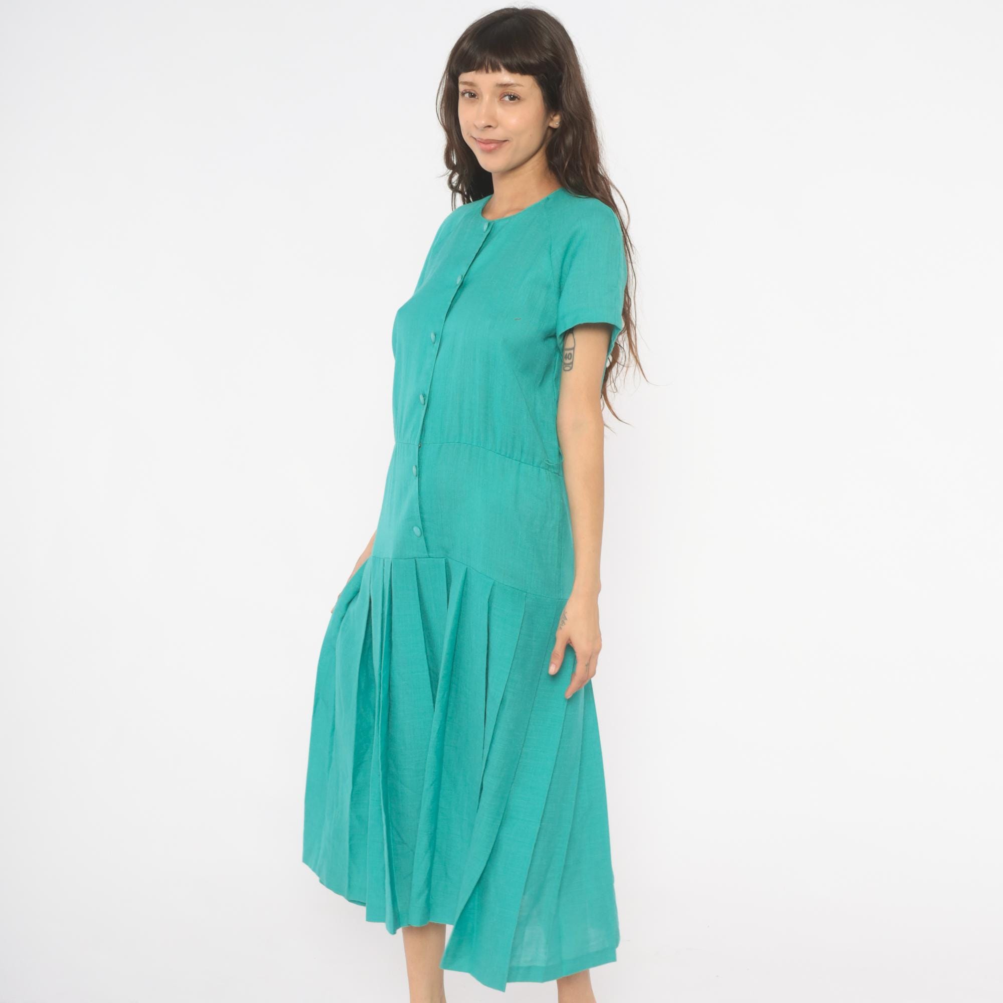 80s teal midi dress from Sabino with a full button front closure and round crew neckline. Raglan short sleeves, drop waist seam, and wide box pleated skirt. Tone-on-tone covered buttons run the full length, and the aqua-turquoise color is consistent throughout.