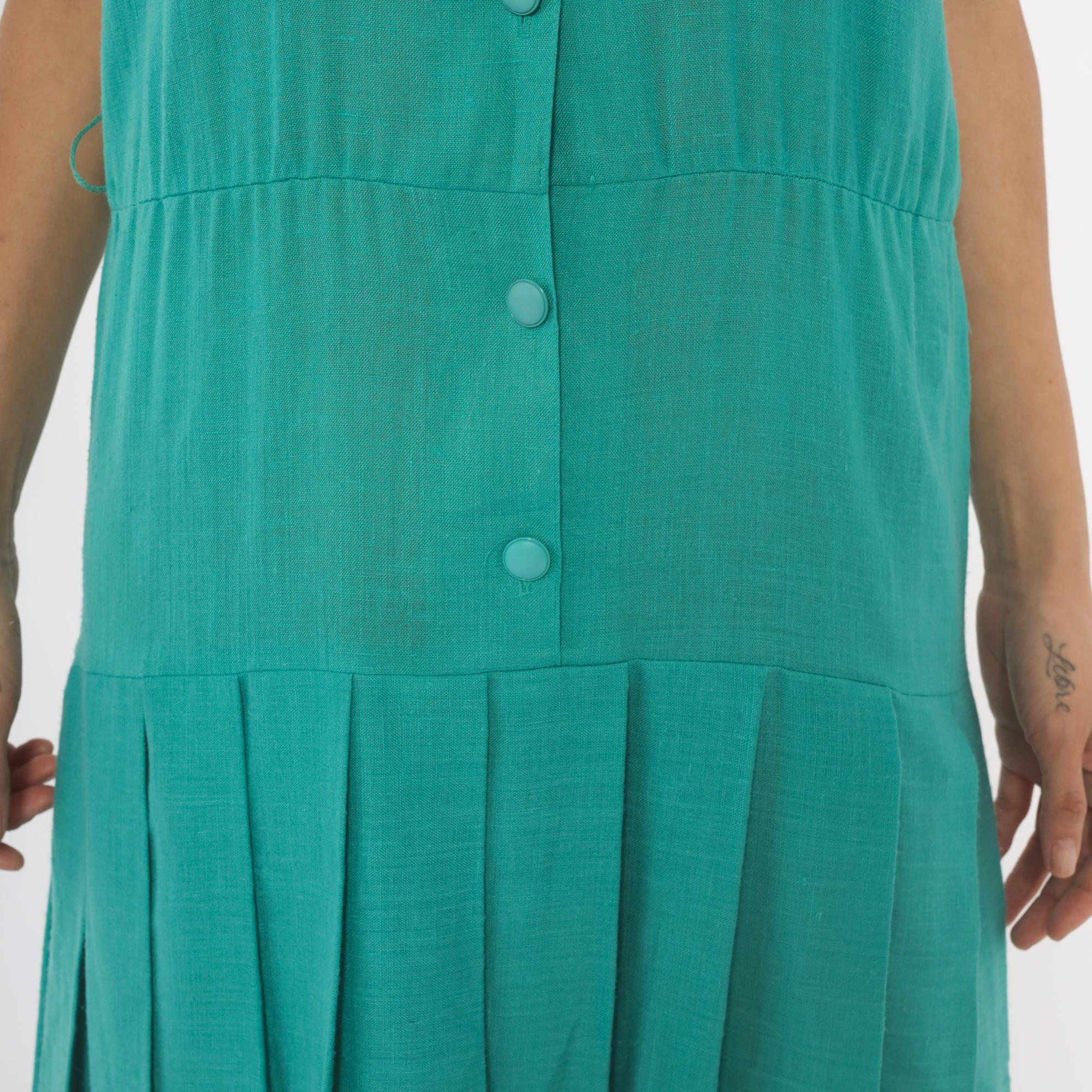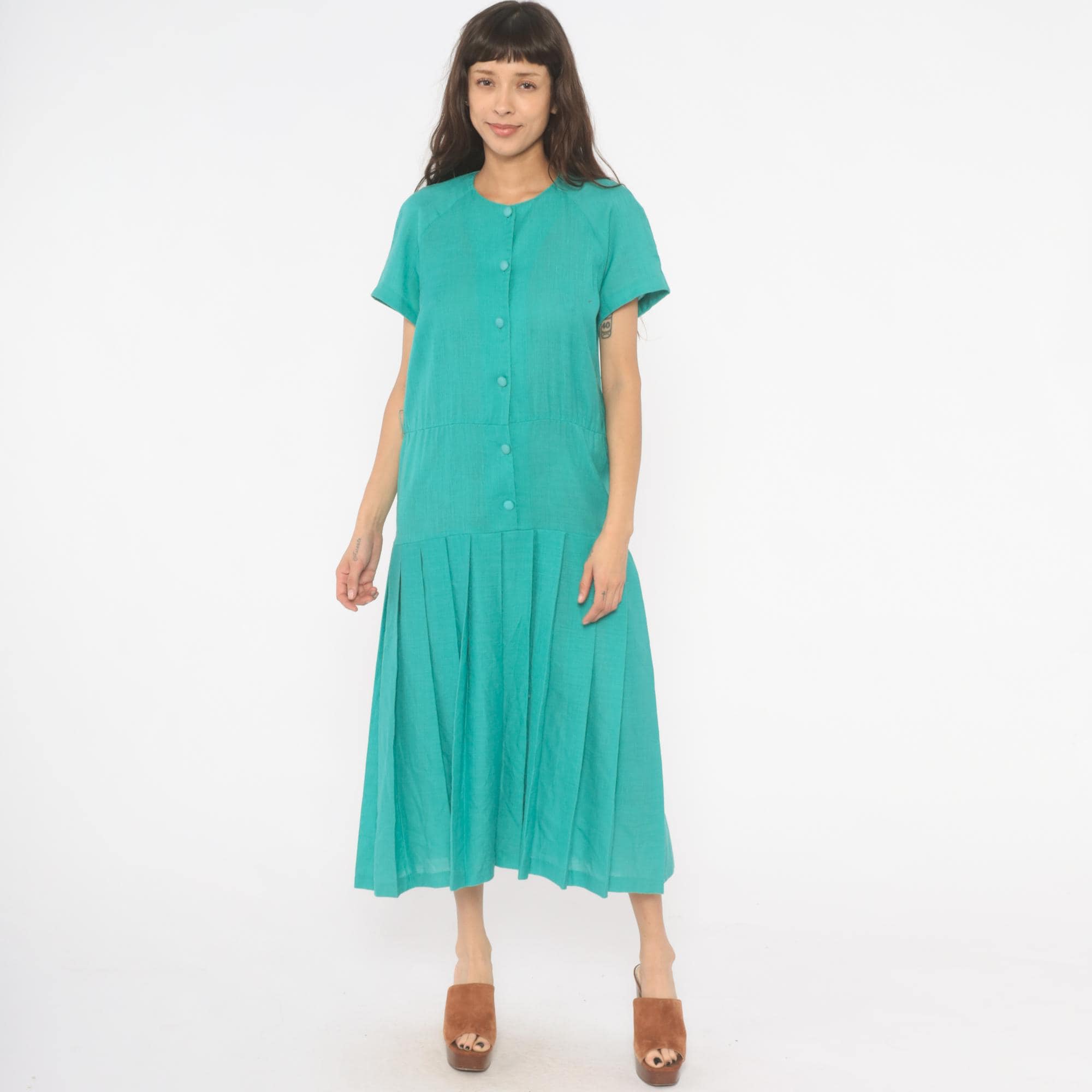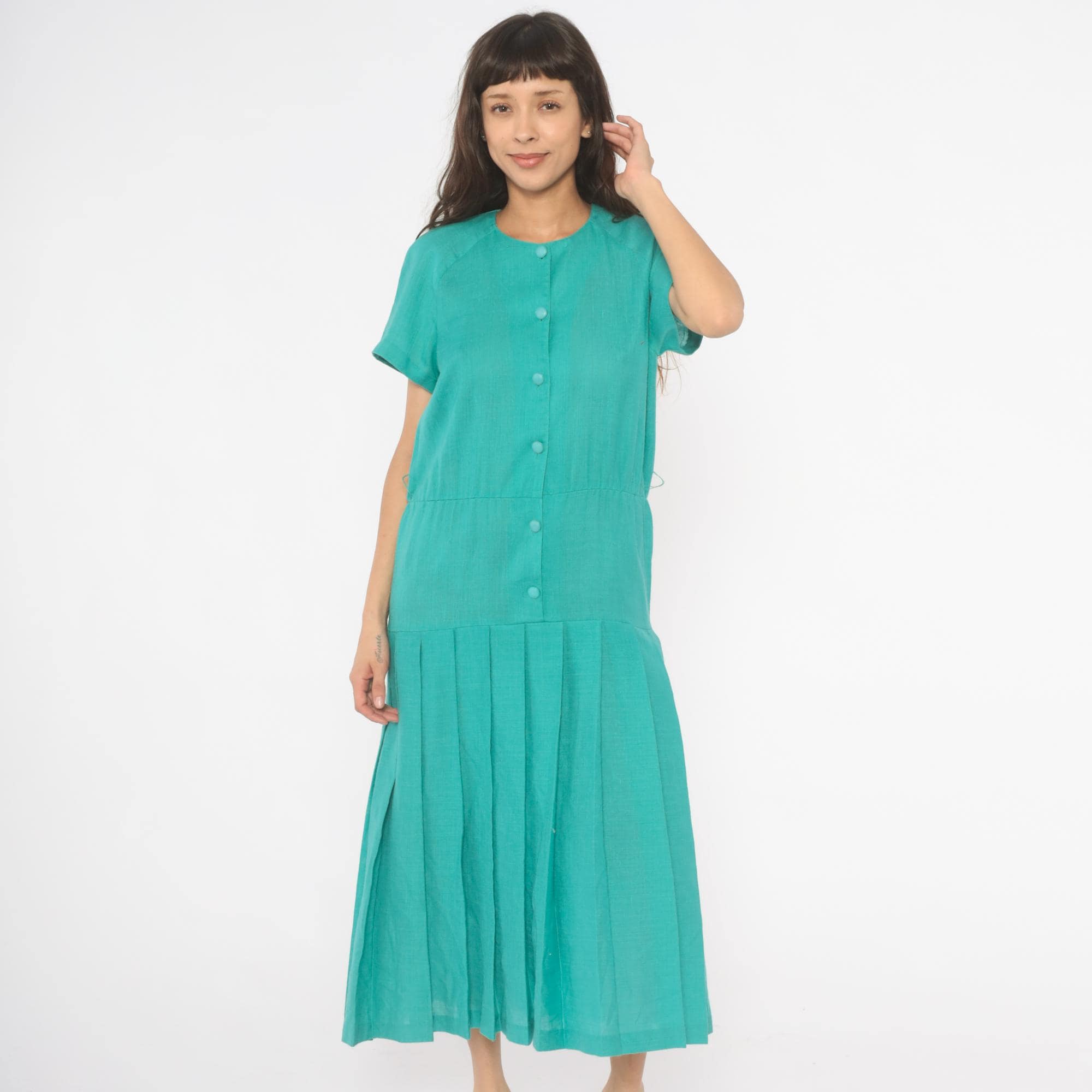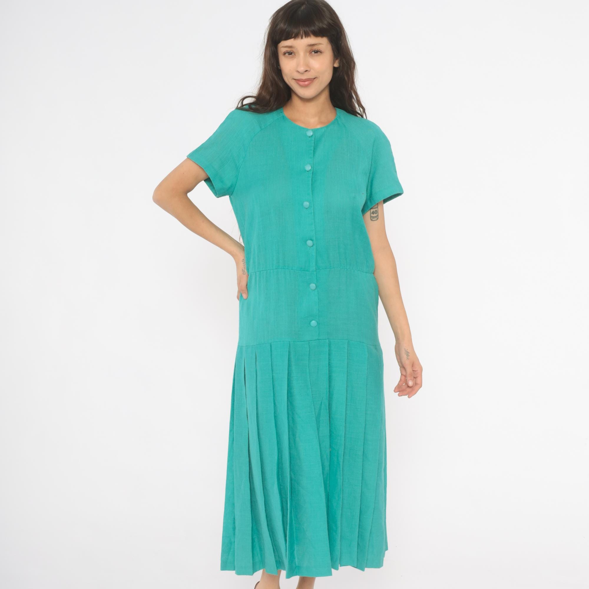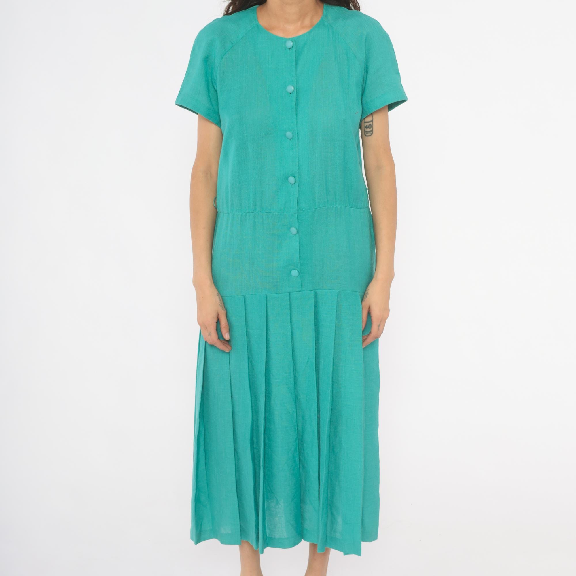 80s teal midi dress from Sabino with a full button front closure and round crew neckline. Raglan short sleeves, drop waist seam, and wide box pleated skirt. Tone-on-tone covered buttons run the full length, and the aqua-turquoise color is consistent throughout.