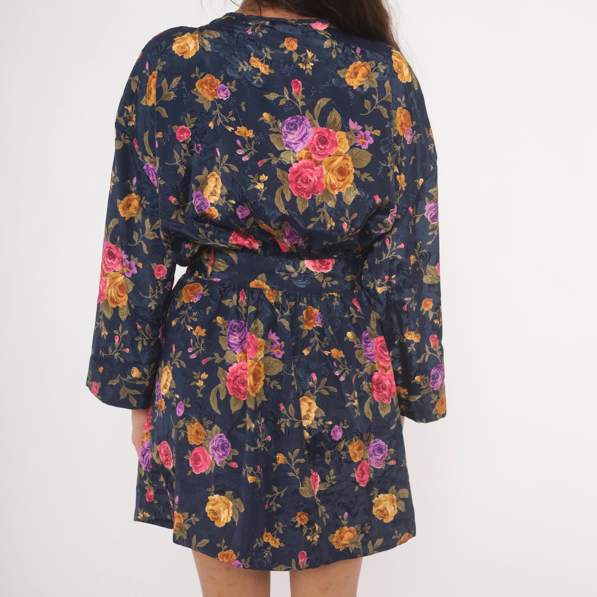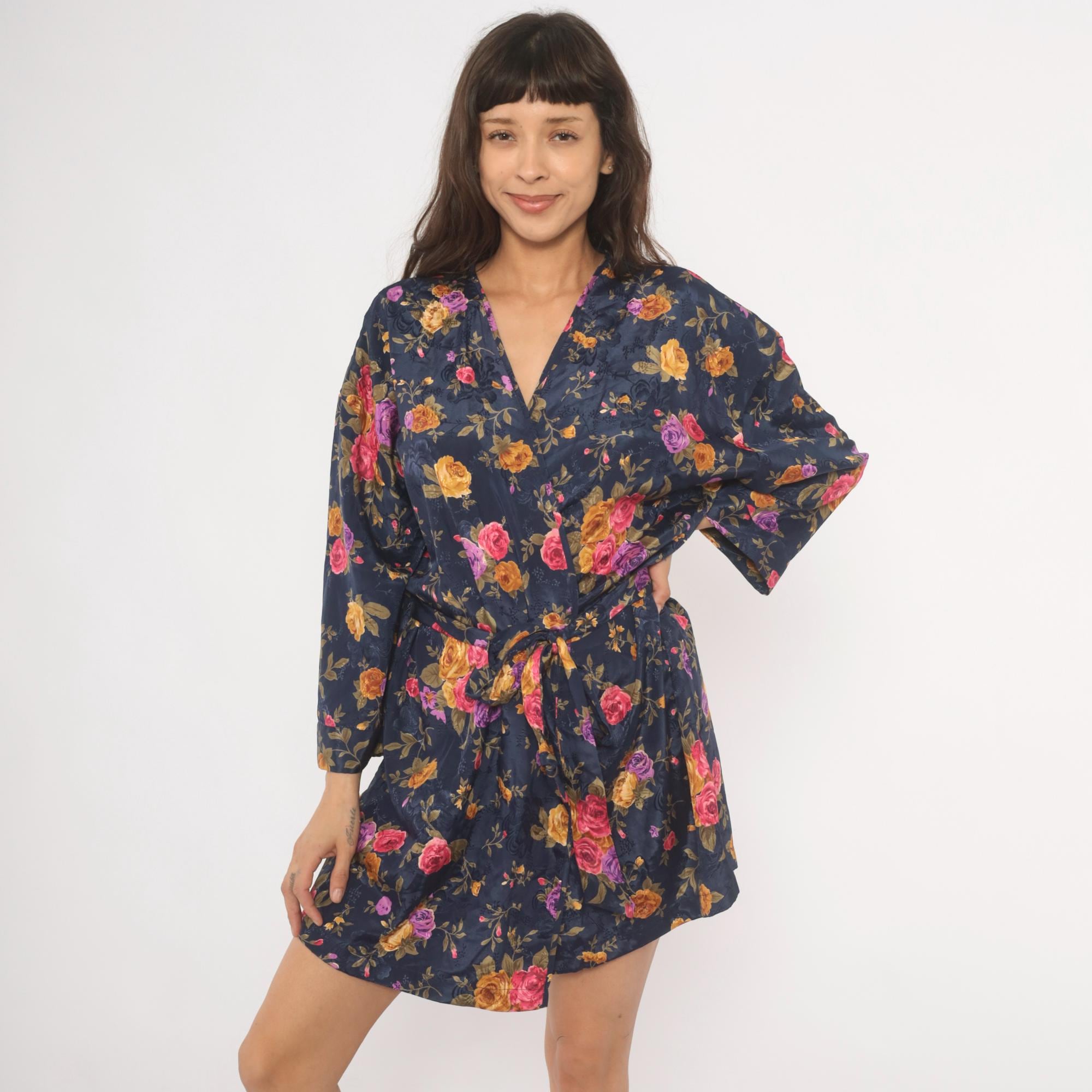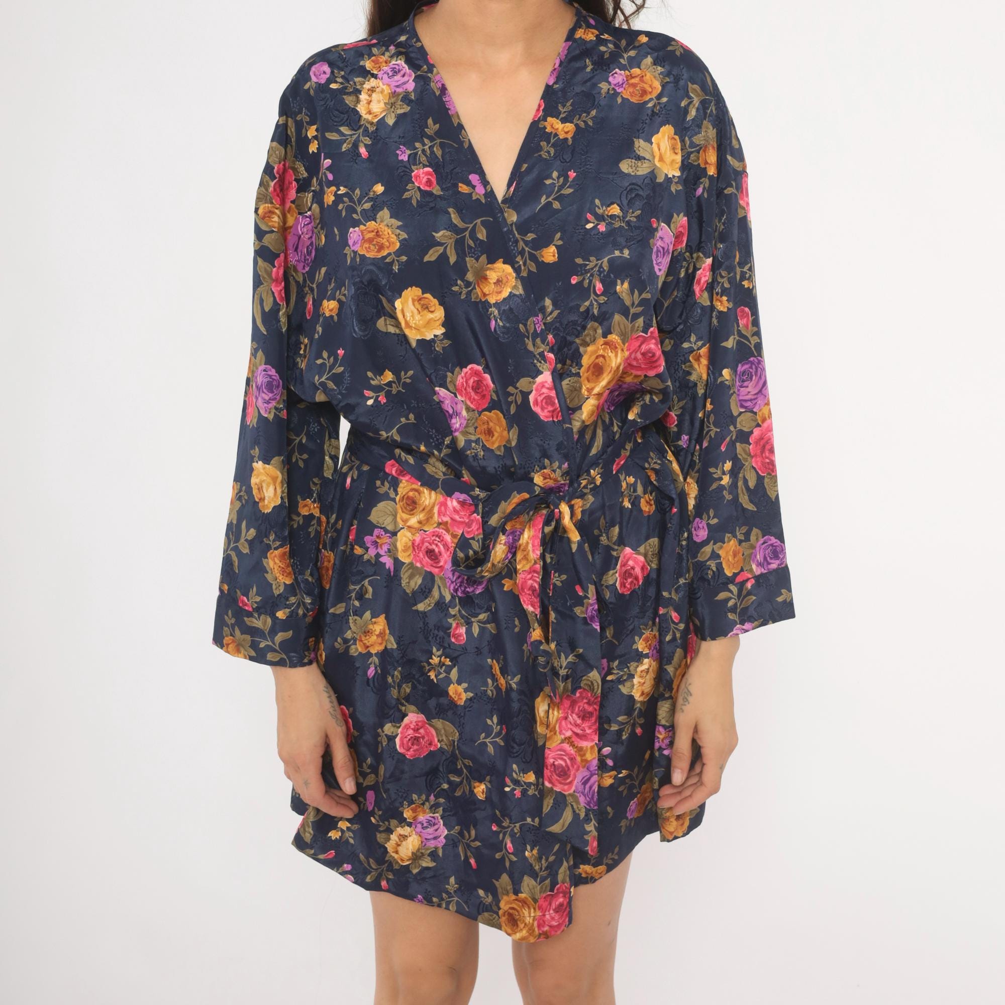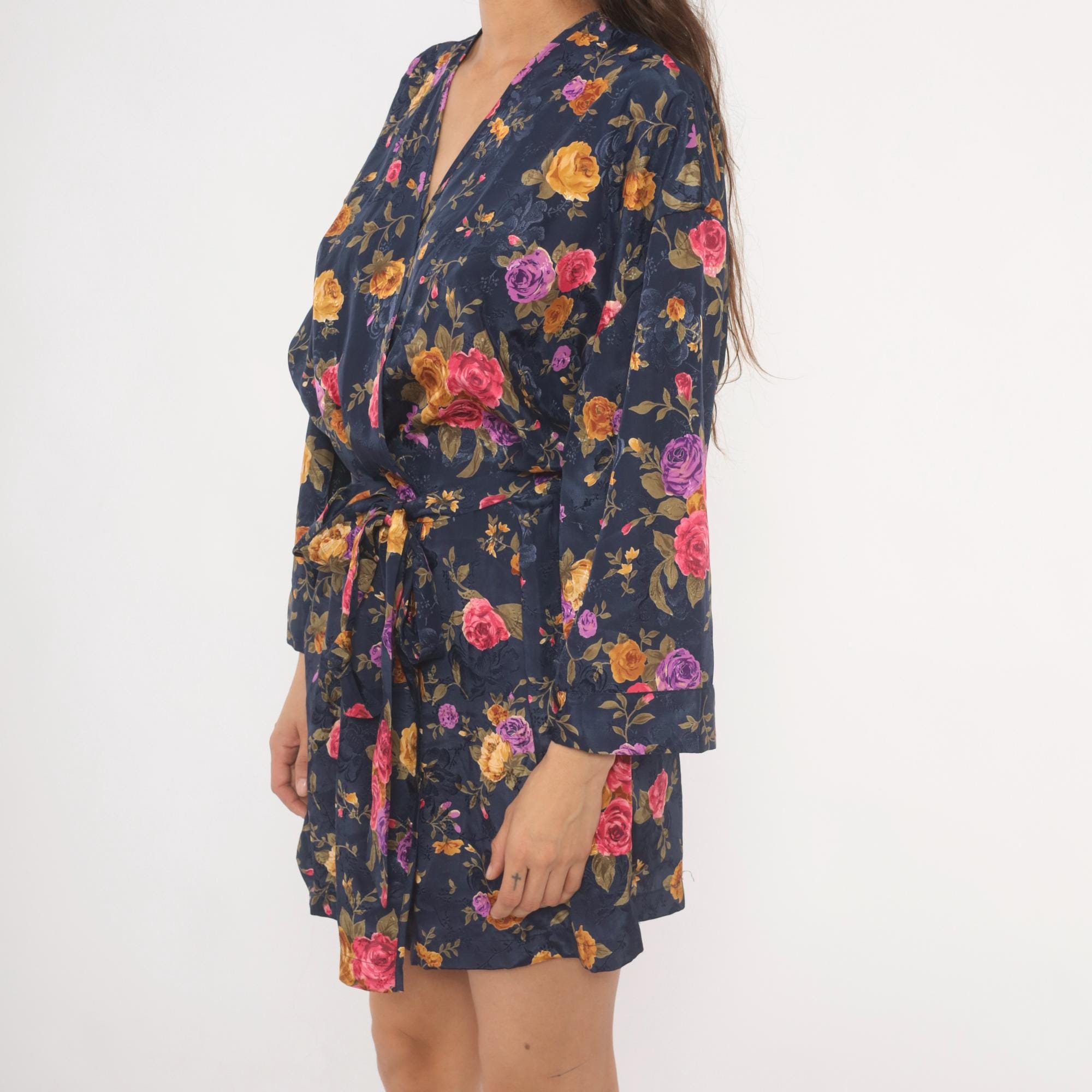 Navy wrap robe from M.T. Morgan Taylor with an allover rose print in pink, purple, and gold tones. Kimono-style sleeves, V-neckline, and tie closure at the waist. Tonal jacquard patterning is woven into the base fabric beneath the floral print. The hemline hits above the knee with a relaxed, open silhouette.