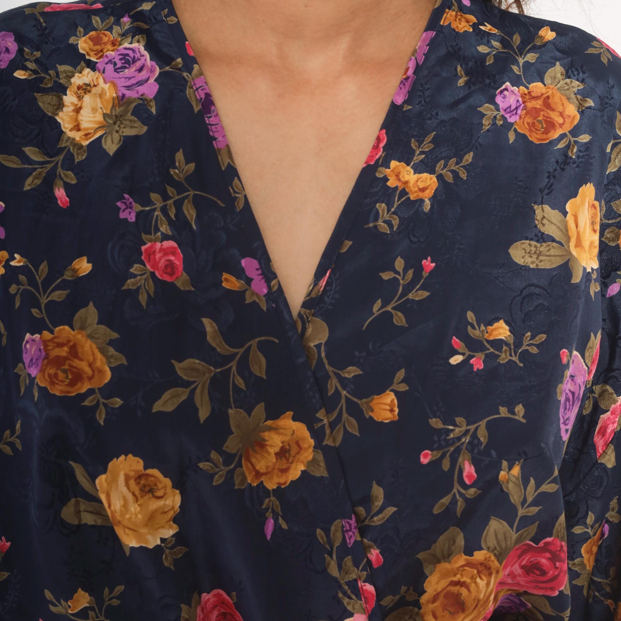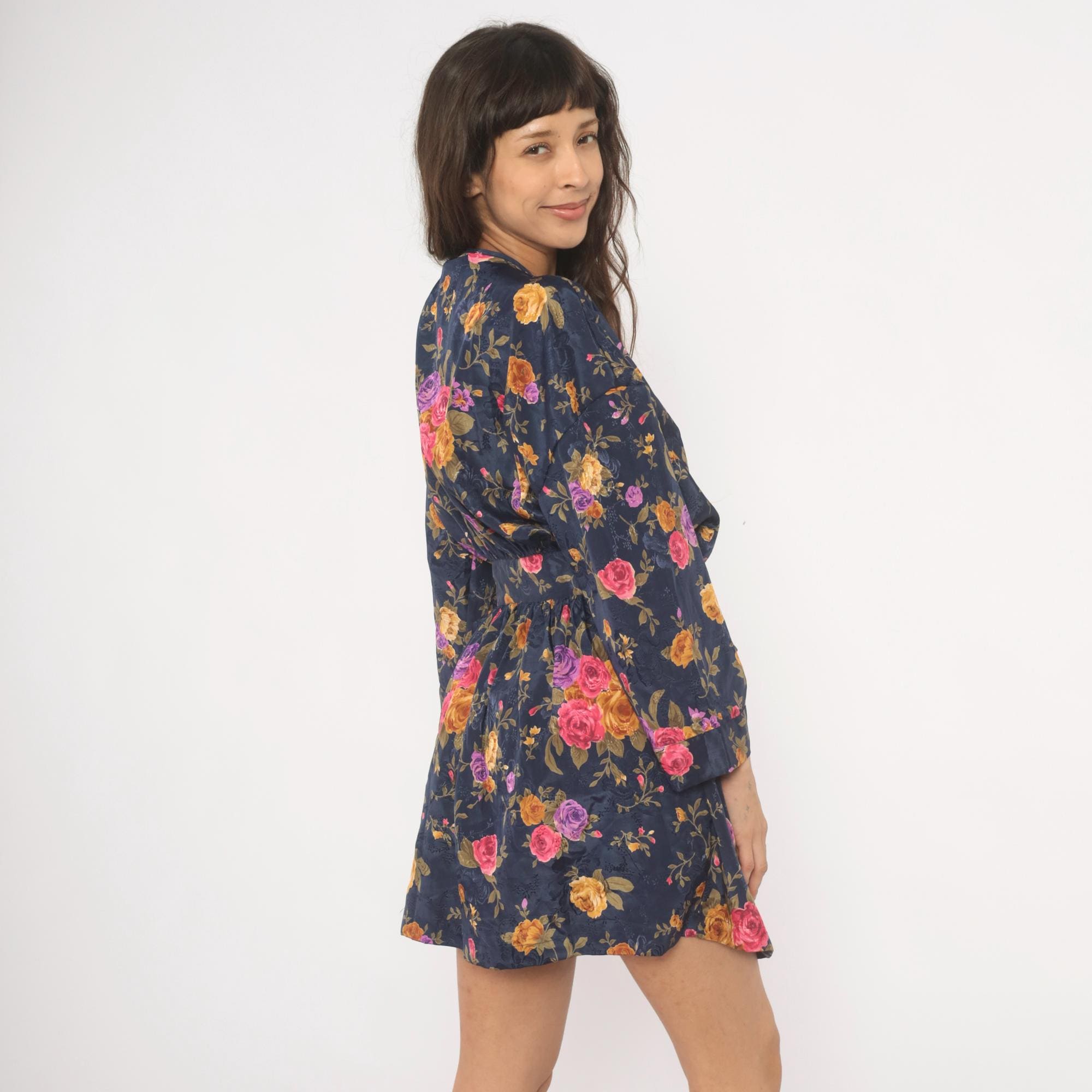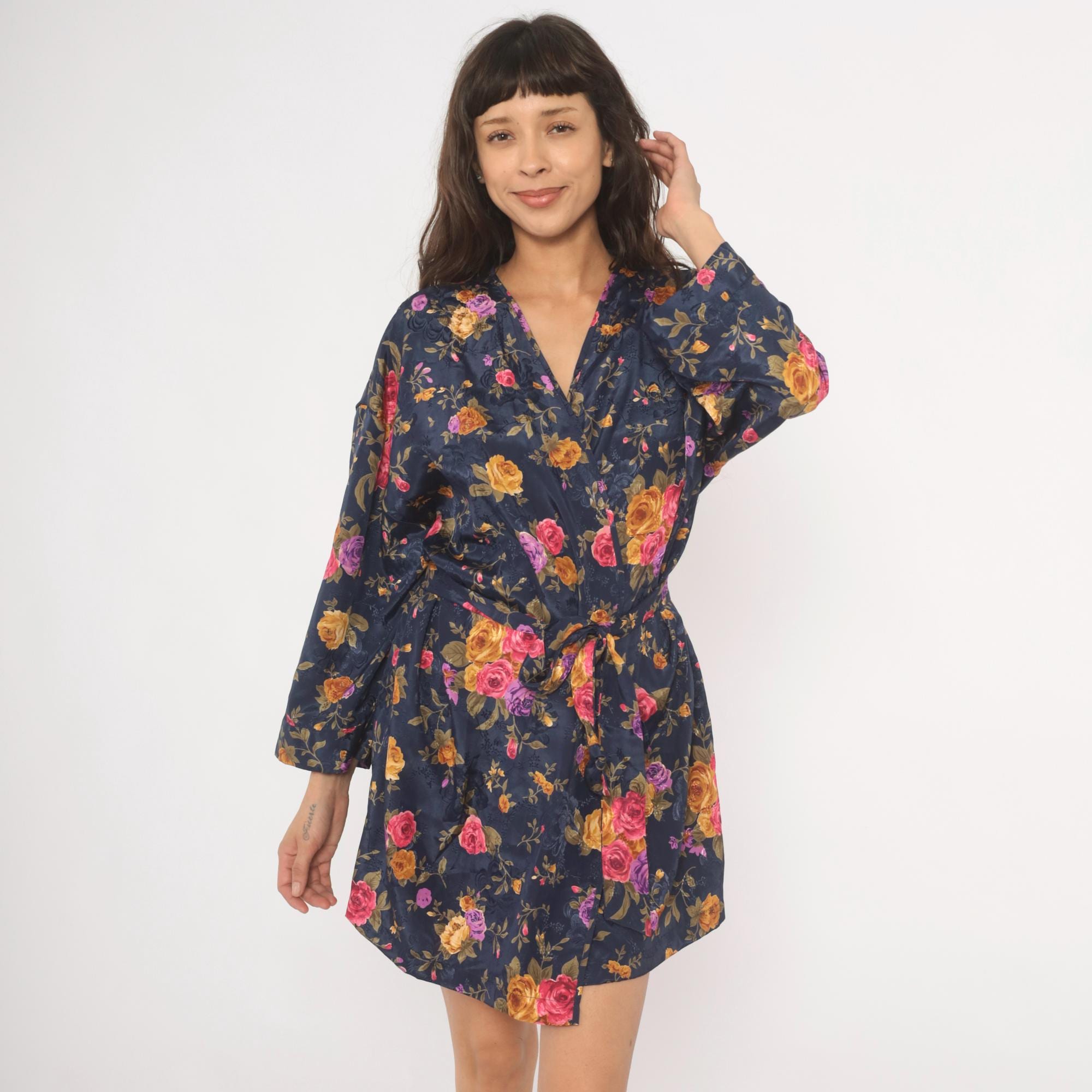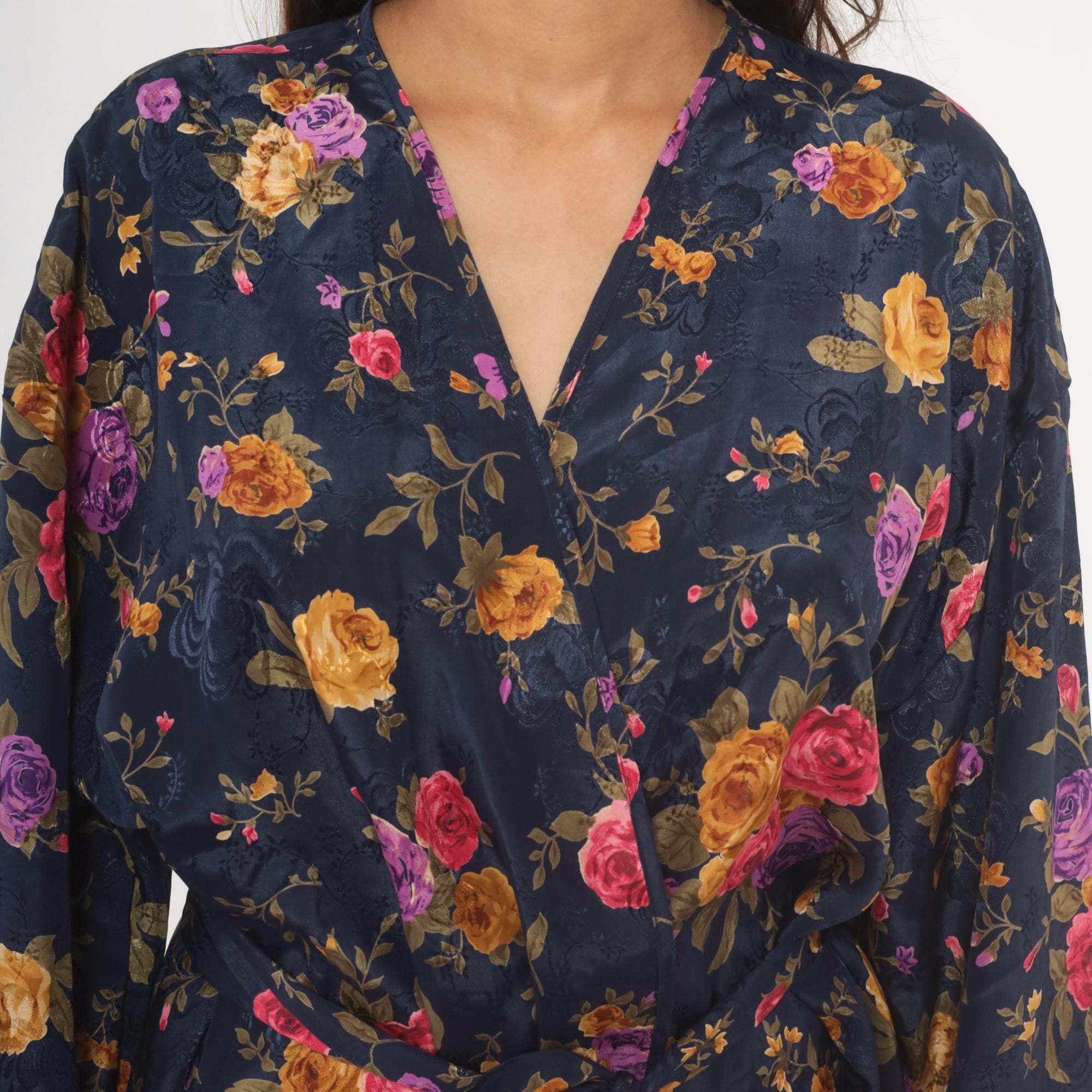 Navy wrap robe from M.T. Morgan Taylor with an allover rose print in pink, purple, and gold tones. Kimono-style sleeves, V-neckline, and tie closure at the waist. Tonal jacquard patterning is woven into the base fabric beneath the floral print. The hemline hits above the knee with a relaxed, open silhouette.