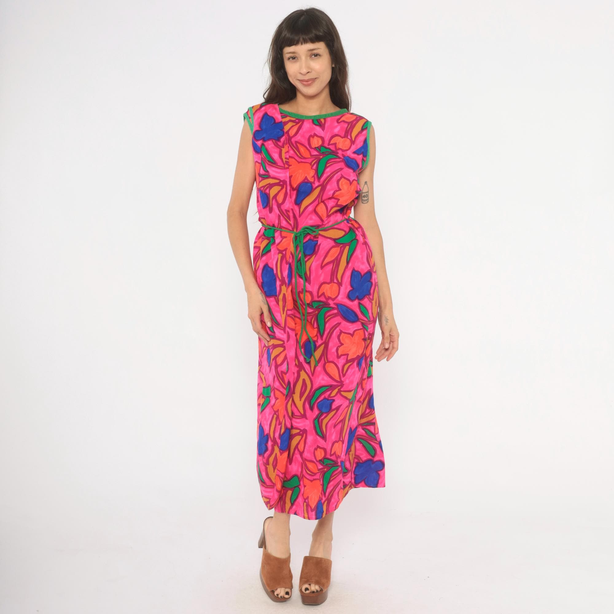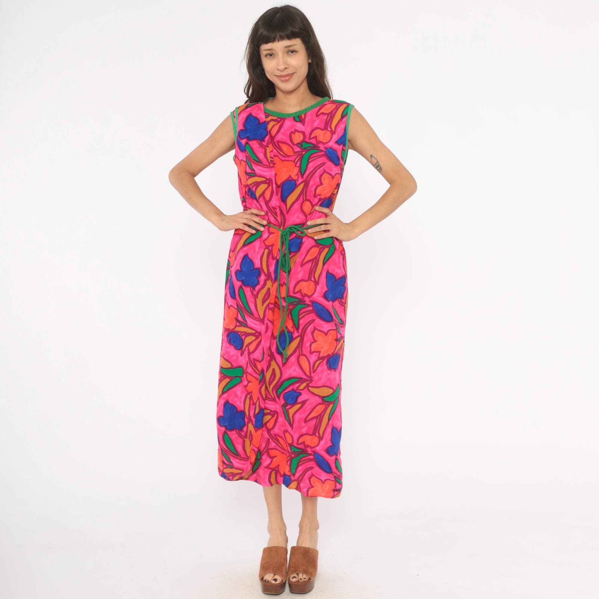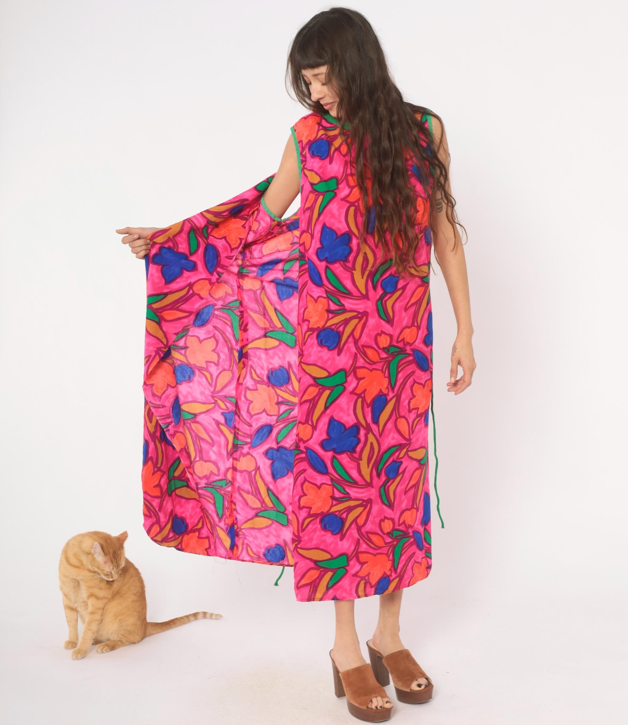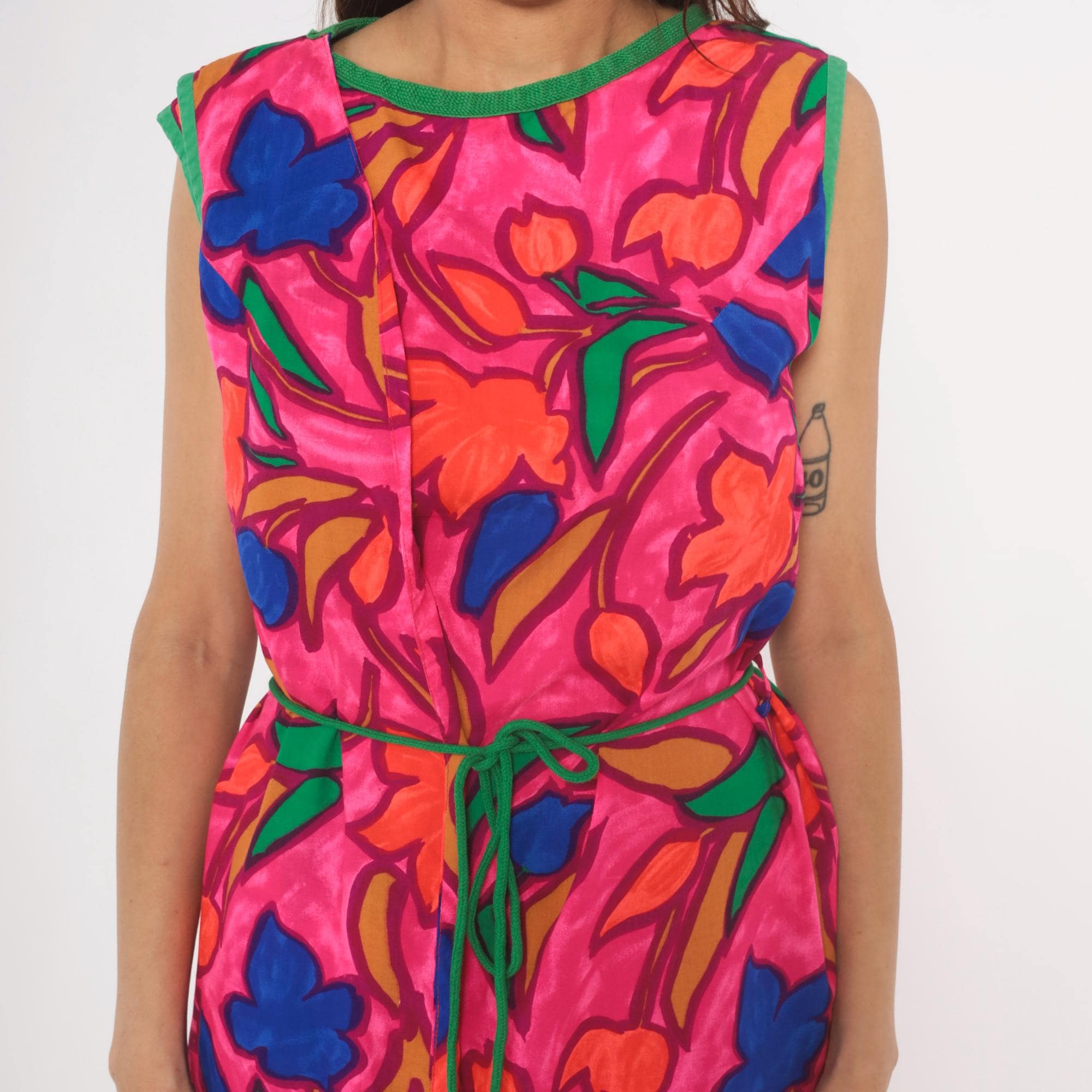 70s hot pink sleeveless maxi dress with a large-scale psychedelic floral print in cobalt blue, orange-red, green, and amber. Round neckline with green contrast trim along the neck, armholes, and side seams. Open wrap-style front panel secured by green cord ties at the waist, with a second layer underneath for full coverage. The print has a hand-painted quality with abstract tulip and leaf motifs across the entire garment.