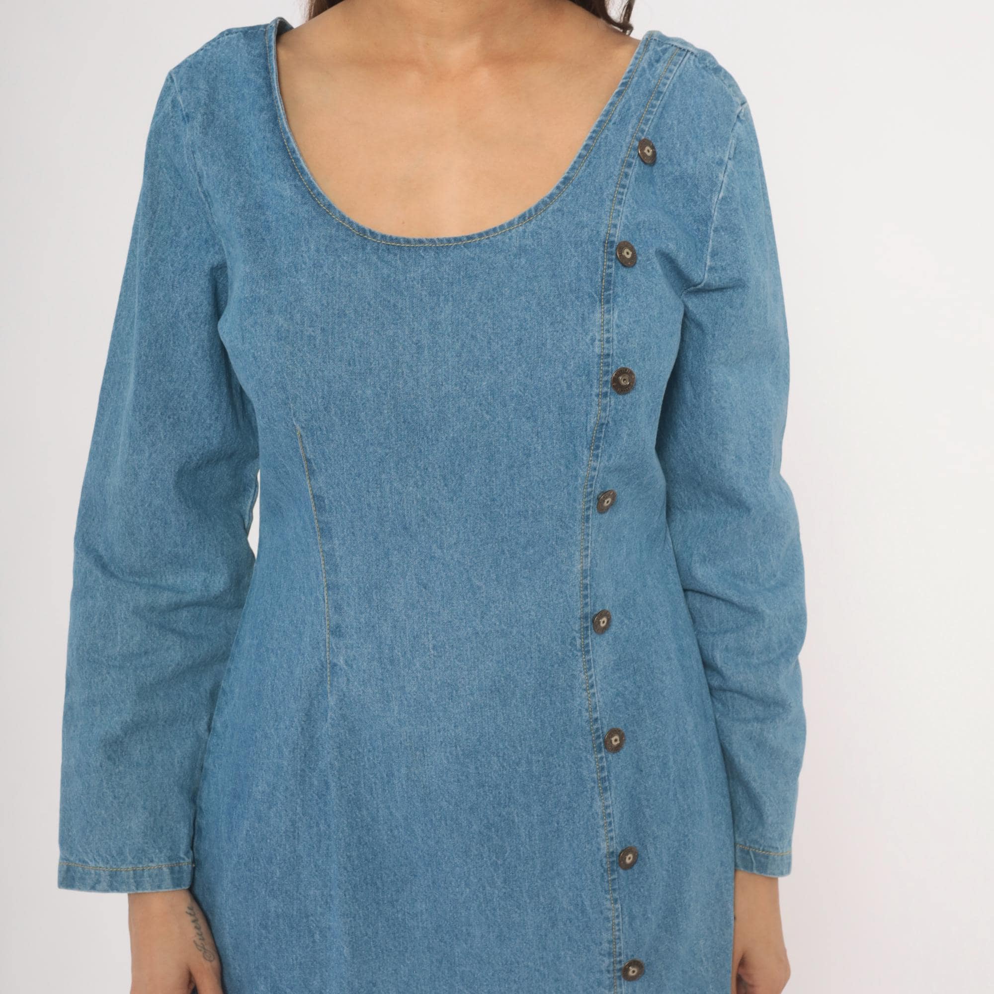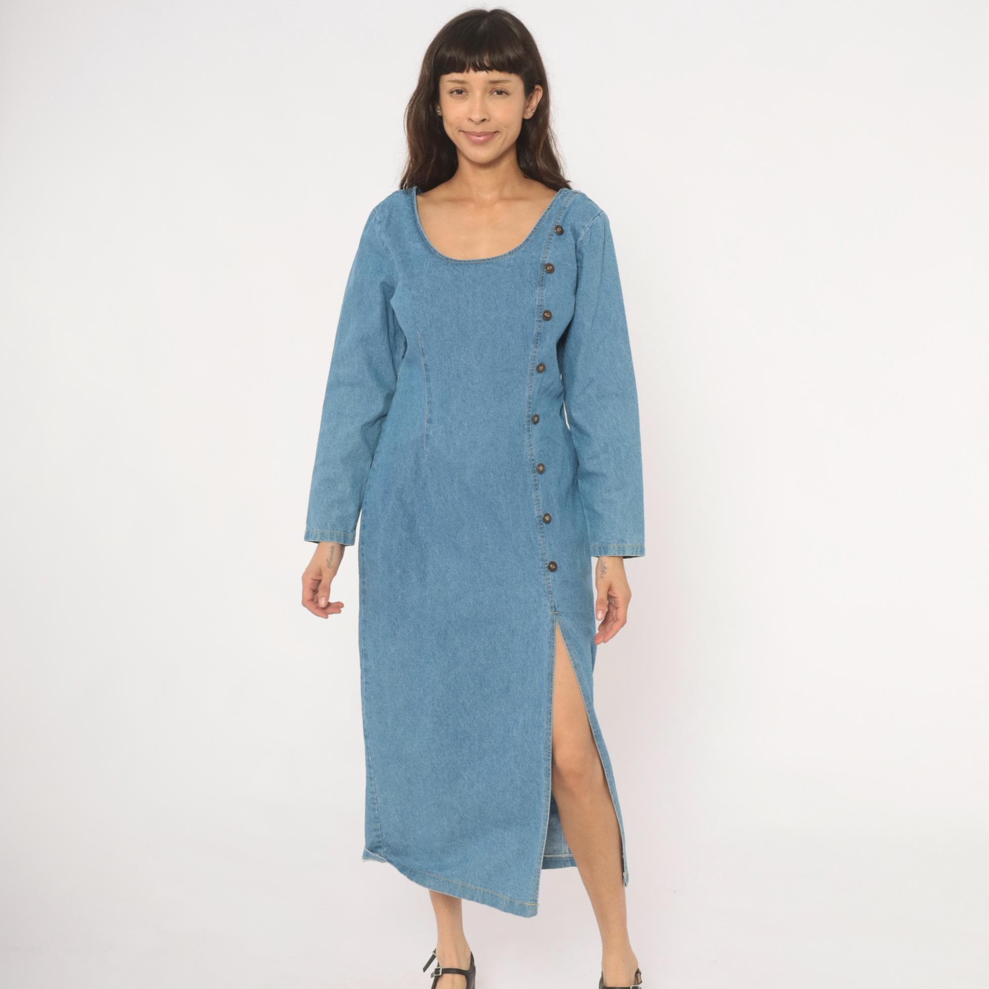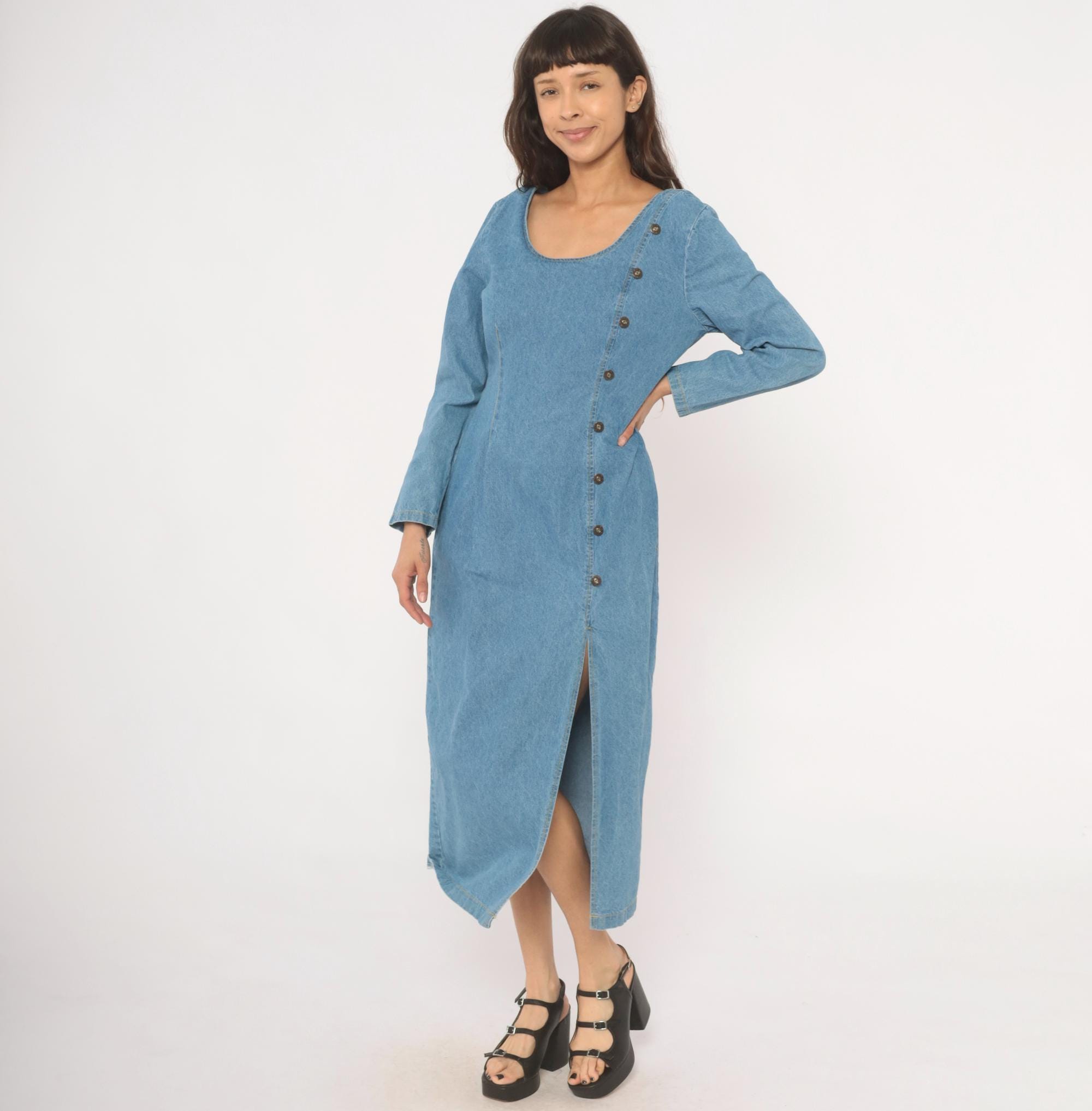 90s light blue denim midi dress from Switch USA with an asymmetrical button front placket and wide scoop neckline. Long sleeves with straight cuffs, princess seam detailing through the bodice, and a fitted waist.