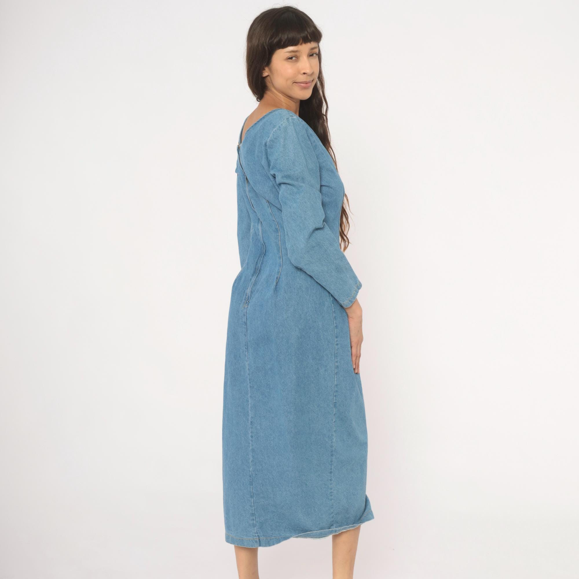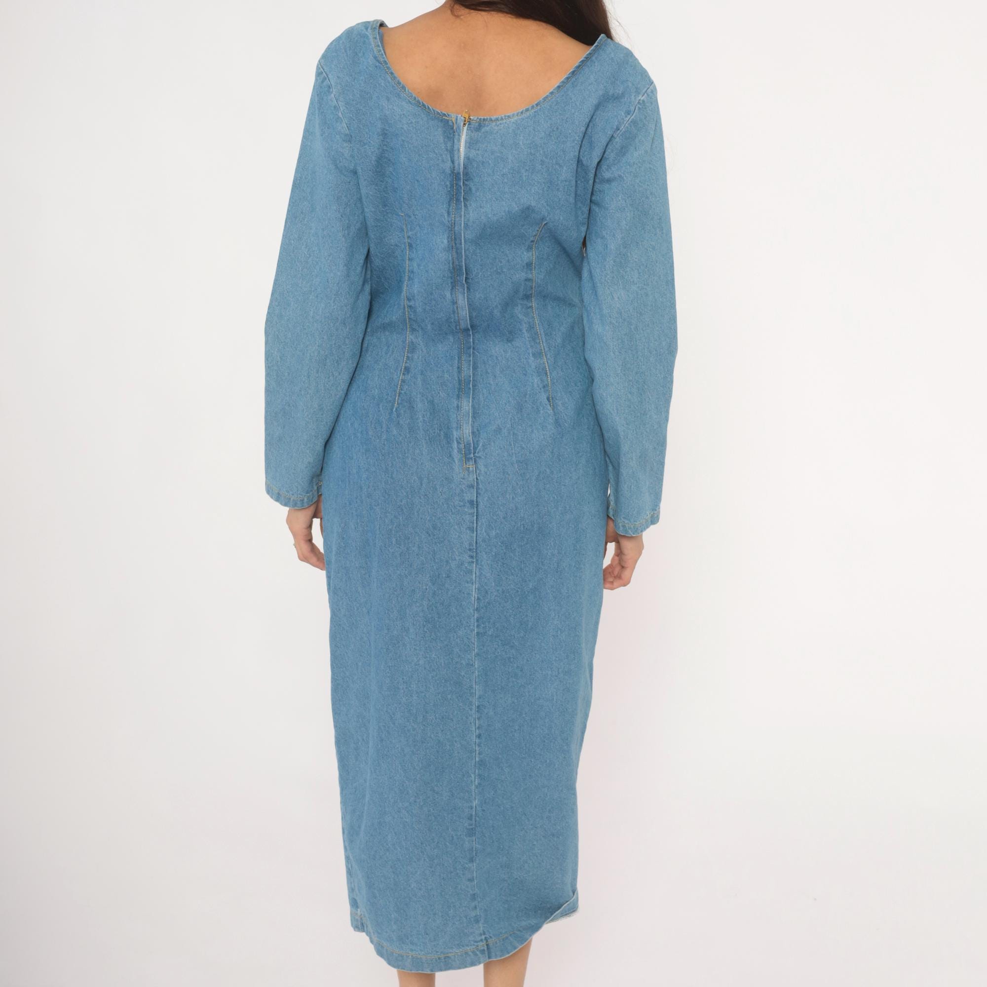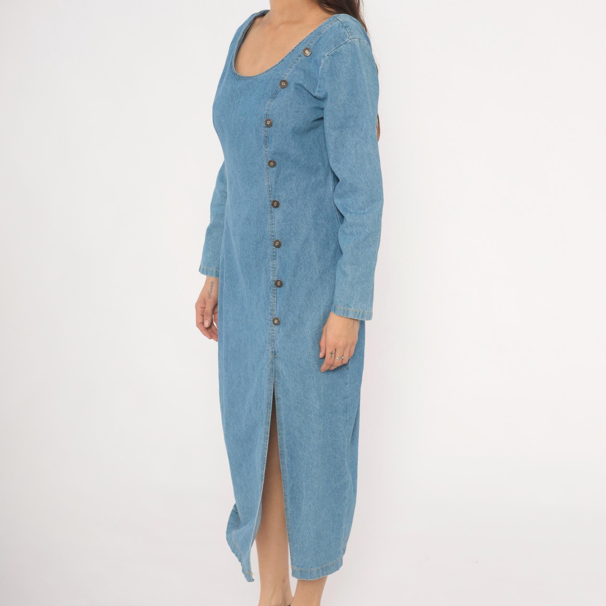 90s light blue denim midi dress from Switch USA with an asymmetrical button front placket and wide scoop neckline. Long sleeves with straight cuffs, princess seam detailing through the bodice, and a fitted waist.