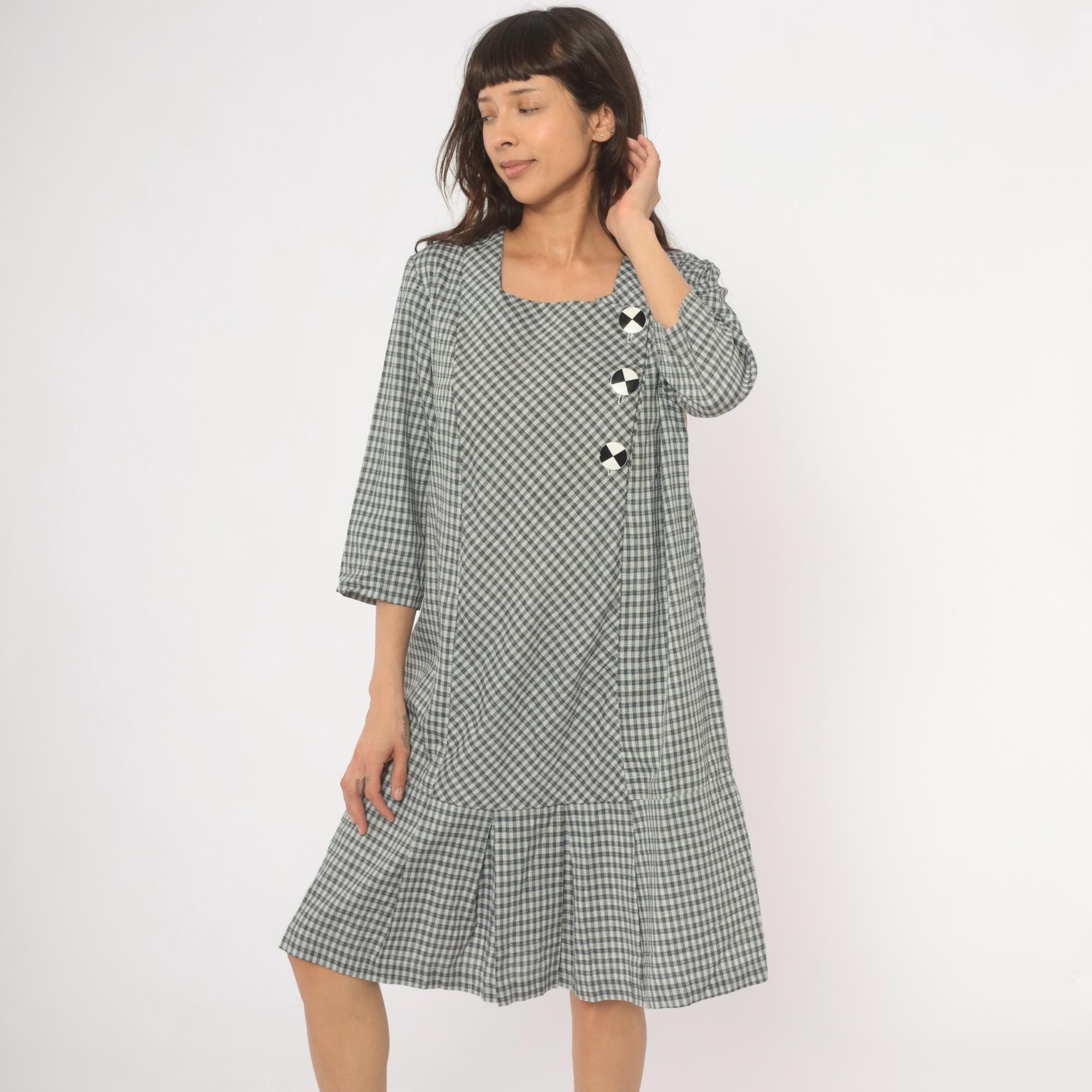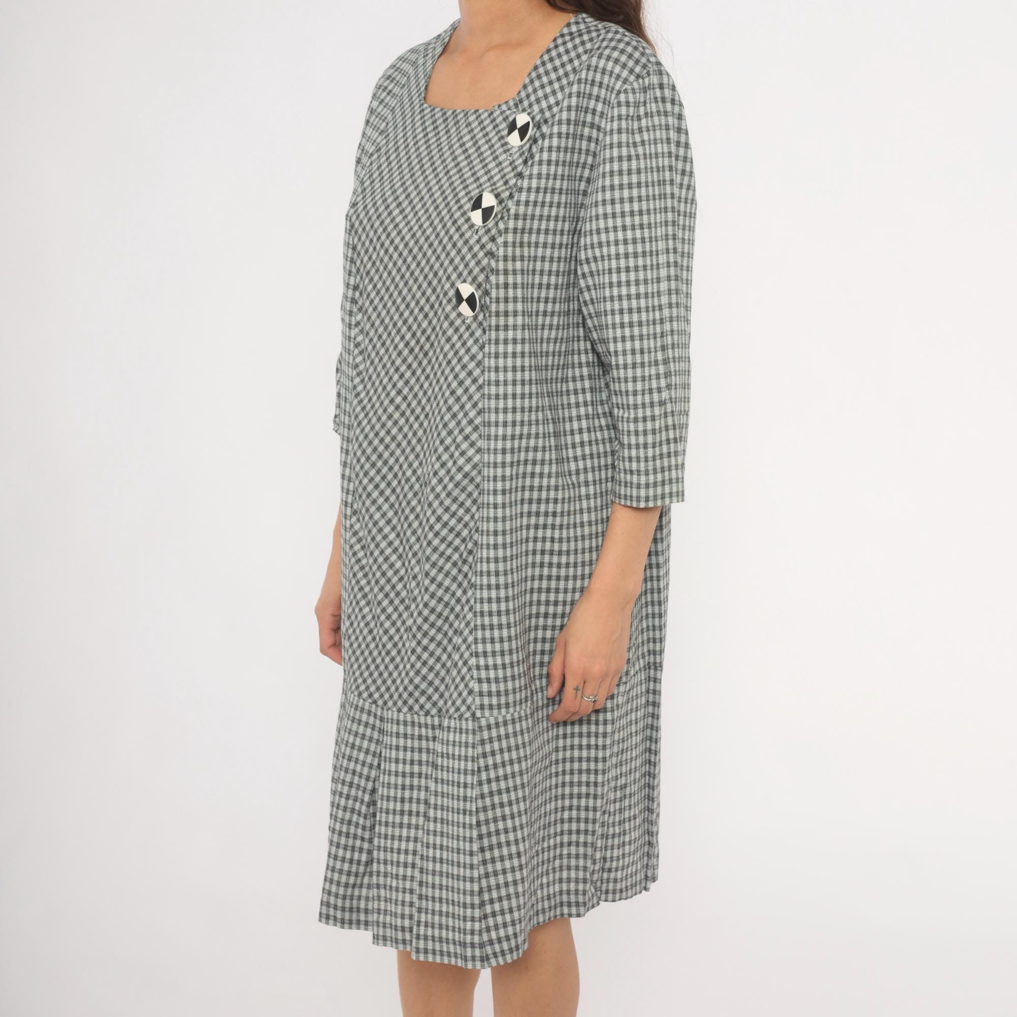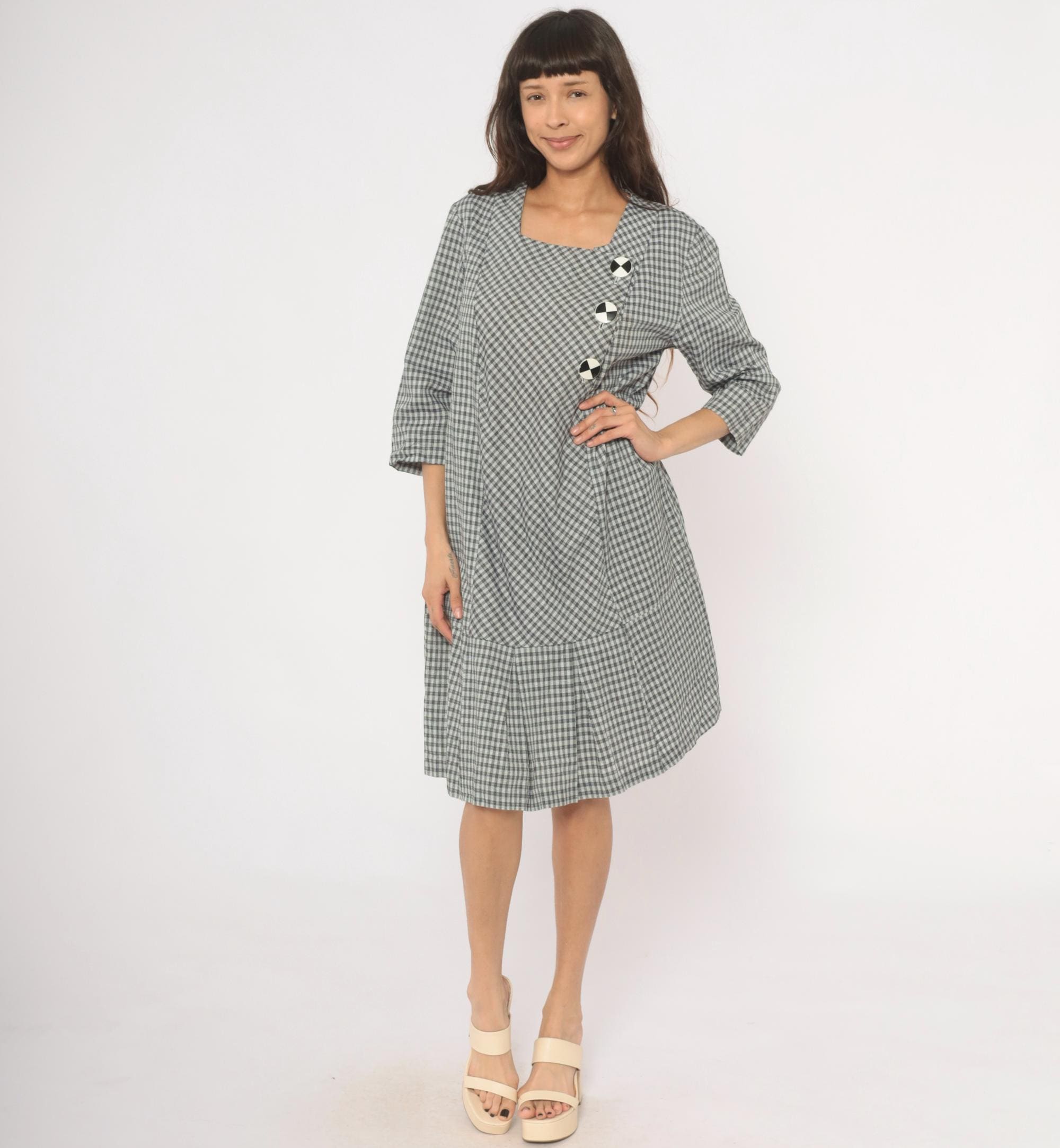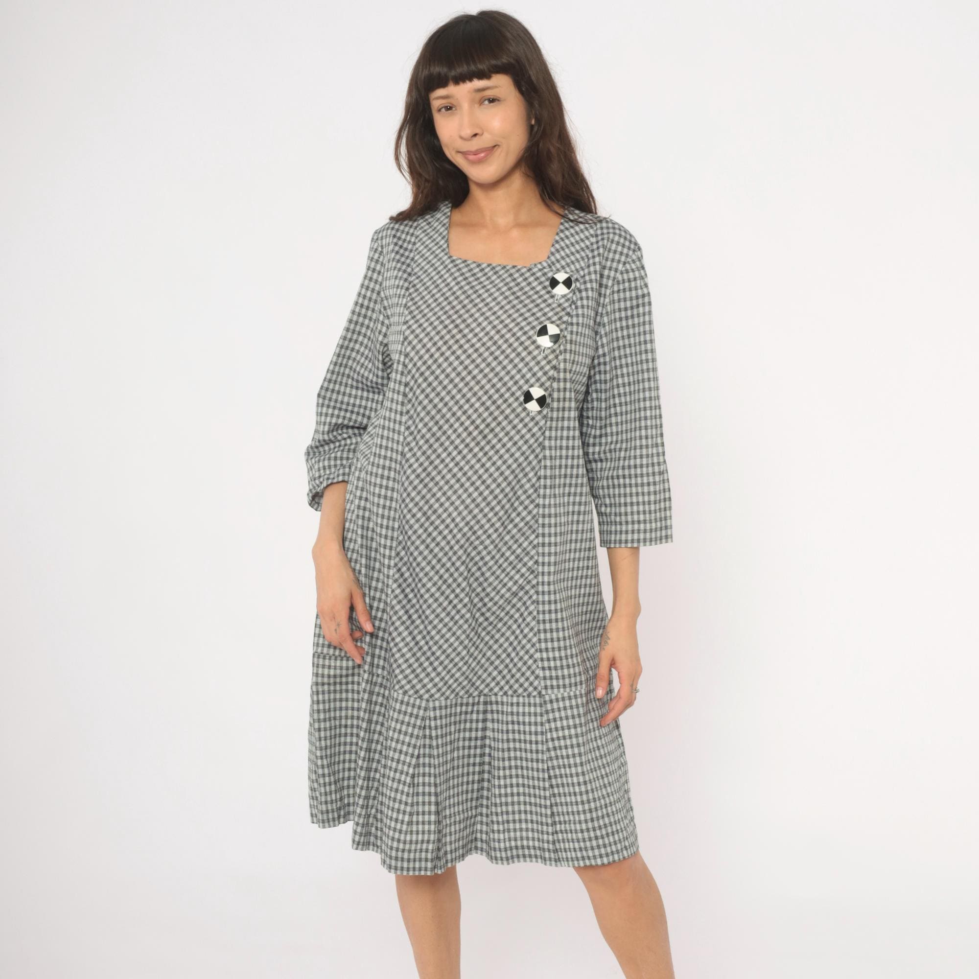90s black and white gingham check dress from Be My Baby with a square neckline and three-quarter length sleeves. Asymmetric front closure with three large decorative black and white checkered buttons, and an angled front panel where the gingham runs on the bias. Drop waist seam with a pleated lower hem section, straight relaxed silhouette throughout.