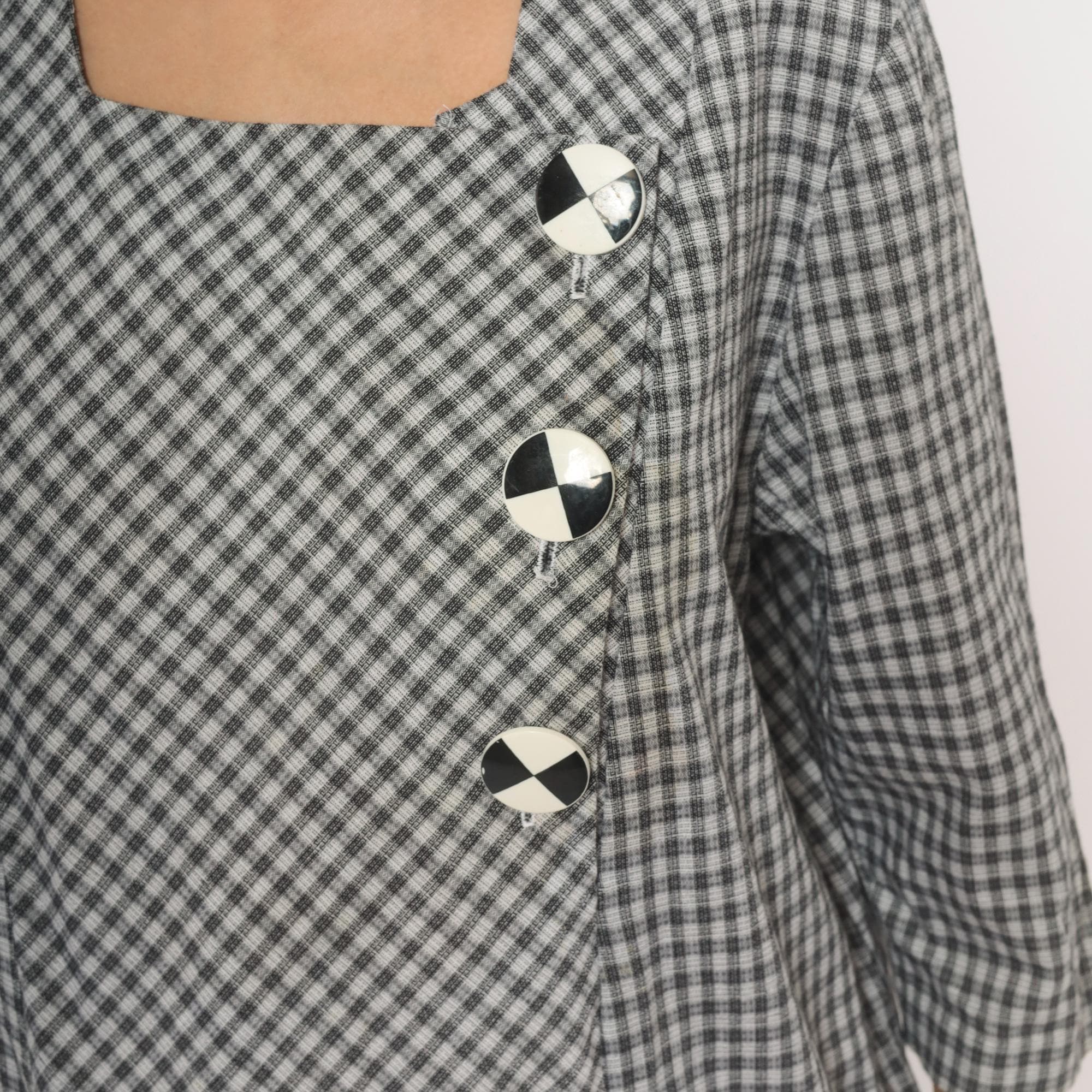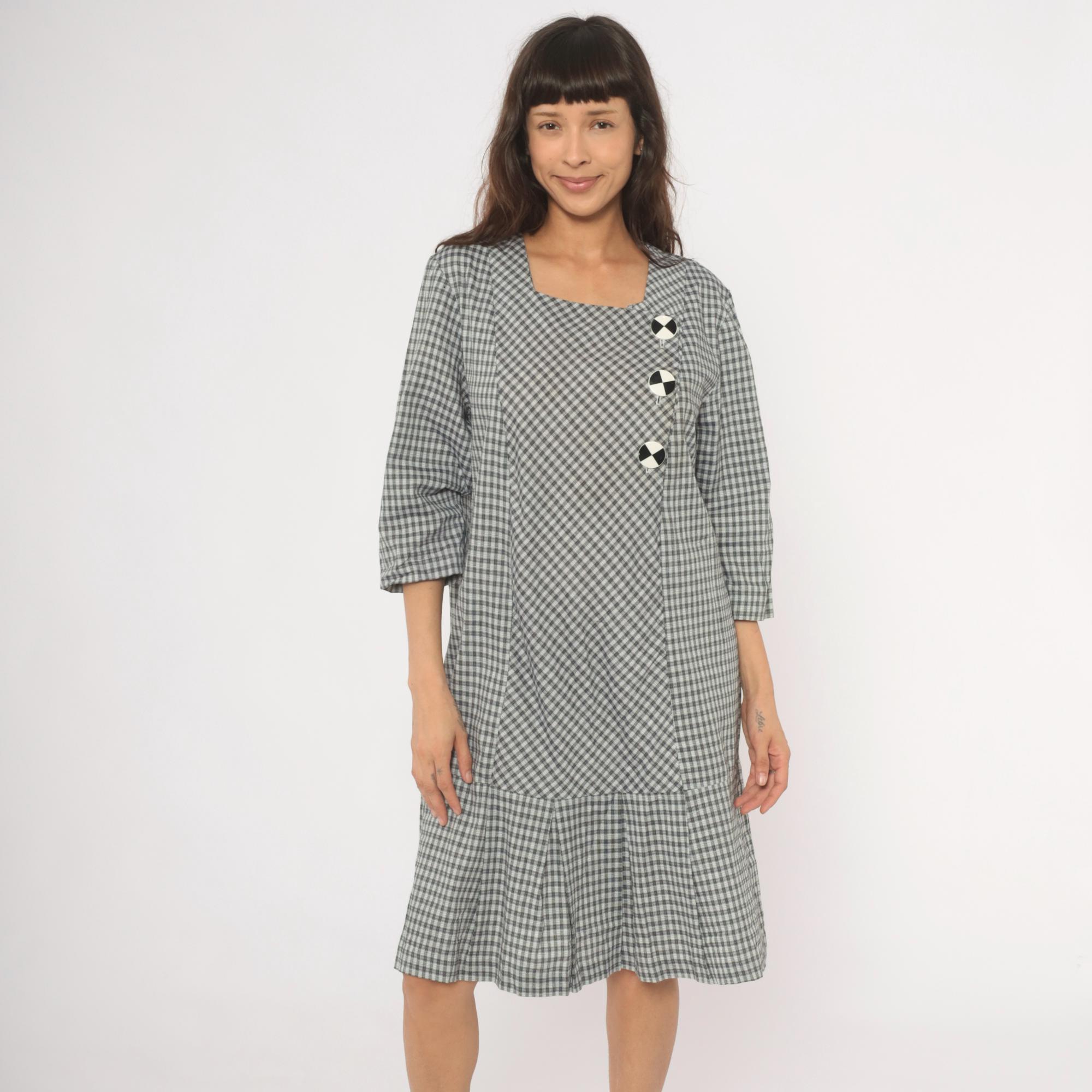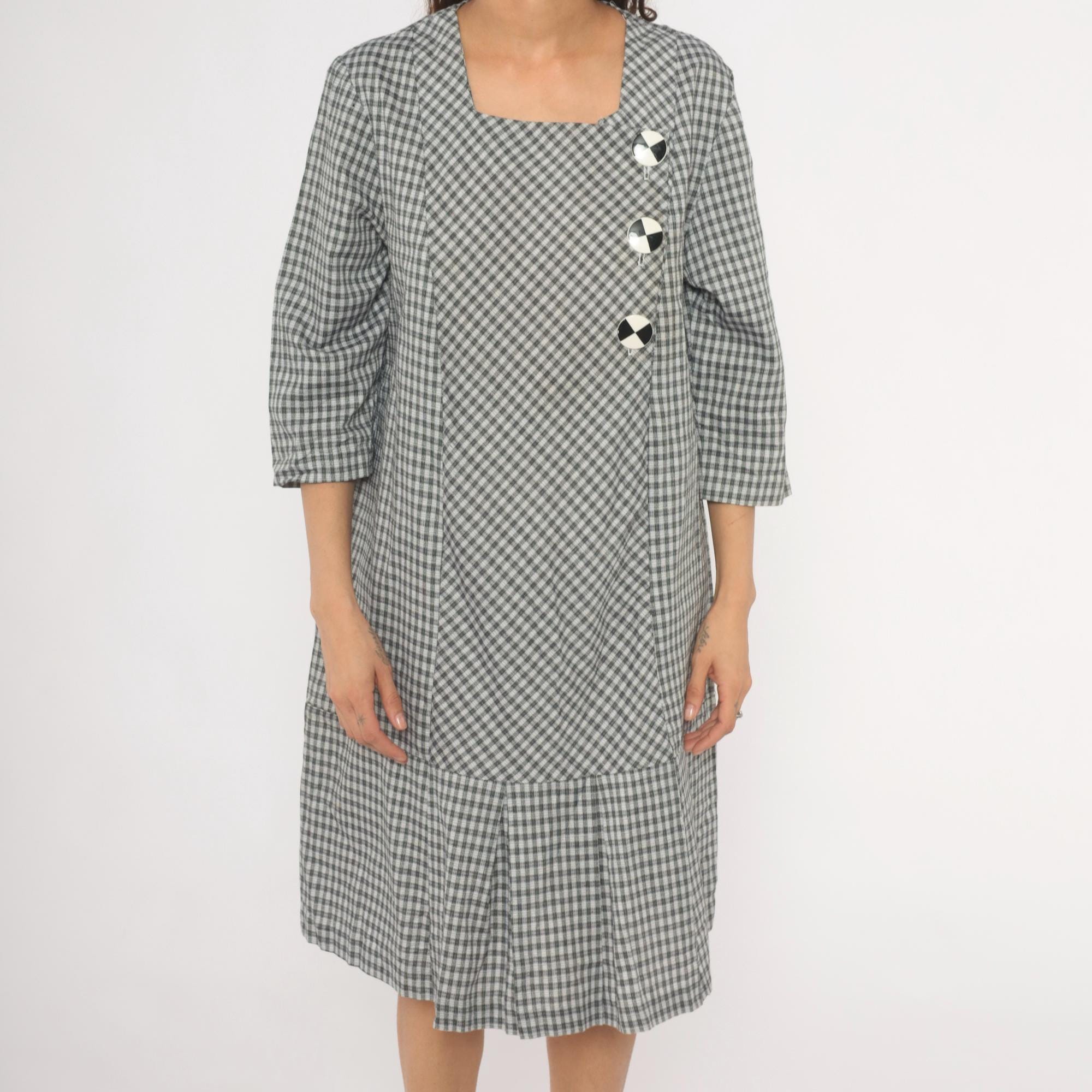 90s black and white gingham check dress from Be My Baby with a square neckline and three-quarter length sleeves. Asymmetric front closure with three large decorative black and white checkered buttons, and an angled front panel where the gingham runs on the bias. Drop waist seam with a pleated lower hem section, straight relaxed silhouette throughout.