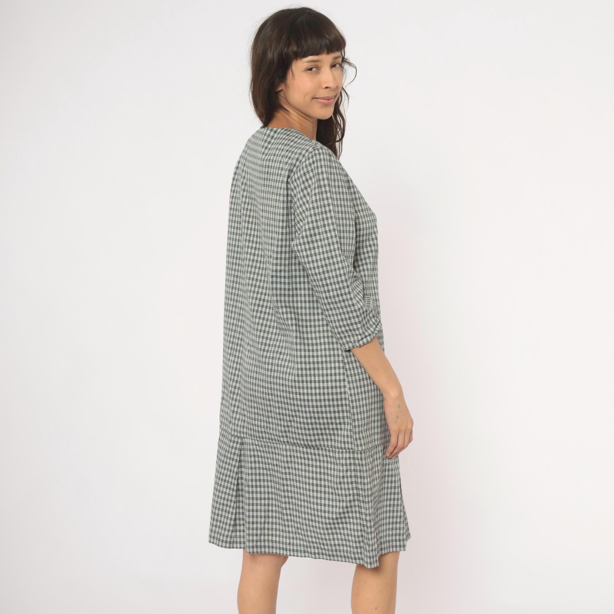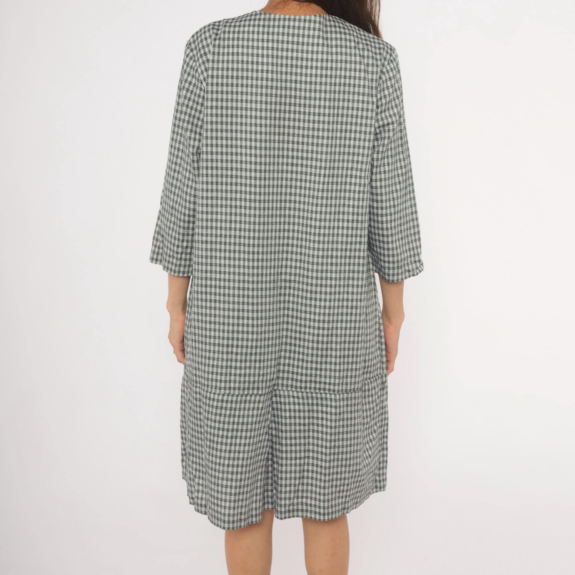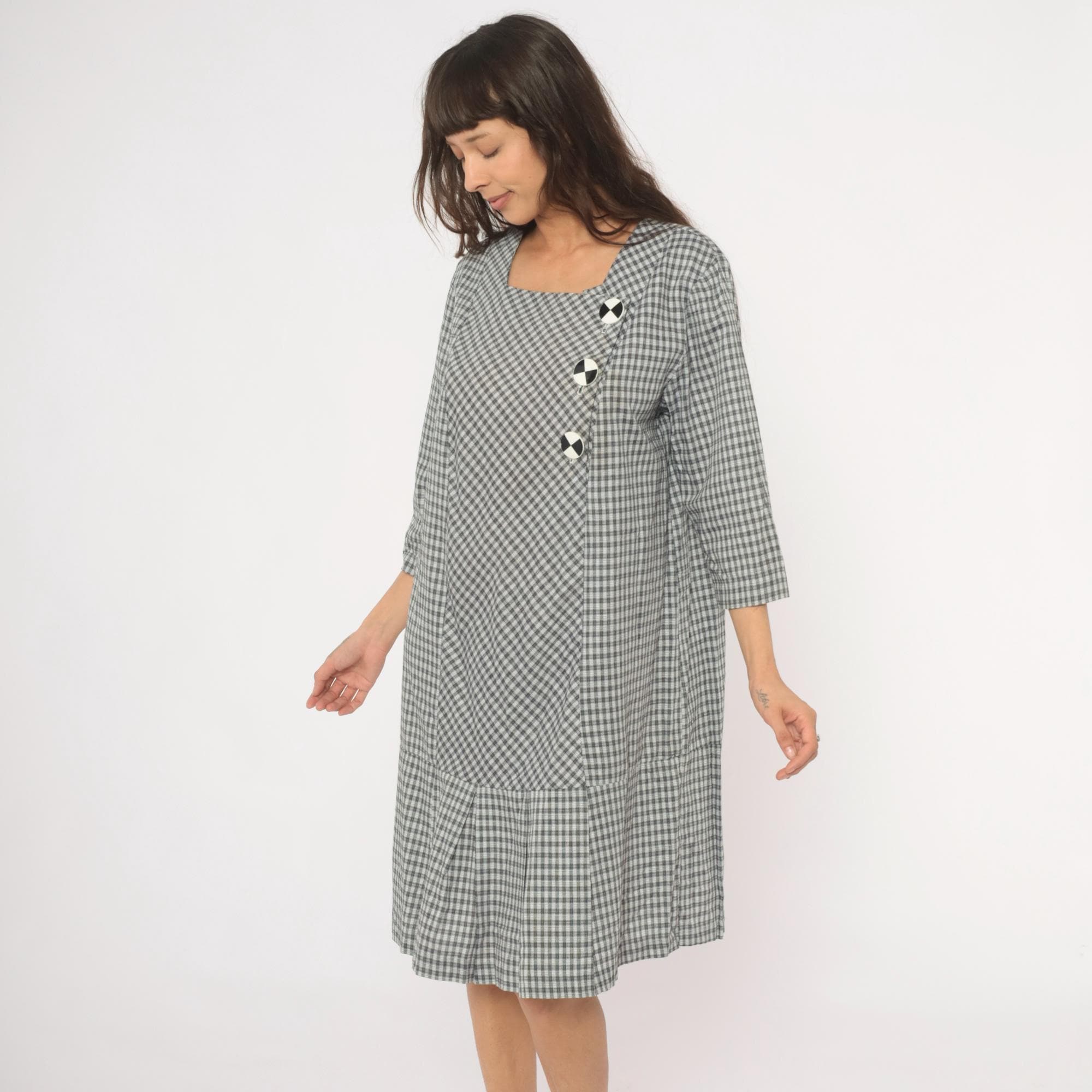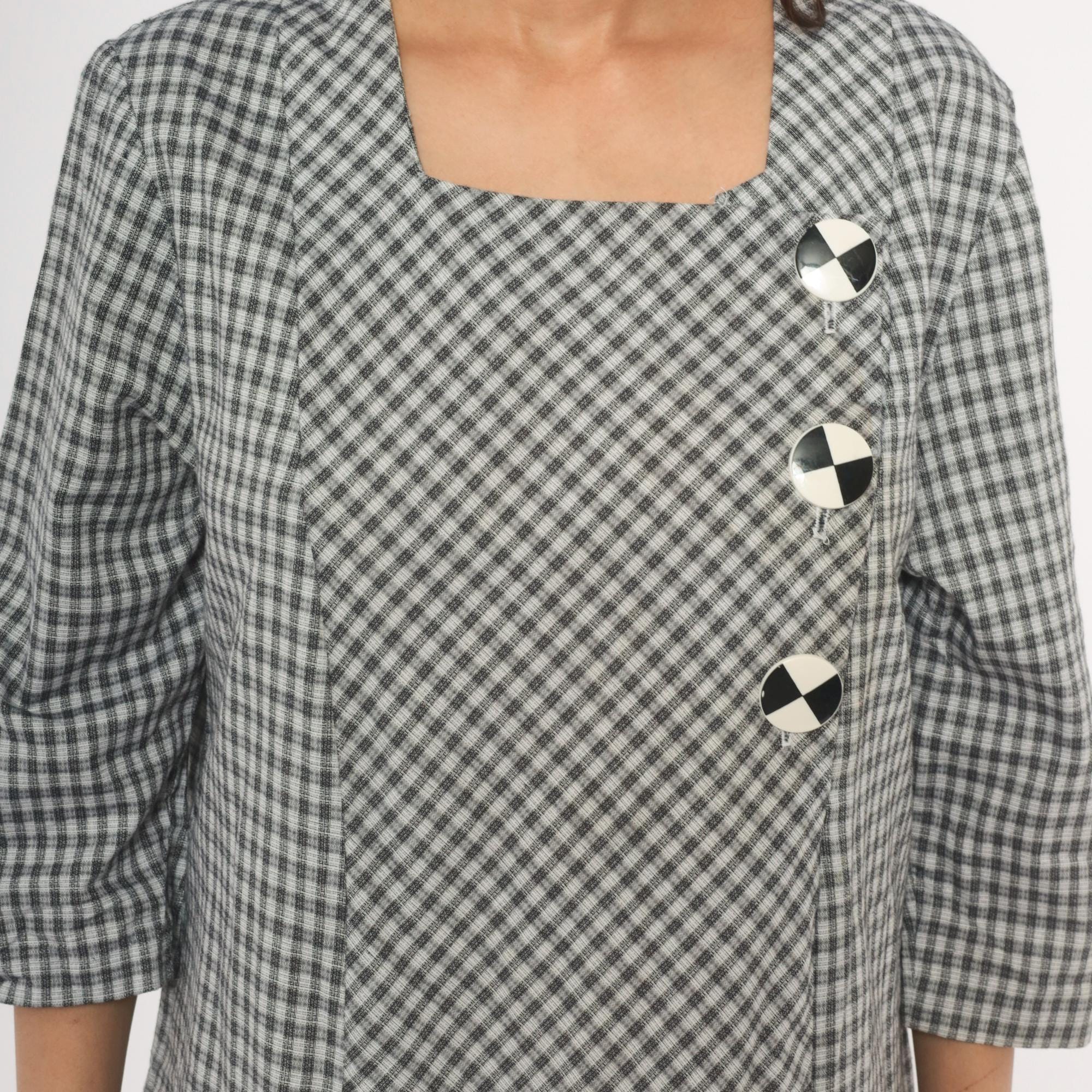 90s black and white gingham check dress from Be My Baby with a square neckline and three-quarter length sleeves. Asymmetric front closure with three large decorative black and white checkered buttons, and an angled front panel where the gingham runs on the bias. Drop waist seam with a pleated lower hem section, straight relaxed silhouette throughout.