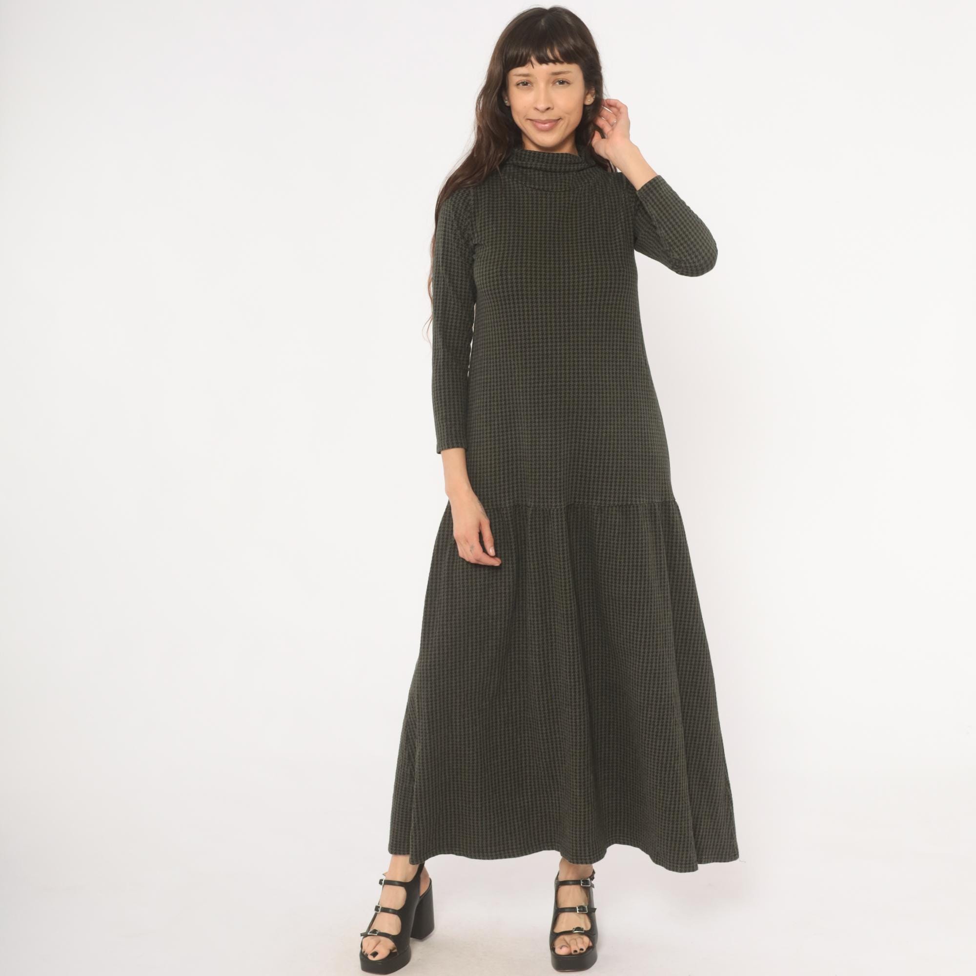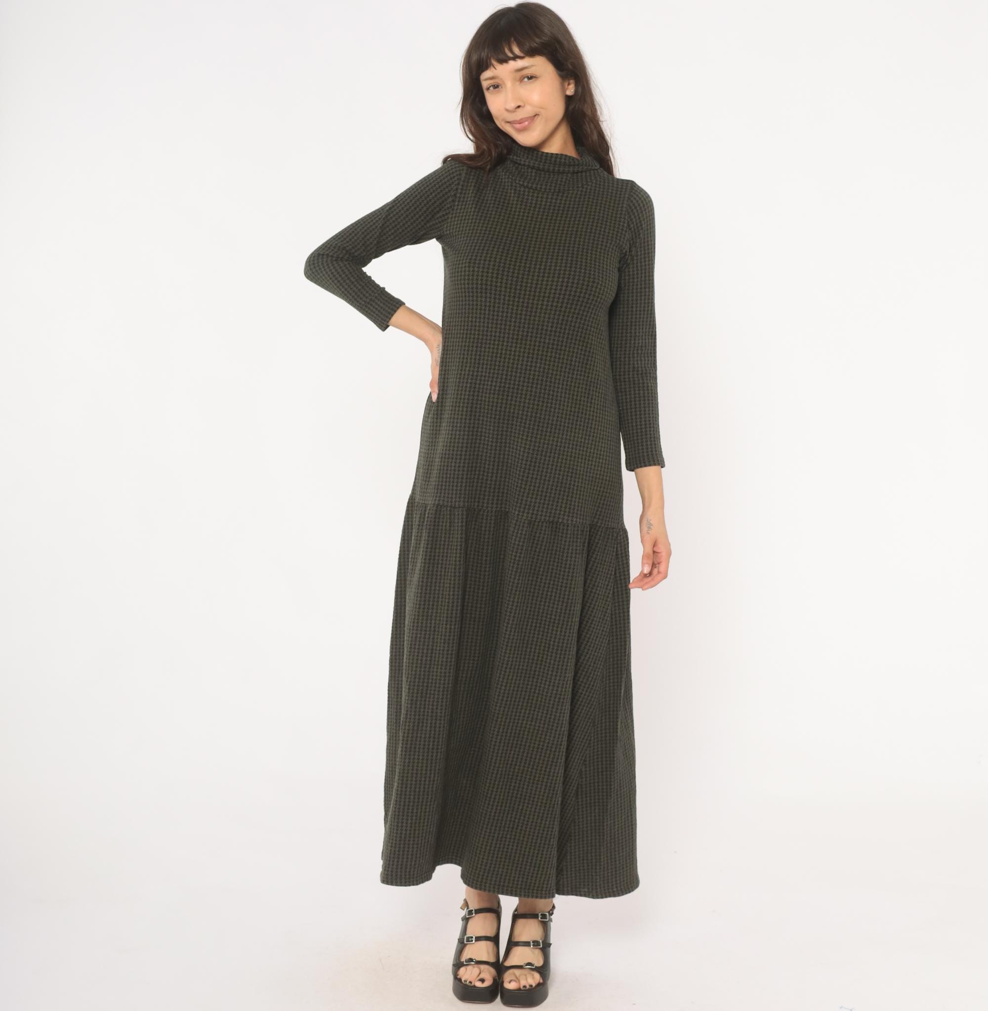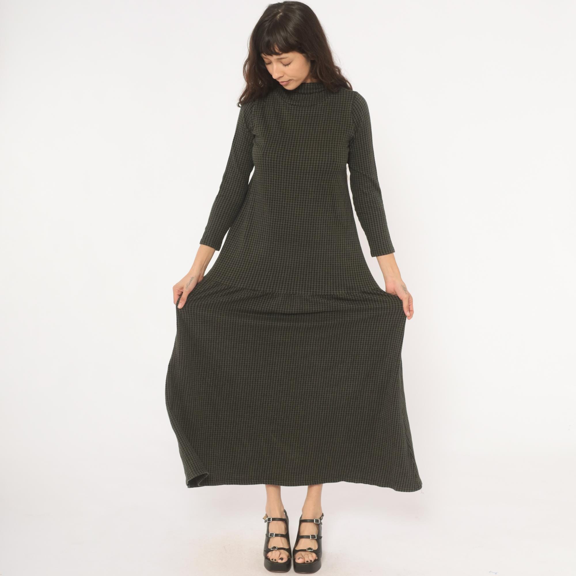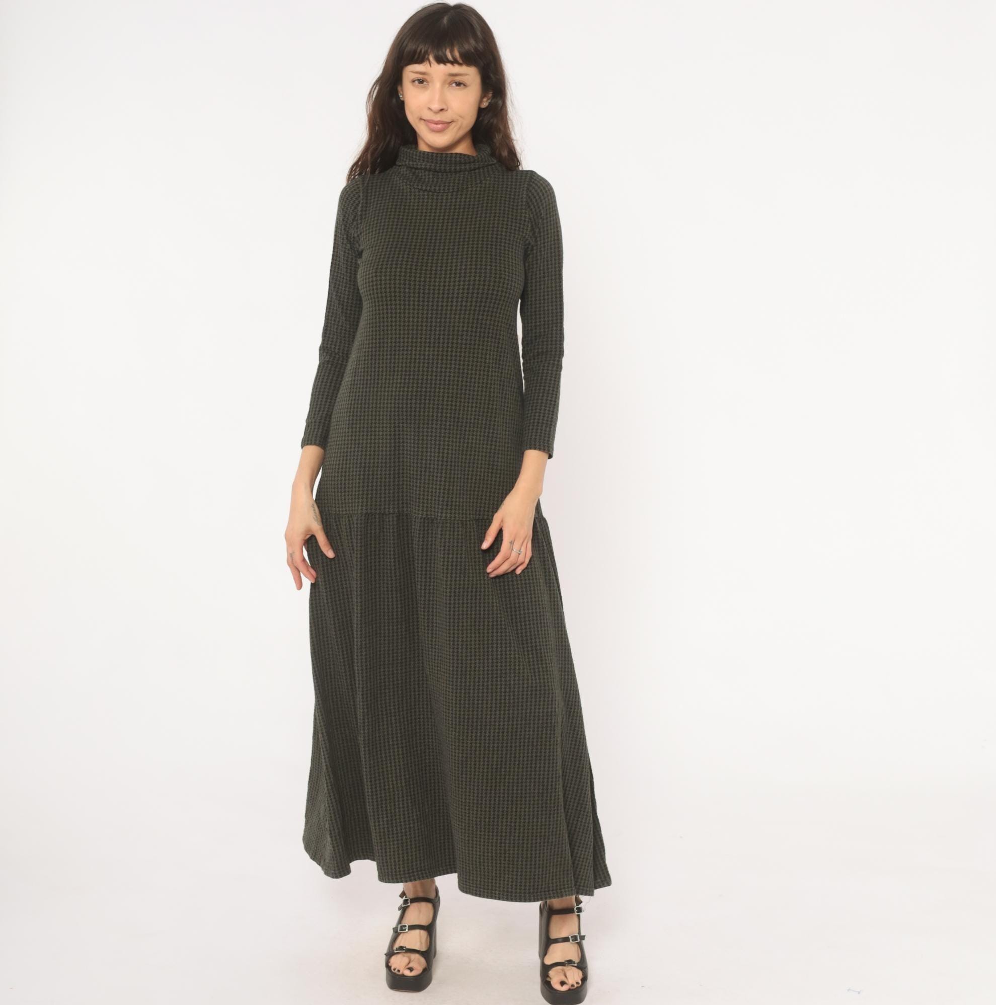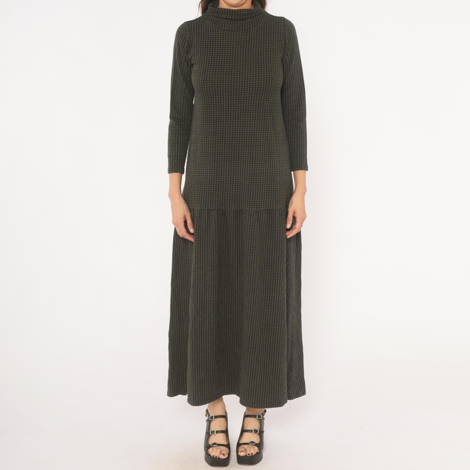 90s olive and black houndstooth maxi dress from JP with a funnel neckline and three-quarter length sleeves. Fitted bodice through the torso with a dropped waist seam and tiered A-line skirt falling to ankle length. Pullover construction with no closures or pockets, allover small-scale houndstooth check pattern in dark olive green and black.