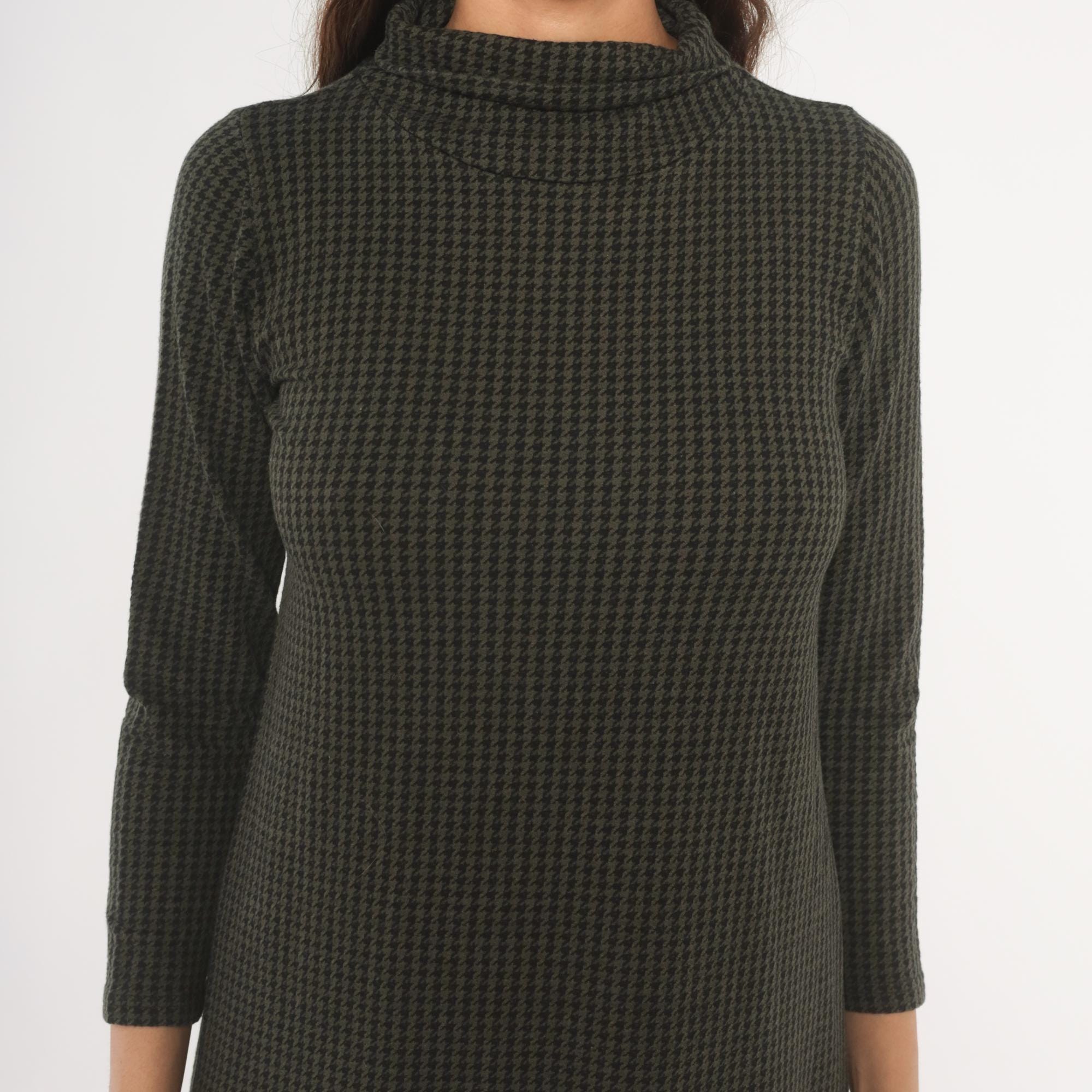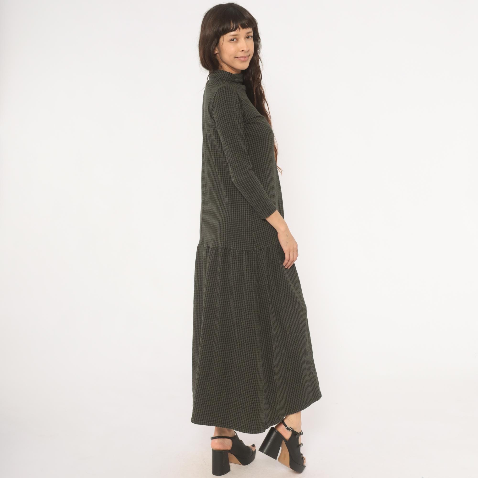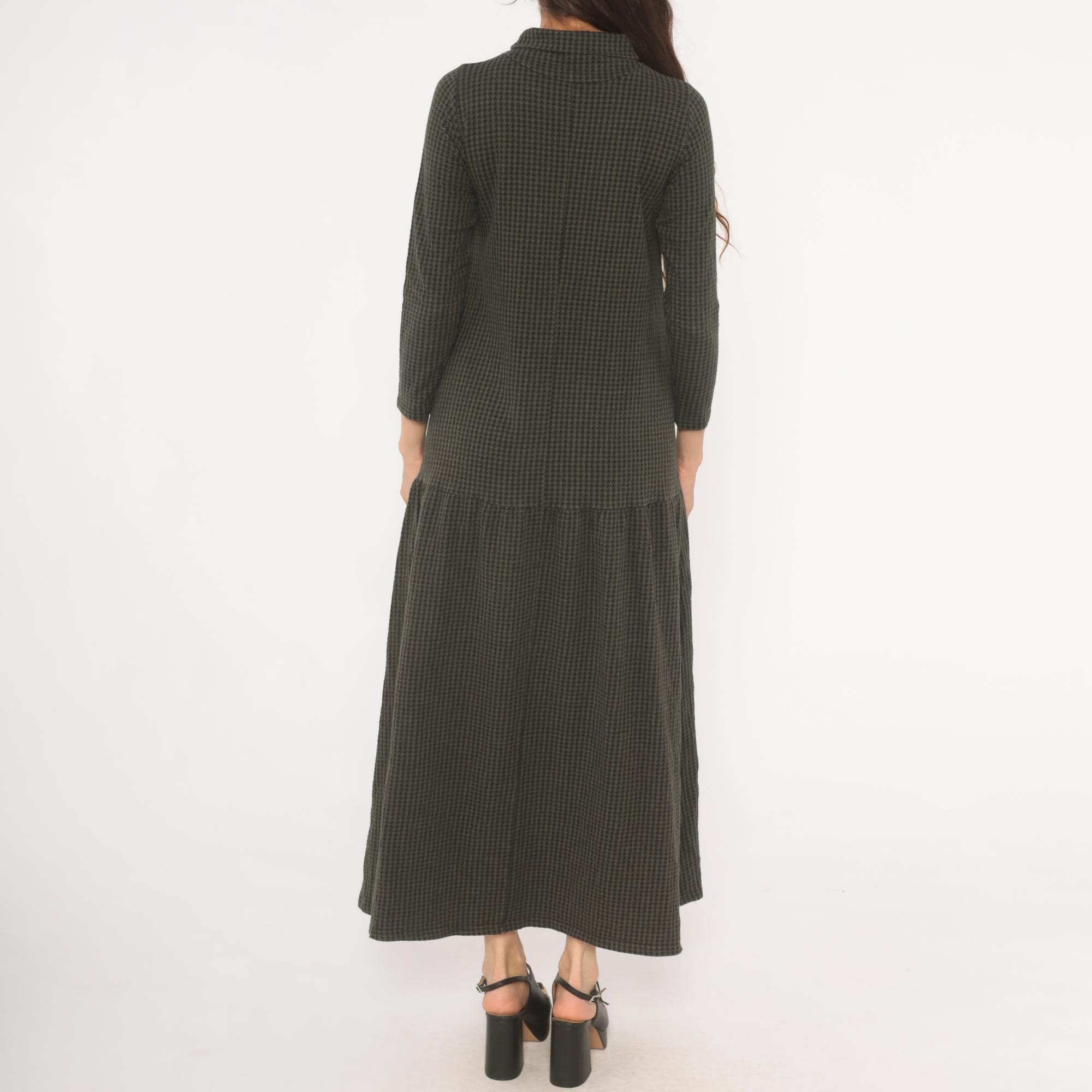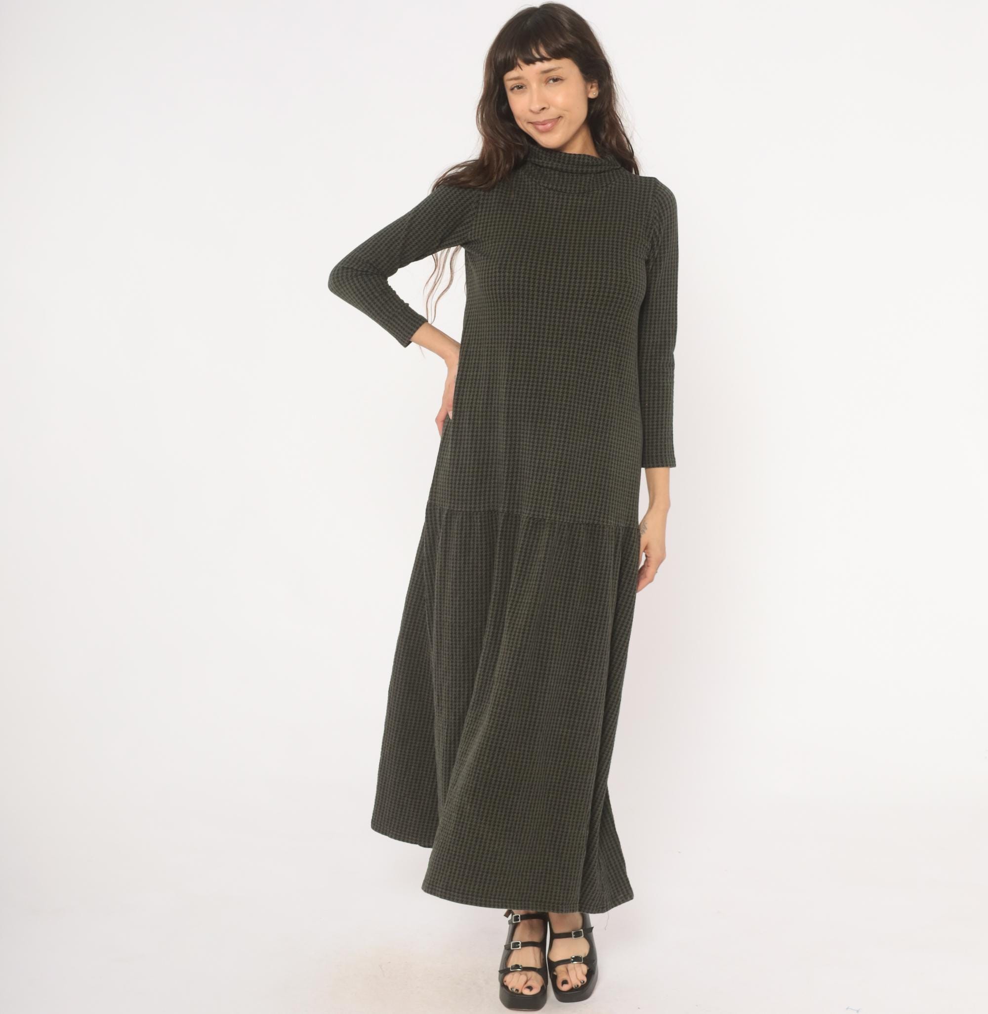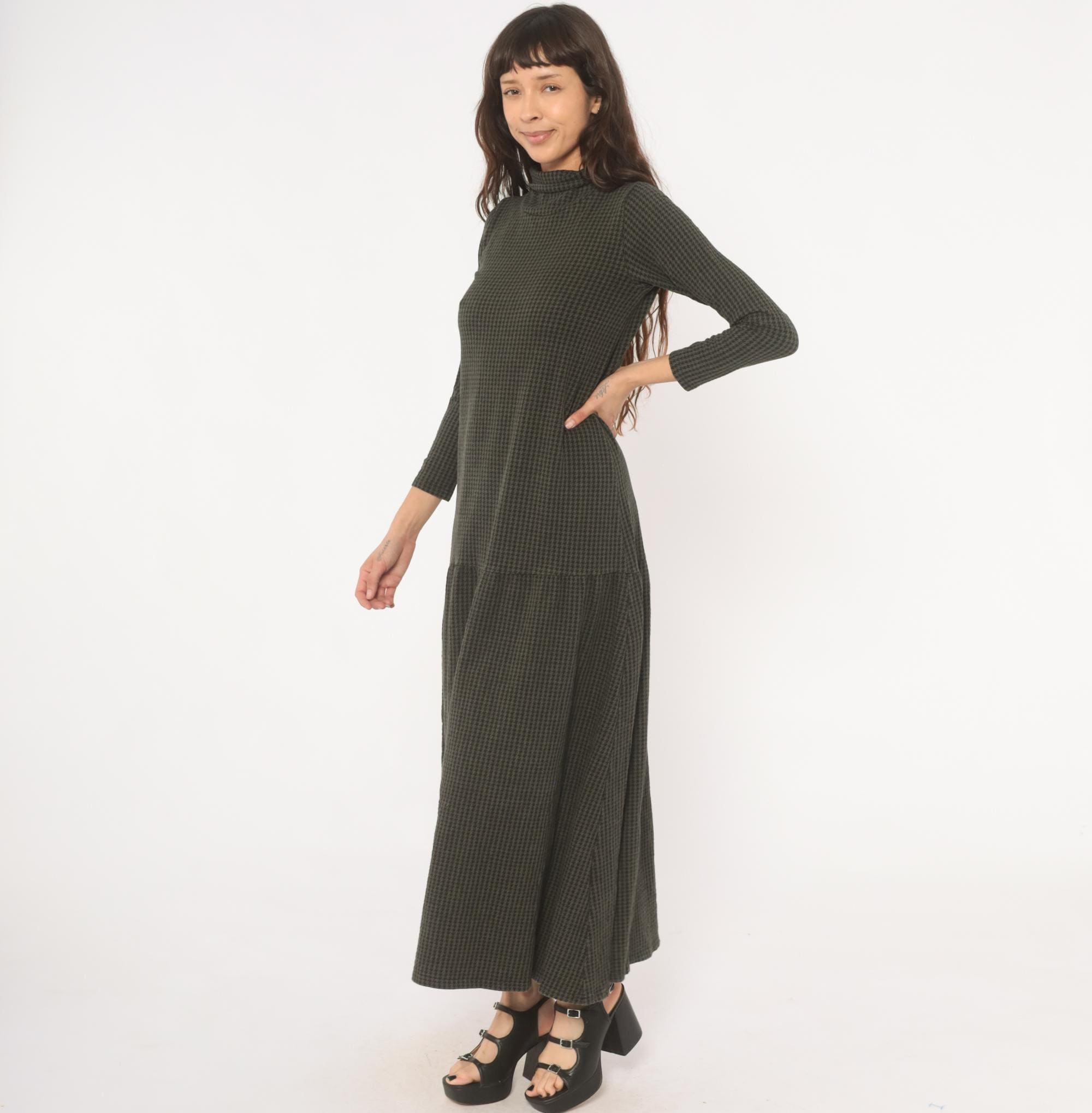 90s olive and black houndstooth maxi dress from JP with a funnel neckline and three-quarter length sleeves. Fitted bodice through the torso with a dropped waist seam and tiered A-line skirt falling to ankle length. Pullover construction with no closures or pockets, allover small-scale houndstooth check pattern in dark olive green and black.