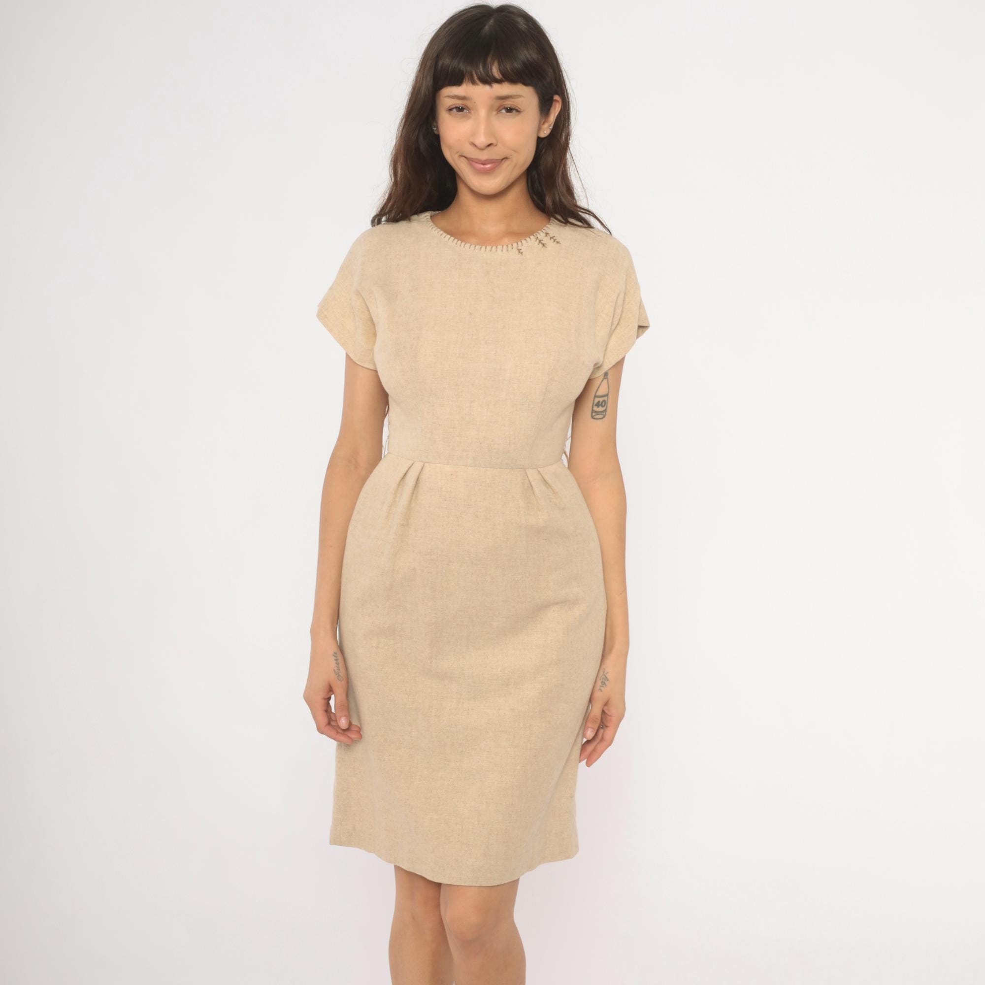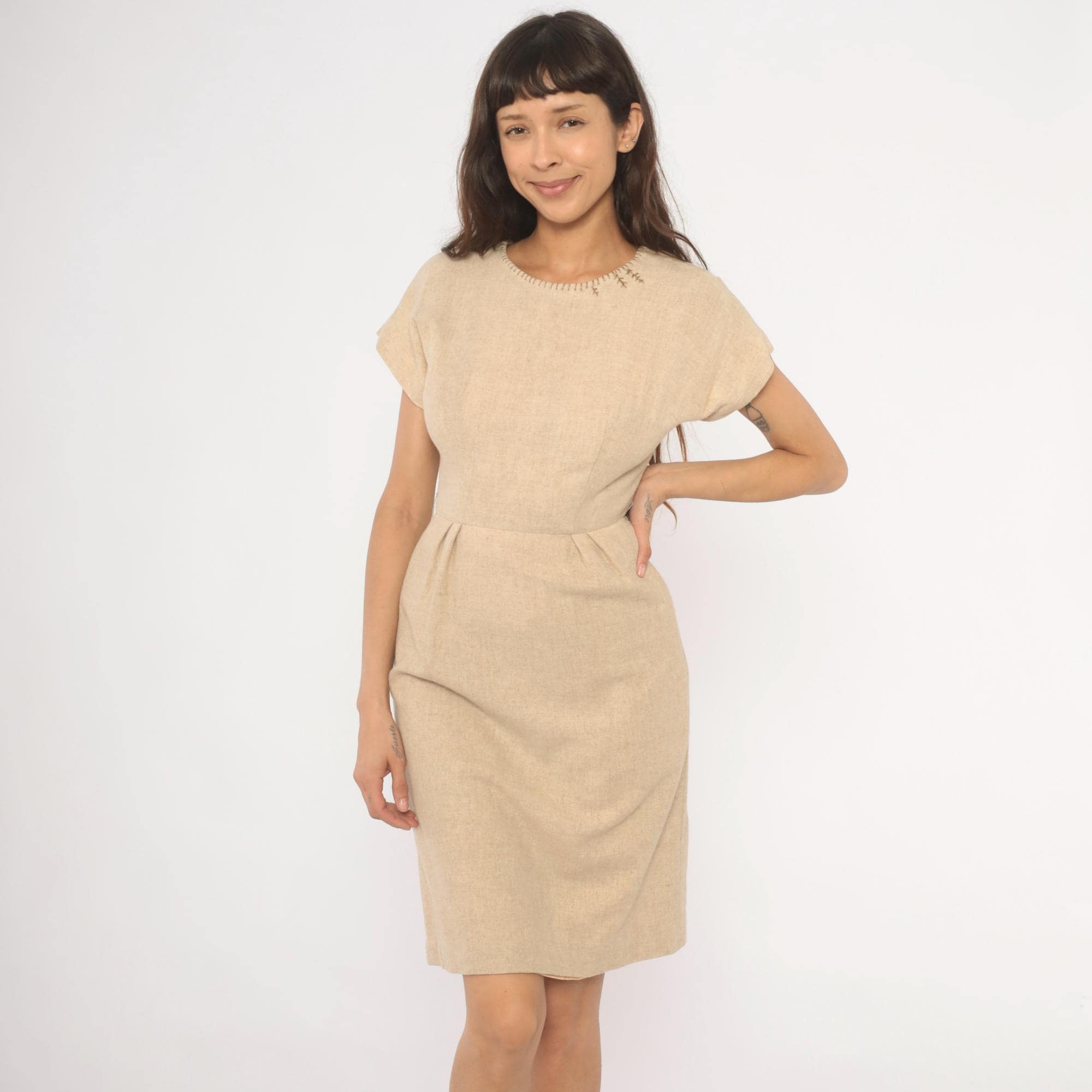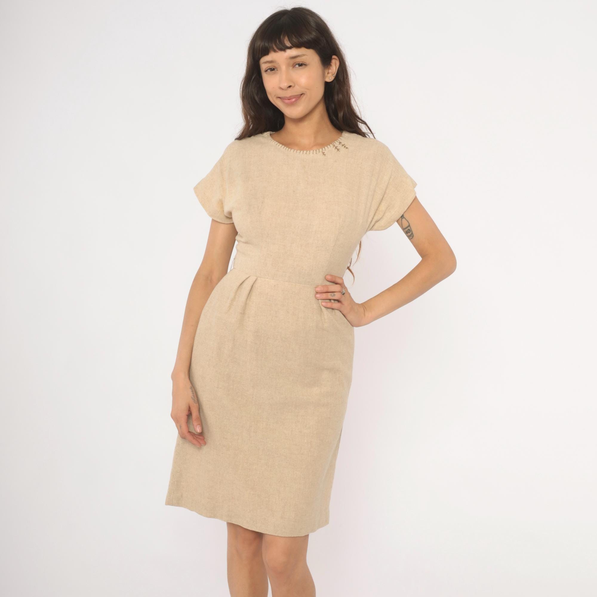 50s tan sheath dress with a fitted bodice, defined waist with front pleats, and a straight pencil skirt. Round neckline finished with decorative whipstitch embroidery and small cross-stitch accents near the left shoulder. Cap sleeves with rolled cuffs, back zipper closure, and a center back kick pleat at the hem.