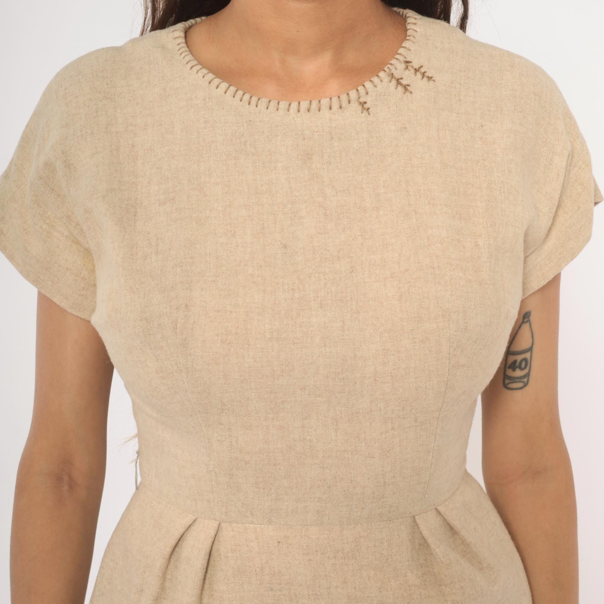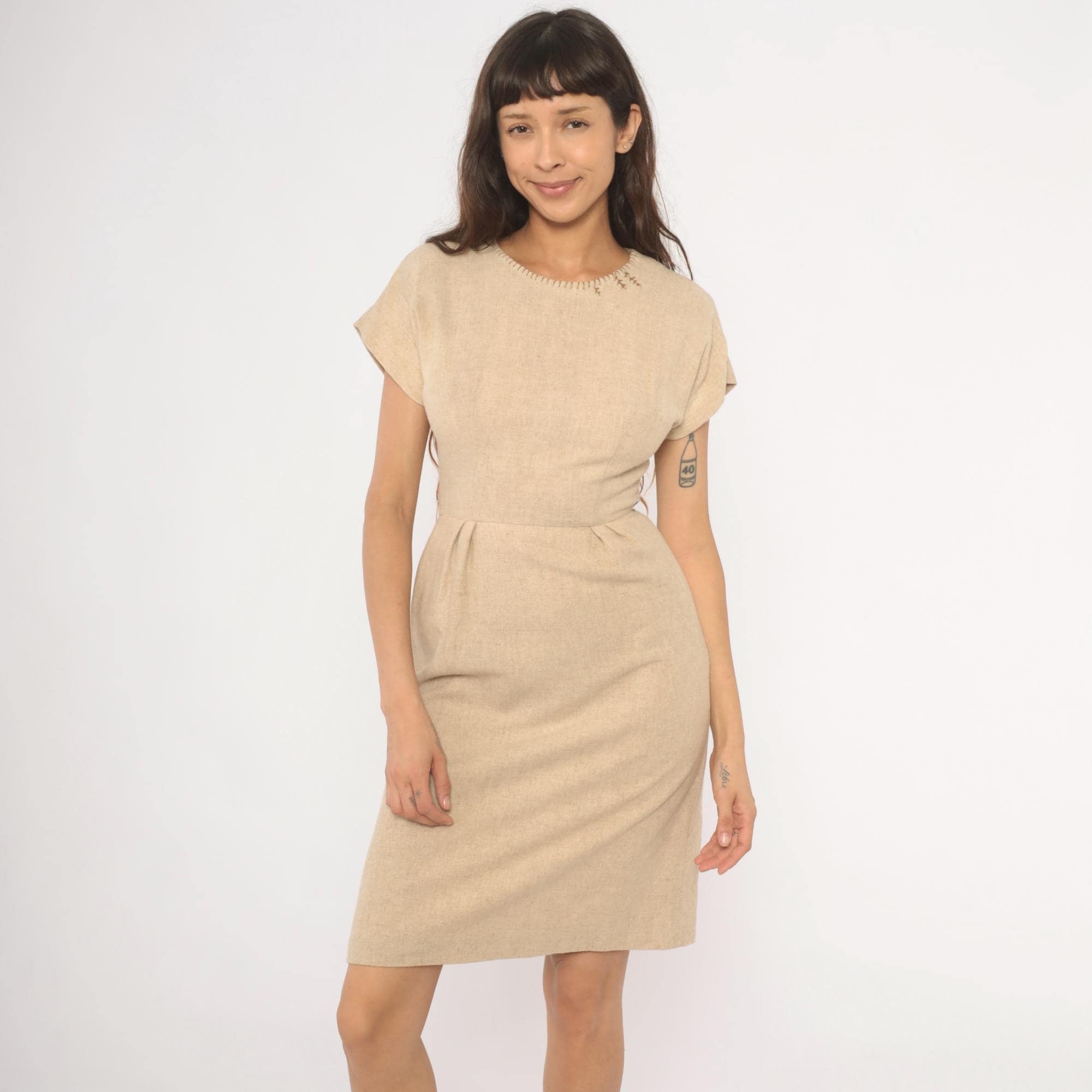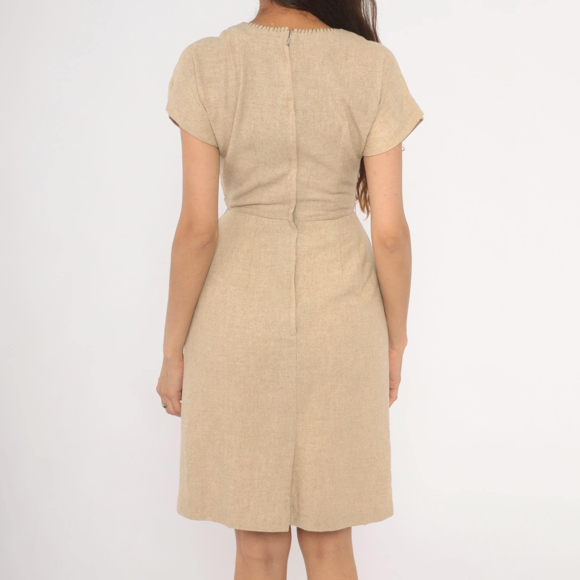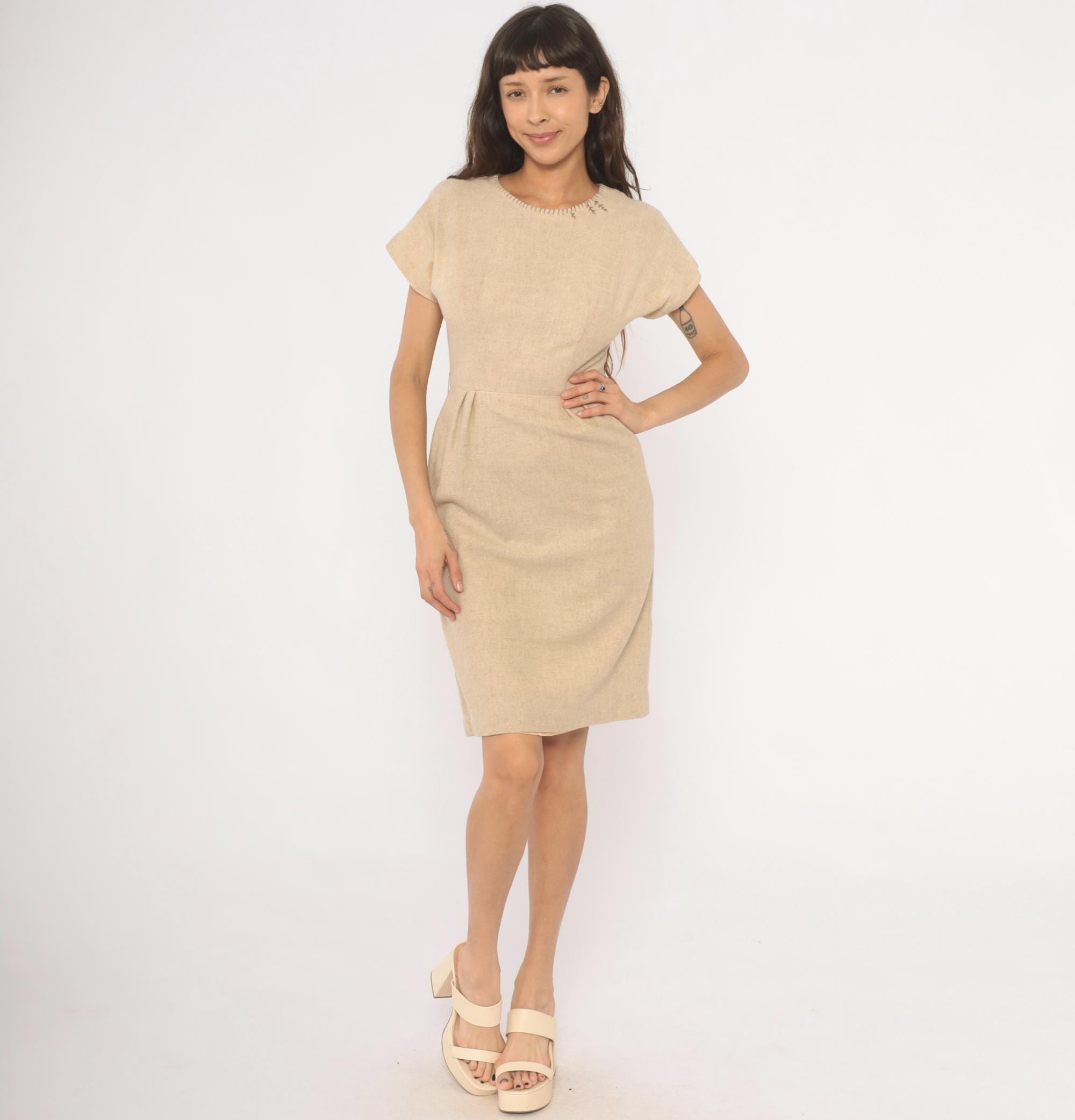 50s tan sheath dress with a fitted bodice, defined waist with front pleats, and a straight pencil skirt. Round neckline finished with decorative whipstitch embroidery and small cross-stitch accents near the left shoulder. Cap sleeves with rolled cuffs, back zipper closure, and a center back kick pleat at the hem.