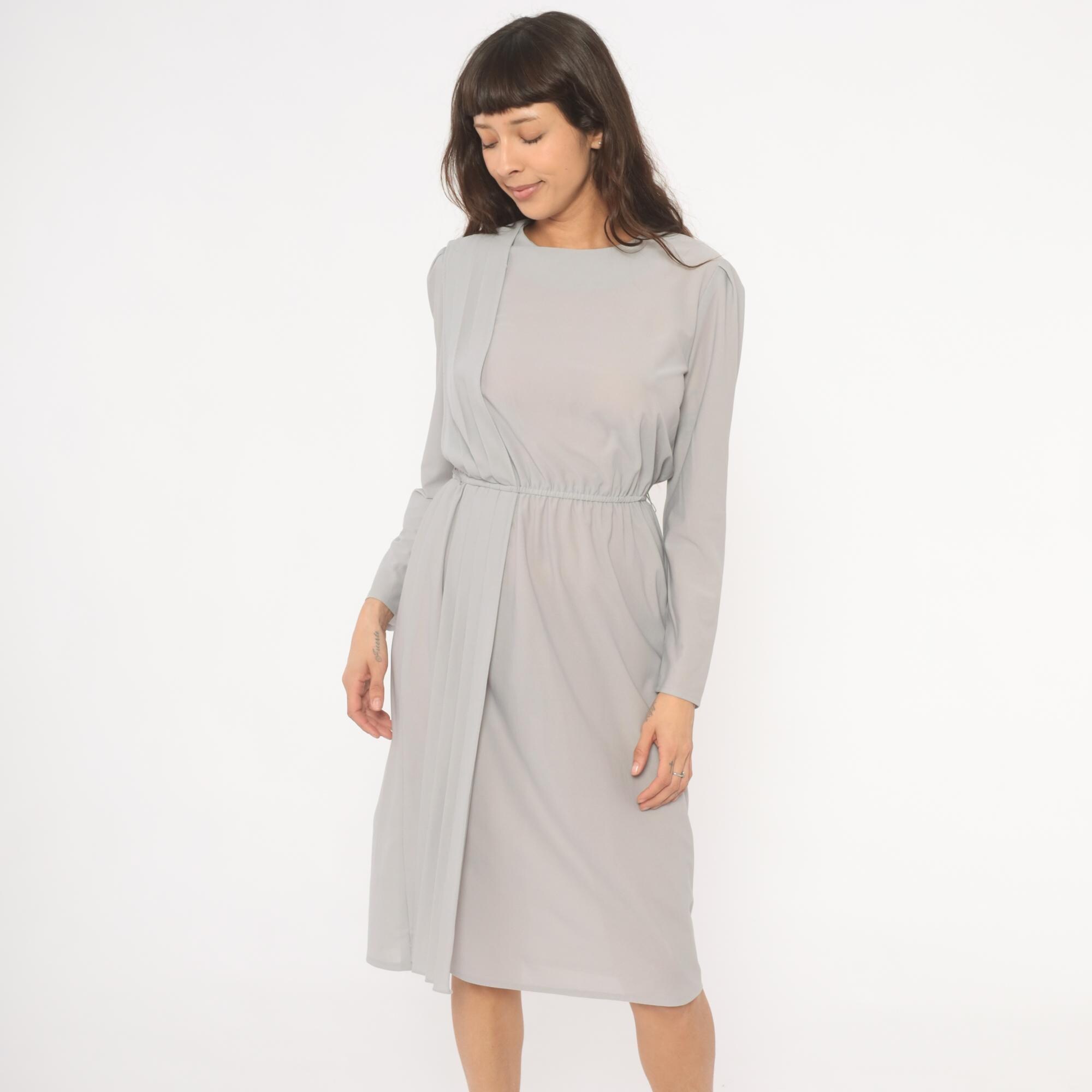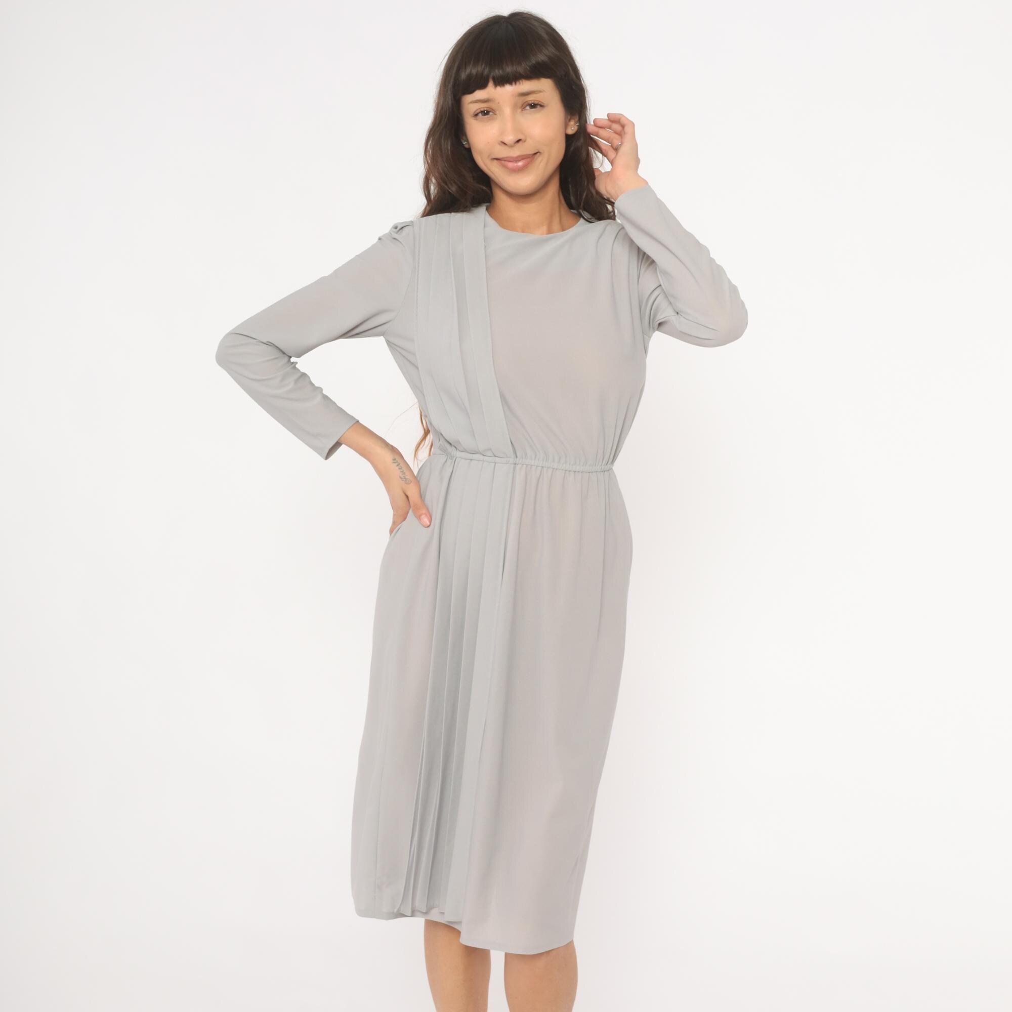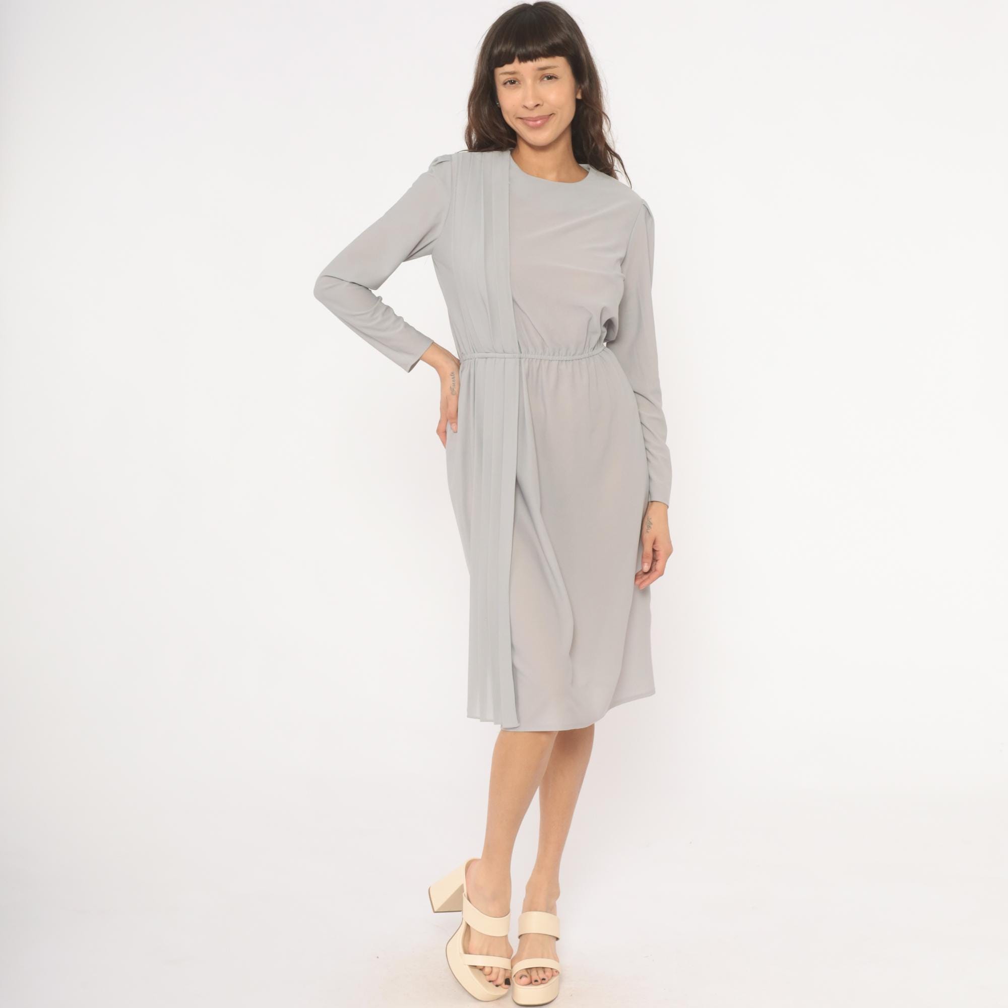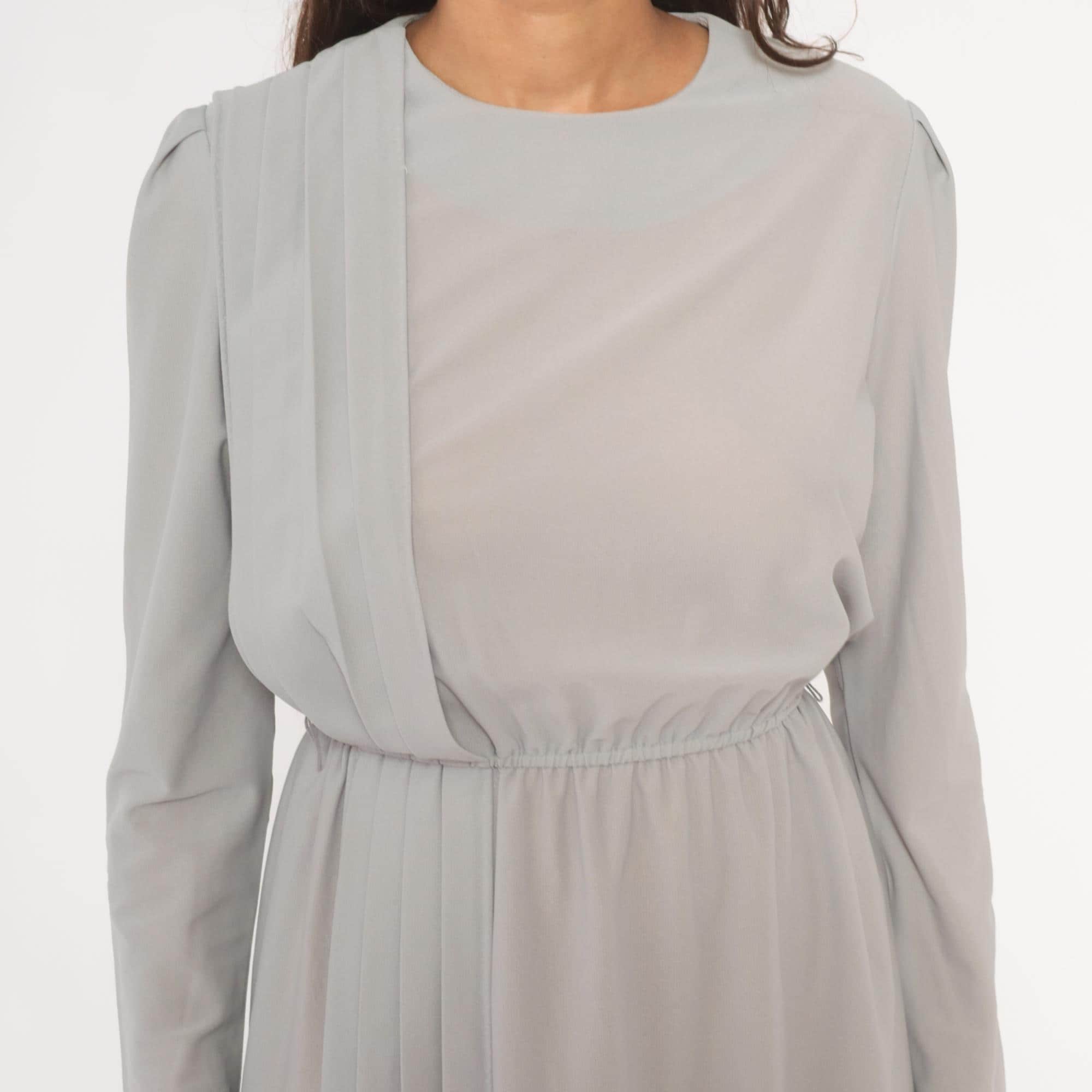 80s grey dress with vertical pleated panel running from the right shoulder down through the skirt, and structured shoulder seams with slight padding. Round neckline, long sleeves with narrow cuffs, and an elasticized gathered waist. Back closure with a row of pearl-style buttons from neckline to waist. Semi-sheer ash-colored fabric throughout.