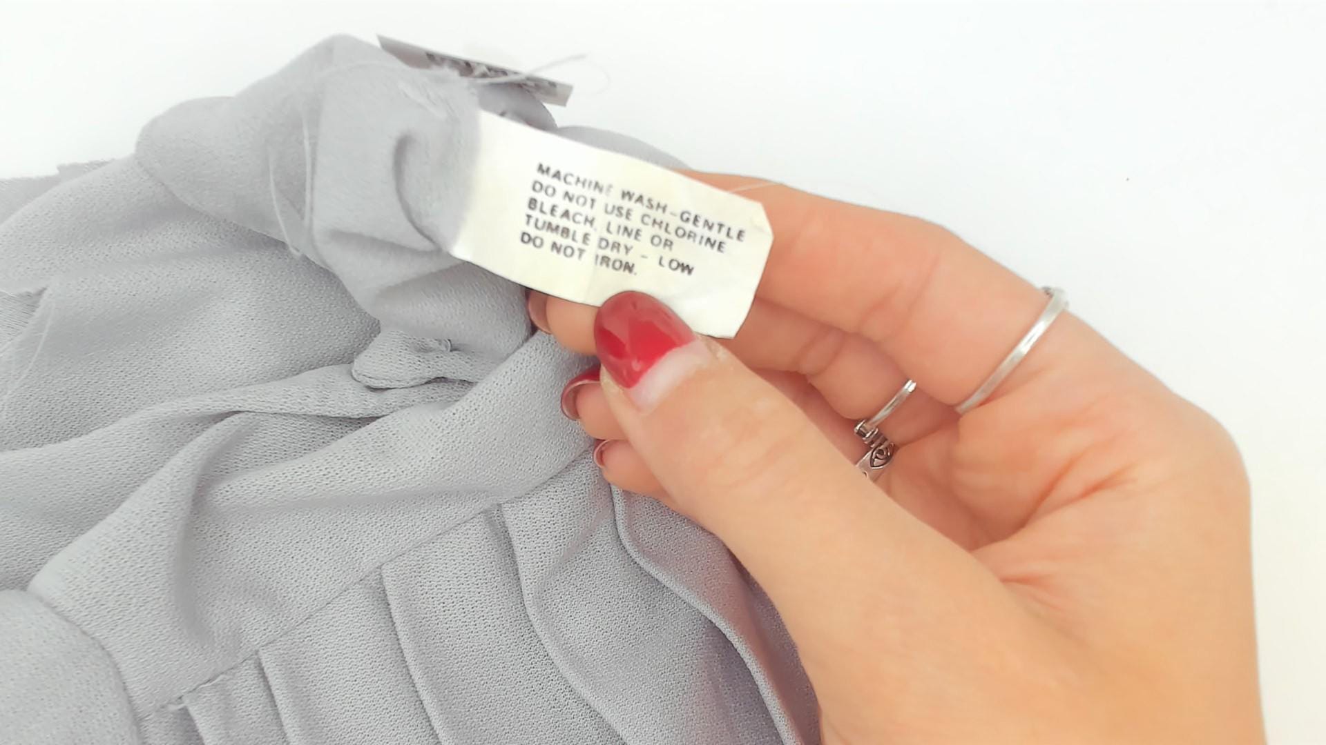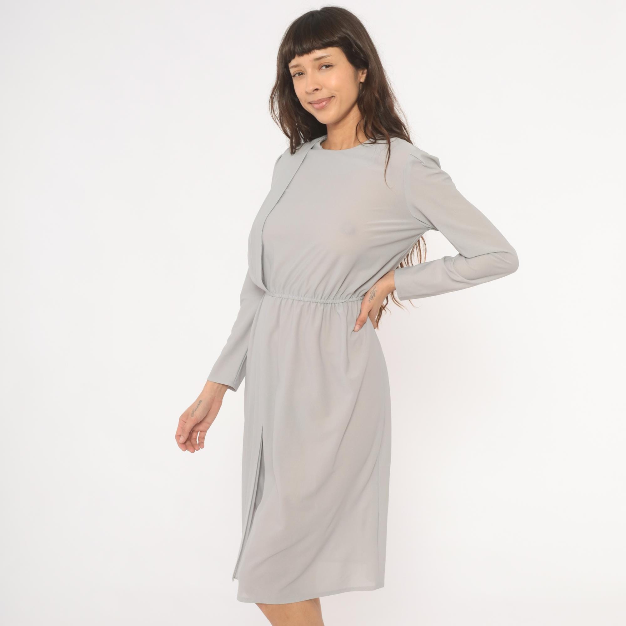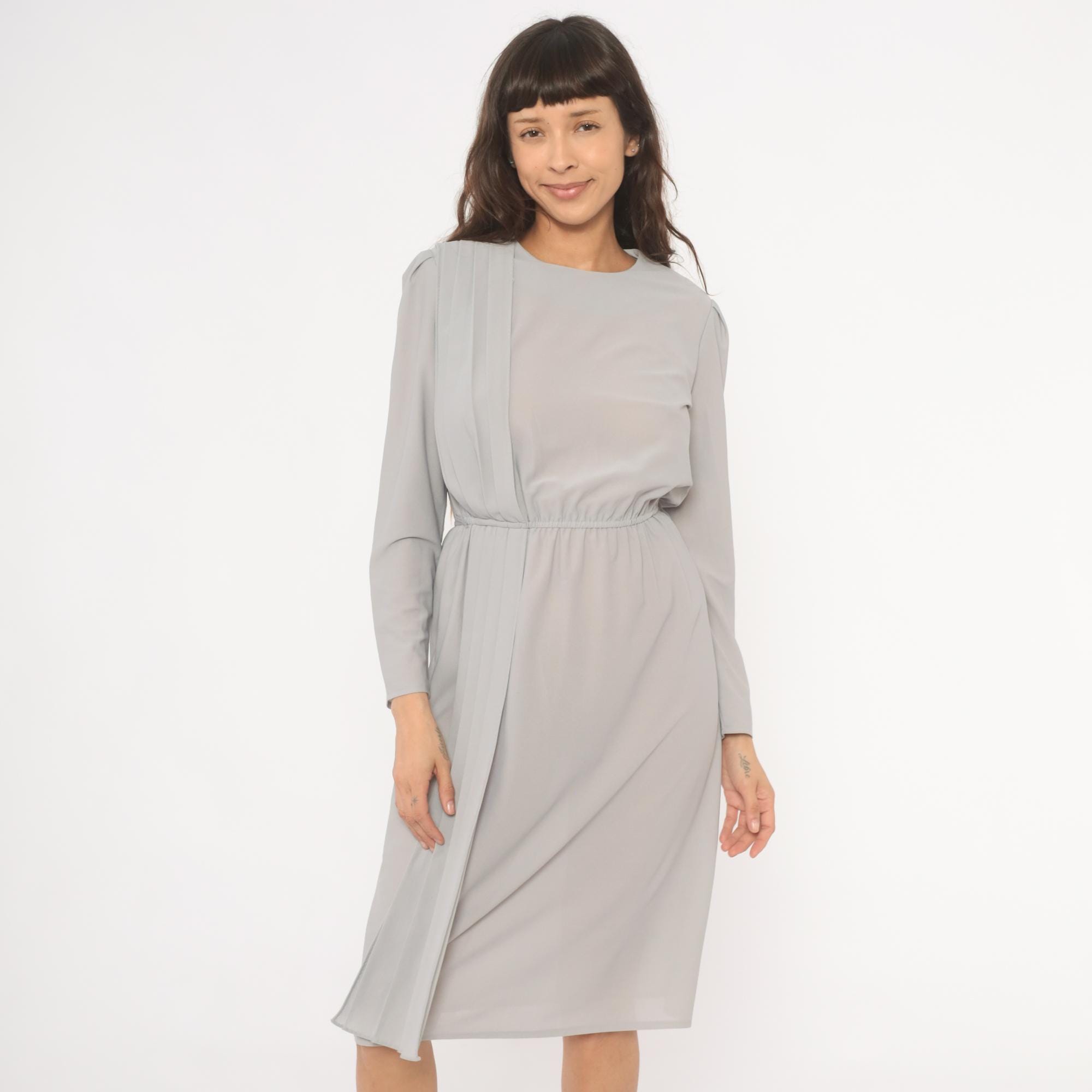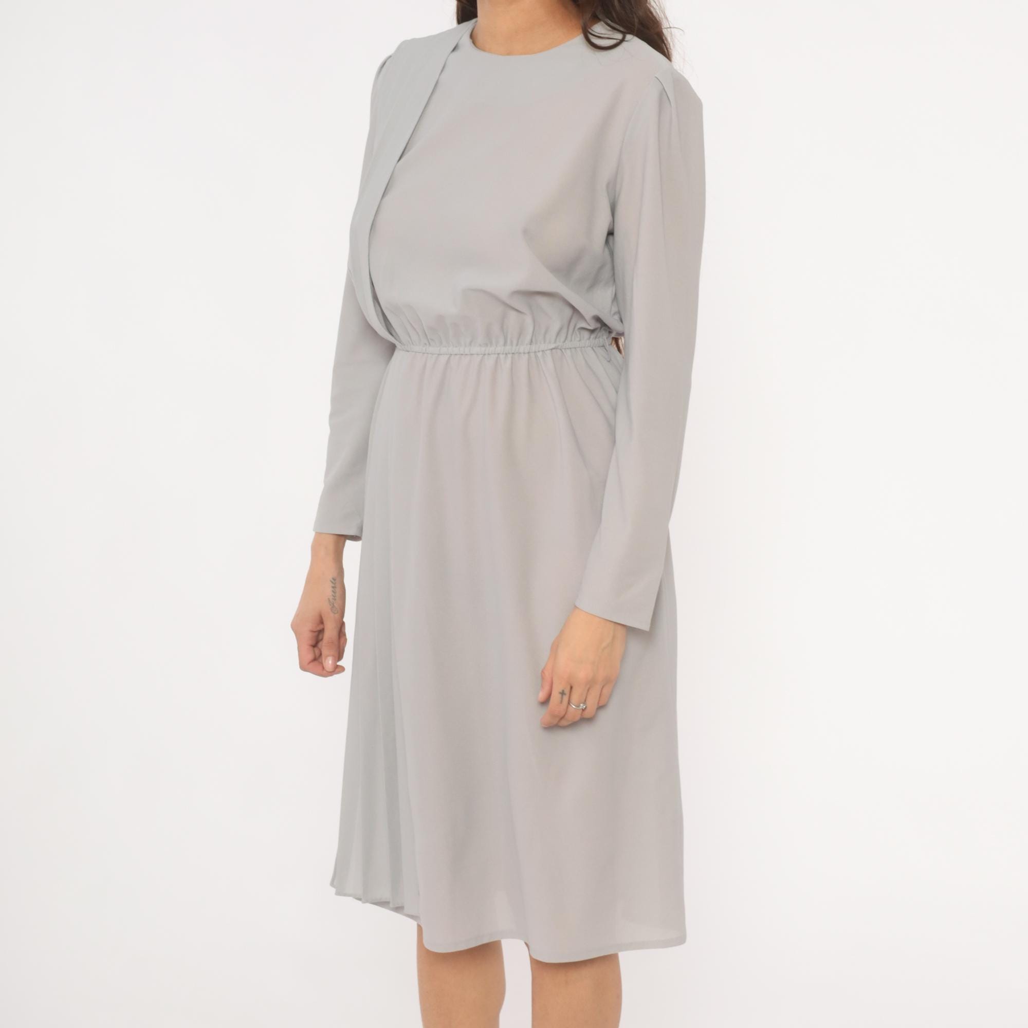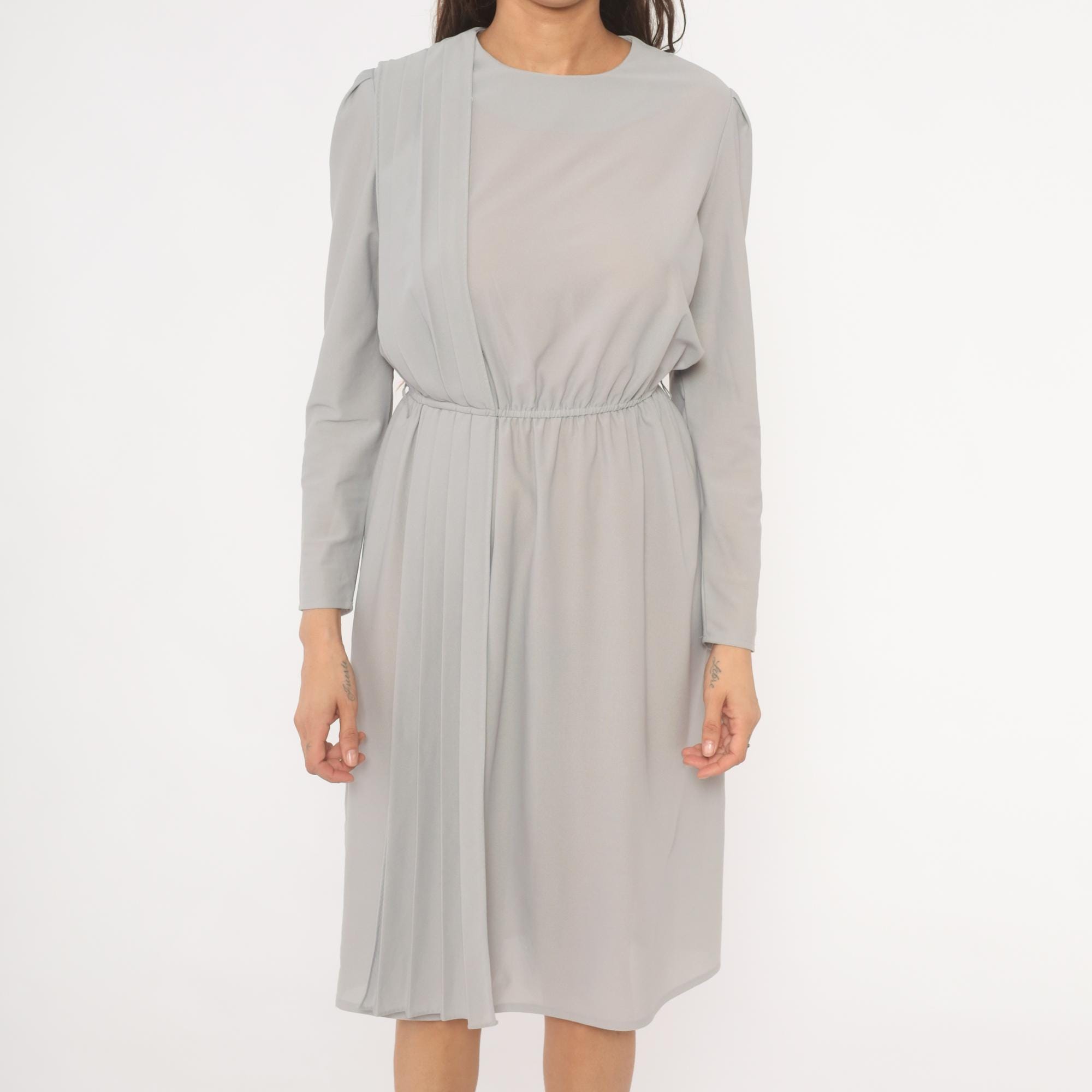 80s grey dress with vertical pleated panel running from the right shoulder down through the skirt, and structured shoulder seams with slight padding. Round neckline, long sleeves with narrow cuffs, and an elasticized gathered waist. Back closure with a row of pearl-style buttons from neckline to waist. Semi-sheer ash-colored fabric throughout.
