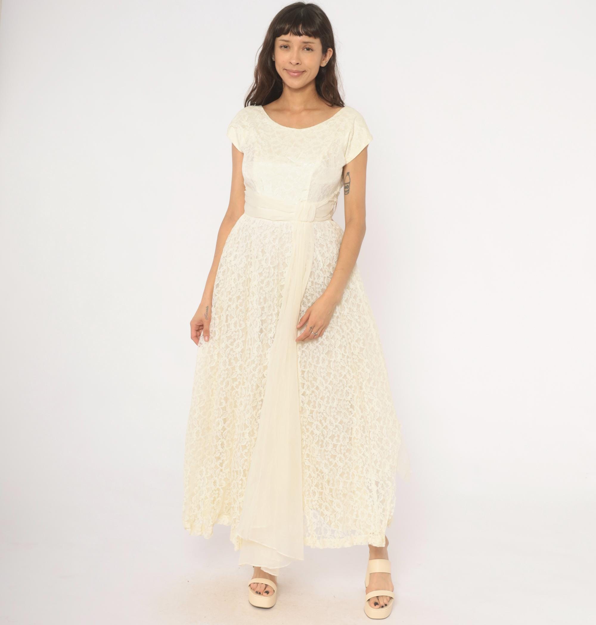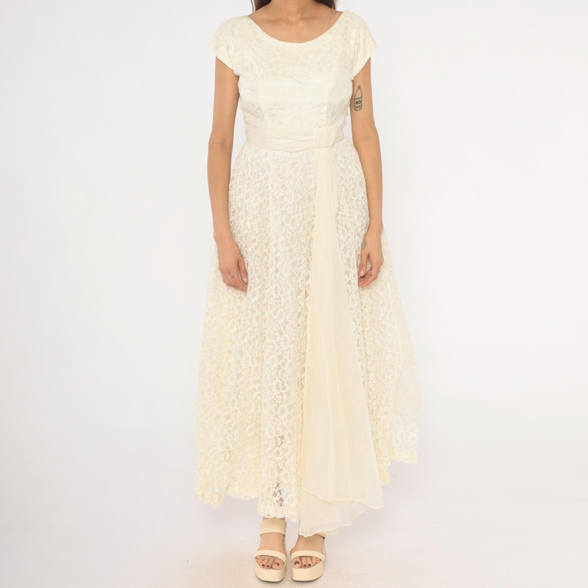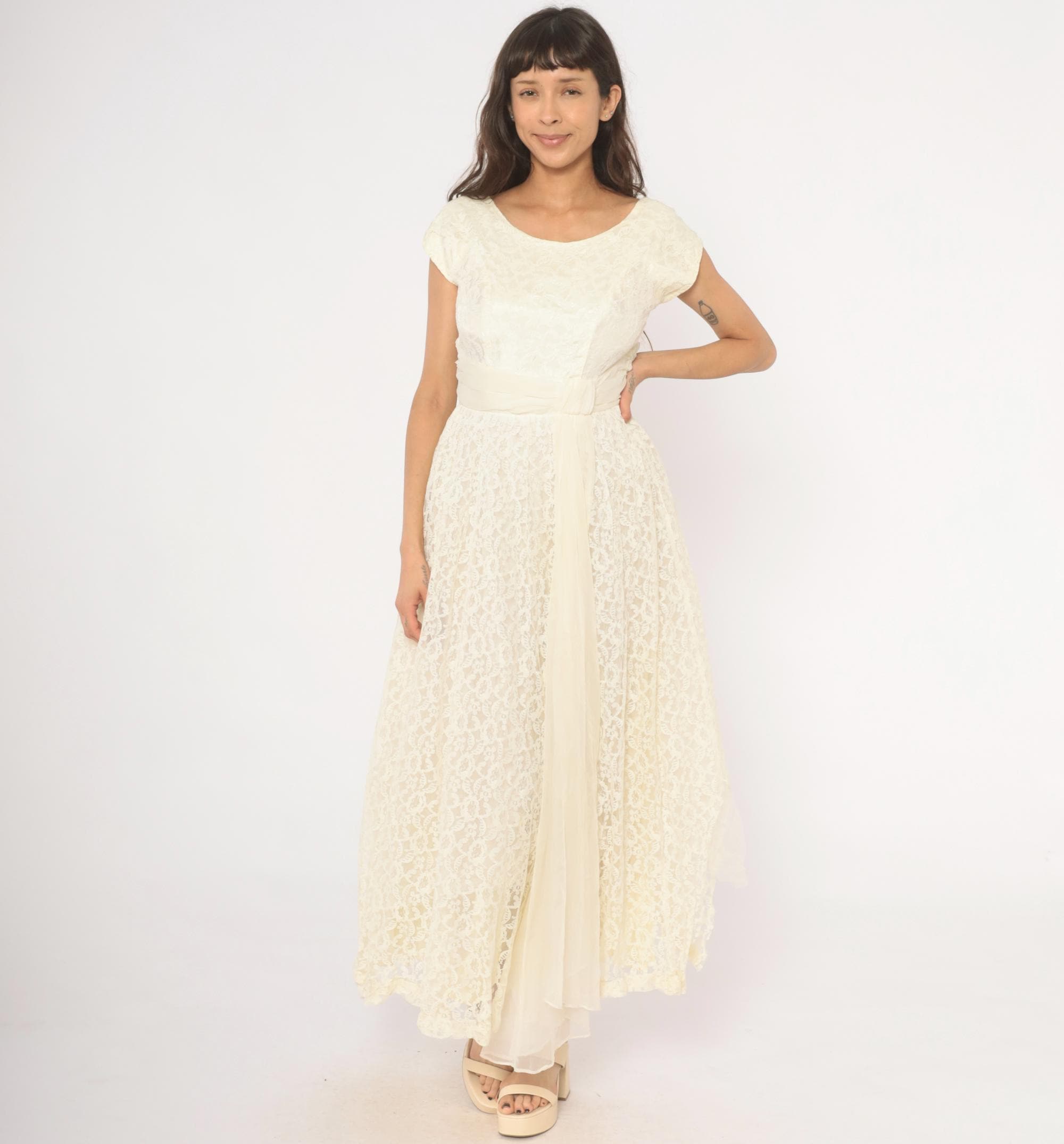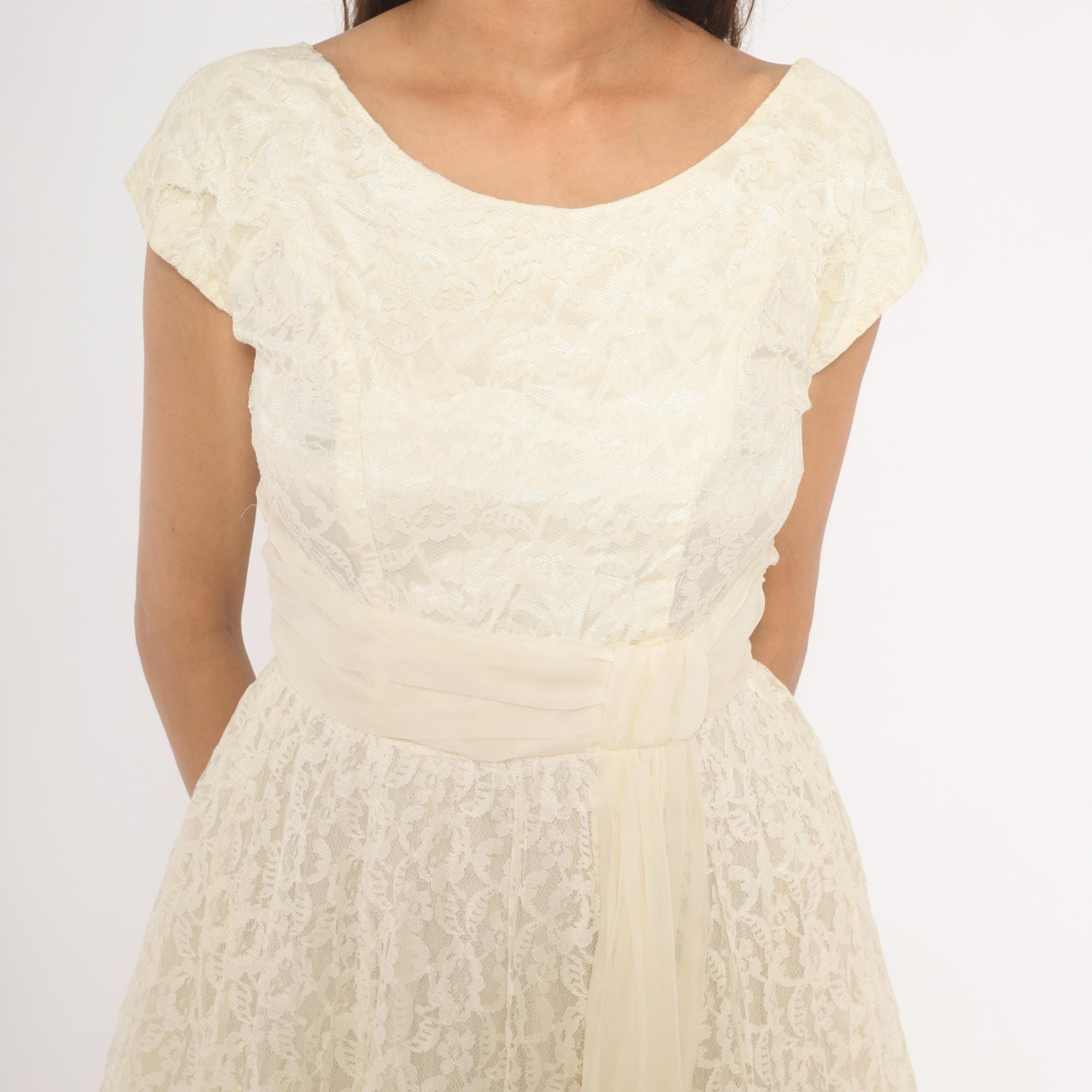 60s ivory lace gown with an all-over floral lace overlay and a cream satin cummerbund-style sash at the waist. Scoop neckline in front with a V-back, cap sleeves, and a back zipper with hook and eye closure. Full A-line skirt with a center front chiffon panel peeking through the lace layer, ankle length hem with scalloped lace edging.