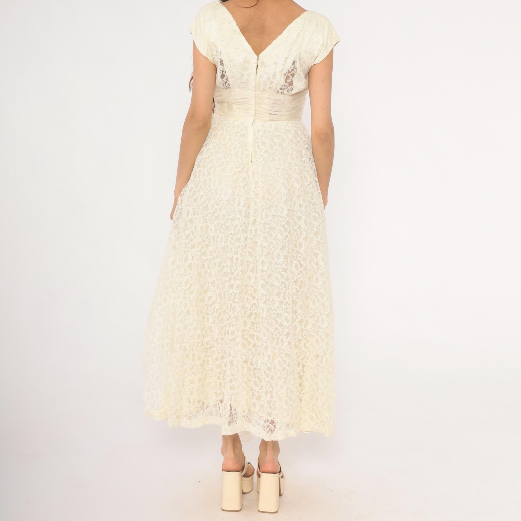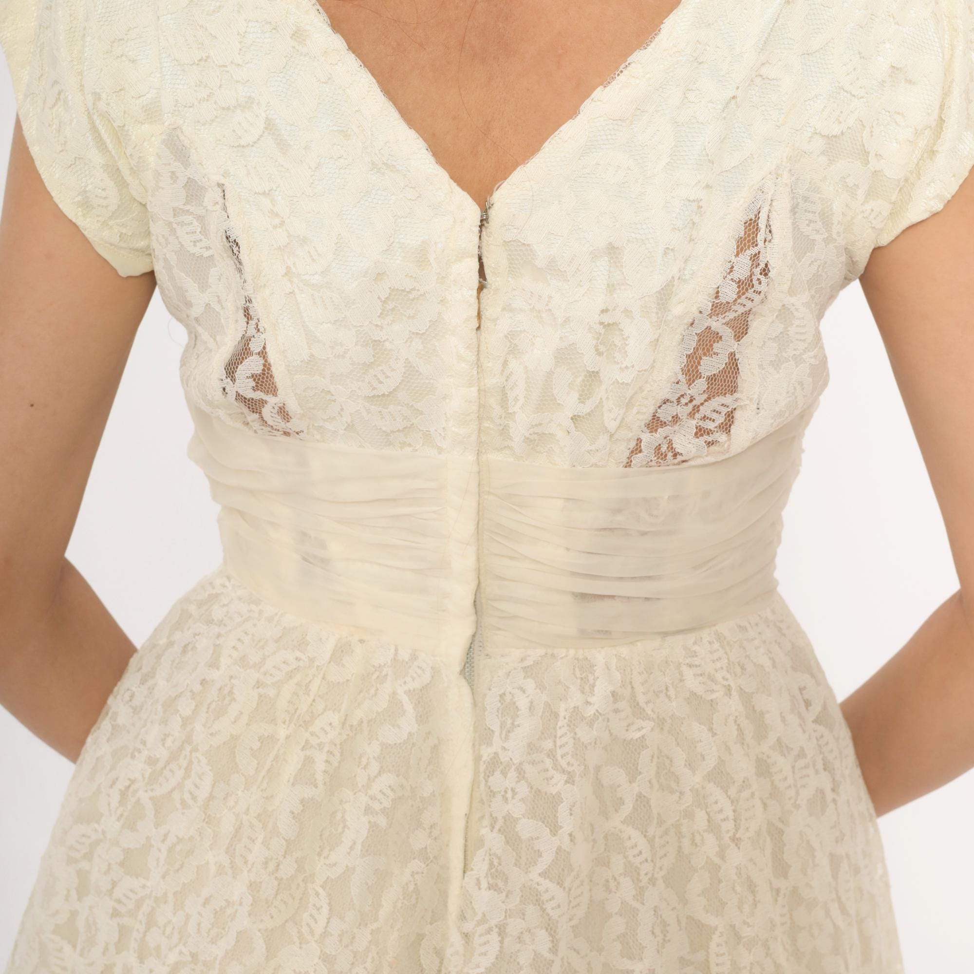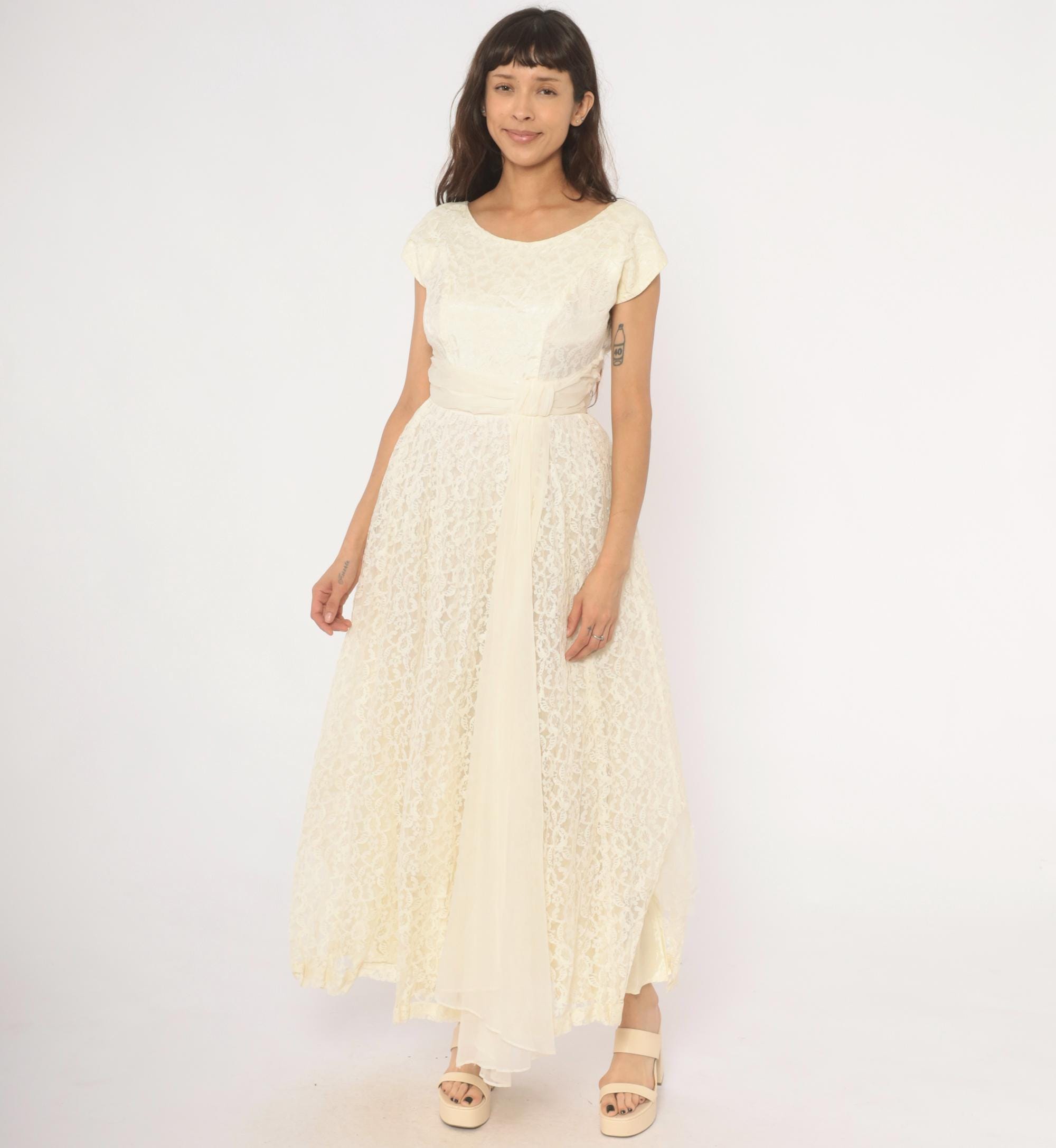60s ivory lace gown with an all-over floral lace overlay and a cream satin cummerbund-style sash at the waist. Scoop neckline in front with a V-back, cap sleeves, and a back zipper with hook and eye closure. Full A-line skirt with a center front chiffon panel peeking through the lace layer, ankle length hem with scalloped lace edging.