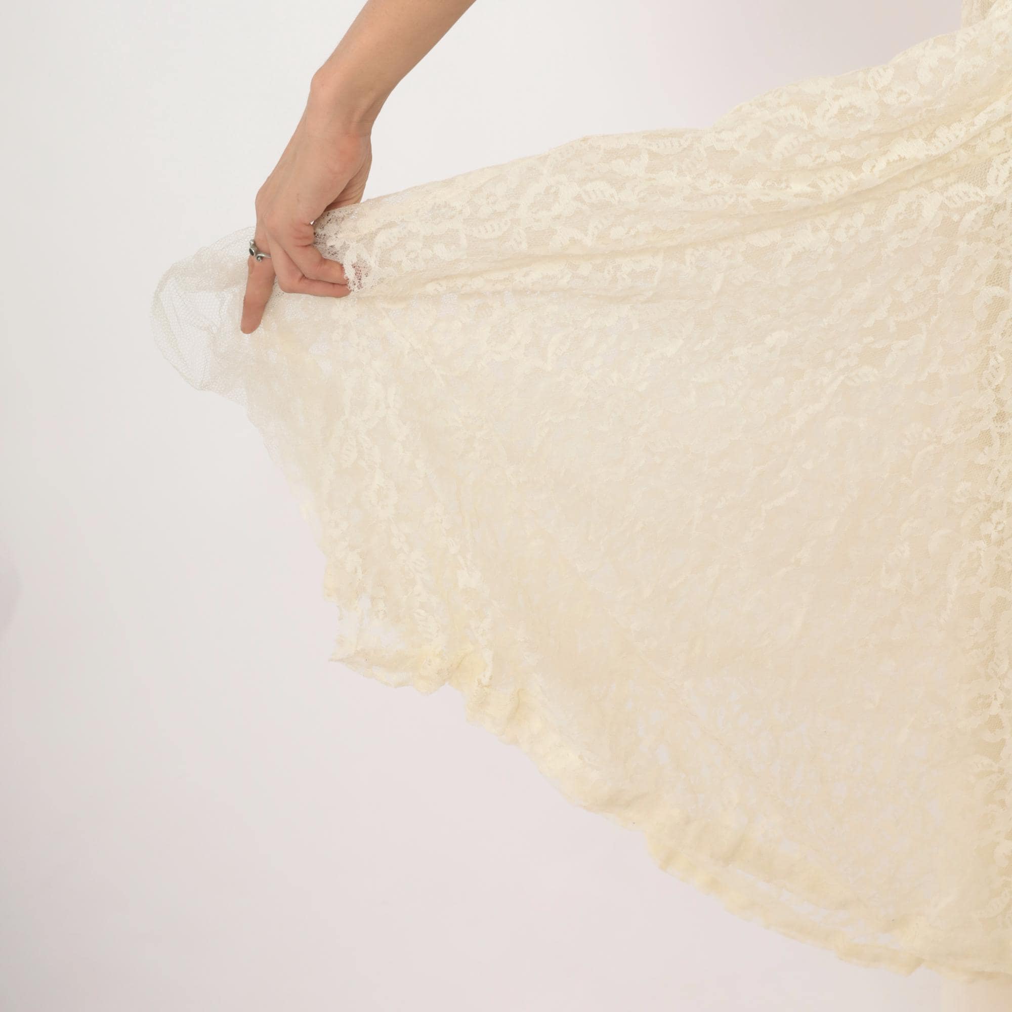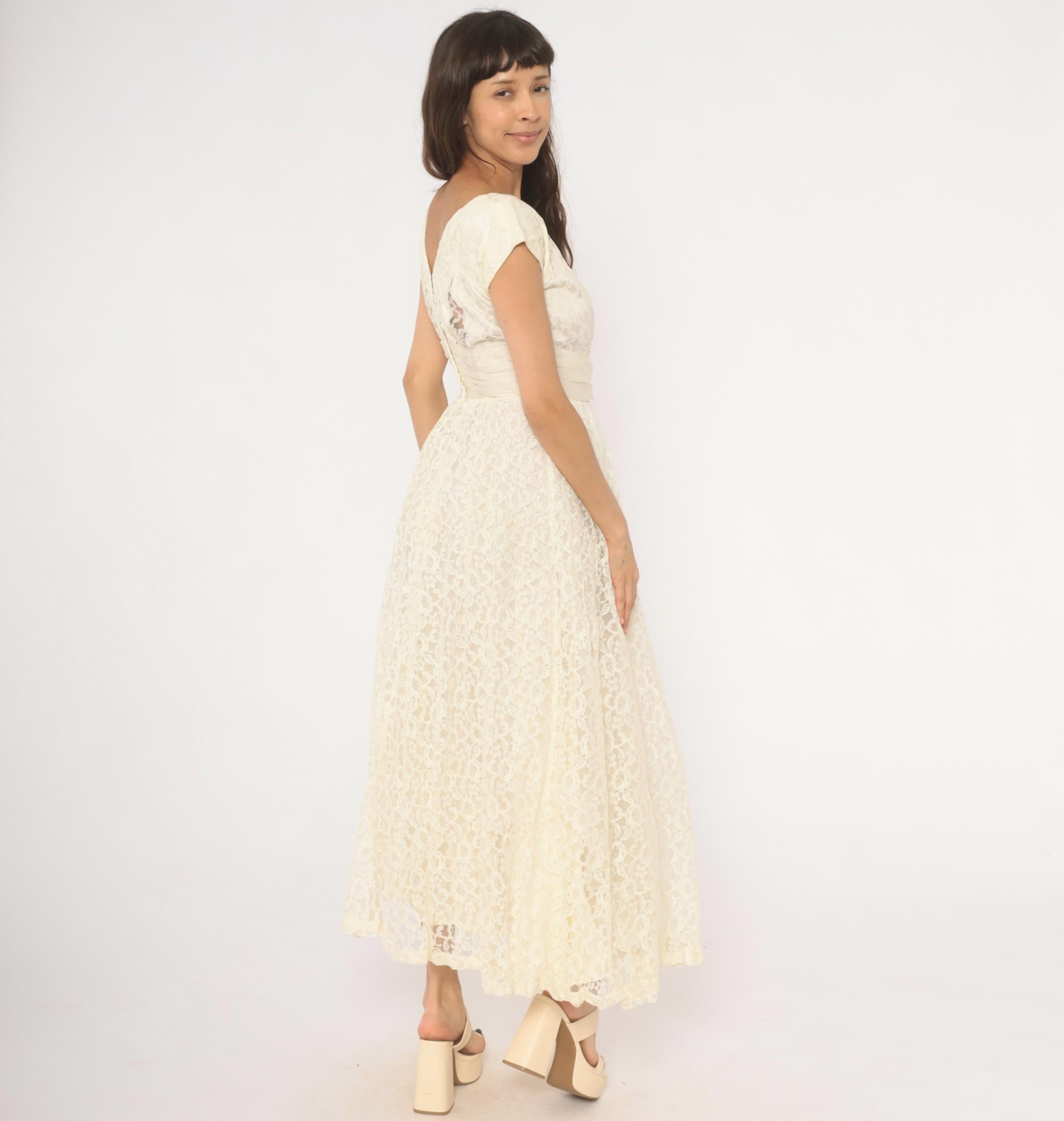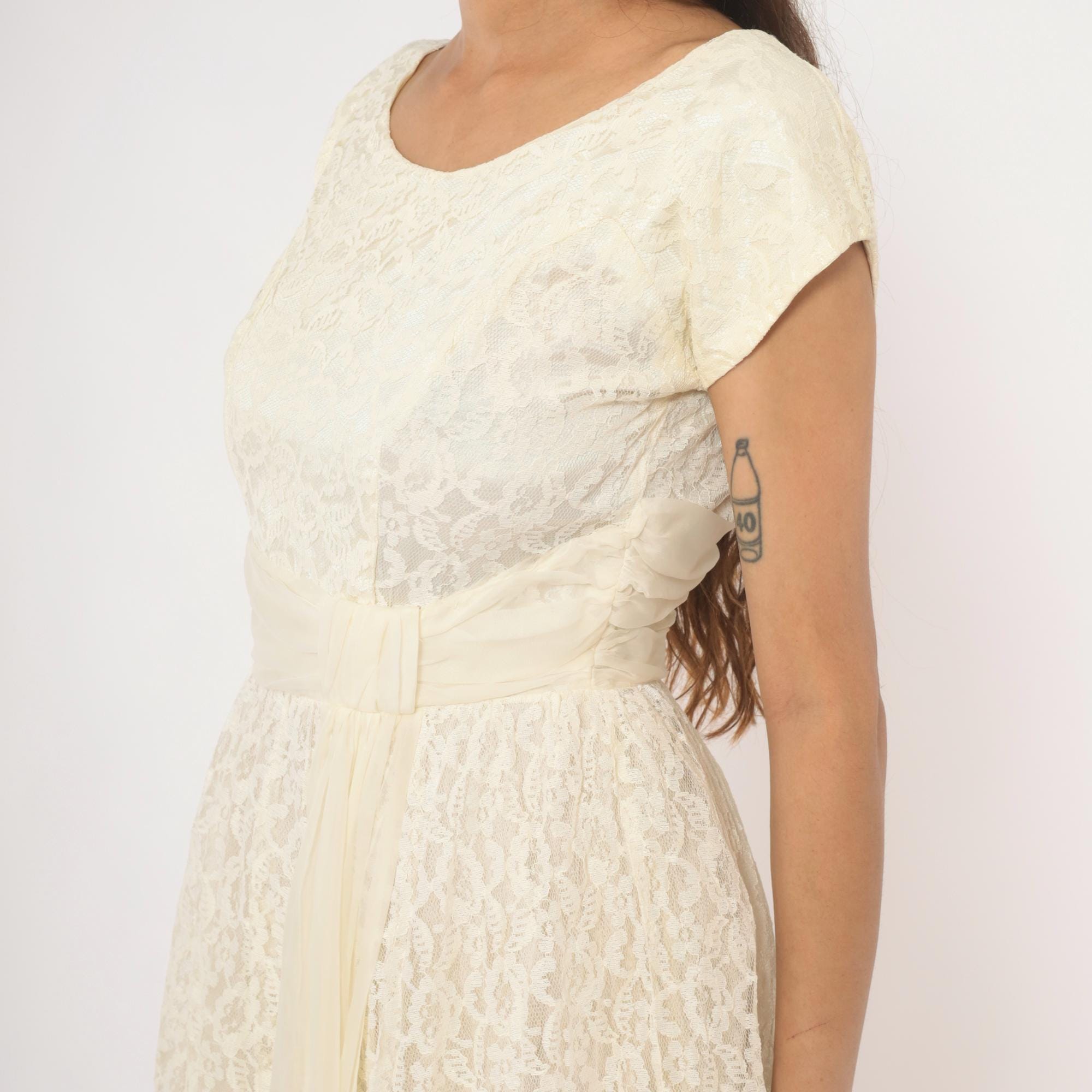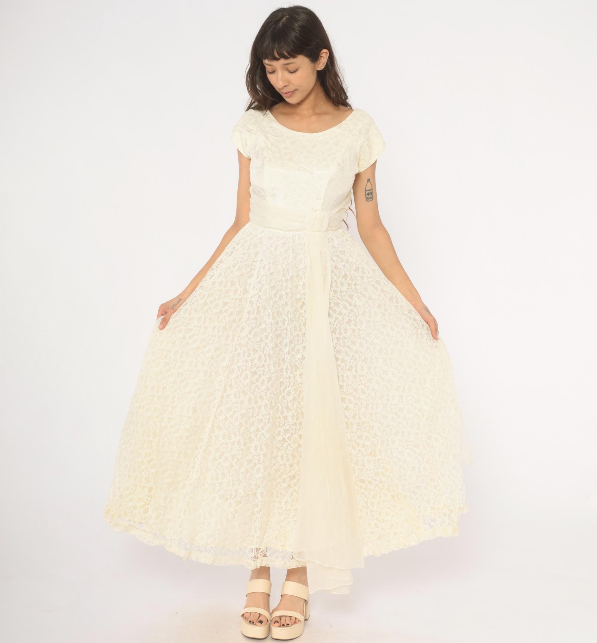 60s ivory lace gown with an all-over floral lace overlay and a cream satin cummerbund-style sash at the waist. Scoop neckline in front with a V-back, cap sleeves, and a back zipper with hook and eye closure. Full A-line skirt with a center front chiffon panel peeking through the lace layer, ankle length hem with scalloped lace edging.
