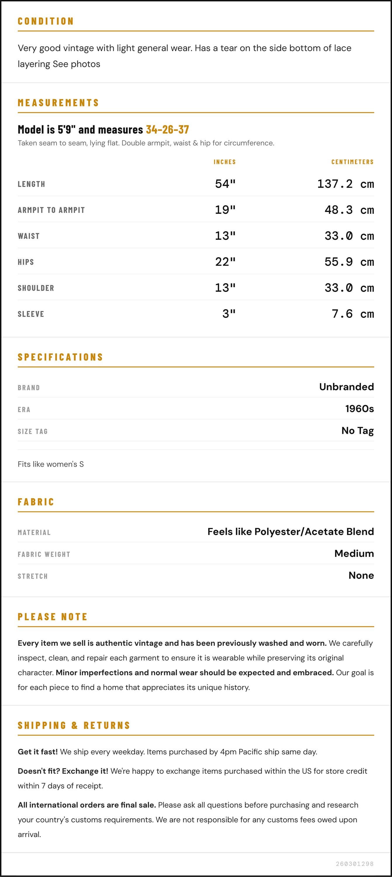 Condition: Very good vintage with light general wear. Has a tear on the side bottom of lace layering See photos