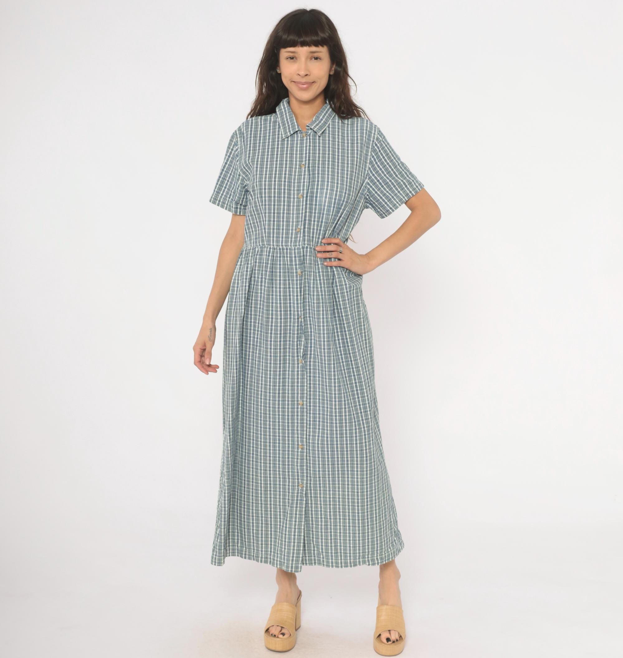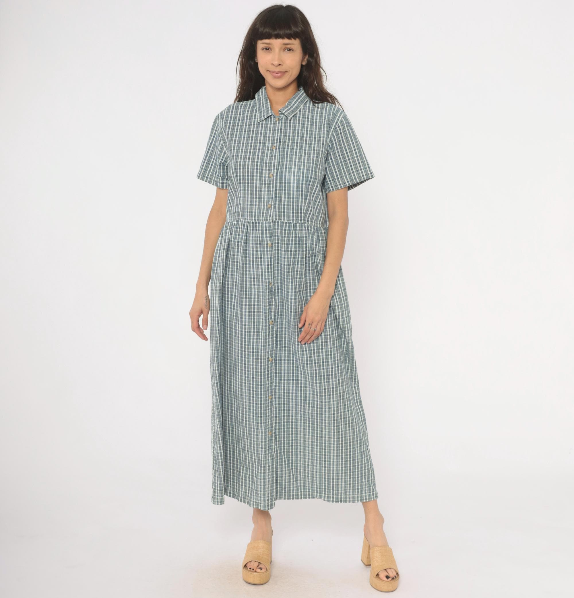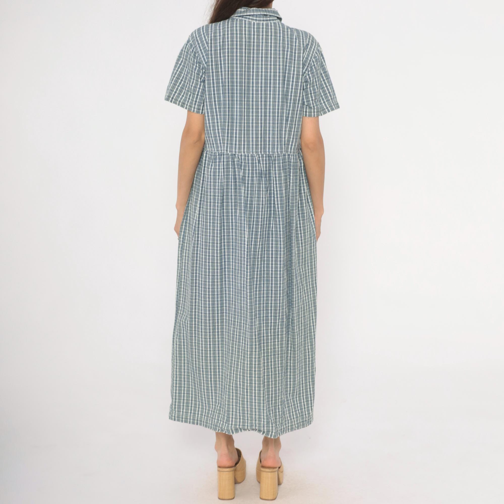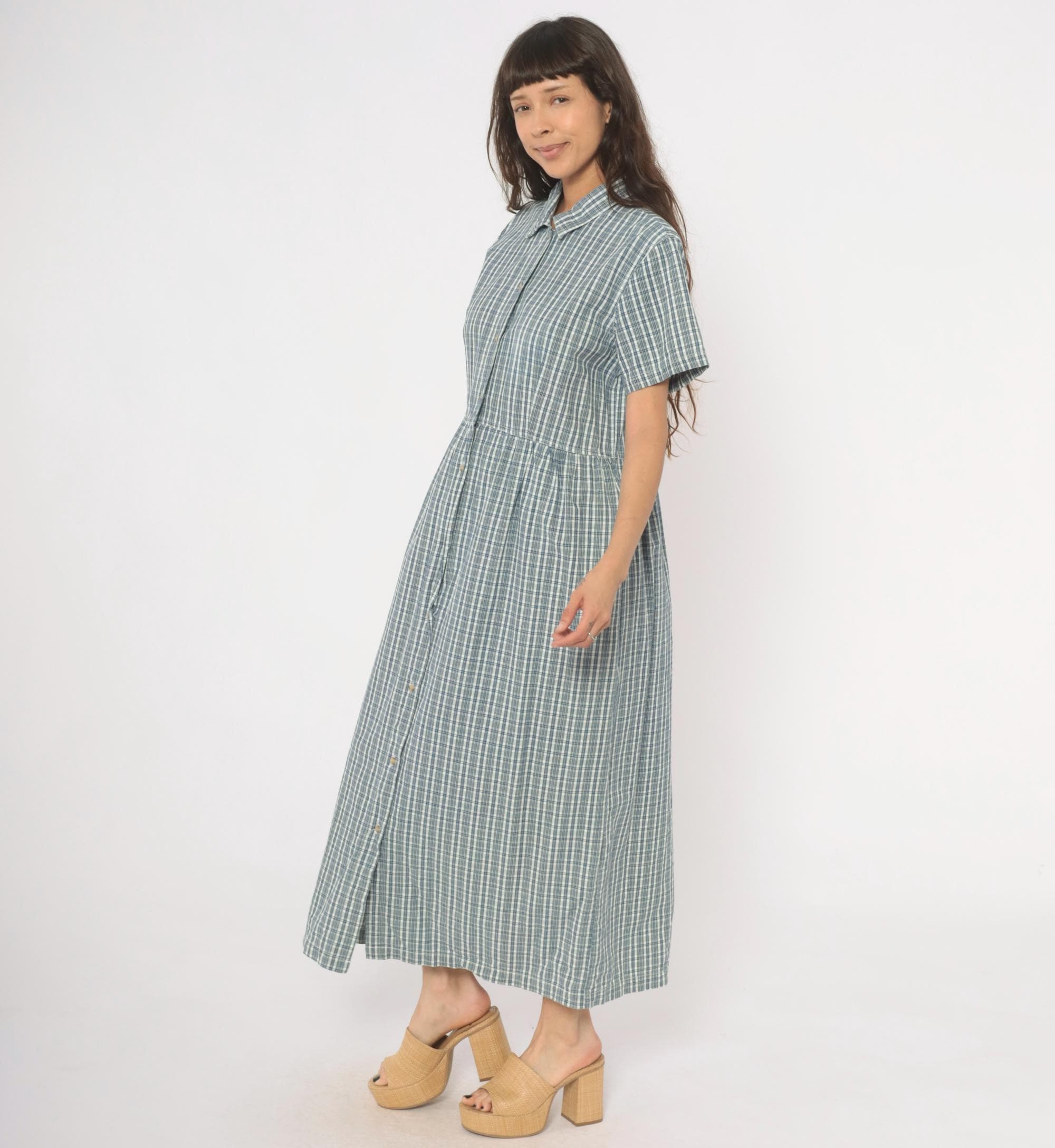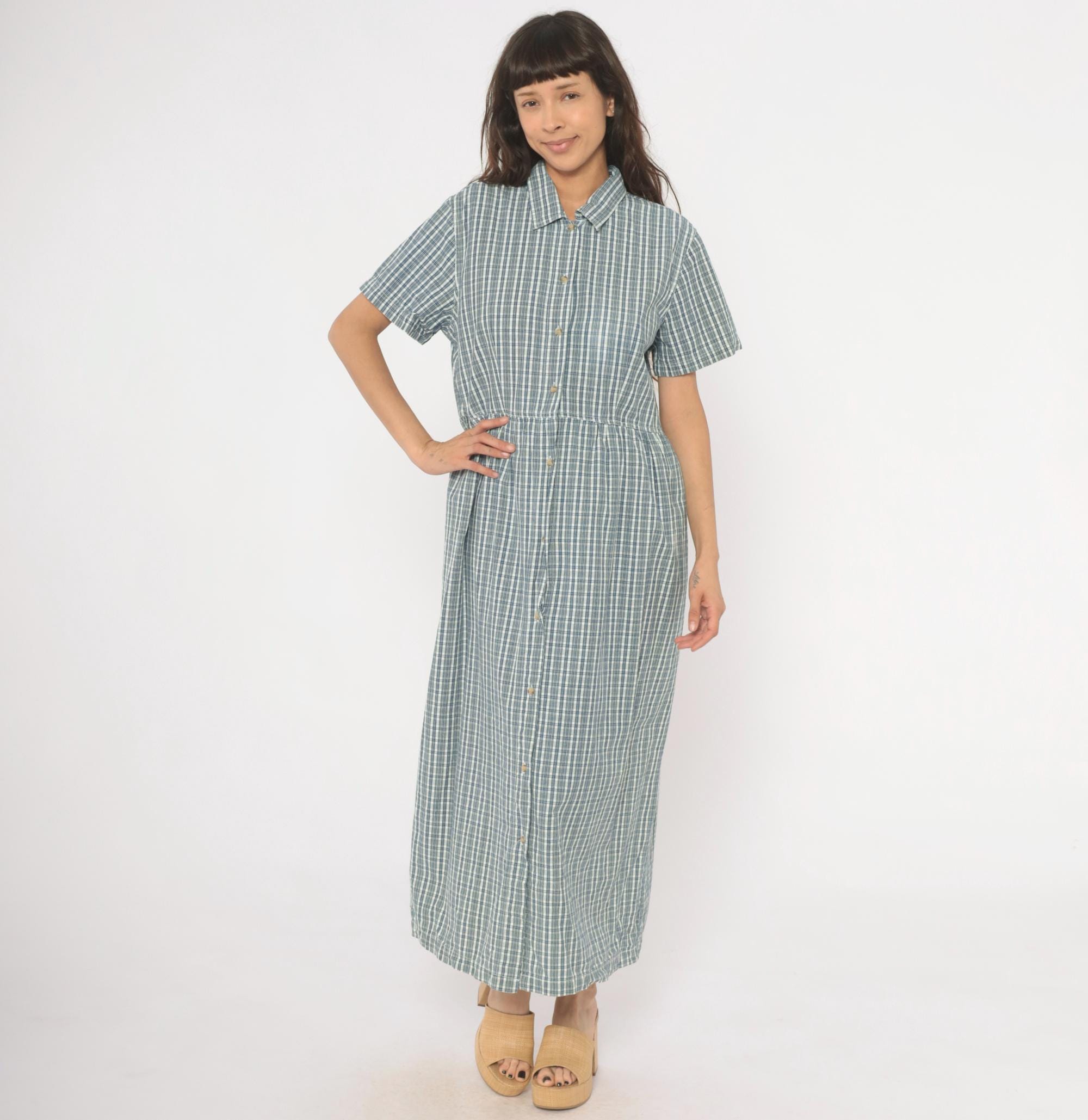 90s blue and white plaid maxi shirtdress from Studio Works with a pointed collar and full button front closure from neckline to hem. Short sleeves, fitted bodice with gathered waist, and a long A-line skirt falling to ankle length. Small tonal buttons run the entire length of the dress, and the check pattern mixes slate blue, navy, and white lines.