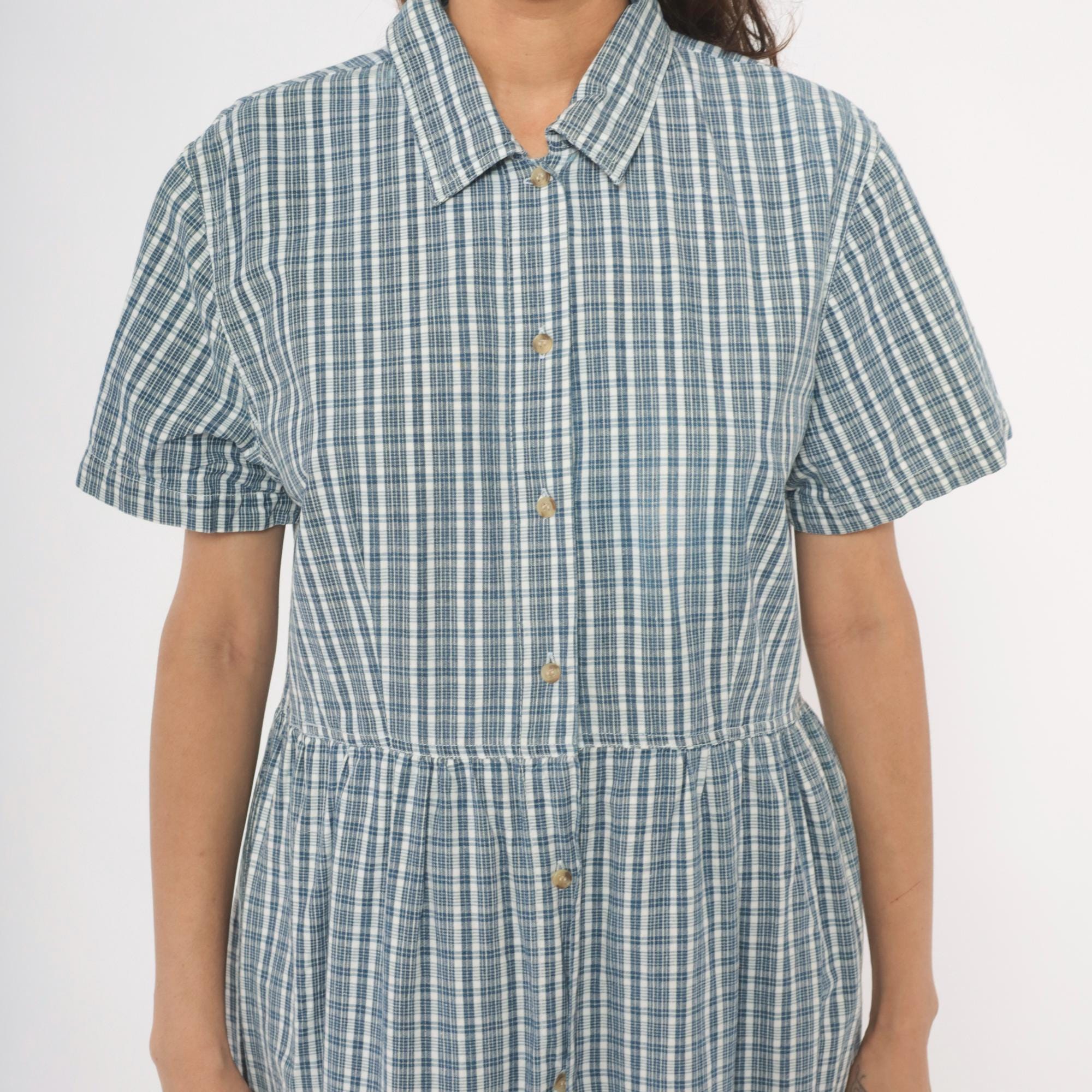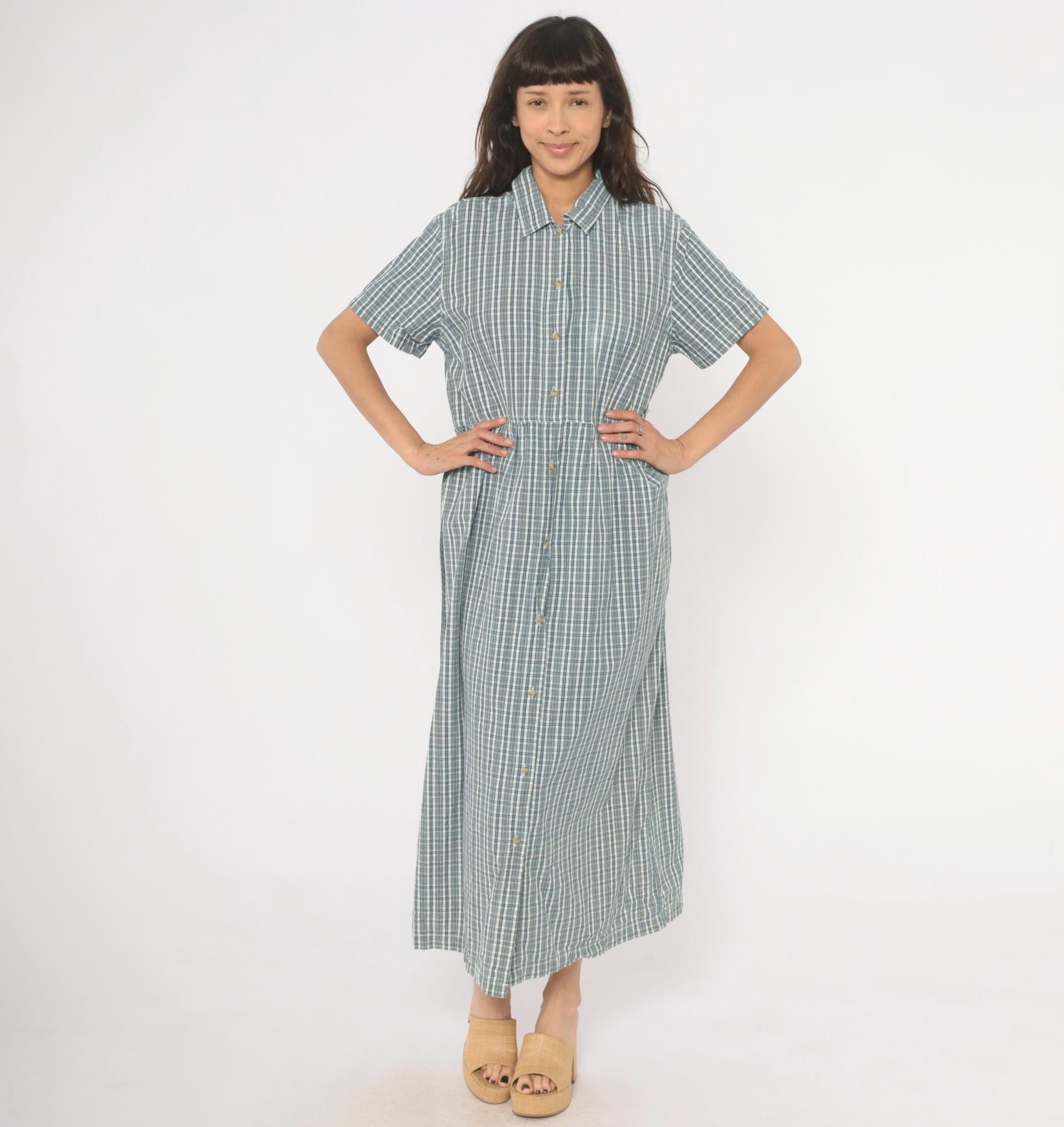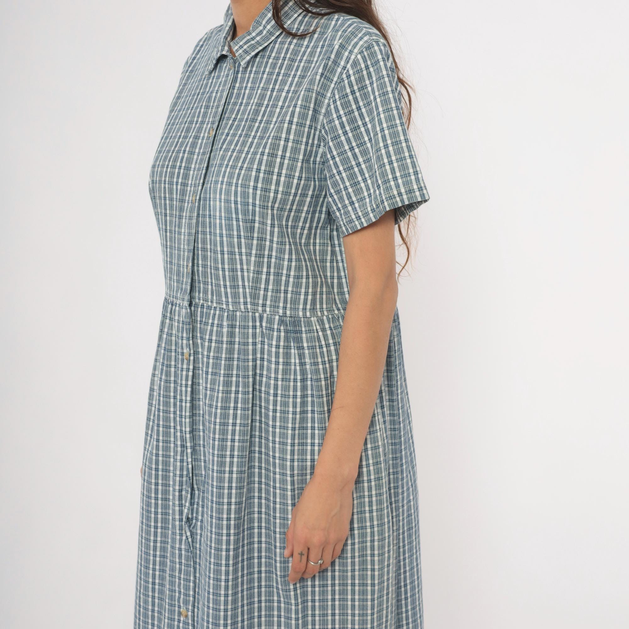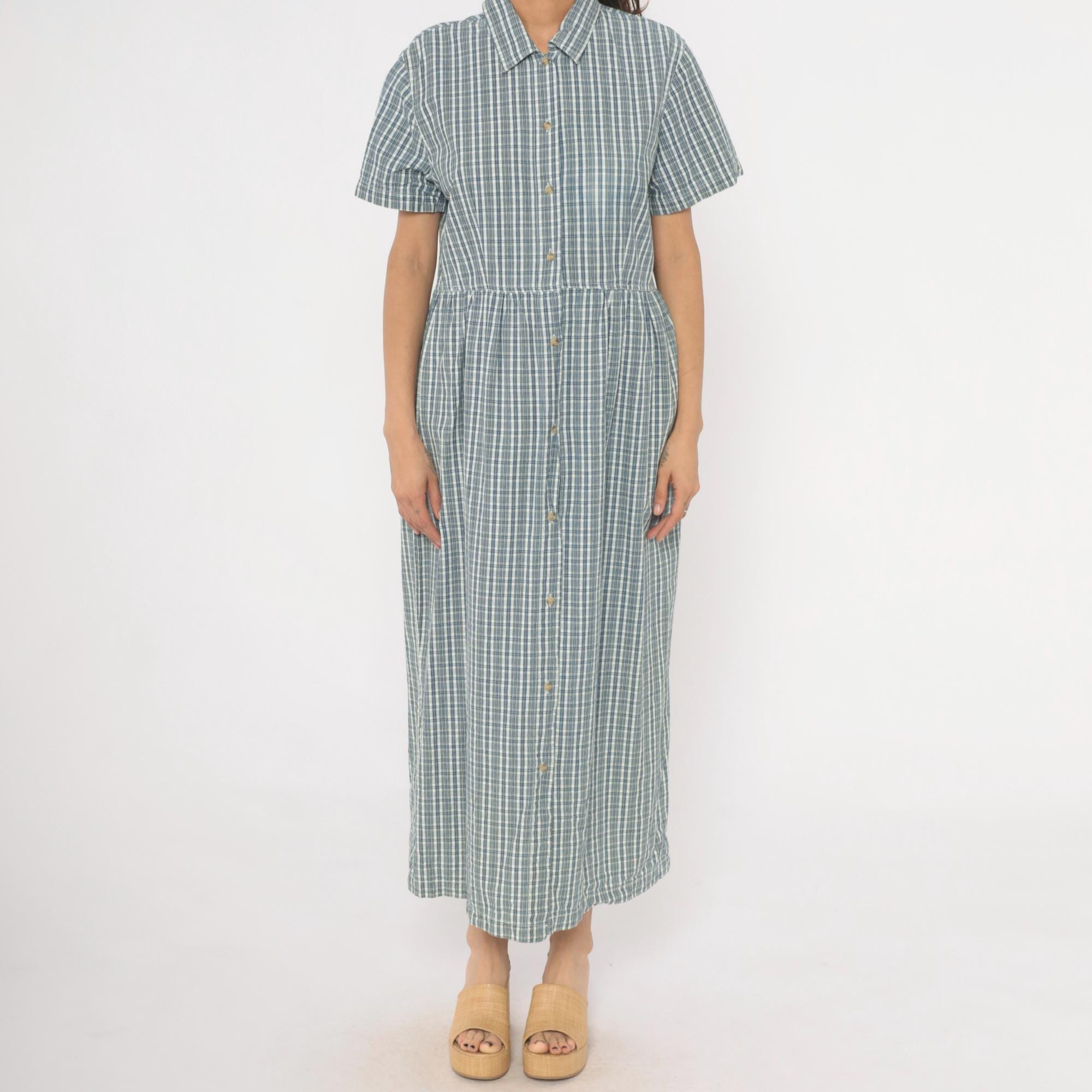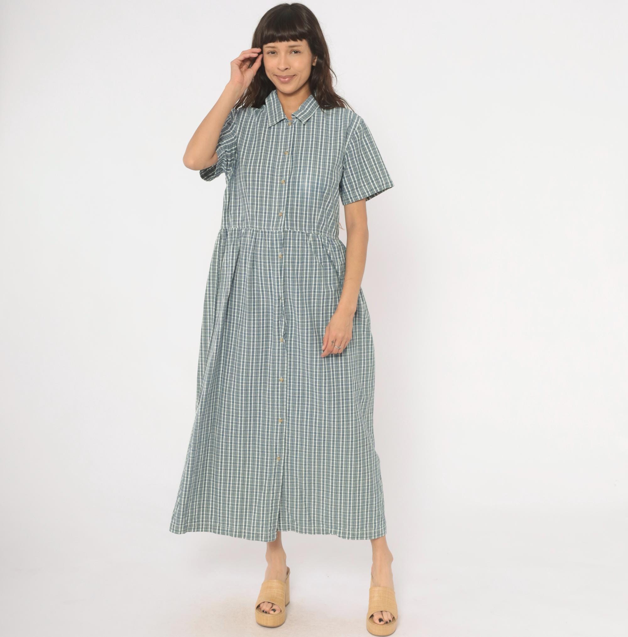 90s blue and white plaid maxi shirtdress from Studio Works with a pointed collar and full button front closure from neckline to hem. Short sleeves, fitted bodice with gathered waist, and a long A-line skirt falling to ankle length. Small tonal buttons run the entire length of the dress, and the check pattern mixes slate blue, navy, and white lines.