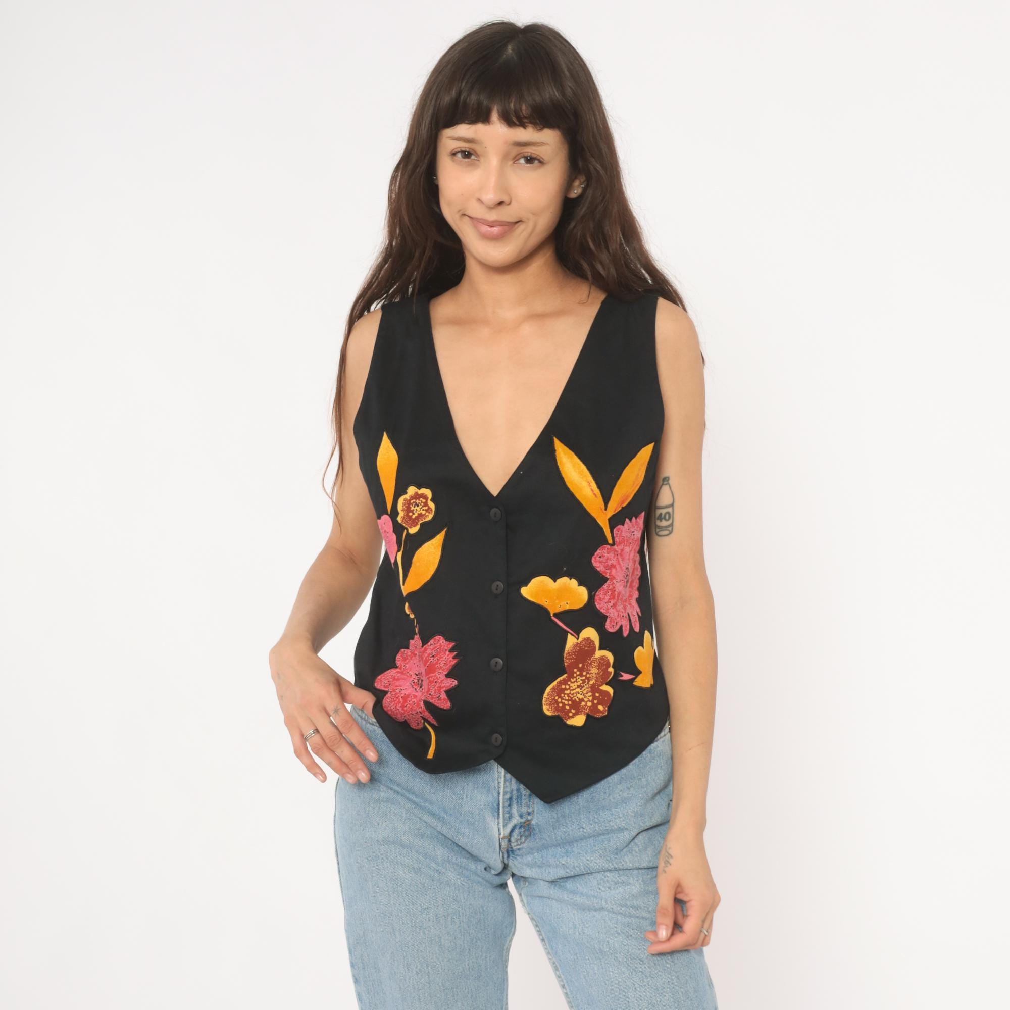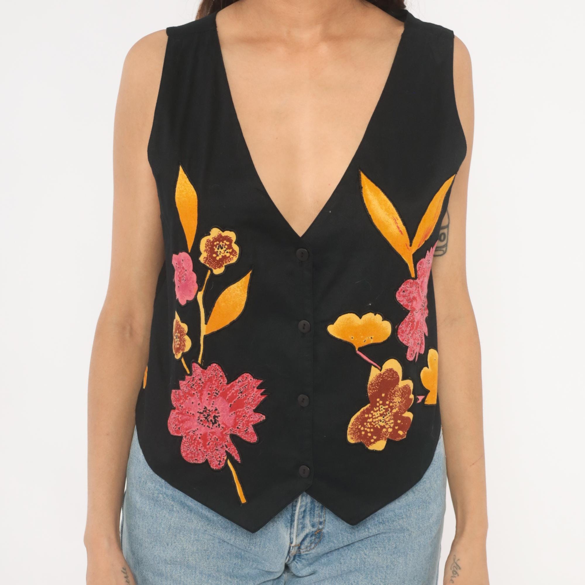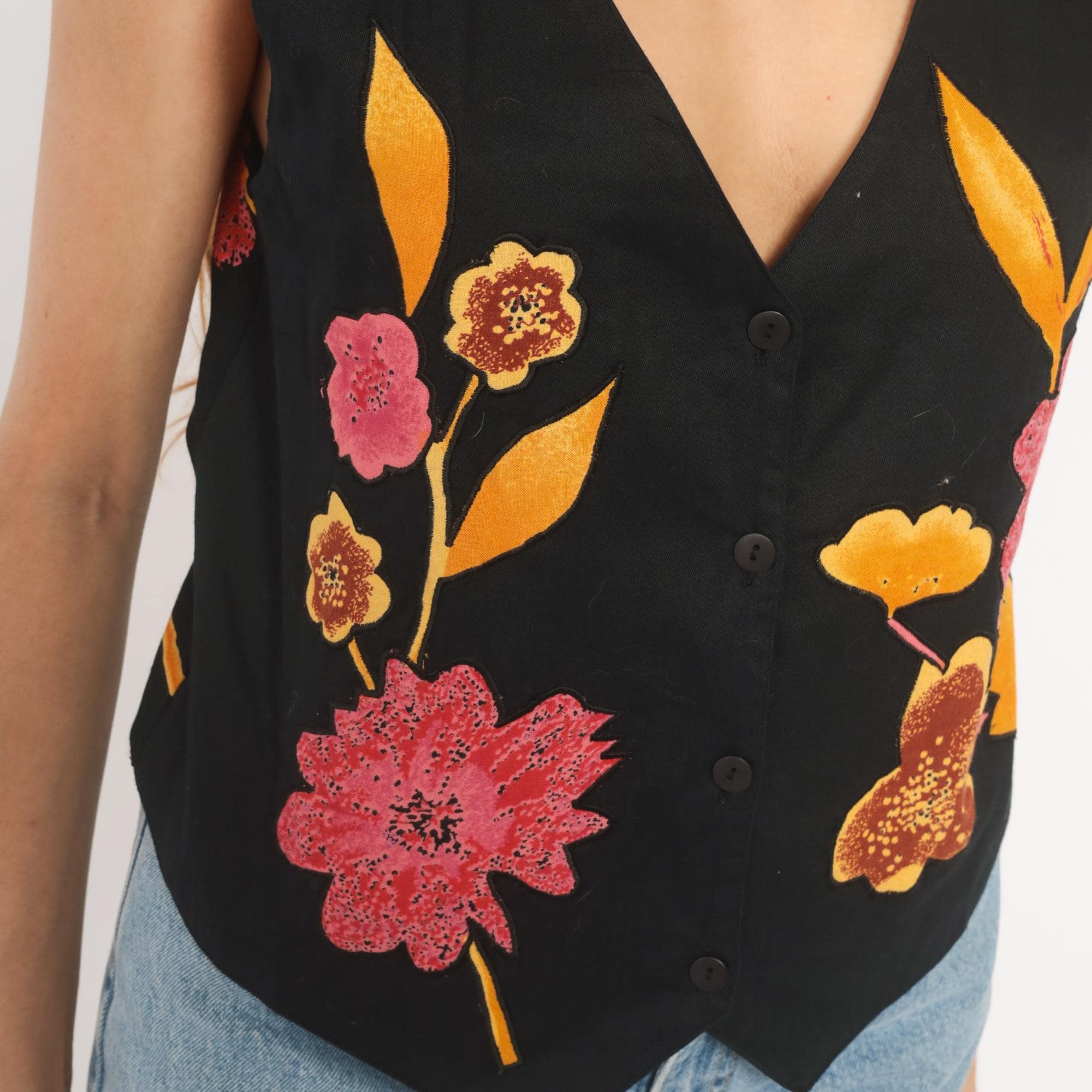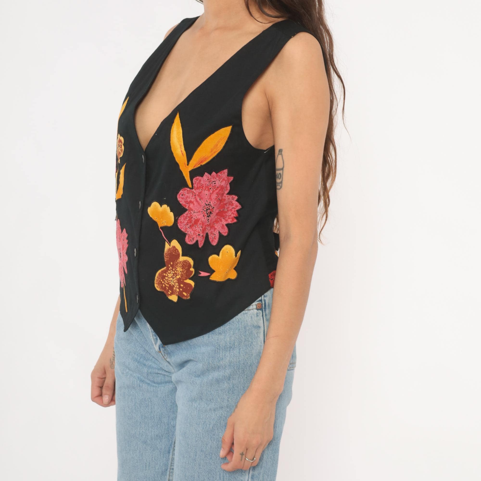 90s black button front vest from Willow Ridge with a deep V neckline and pointed hem. Large pink, rose, amber, and golden floral print across the front and back. Five black buttons down the center front, with a tie closure at the lower back.
