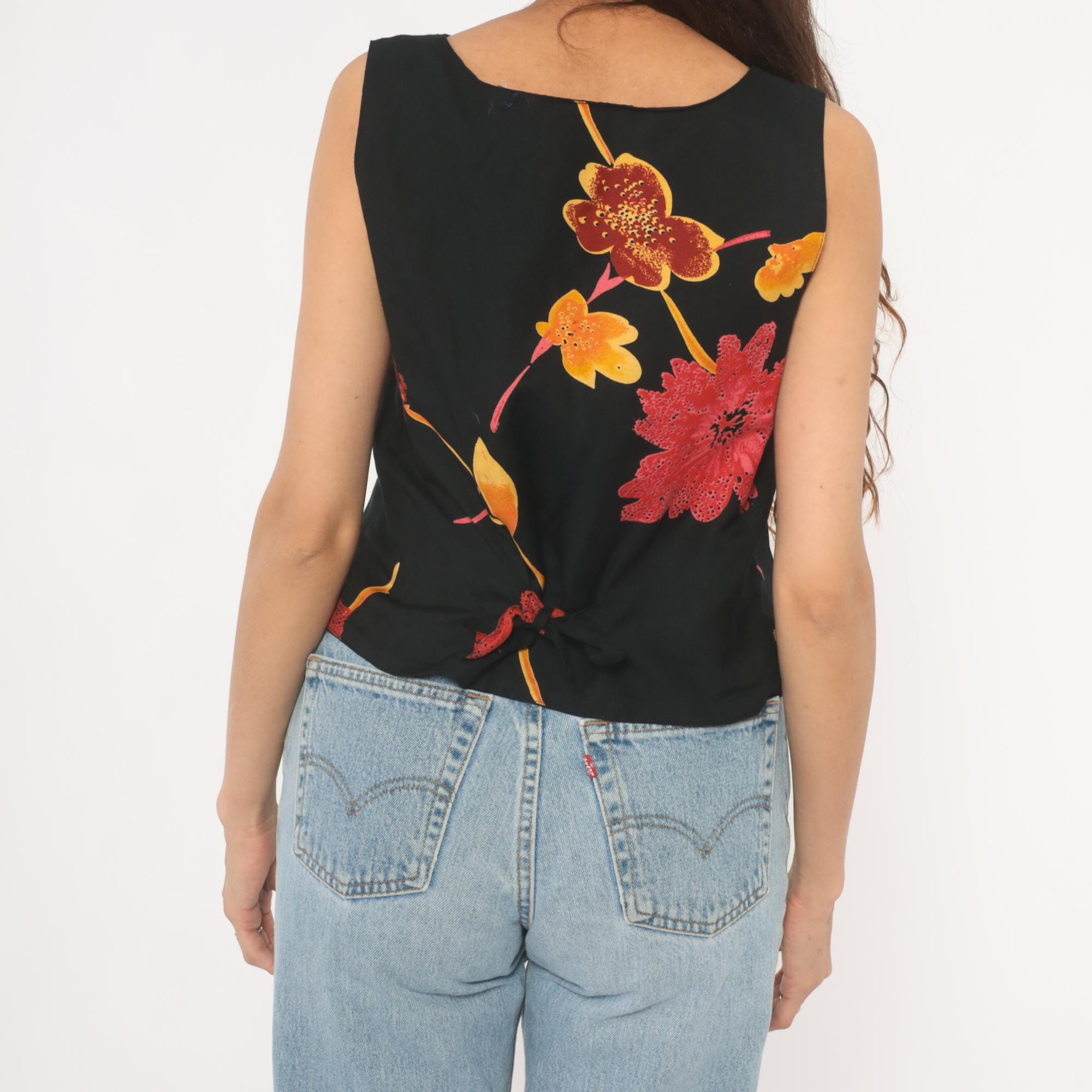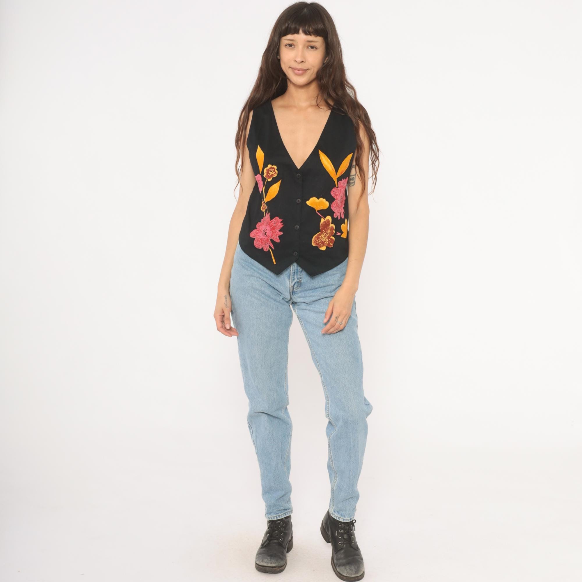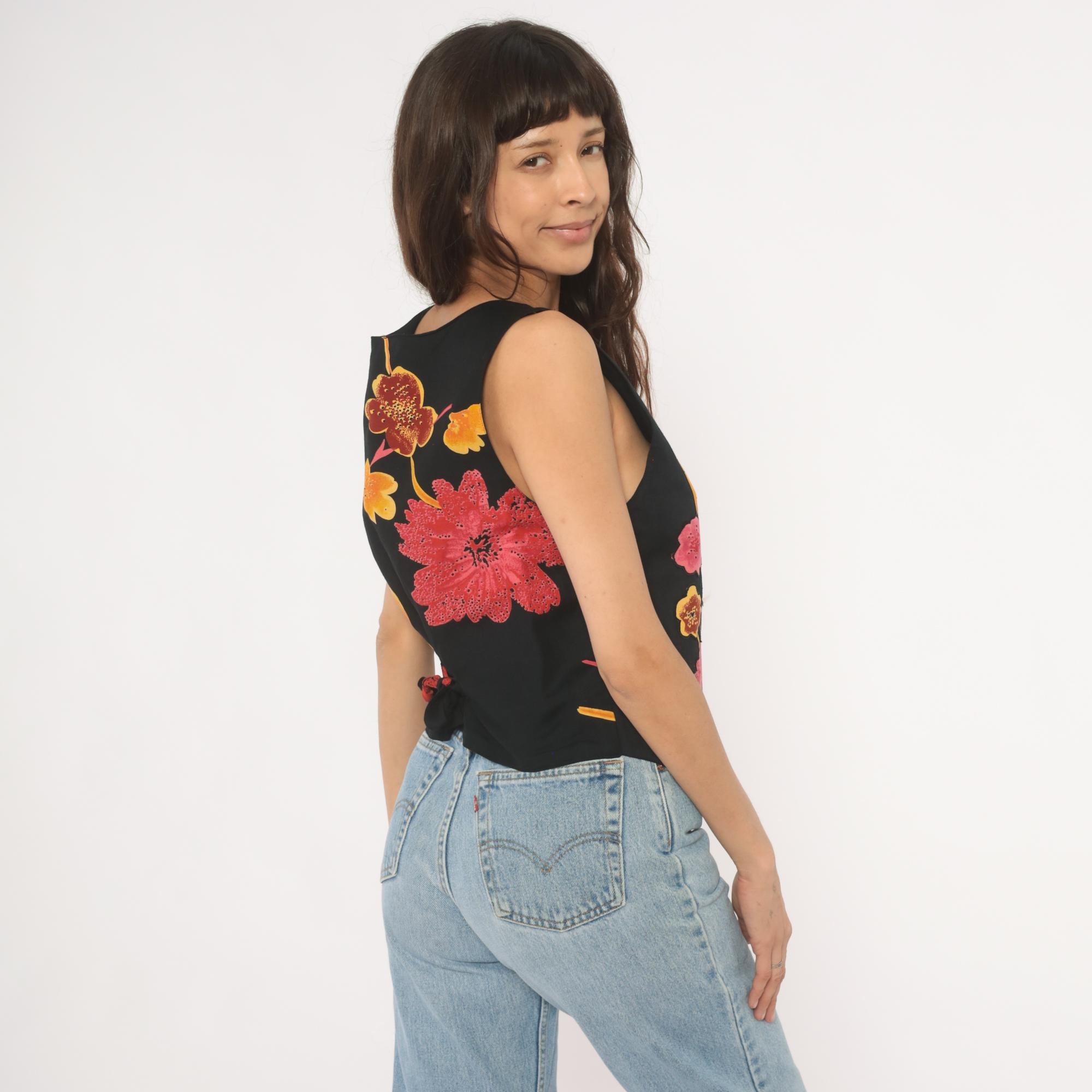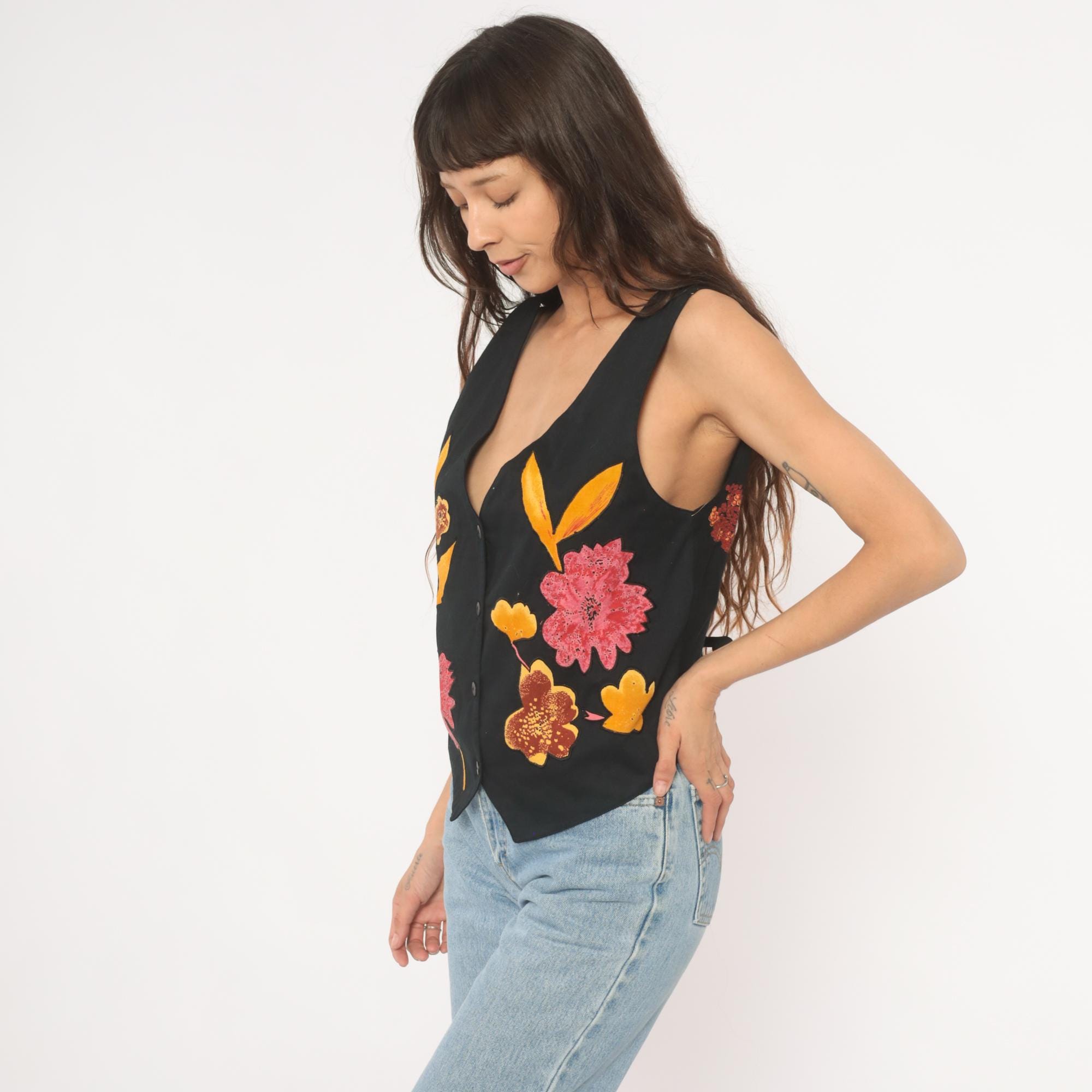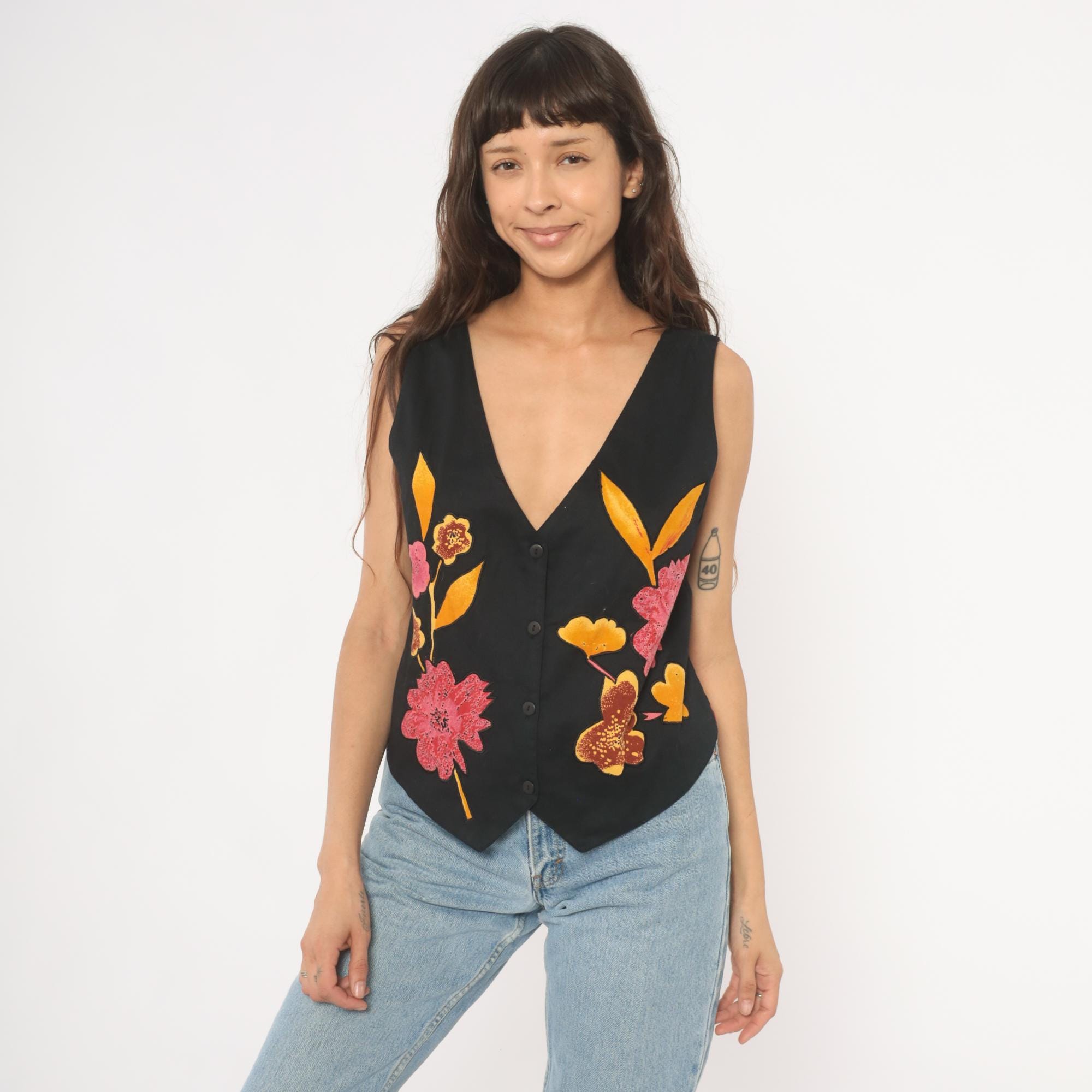 90s black button front vest from Willow Ridge with a deep V neckline and pointed hem. Large pink, rose, amber, and golden floral print across the front and back. Five black buttons down the center front, with a tie closure at the lower back.