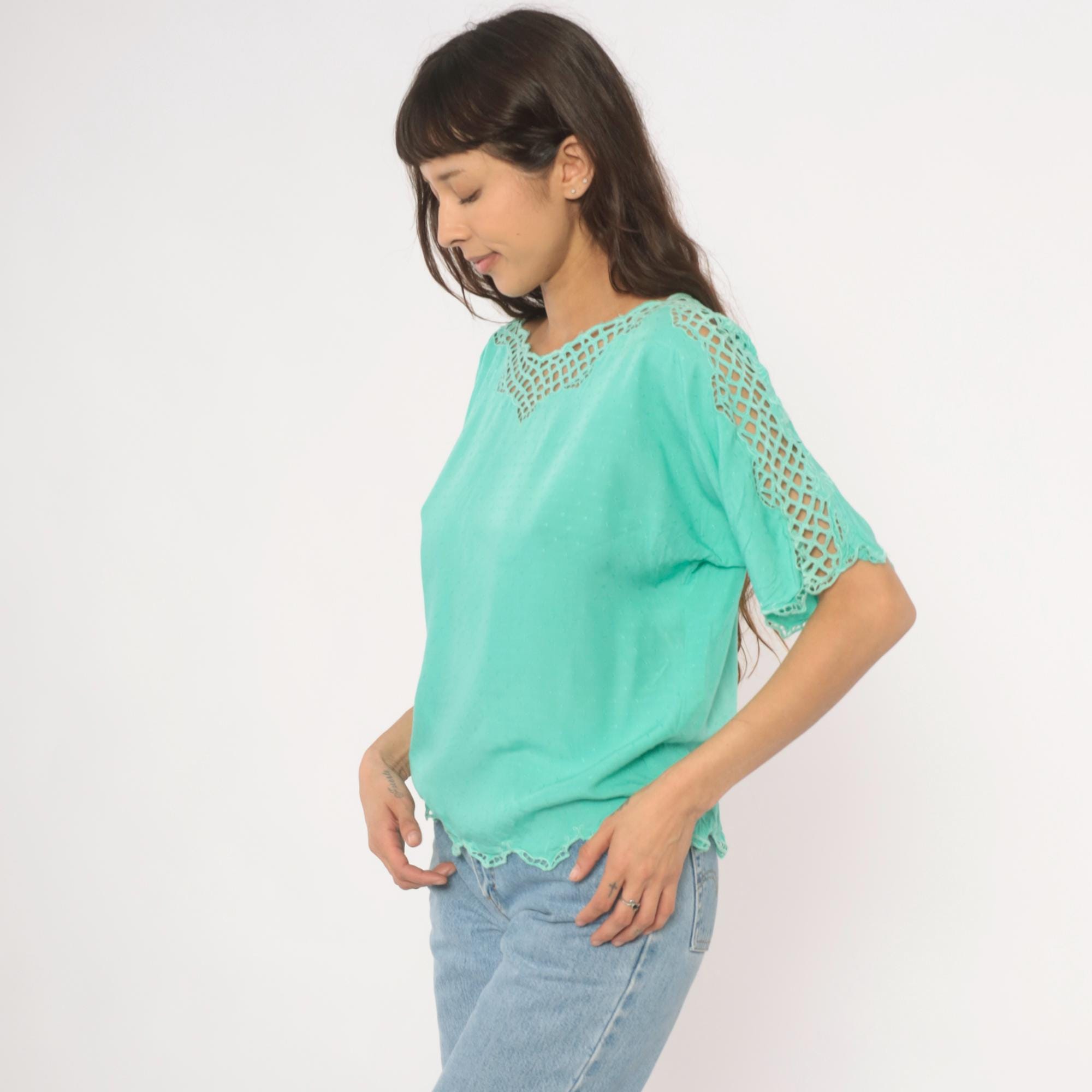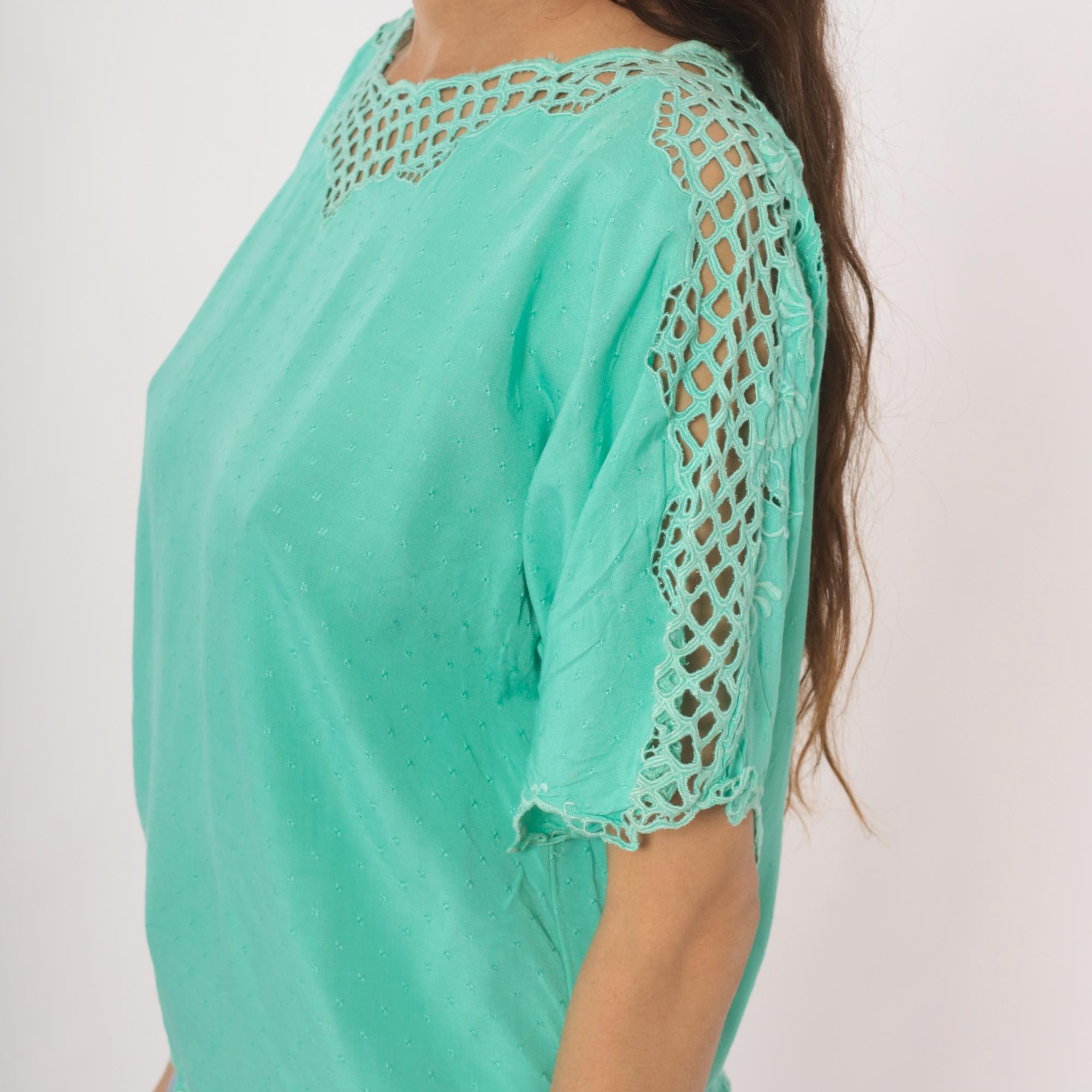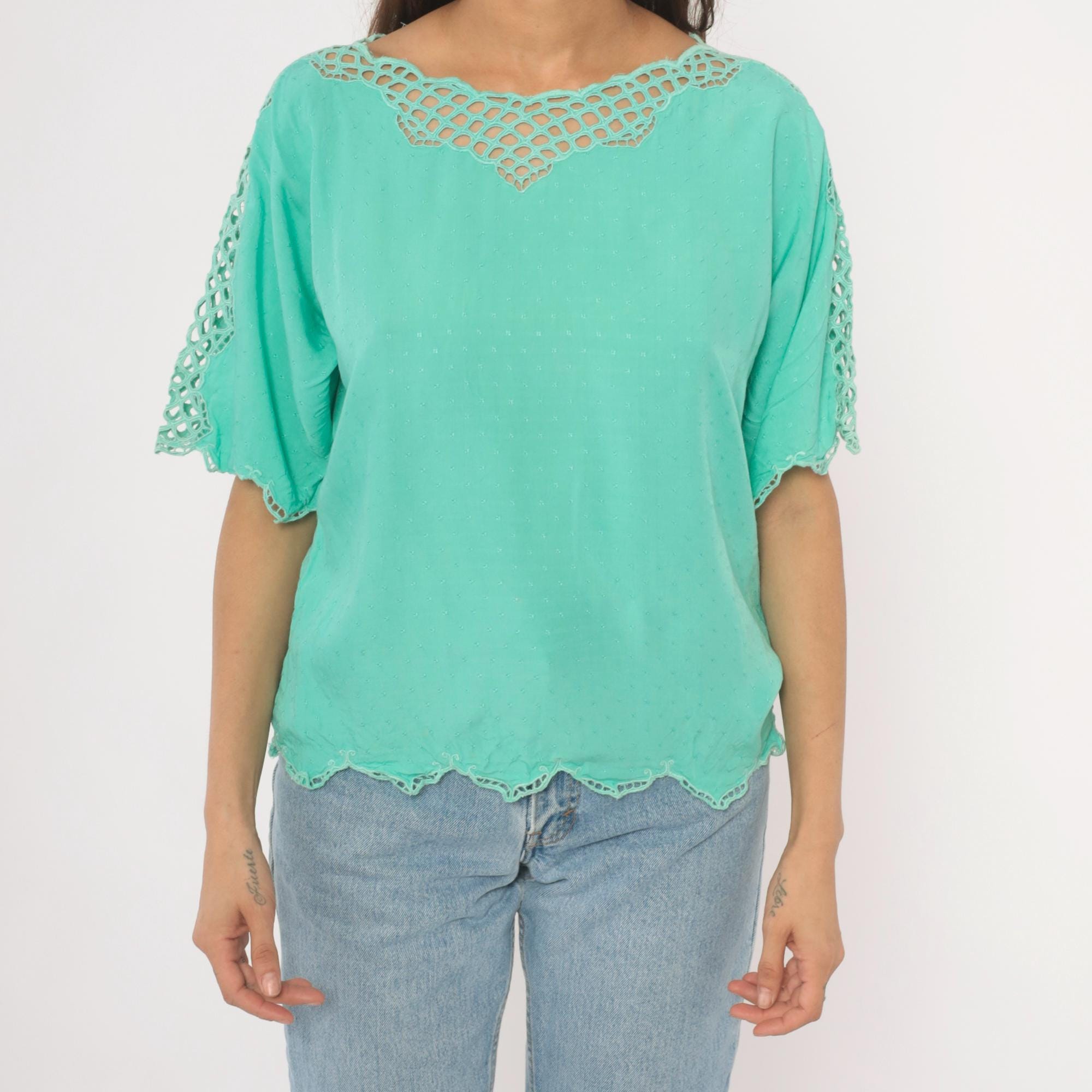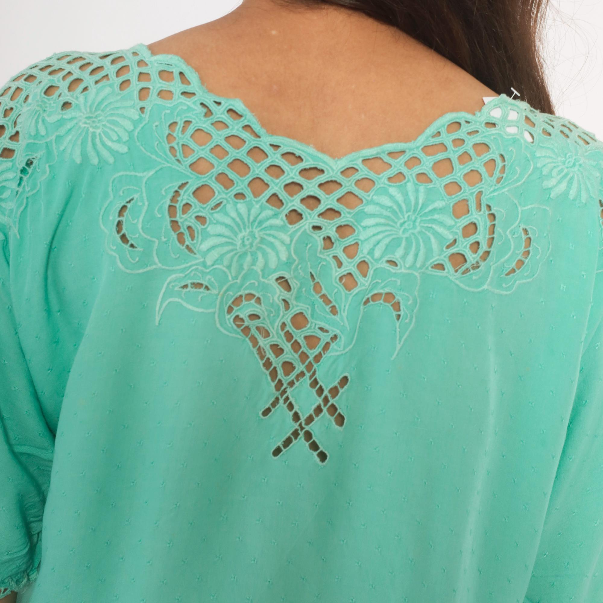 90s mint green blouse from Bali Emerald with cutwork lace yoke at front and back, including embroidered floral and lattice openwork detailing. Batwing sleeves edged with scalloped cutwork trim, matching the scalloped hem. Dotted swiss texture across the body, pullover closure, and a relaxed boxy fit. The back yoke has a larger butterfly-shaped cutwork panel with floral embroidery.