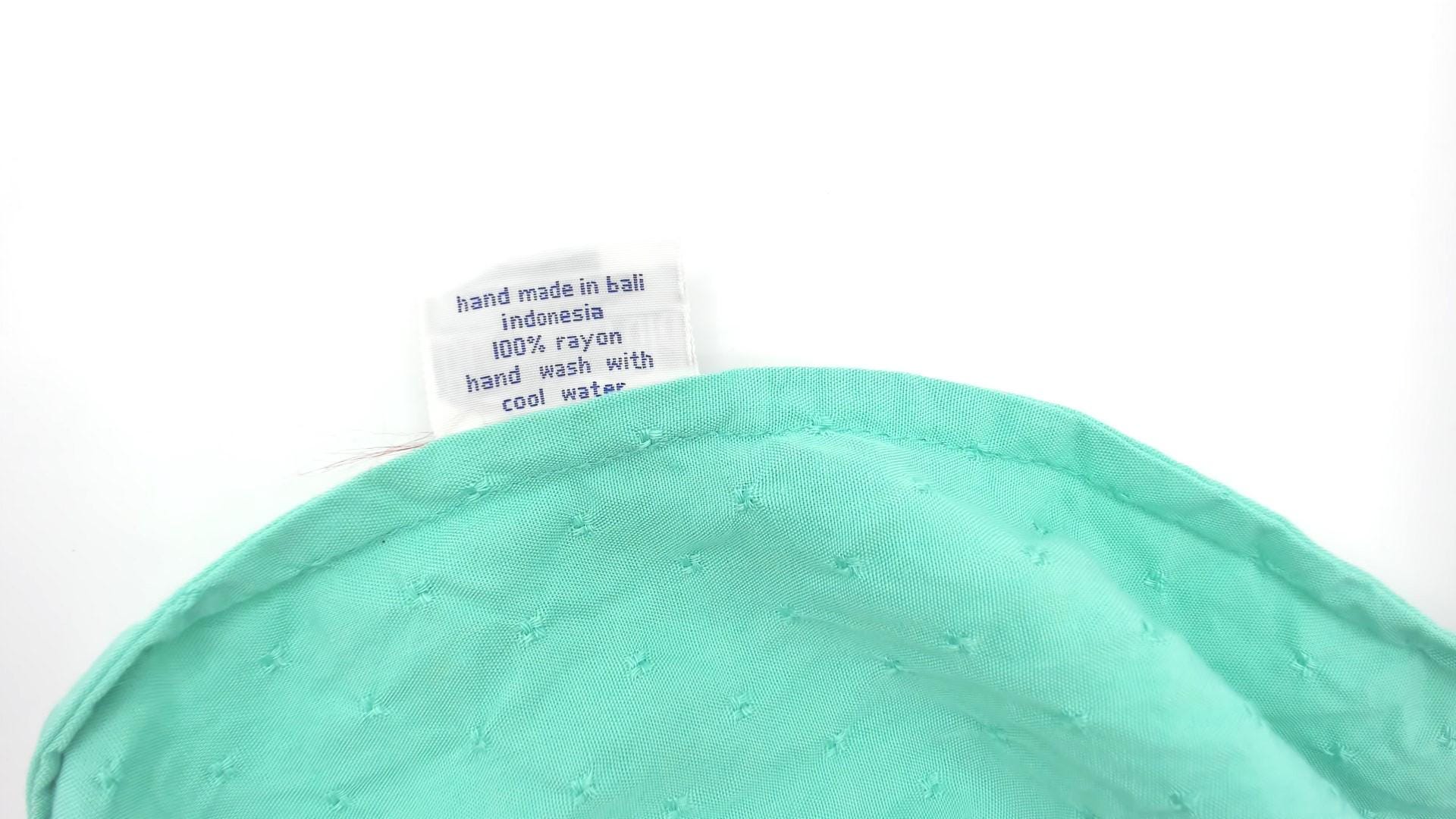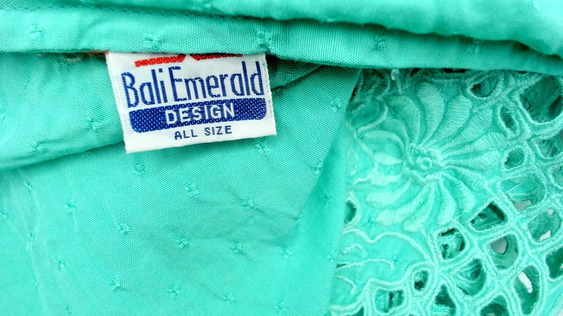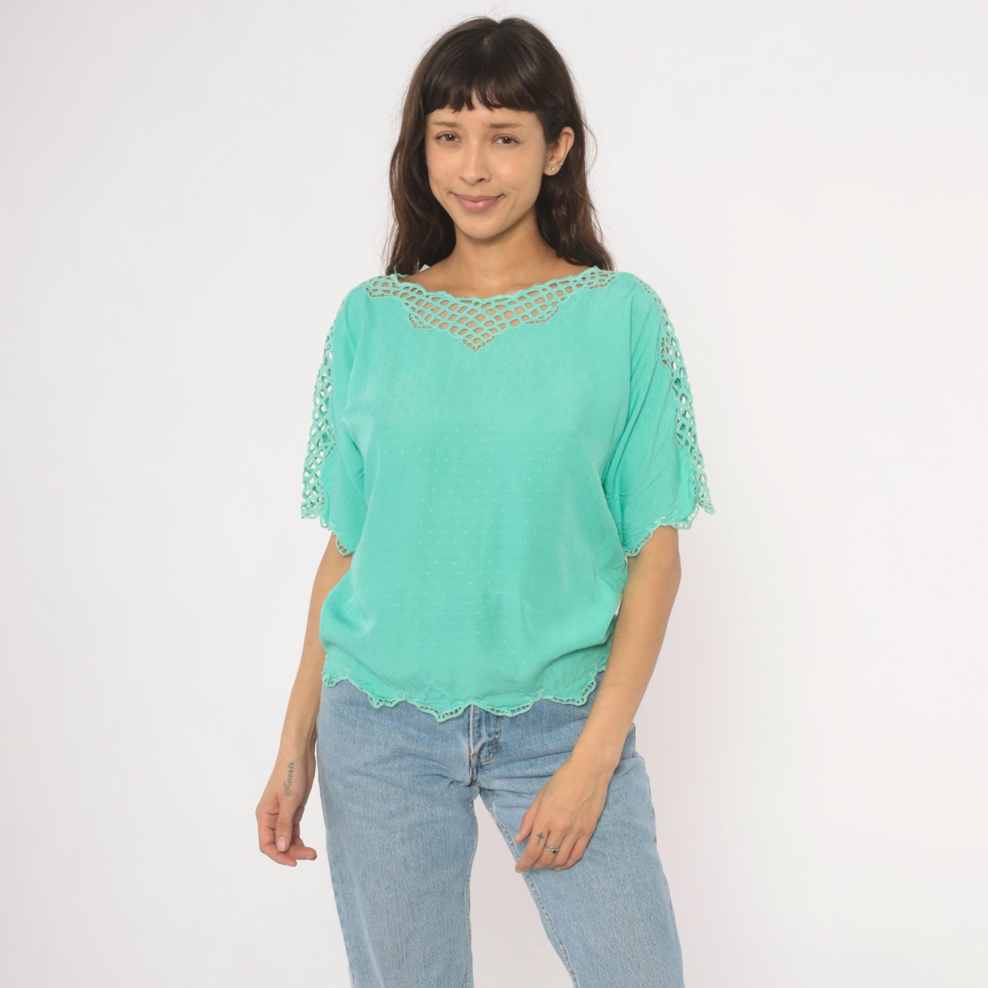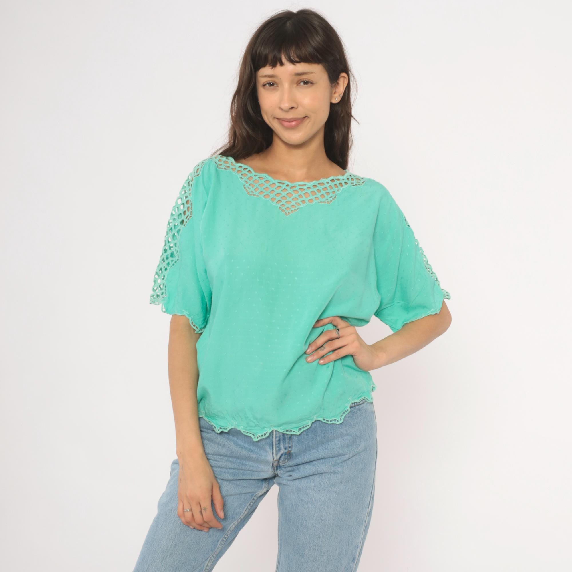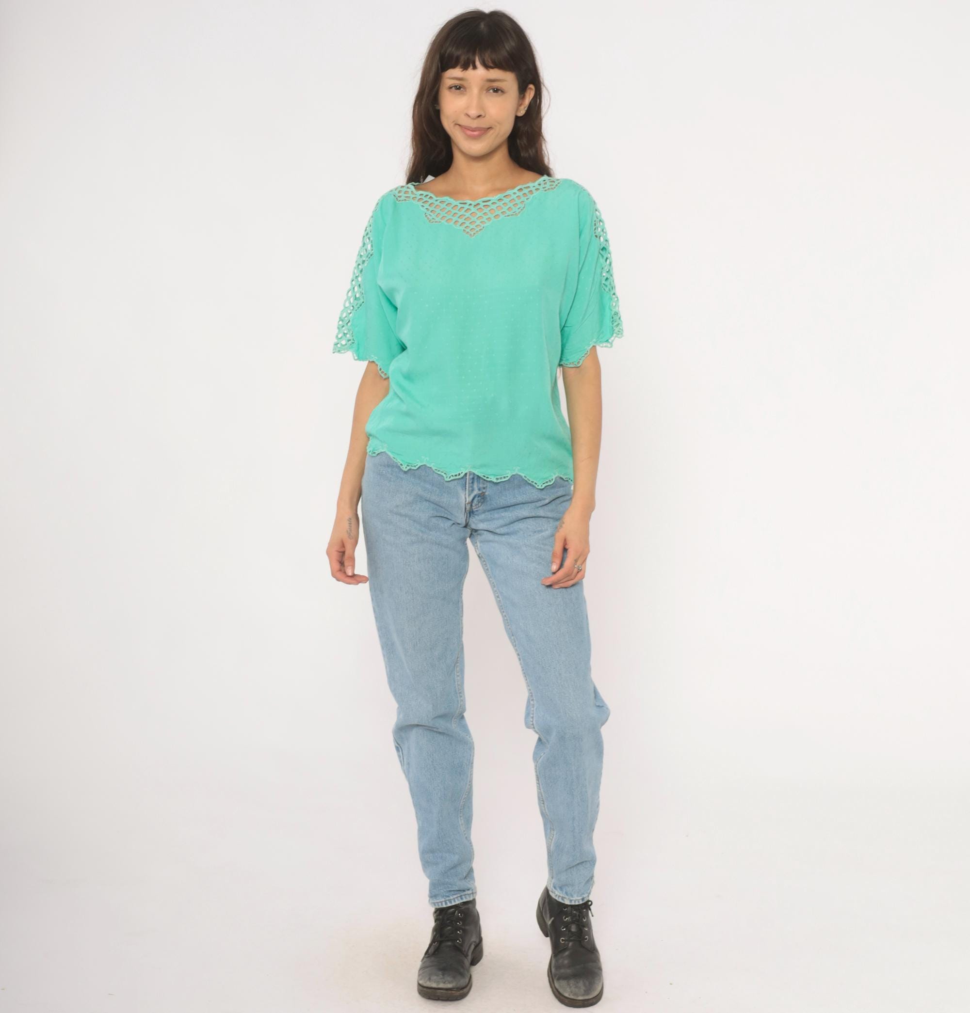 90s mint green blouse from Bali Emerald with cutwork lace yoke at front and back, including embroidered floral and lattice openwork detailing. Batwing sleeves edged with scalloped cutwork trim, matching the scalloped hem. Dotted swiss texture across the body, pullover closure, and a relaxed boxy fit. The back yoke has a larger butterfly-shaped cutwork panel with floral embroidery.