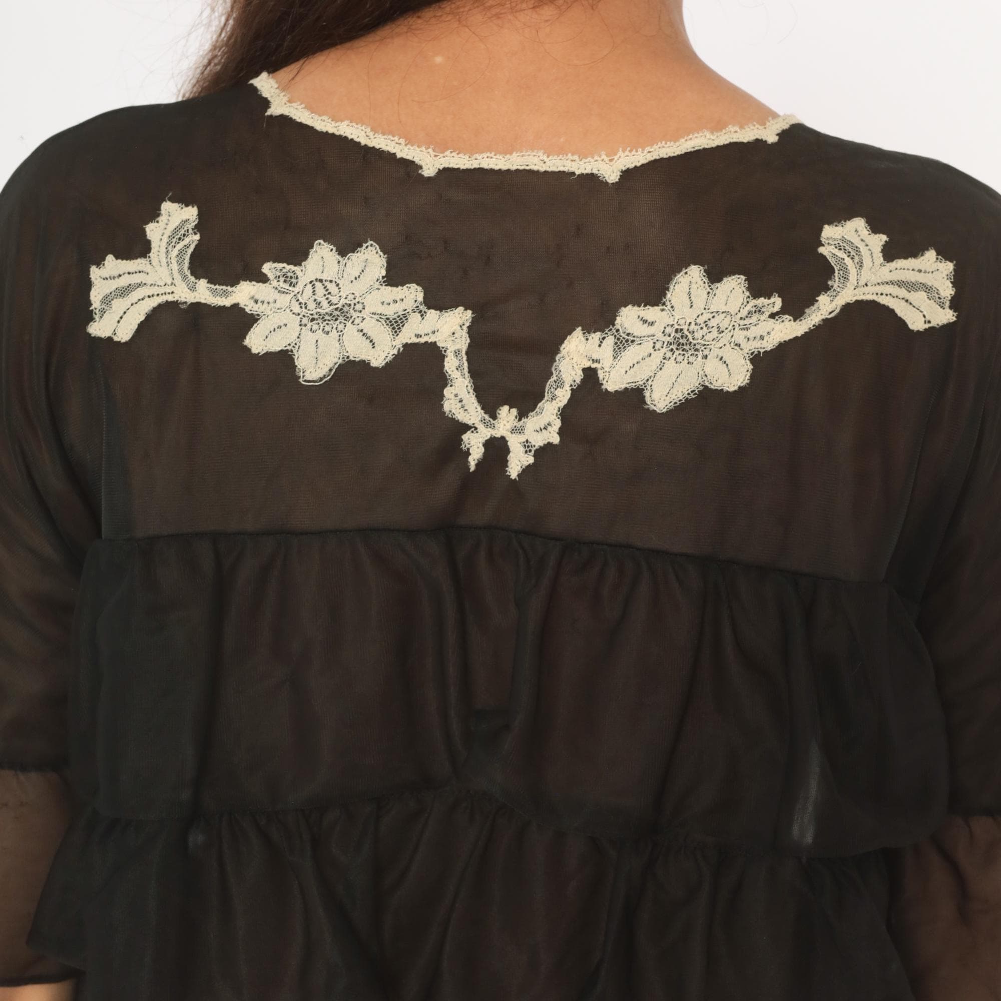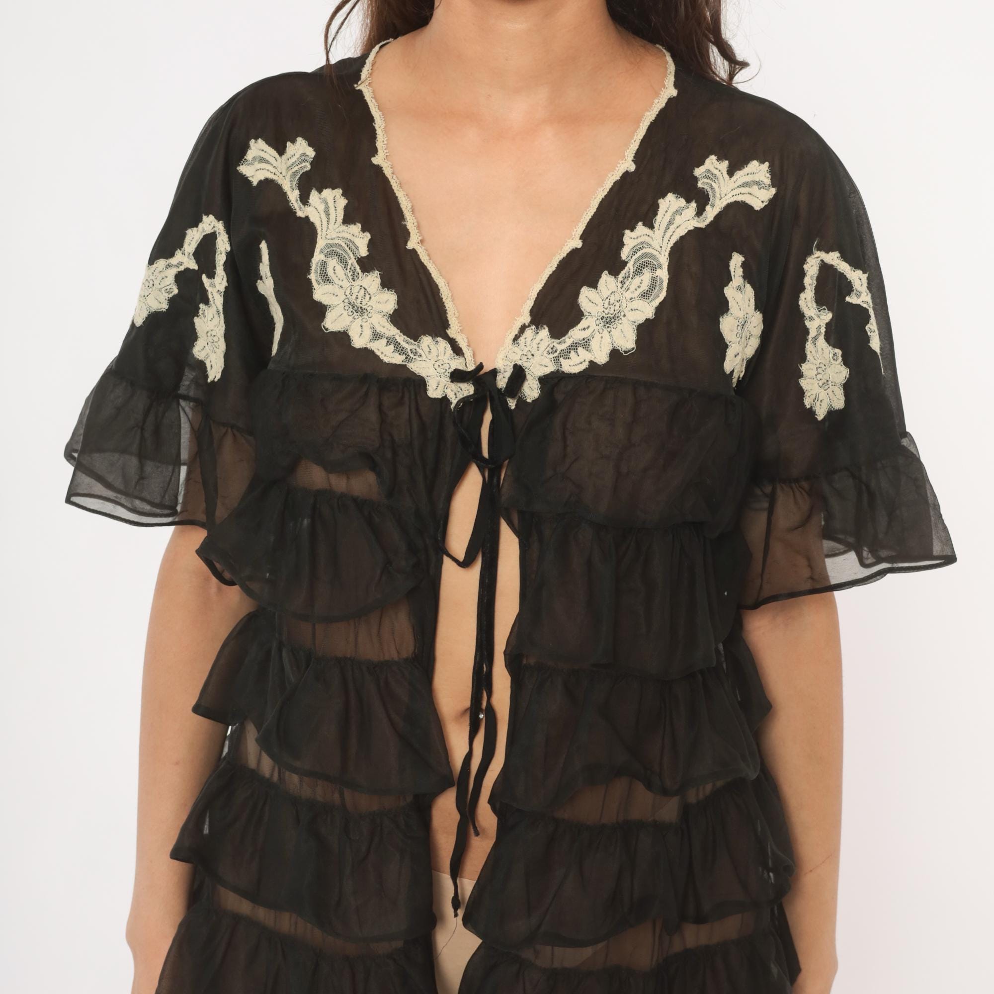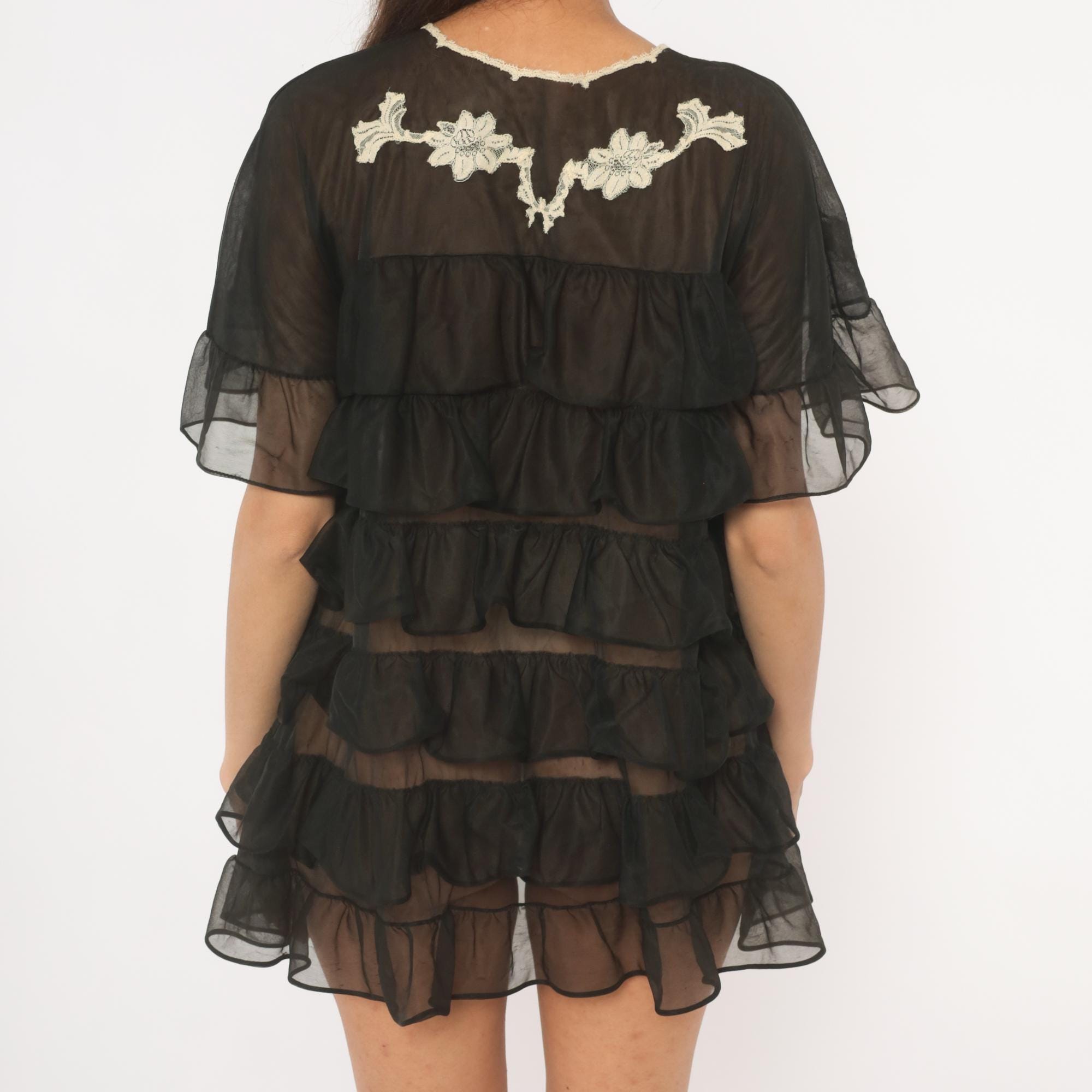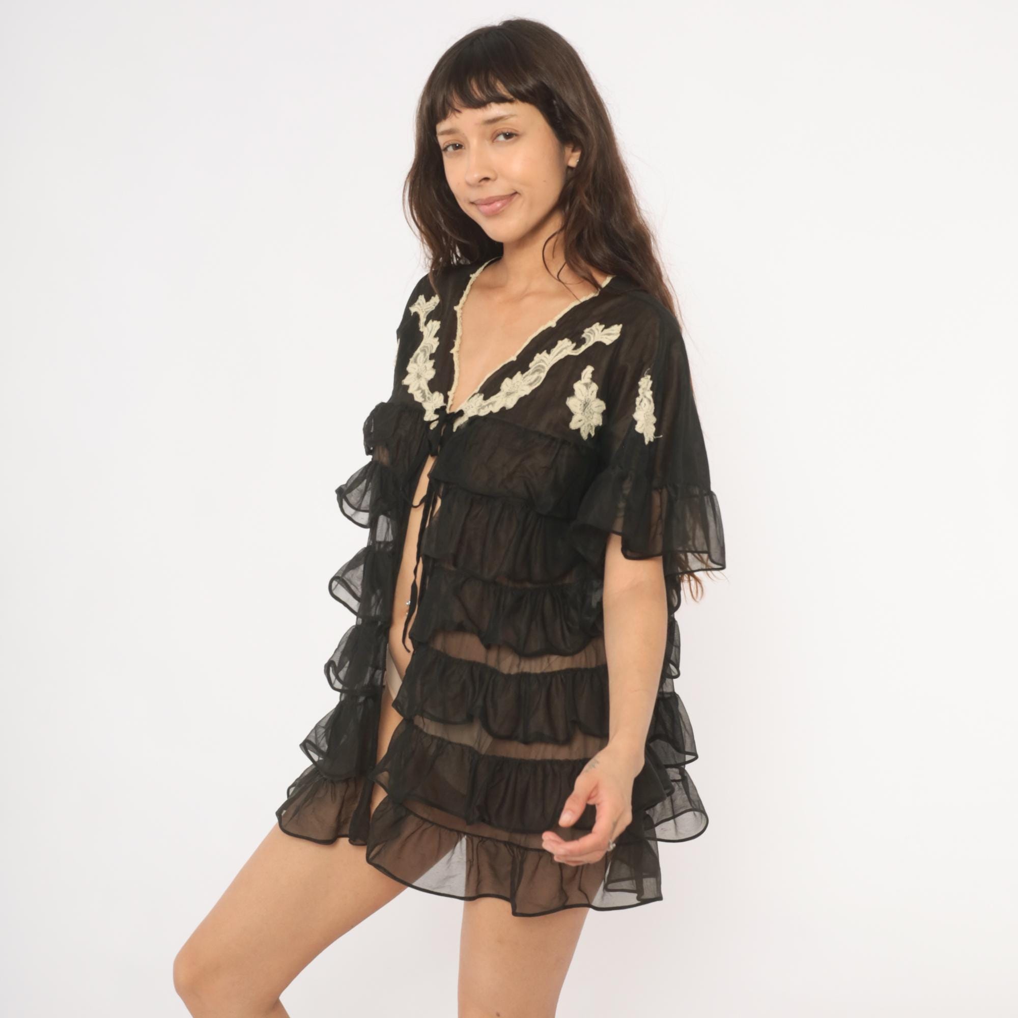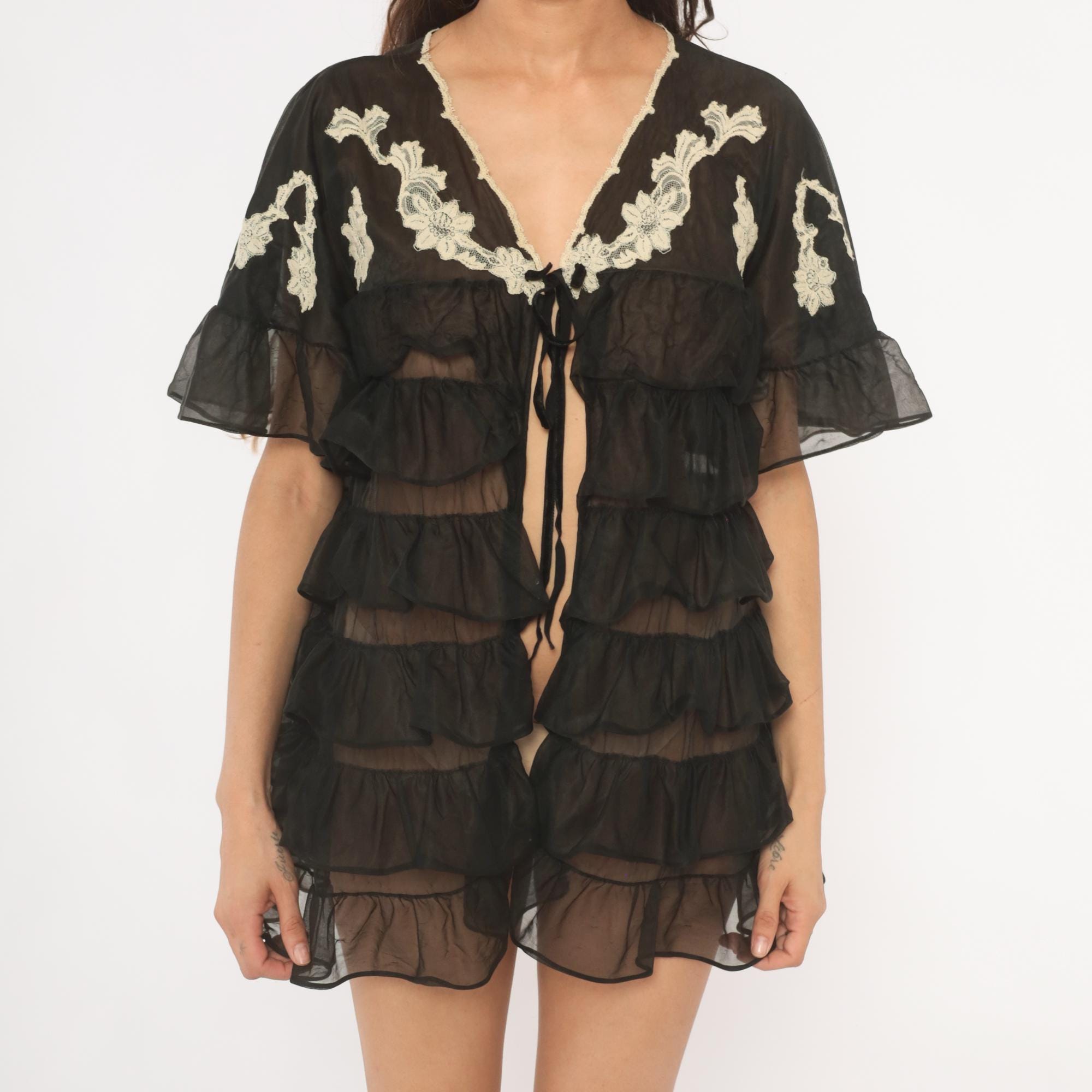 70s black sheer tiered ruffle robe from Kayser with cream lace floral applique along the V-neckline and across the back yoke. Flutter sleeves with sheer ruffled cuffs, and a tie front closure at the bust. Multiple gathered ruffle tiers cascade from the empire waistline down through the mini length hem.